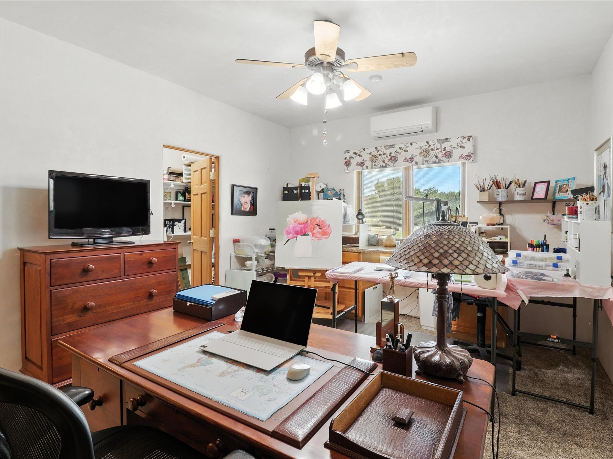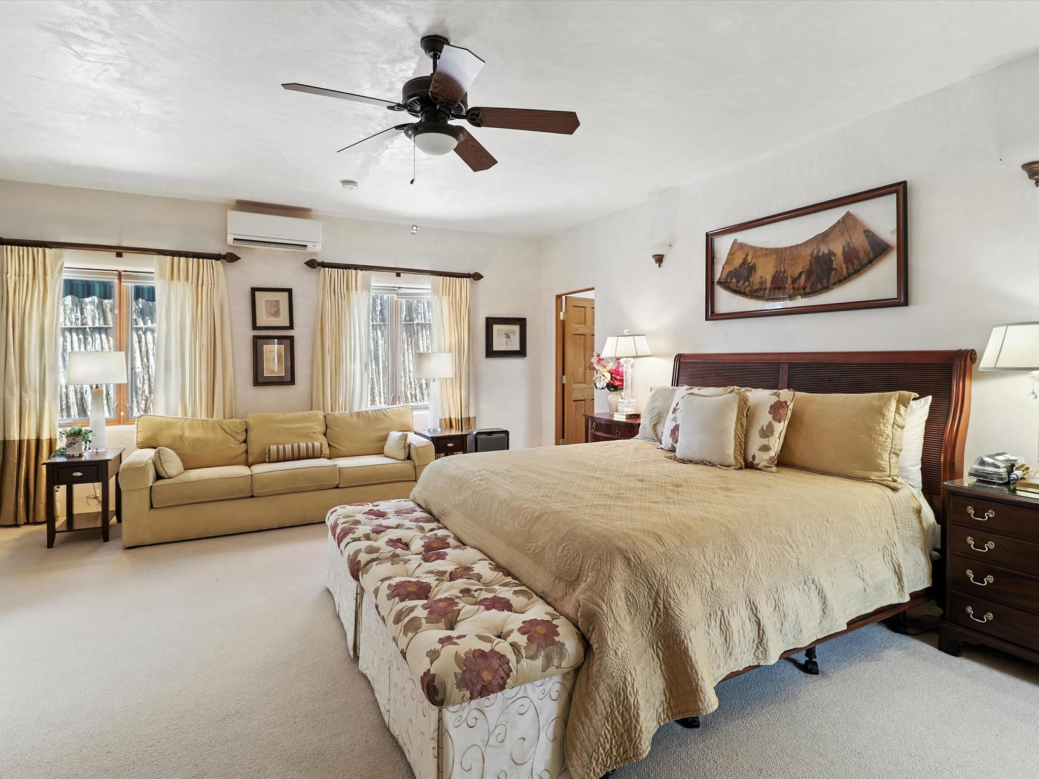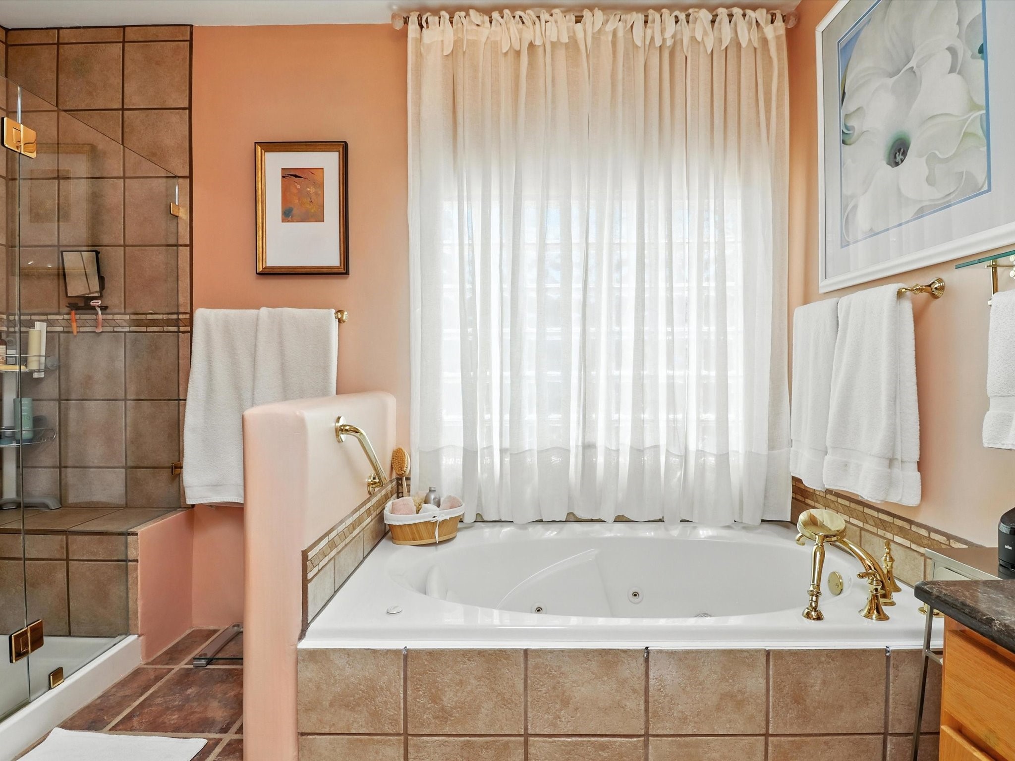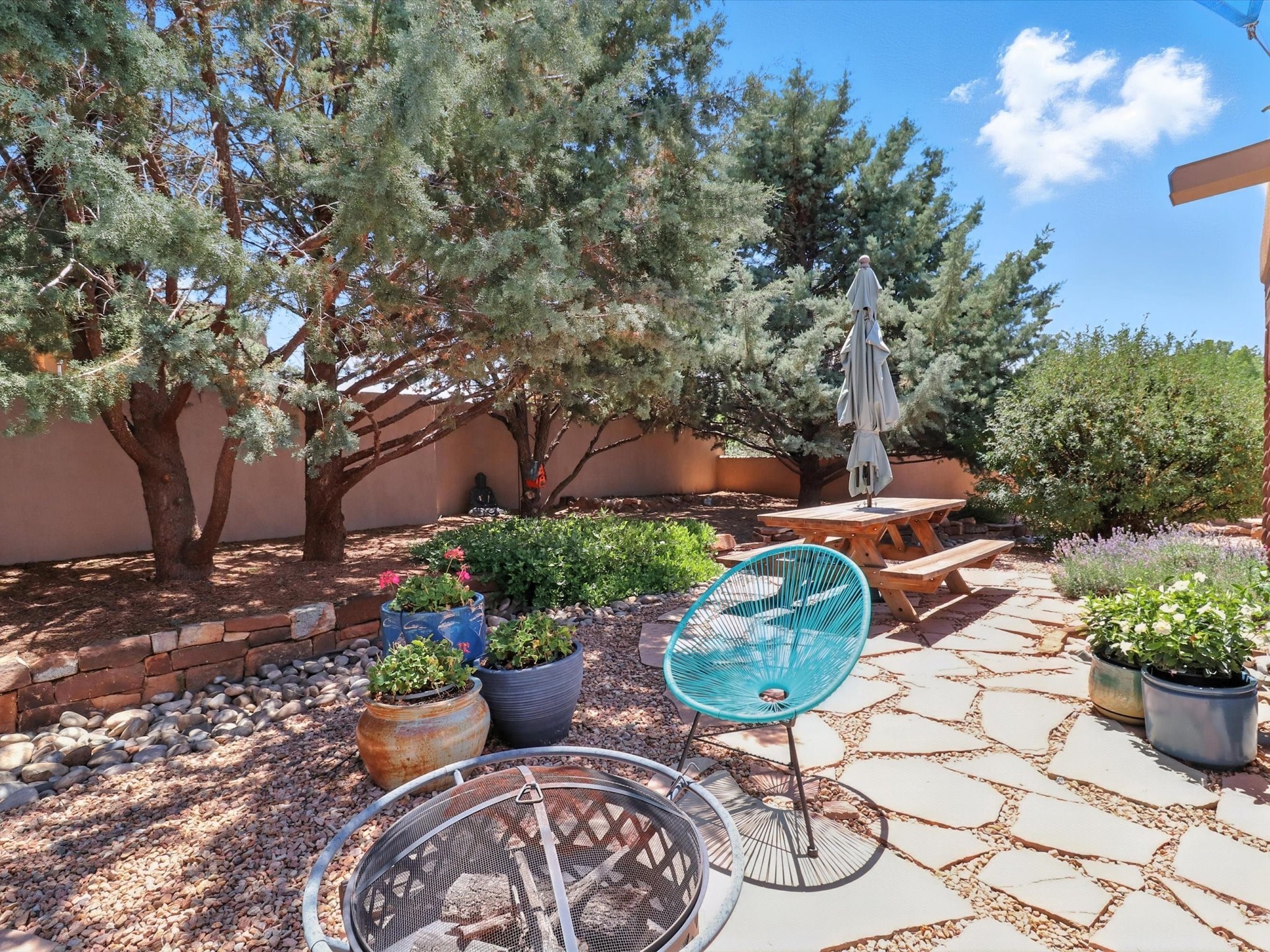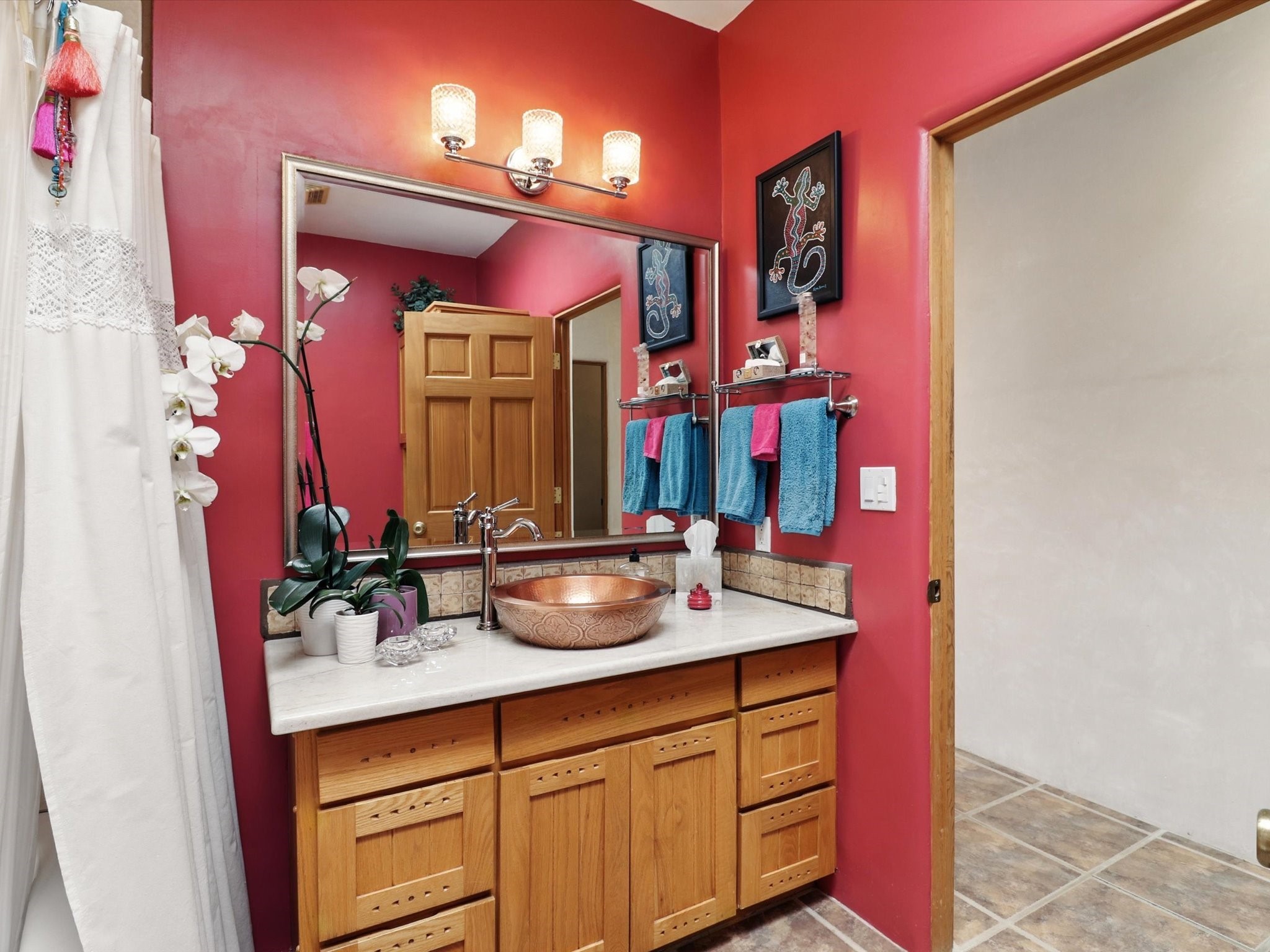 This beautifully maintained and thoughtfully updated home blends timeless Southwestern charm with refined, modern comfort. Spacious and gracefully proportioned rooms are enhanced by luxurious details throughout, including diamond finish plaster walls and elegant, large-format ceramic tile flooring. Step into the dramatic great room, where a soaring 12-foot viga ceiling and a cozy kiva fireplace create a stunning central gathering space. The fully remodeled kitchen is open to the living area and features slab granite countertops, stainless steel appliances, abundant custom cabinetry, and a sunny breakfast nook, perfect for everyday living and entertaining alike. The adjacent formal dining room, also crowned by a high viga ceiling, offers seamless flow for gatherings both intimate and celebratory.A separate den with a wood-burning kiva-style fireplace provides additional flexible living space and opens to a private rear patio and manicured outdoor area.The expansive owner's suite is thoughtfully positioned for privacy and serenity. It includes a peaceful sitting area, direct access to the heated sunroom, and a beautifully appointed updated bath featuring a glass brick wall that gently filters natural light. Two additional bedrooms are located at the opposite end of the home. One is currently serving as studio and office, the other a wonderful guest room, with both sharing a generous full bath. Additional features include: walled and gated yard with security cameras, attached oversized two-car garage, large walk-in closets in every bedroom, heated enclosed Portal Santa Fe room with adjoining covered BBQ area, 5 mini-split Mitsubishi systems for personalized cooling and supplemental heat w/ upgraded hyper compressors, 13 GPM tankless water heater, Toto Washlet toilets, 18 solar panel (owned), and a large in-town lot with all city utilities. This home has been a place of deep joy, creativity, & care, now ready to welcome its next chapter w/ warmth & grace.