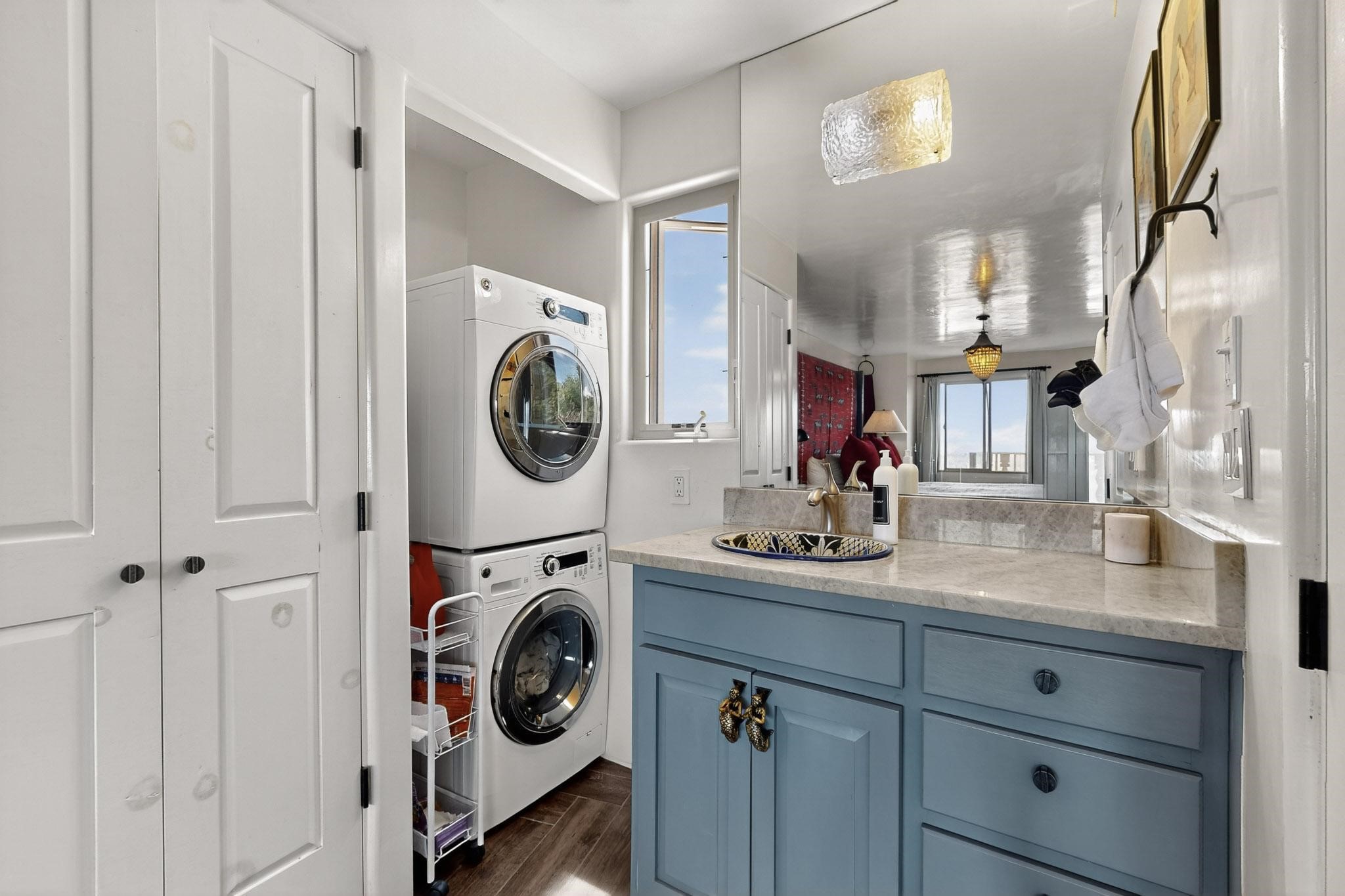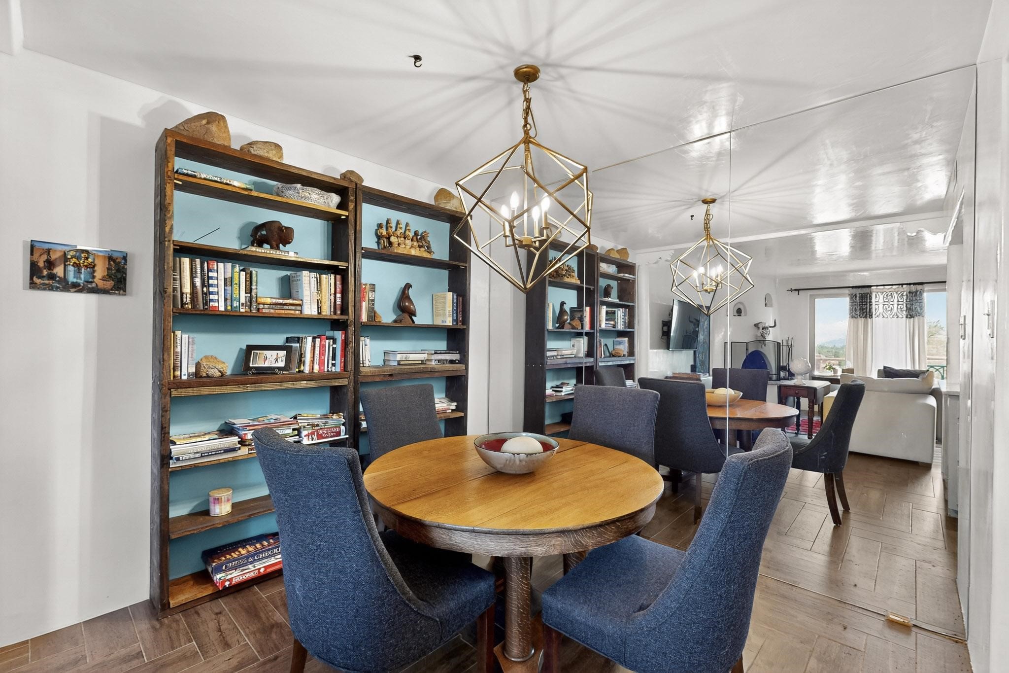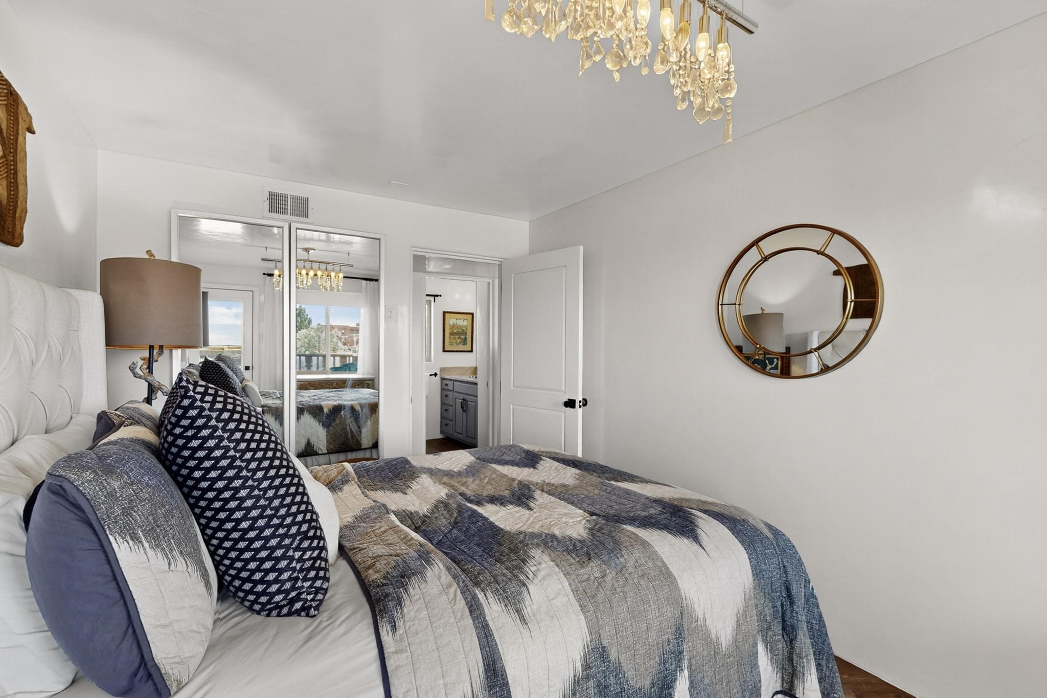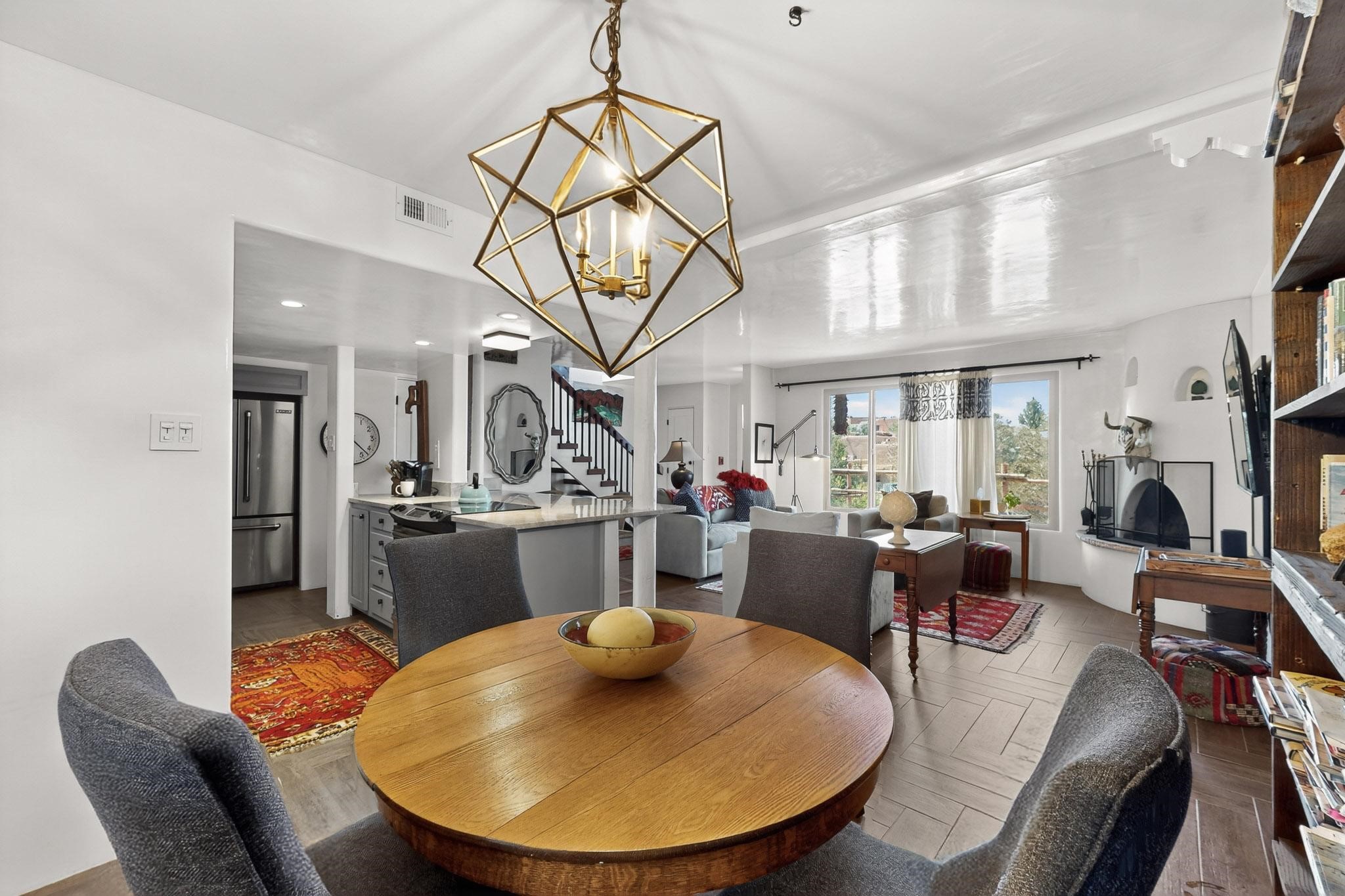 This lovely and convenient two story condo is located not far from the plaza, close to Fort Marcy, and at the bottom of the road leading up to the ski basin. The unit overlooks the green area in the center of the complex, with plenty of light. The living room has a charming kiva fireplace in the corner and views, the dining area has a full mirror to add to the space, and there are built in bookcases. The galley kitchen is convenient and a delight. Located on the main floor is a bath. Up the stairs are two bedrooms, both with access to a private balcony. There is a nicely sized primary bedroom with a private bath and a stacked laundry, and a guest bedroom with a bath in the hall. This beautiful condo complex is arranged on a hill with lovely views, a heated indoor swimming pool, hot tub, storage, rv parking, and on-site management. This particular unit has new heating, air conditioning, roof, and hot water on demand. All furnishings can be included.