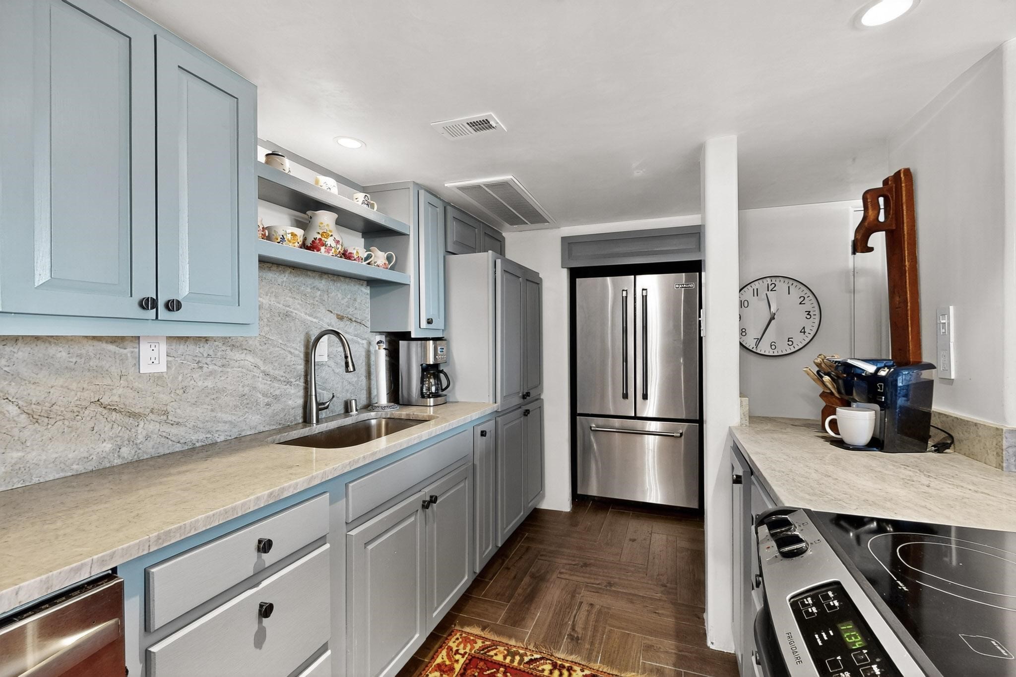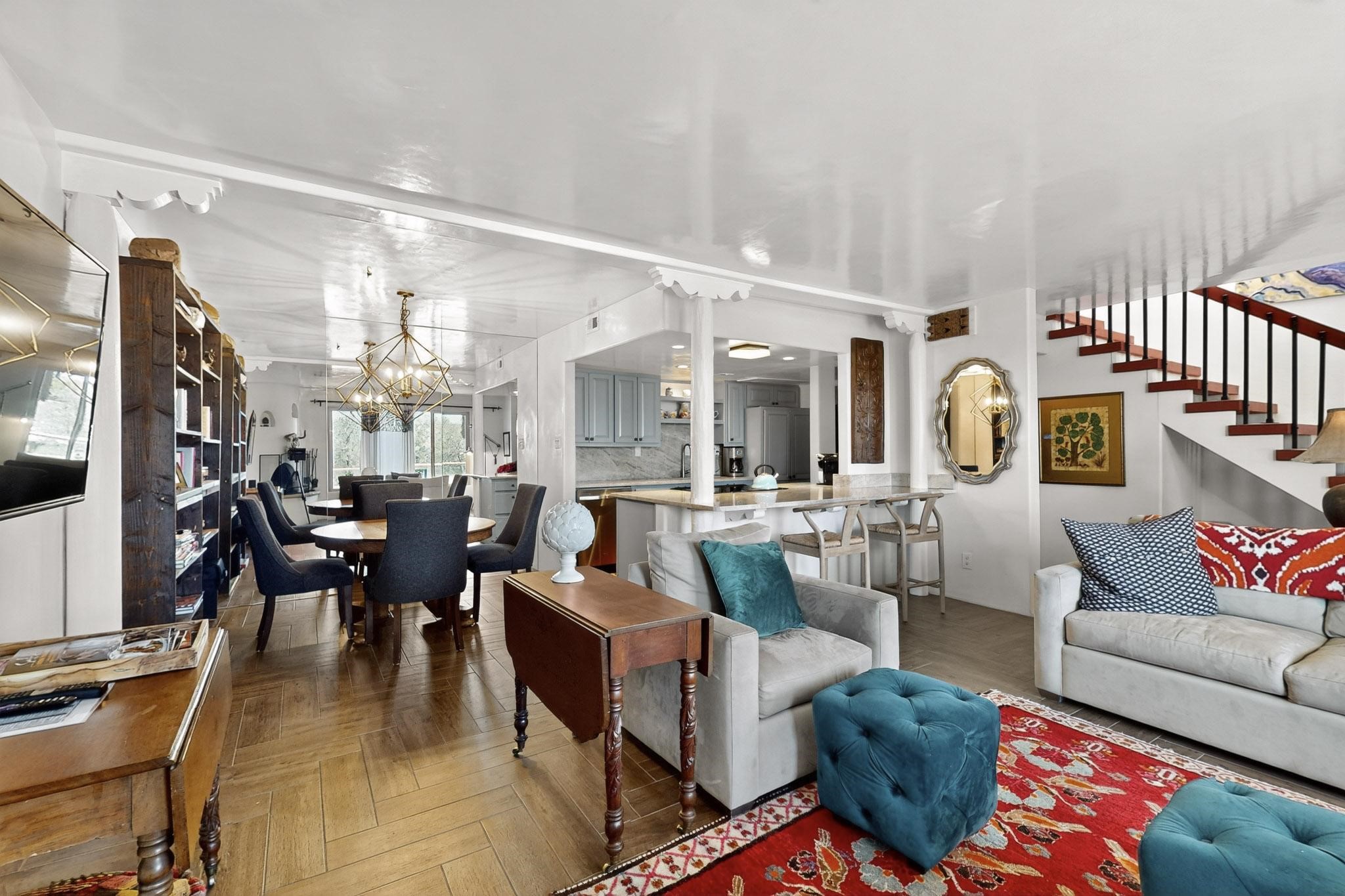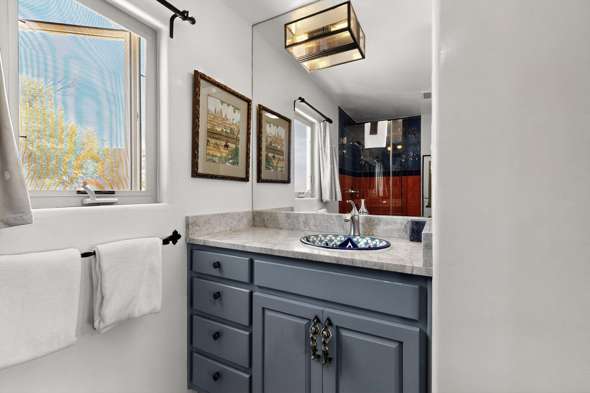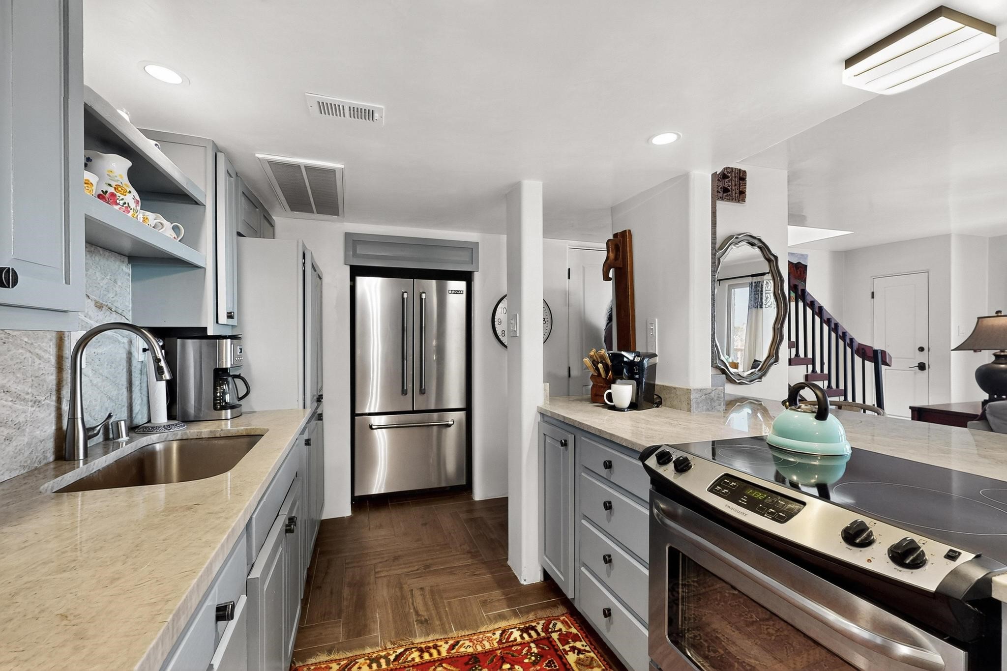 This lovely and convenient two story condo is located not far from the plaza, close to Fort Marcy, and at the bottom of the road leading up to the ski basin. The unit overlooks the green area in the center of the complex, with plenty of light. The living room has a charming kiva fireplace in the corner and views, the dining area has a full mirror to add to the space, and there are built in bookcases. The galley kitchen is convenient and a delight. Located on the main floor is a bath. Up the stairs are two bedrooms, both with access to a private balcony. There is a nicely sized primary bedroom with a private bath and a stacked laundry, and a guest bedroom with a bath in the hall. This beautiful condo complex is arranged on a hill with lovely views, a heated indoor swimming pool, hot tub, storage, rv parking, and on-site management. This particular unit has new heating, air conditioning, roof, and hot water on demand. All furnishings can be included.