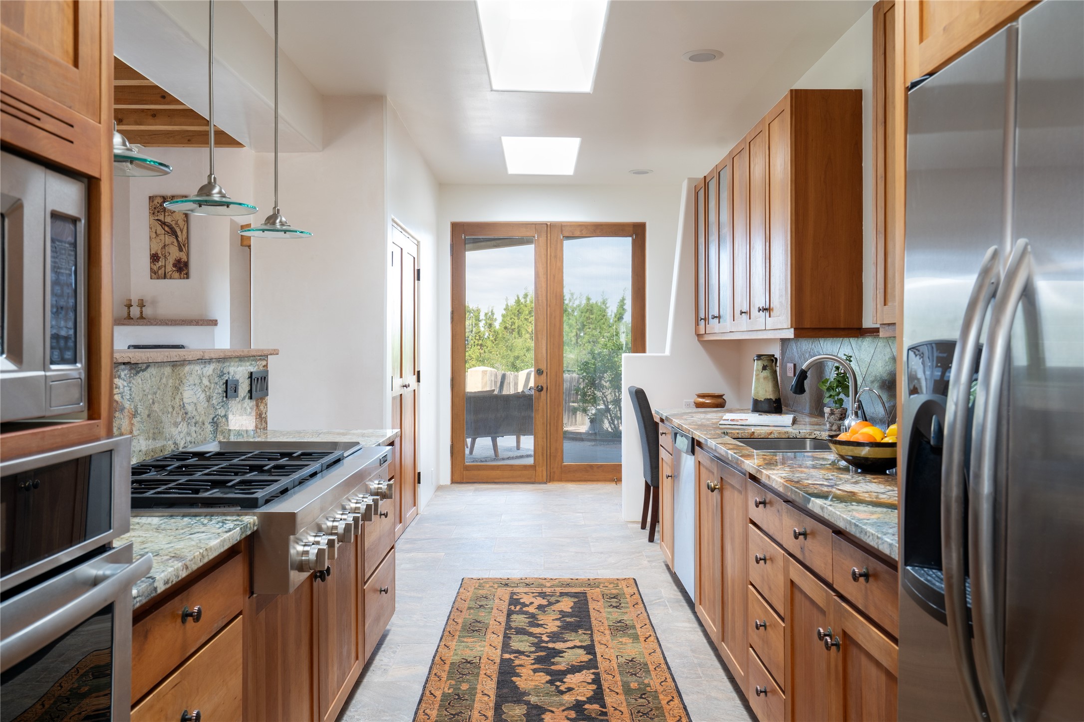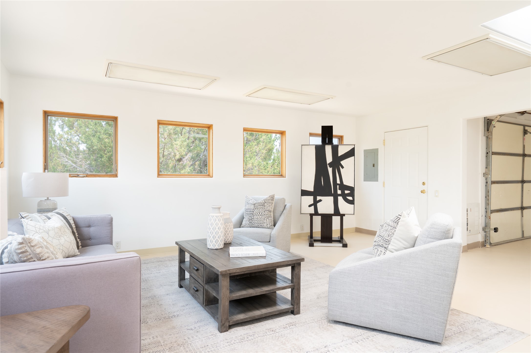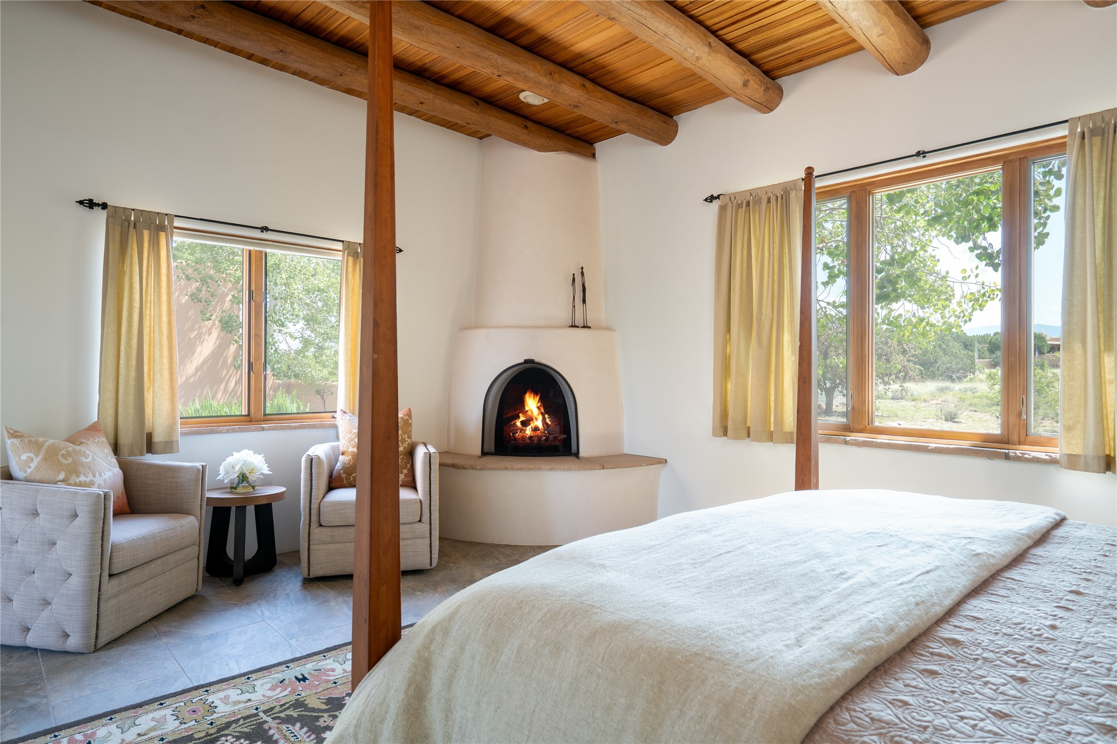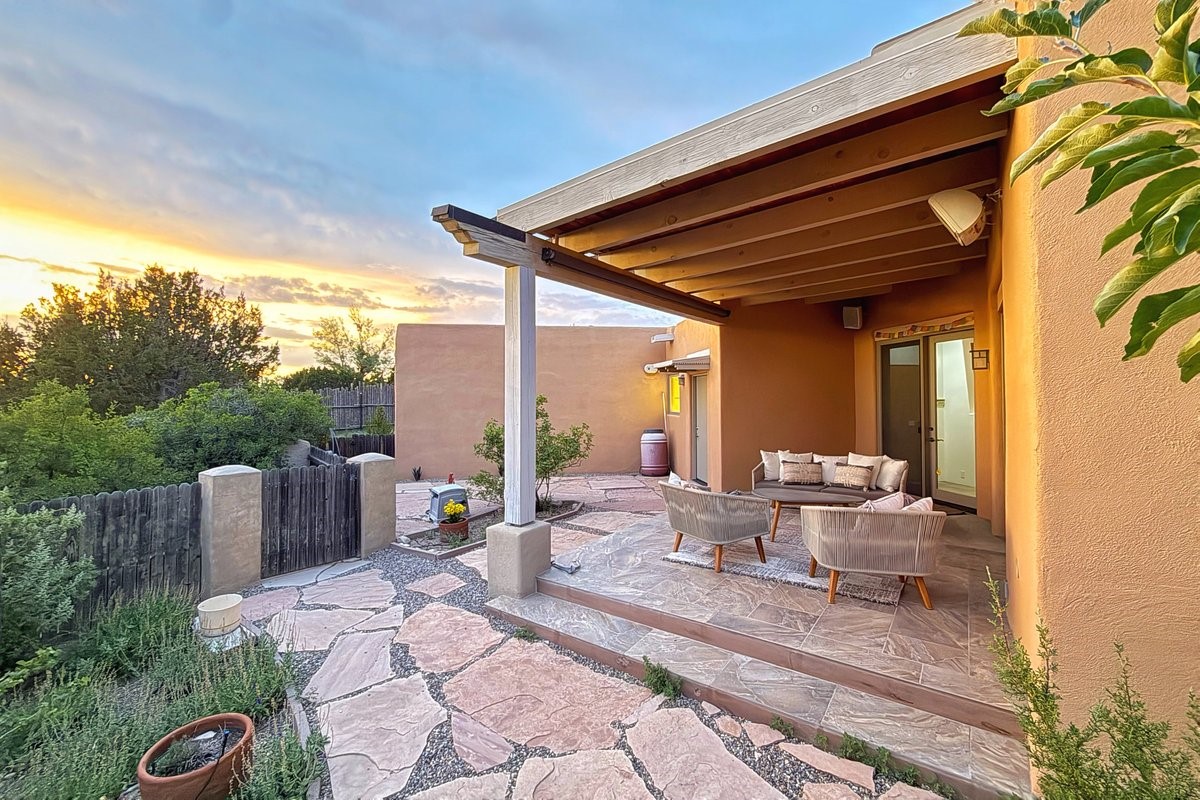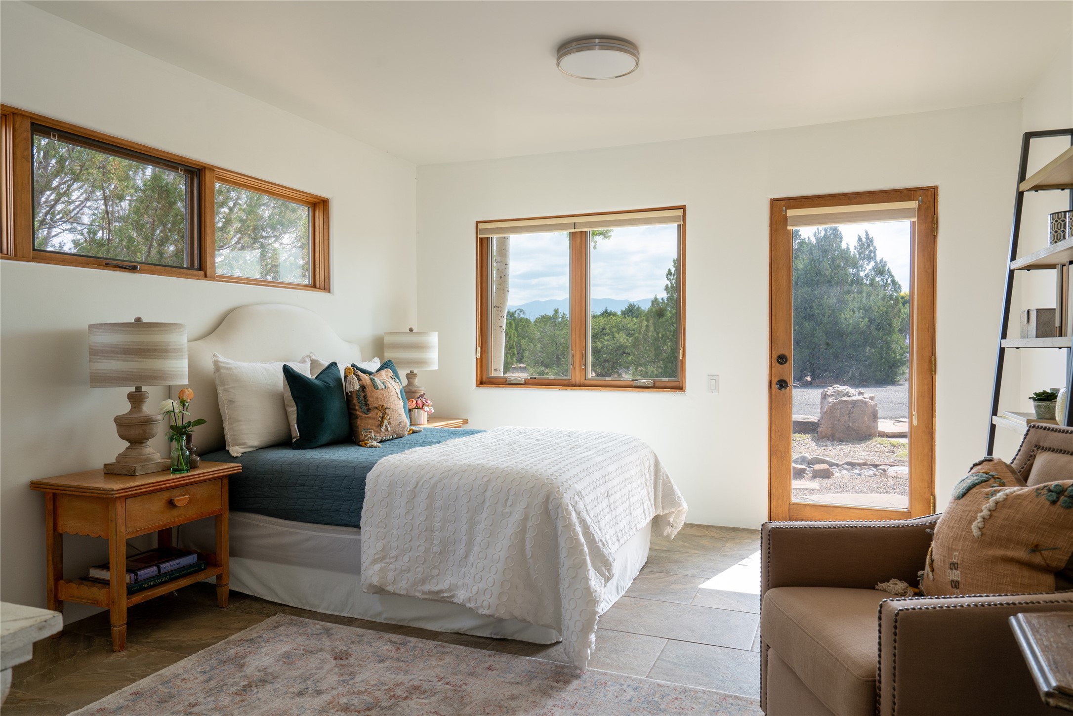 Here's everything you're looking for in a Santa Fe retreat, without the HOA. If you've been searching for that perfect Santa Fe home, the one with sweeping mountain views, single-level living, studio space, and just enough land to feel free without being overwhelmed, here it is. Set on 2.5 private acres at the end of a quiet cul-de-sac, this Prull custom home is designed for comfort, creativity, and connection to the landscape. The open layout features 3 bedrooms, 2 baths, and no interior steps with Italian porcelain tile throughout. The primary suite is separated from the other bedrooms. Skylights throughout bring in beautiful natural light all day. The living, dining, and kitchen spaces flow easily, ideal for both everyday living and entertaining. There's a charming front courtyard with a koi pond and space for your morning coffee, with a door from the breakfast nook for convenience. One of the most versatile features is the attached studio space, complete with its own bathroom. Whether you need an art studio, office, workshop, or private guest quarters, this flexible area is ready for your vision. The property also includes a three-car garage, radiant heat, mini splits in the primary and guest wing, and a separate personal observatory with a moveable roof for the ultimate dark-sky stargazing experience (Telescope negotiable). There's even a private door from the primary bathroom that opens directly to the backyard and hot tub, creating your own peaceful sanctuary under the stars.There's also a recently maintained roof and several new windows in 2024. And the location, just six miles from the Plaza, offers privacy and room to live your best Santa Fe lifestyle.