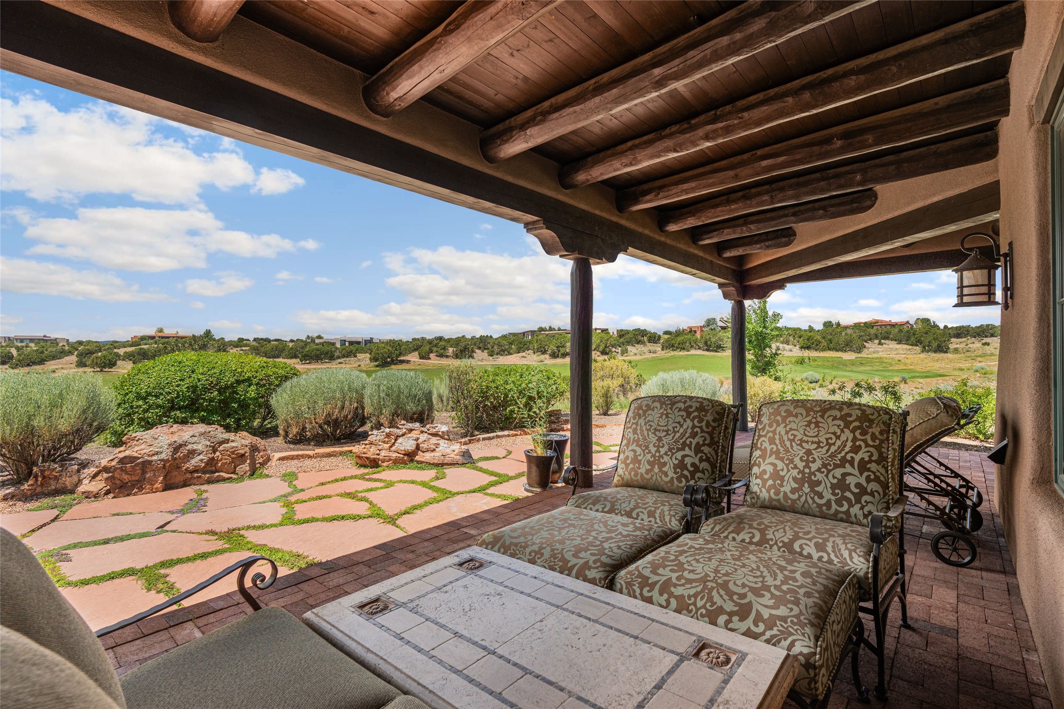 This home is the epitome of Refined Santa Fe Elegance, with 4 Bedrooms, 4.5 baths, 4 Fireplaces, No Steps and panoramic views of Sandia Mountain & the Fourth Fairway of the Sunset Golf Course, at the end of a cul-de-sac in Gated Las Campanas. An expansive hallway for artwork features 2 sets of French doors that open to the wrap-around portal for dining & relaxing which extends to the Living Room, also showcases the golf course view. The Gourmet Kitchen includes Viking appliances, an over-size island with prep sink, menu-planning desk & Butler's Pantry with wine cooler. The Main Bedroom suite offers a luxurious Spa Bath with large shower & whirlpool tub plus a walk-in closet worthy of a designer retail store. Bedroom Two is sequestered from the Main and has an en-suite bath. Bedroom Three with en-suite bath is adjacent to the Main and currently used as an office. Bedroom Four offers total privacy, as an attached Casita with en-suite bath & mini-kitchenette. The expansive brick Portal off the gallery hall includes a built-in BBQ & impressive fireplace, providing the perfect venue for entertaining, dining, relaxing or savoring the panoramic golf course & Sandia Mountain views. The Two-car Garage has eliminated garage clutter, with 29 feet of handsome cabinets plus a power wall to store bicycles, skis & other outdoor equipment. Come see why this 4-Bedroom home with Golf & Mountain views is the perfect embodiment of elegant Santa Fe resort living.