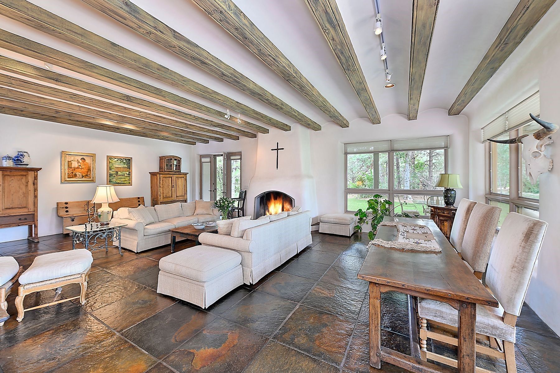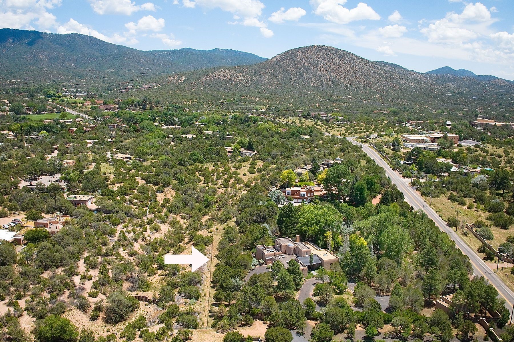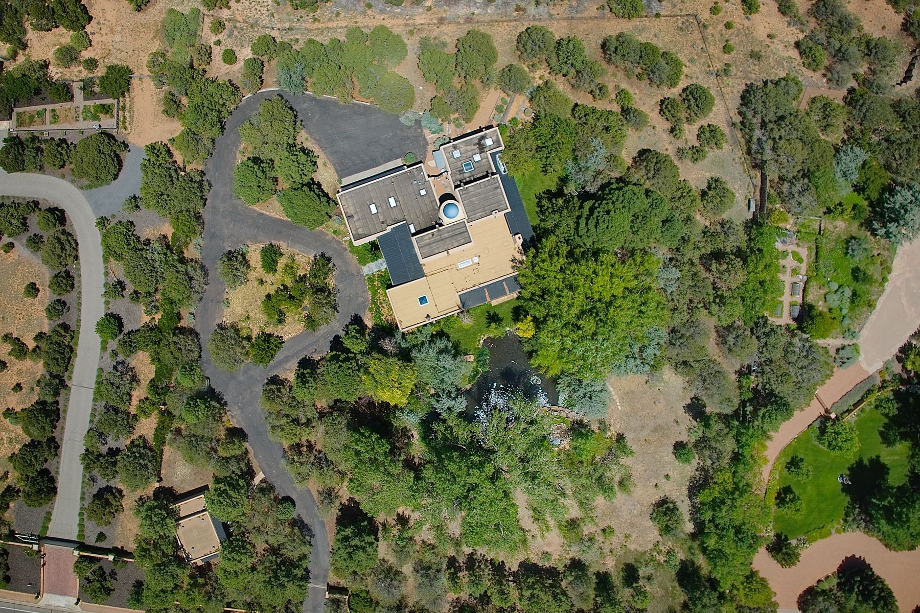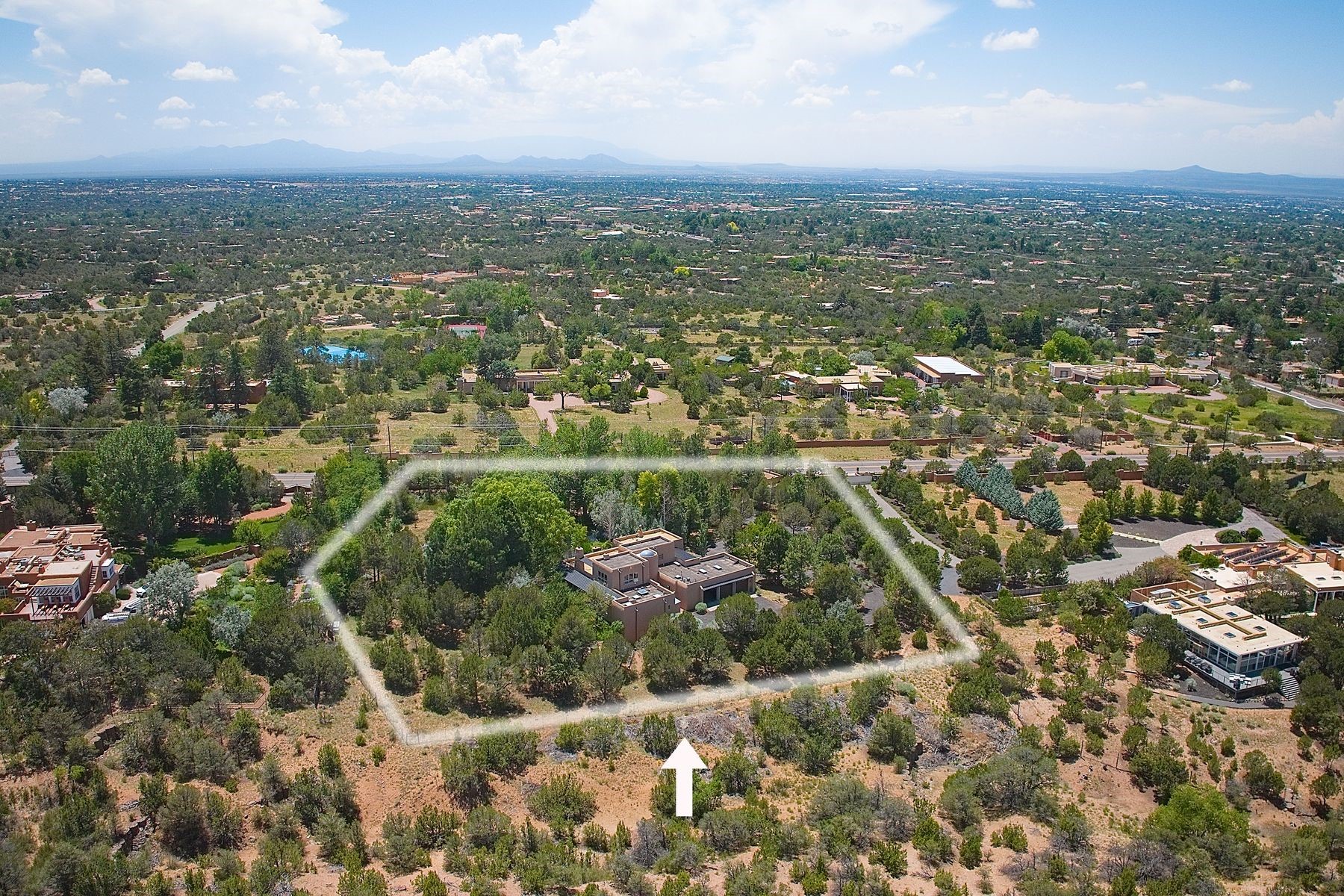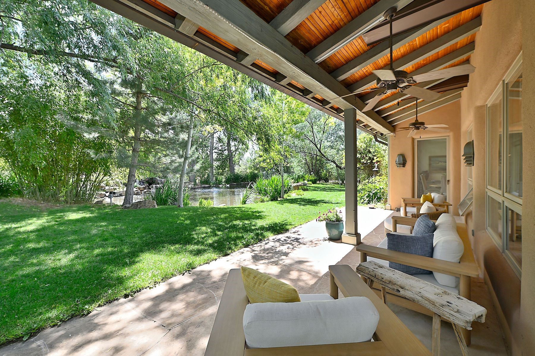 In recent years, much has been made about the treasure of Forrest Fenn, but perhaps the most meaningful treasure the renowned art dealer and author ever possessed was this idyllic oasis off the historic Old Santa Fe Trail in the capital city of New Mexico. Occupying 2.65 remarkably verdant acres, the gated estate is a hidden green gem, lush with trees, aspens, cottonwoods, pines, pinons, and a towering weeping willow that thrive alongside apricot, pear, apple, cherry, and peach trees as well as grape vines, flourishing lawn and wild grasses, and flowering plants and vines, all maintained by an irrigation system fed by a private well. The heart of the property is a warm, welcoming 4,596 square-foot residence custom-designed featuring handsome Beijing slate floors, soaring ceilings recalling an Old World chapel, diamond-finish plaster walls, vintage Spanish Colonial doors, a plethora of oversized windows and French doors, clever built-ins designed for the display of collectibles, a striking spiral staircase crowned by a skylight, and a wraparound portal. A portion of this breezy, relaxing outdoor space overlooks another rarity, a pond and waterfall fed by a recirculating stream. An ecosystem for fish, frogs, turtles, and all manner of wild birds, including ducks. Near the property gates is a 645 square-foot guest casita or studio with soaring ceilings, floods of light, a kitchenette, a bath, and storage space. A paved drive leads through the grounds to the finished three-car garage, which includes additional storage and benefits from a heated threshold. While the property is lush, private, secure, and quiet, extending away from the road across an arroyo, the attractions and amenities of Museum Hill, Canyon Road, and the historic Plaza are mere moments away.