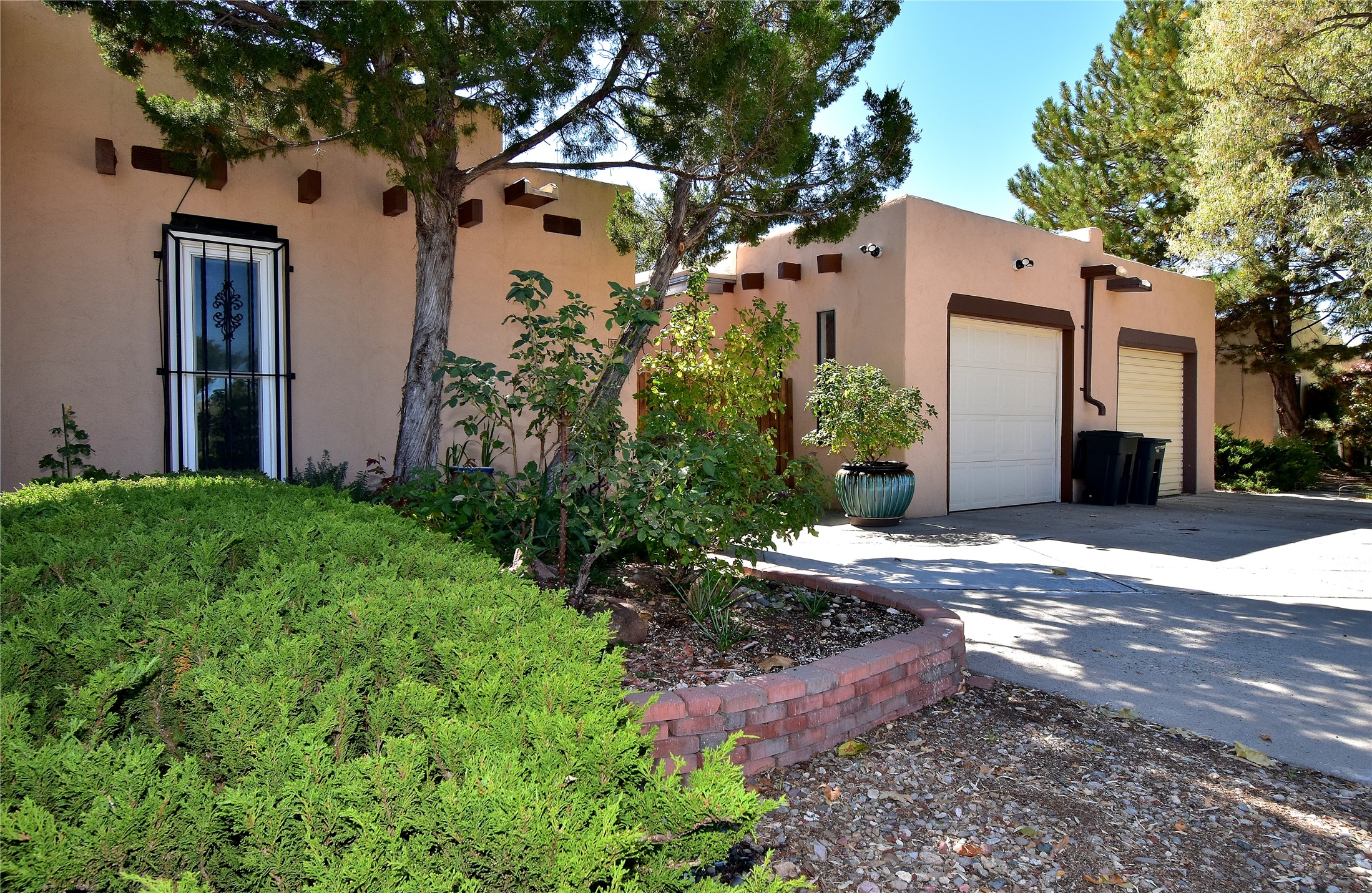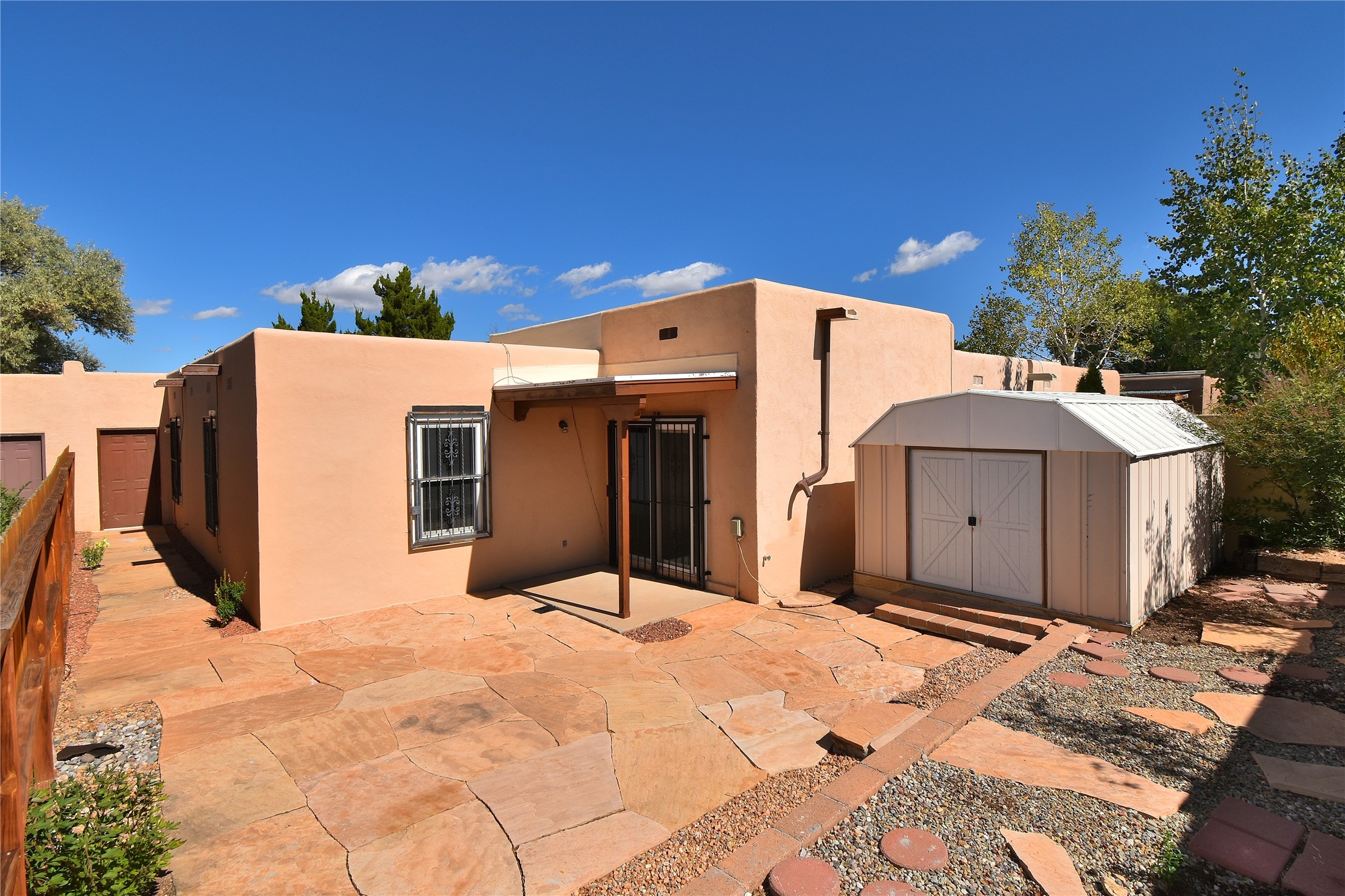 PRICE REDUCED AGAIN! NOW 425K. Beautiful, updated, light and bright and freshly painted home in Pueblo de Rodeo Rd. This single level home offers 3 bedrooms, 2 bathrooms and a 1-car garage with a spacious double driveway providing ample parking. An enclosed front entry courtyard welcomes you into the home. The galley kitchen features granite countertops, tile backsplash, pantry and new microwave in 2025. The backyard is private and offers a covered porch with flagstone and a large shed. Lovely features and amenities include: Newer windows-Remote Hunter Douglas top/down blinds-TPO roof-Tile and carpet floors-New washer and dryer in 2025 including water filter/softener system-Ceiling fans-Walk-in closet in primary suite-Carpet in the bedrooms. Super sweet home not to be missed.