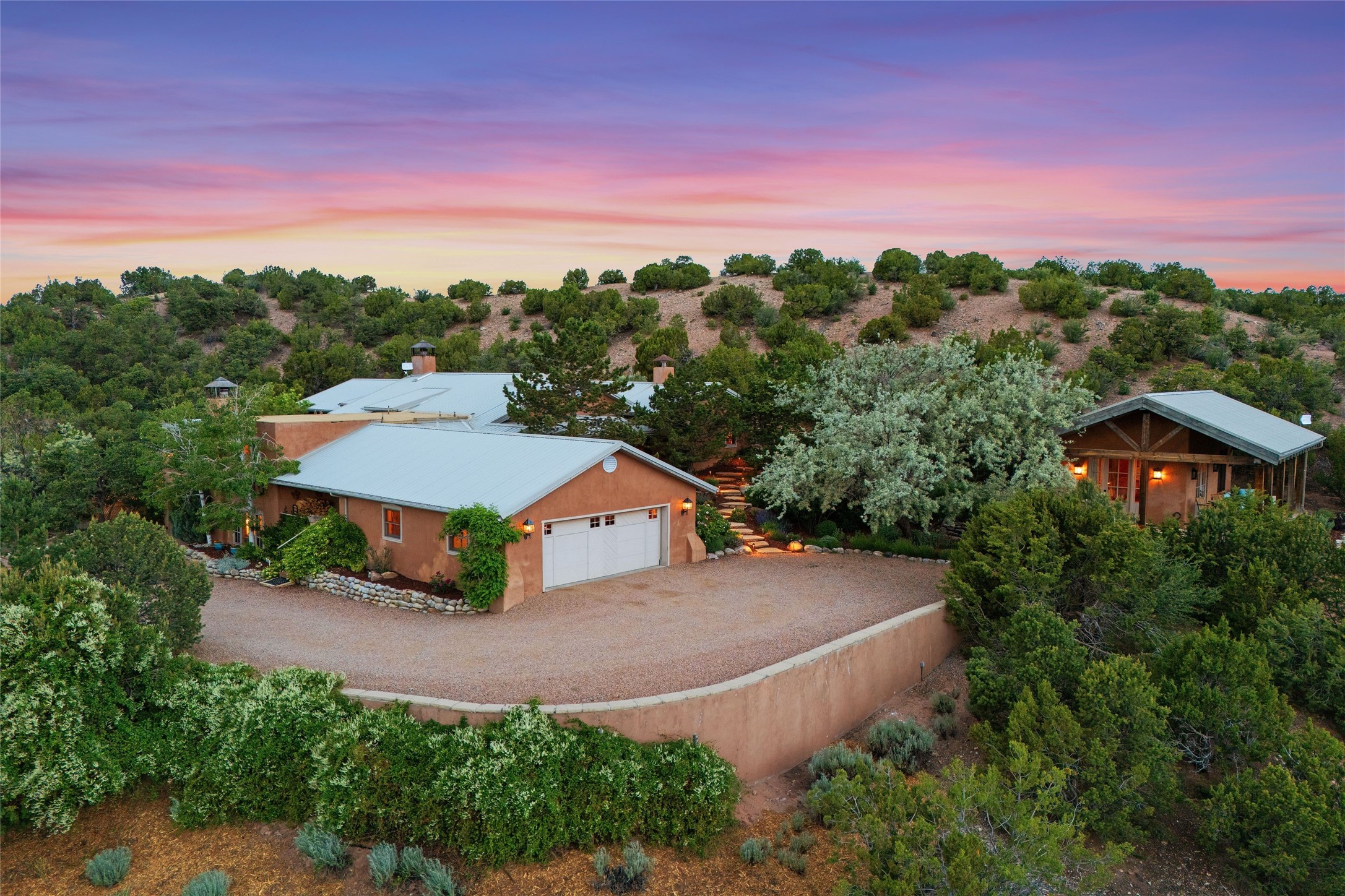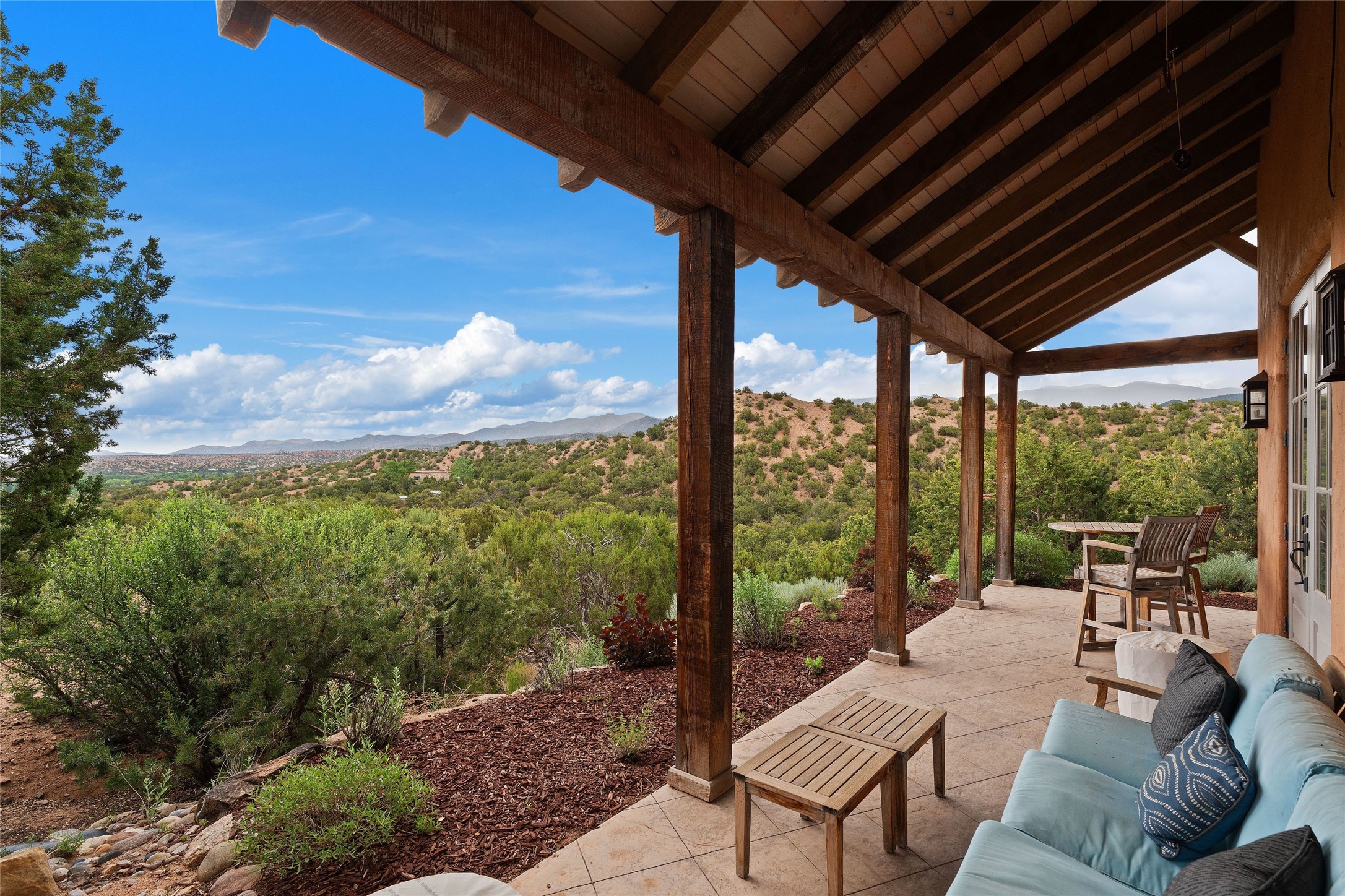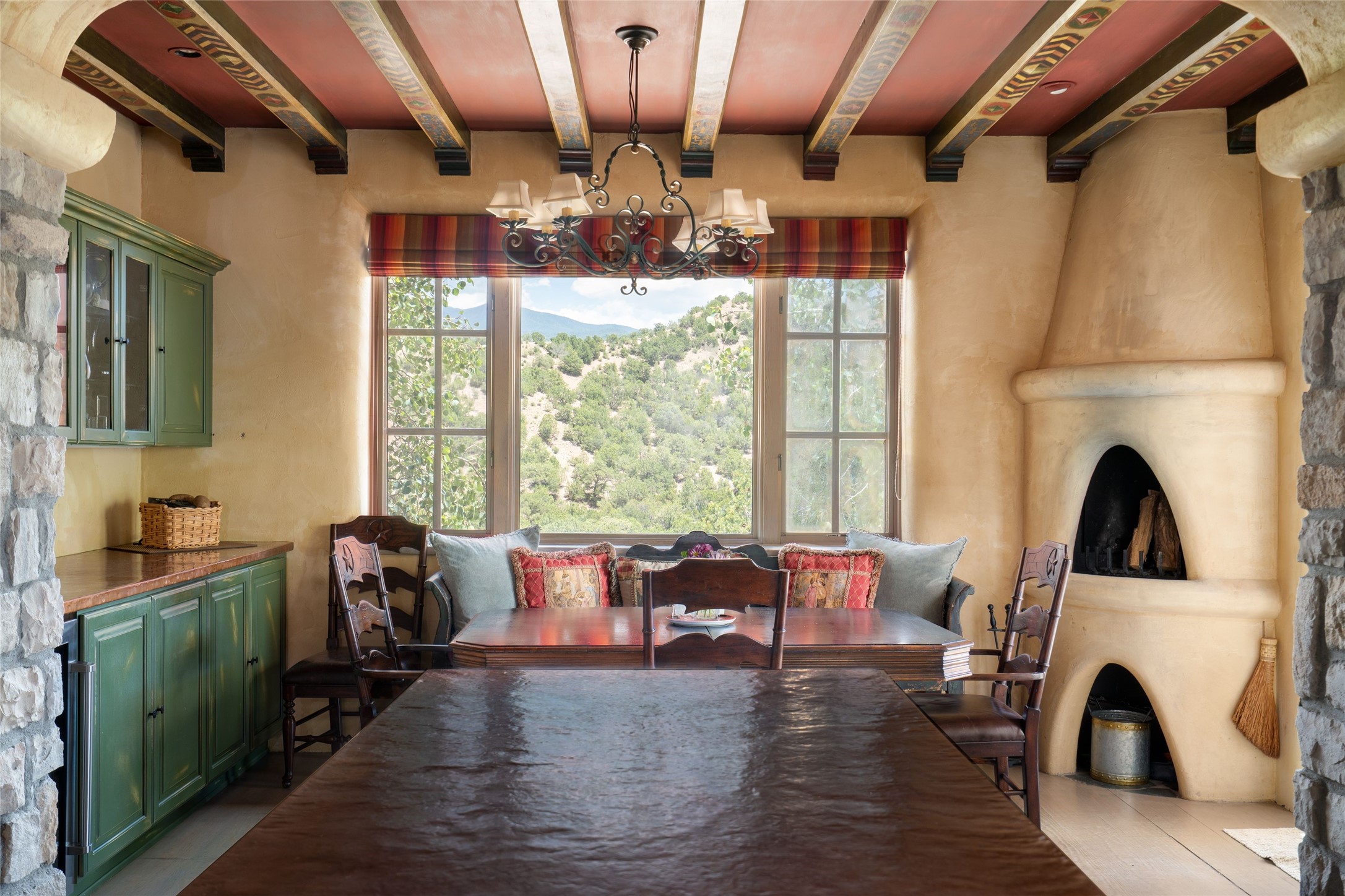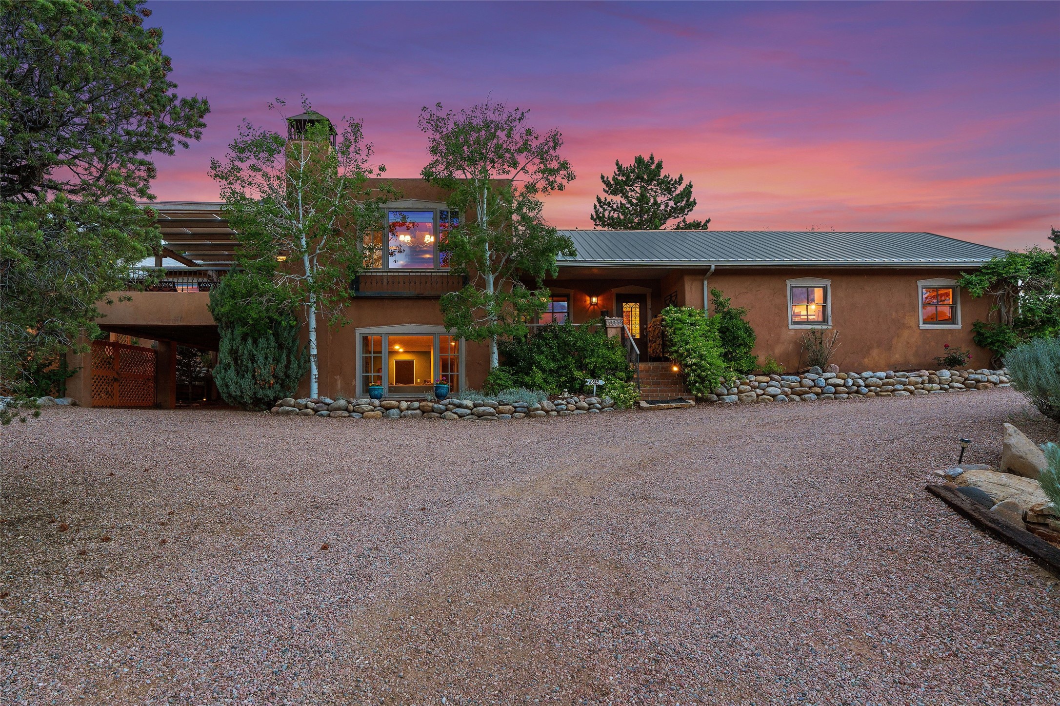A magnificent European inspired estate sited on a hilltop, with breathtaking views of the Sangre de Cristo Mountains, and spanning 7.7 acres of lush sanctuary. This property features a stunning main house and charming detached casita and chapel that has been transformed into an artist/musician's studio. The main house, adorned with bespoke decor, offers 3 bedrooms, 3 full and 2 half baths, library and an office. Showcasing hand-painted 18th century French ceiling beams, arched stone columns, and a blend of wood and stone floors. Antique doors, stained glass skylights, and custom built-ins enhance the expansive living spaces. The spacious master suite includes a sitting area with majestic mountain views and a hand painted clawfoot soaking tub. The lower level offers comfortable guest or caretaker quarters with two distinct living areas, a full kitchen, an office, as well as private entrance through covered parking for privacy and convenience. The detached casita is complete with a kitchen, bedroom, bath, and a charming front porch with a breathtaking view to Taos. Recent upgrades include modern heating and cooling systems for both the main house and casita, along with new kitchens featuring updated counters and cabinetry. Experience total outdoor serenity from the oversized deck to the rose and vegetable gardens, just 8 minutes from downtown Santa Fe!