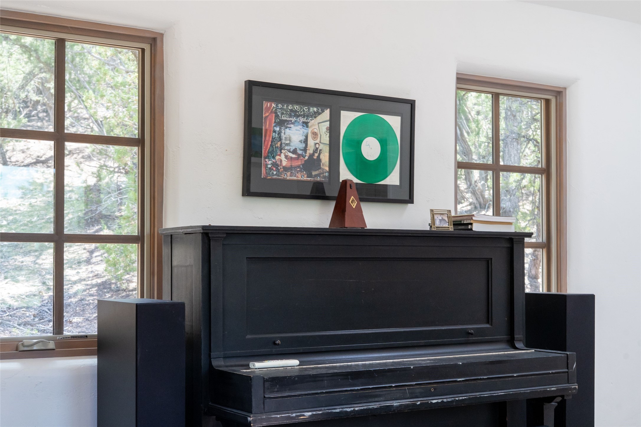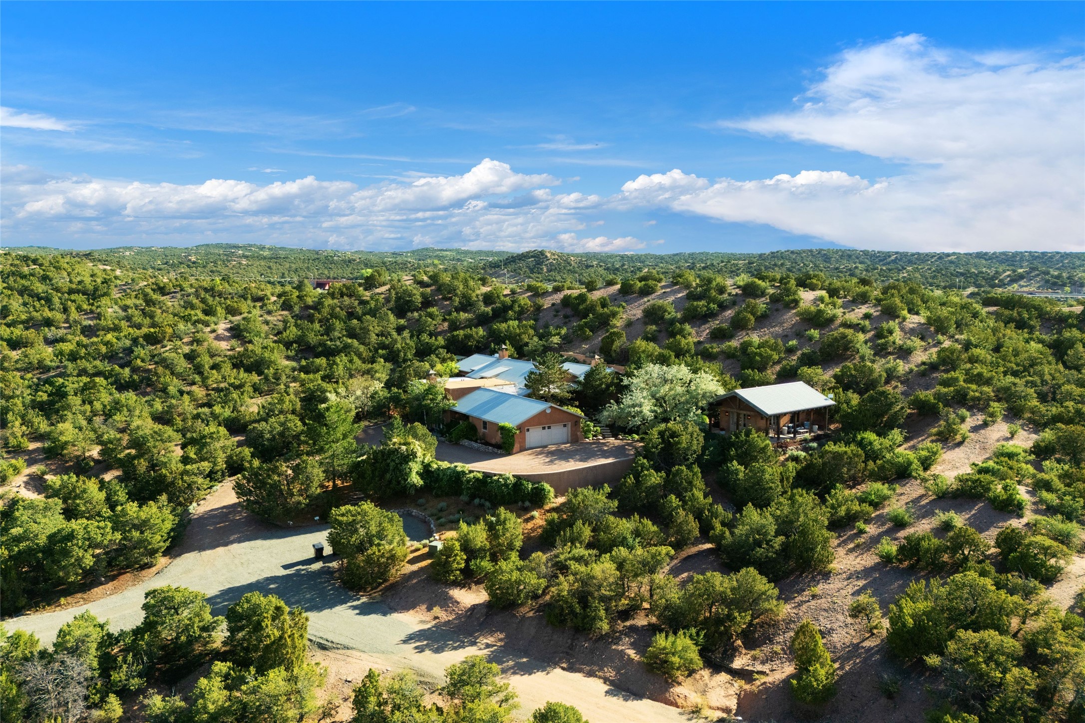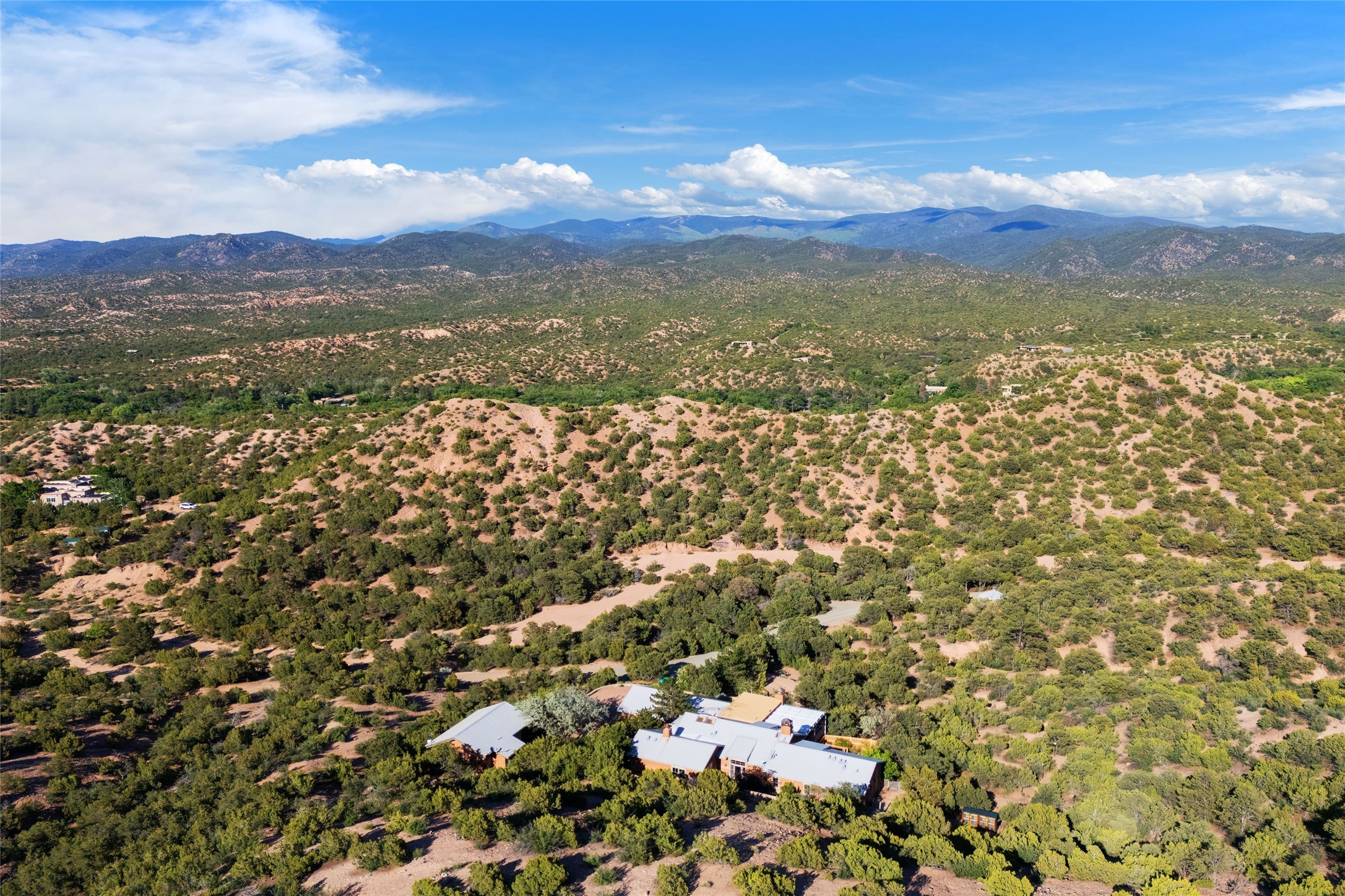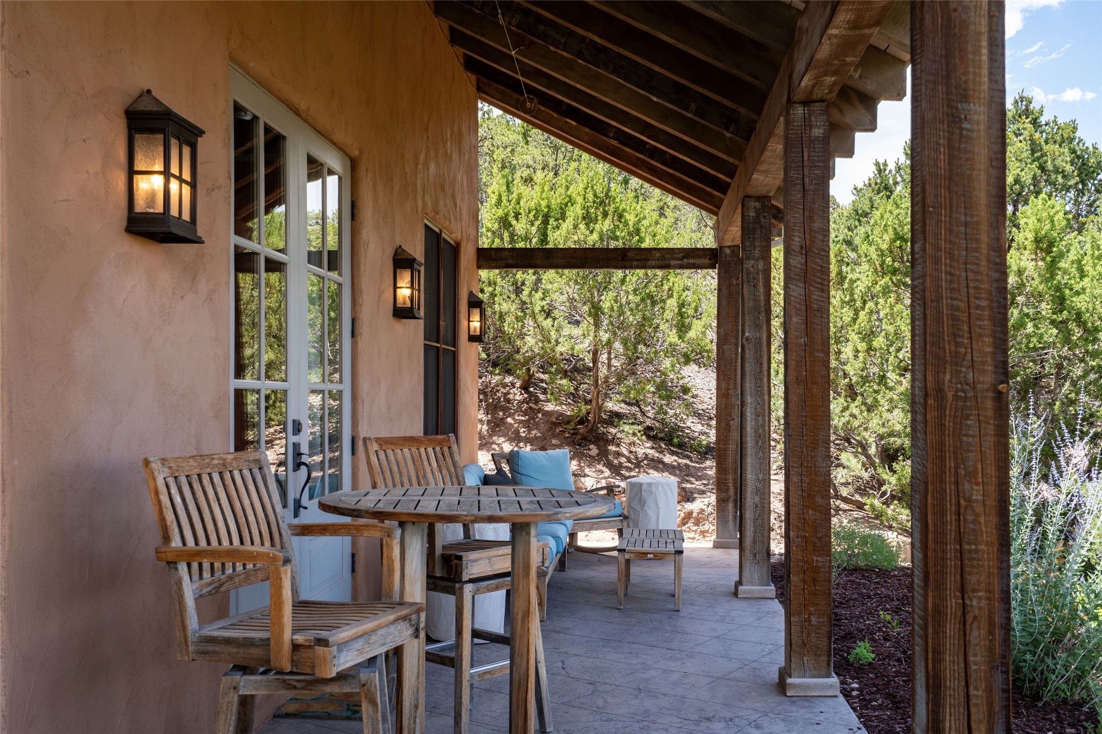 A magnificent European inspired estate sited on a hilltop, with breathtaking views of the Sangre de Cristo Mountains, and spanning 7.7 acres of lush sanctuary. This property features a stunning main house and charming detached casita and chapel that has been transformed into an artist/musician's studio. The main house, adorned with bespoke decor, offers 3 bedrooms, 3 full and 2 half baths, library and an office. Showcasing hand-painted 18th century French ceiling beams, arched stone columns, and a blend of wood and stone floors. Antique doors, stained glass skylights, and custom built-ins enhance the expansive living spaces. The spacious master suite includes a sitting area with majestic mountain views and a hand painted clawfoot soaking tub. The lower level offers comfortable guest or caretaker quarters with two distinct living areas, a full kitchen, an office, as well as private entrance through covered parking for privacy and convenience. The detached casita is complete with a kitchen, bedroom, bath, and a charming front porch with a breathtaking view to Taos. Recent upgrades include modern heating and cooling systems for both the main house and casita, along with new kitchens featuring updated counters and cabinetry. Experience total outdoor serenity from the oversized deck to the rose and vegetable gardens, just 8 minutes from downtown Santa Fe!