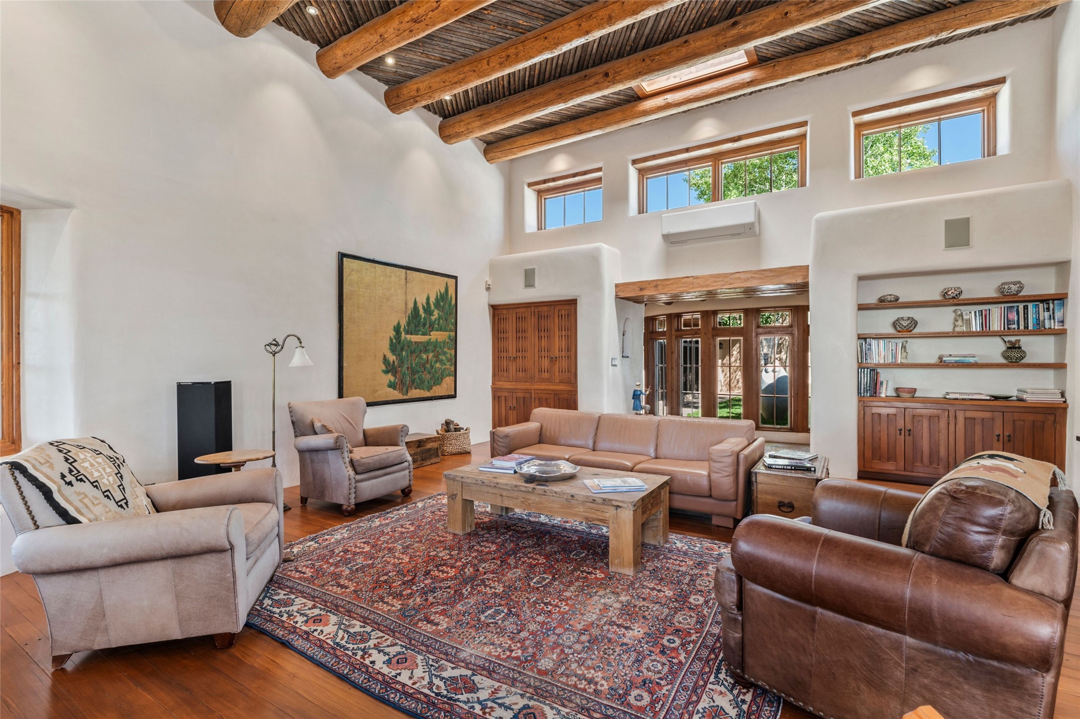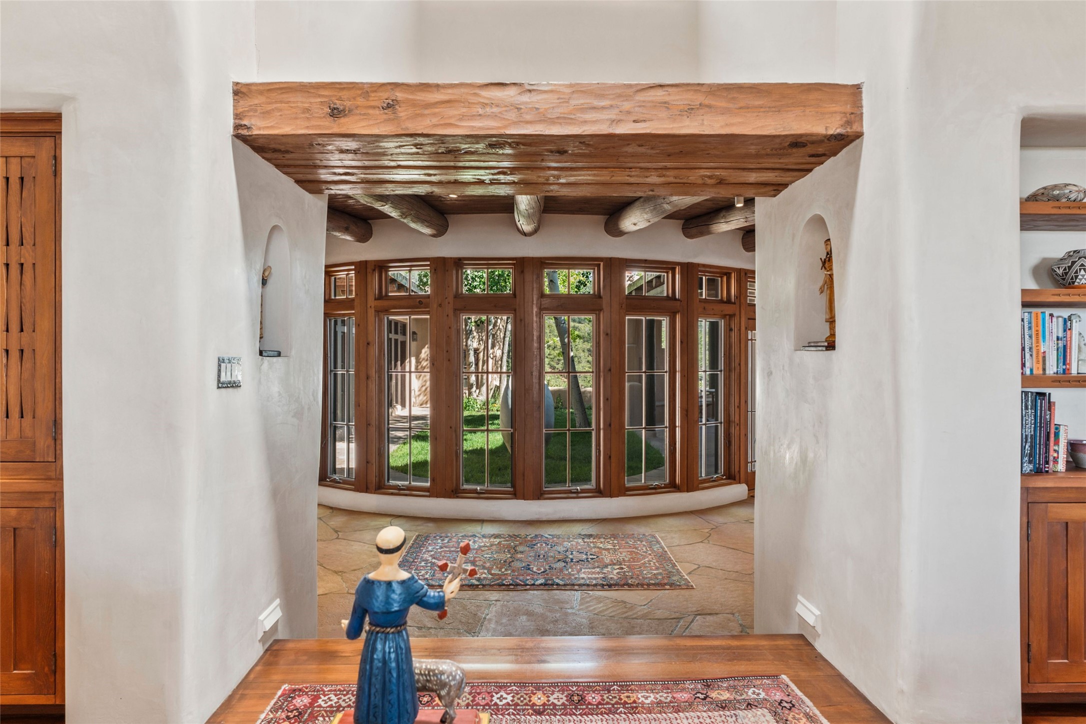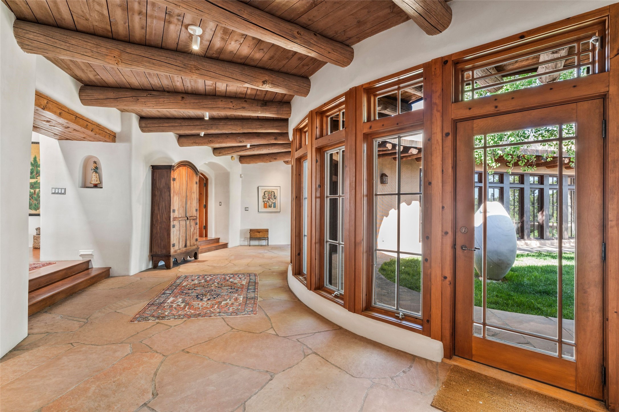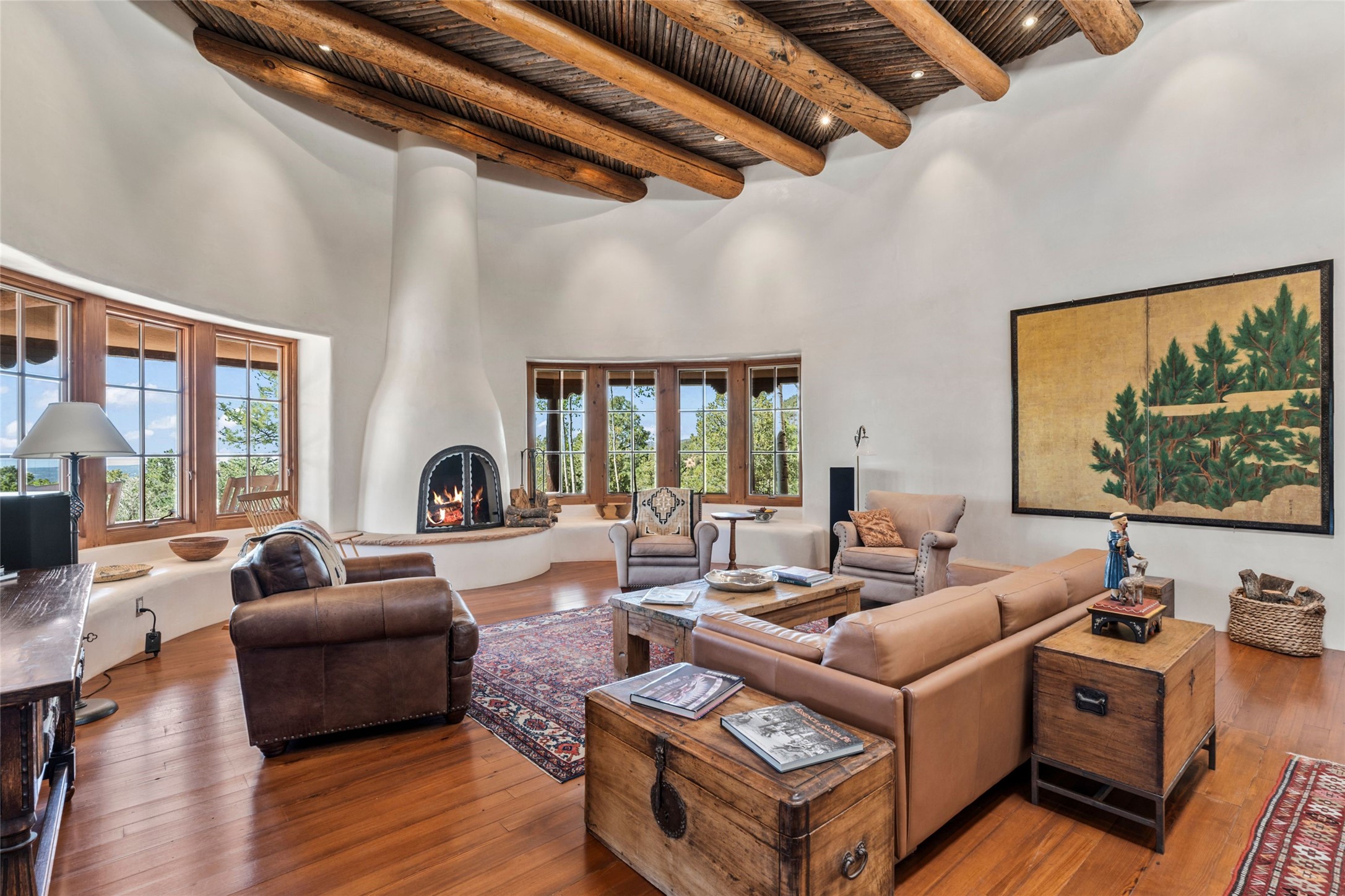 On the edge of the historic eastside, above St. John's College, within the gated and desirable Ponderosa Ridge community, 1863 Camino de Cruz Blanca is a rare and exceptional property. Carrying a Michael Bauer-designed and a Doug McDowell-built pedigree, this prize provides a substantial 3-bedroom main house, a 2-bedroom casita, a studio, and pool on over 4-acres bordering public lands. The main house sits high above town with views to the west towards Jemez Mountains and Los Alamos, and the backyard and pool look east up at Atalaya Mountain looming above. The 4,960 sq. ft. main house and 1,172 sq. ft. casita are rich in craftsmanship and integrity, built of double adobe with classic puebloan features - large vigas, carved wood doors, flagstone, antique pine and saltillo tile floors - while having the scale to accommodate modern living. In addition, the property has a separate 275 sq. ft. room that could serve as an exercise room or artist studio. The outdoor spaces are a secluded extension of the open space beyond and achieve the balance between maximizing views and privacy. The lot provides direct access to the Atalaya and St. John's hiking/biking trails. Still owned by the original owner, the property exudes pride of ownership. Recent improvements, completed in 2024 and 2025, include a new TPO roof, newly wrapped exterior stucco, and new heat pump minisplit heating and cooling. Two adjacent, separately deeded, buildable lots are also available for purchase separately, increasing the offering to 13 total acres. 1863 Camino de Cruz Blanca is an incredible property of great substance and character, set in a "goldilocks" location that perfectly strikes close proximity to downtown with direct connectivity to our unbounded natural setting.