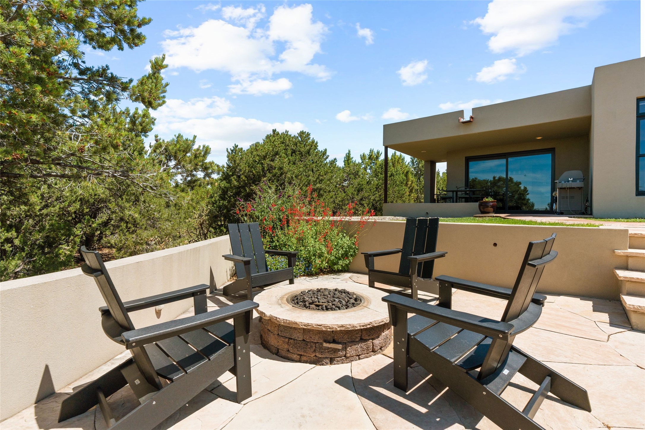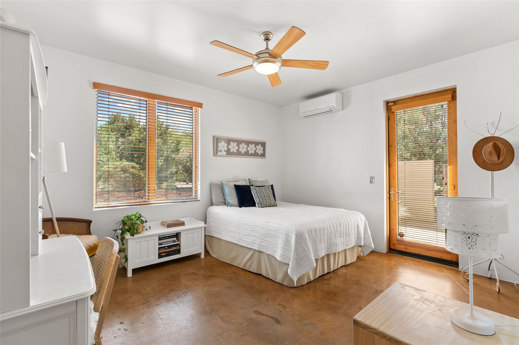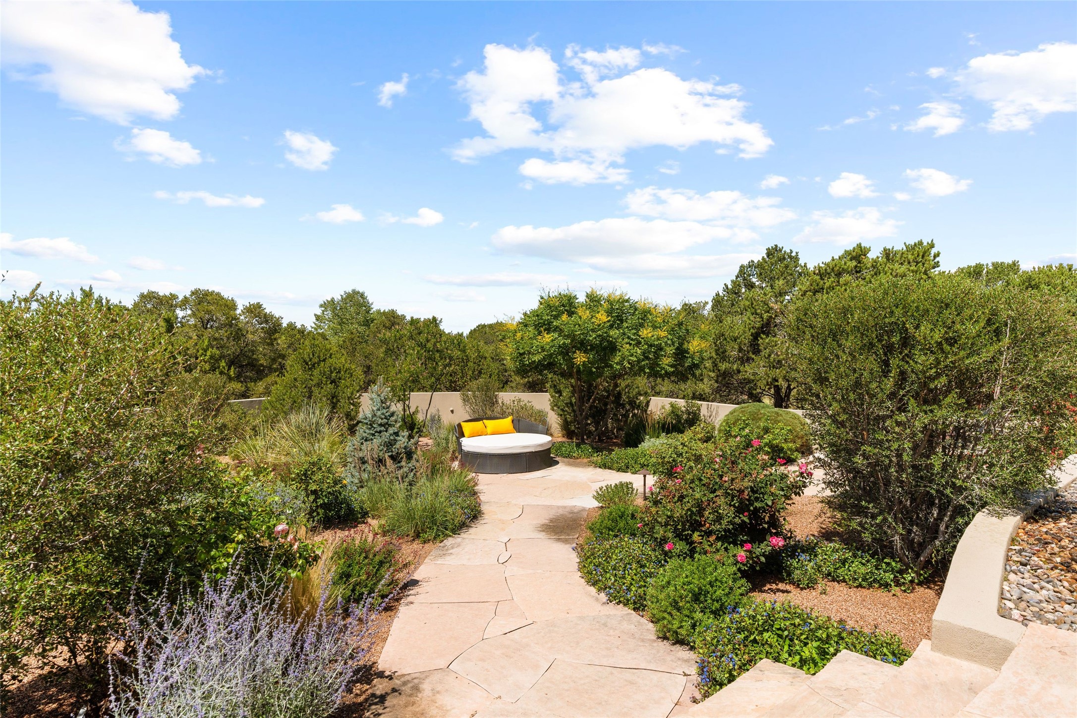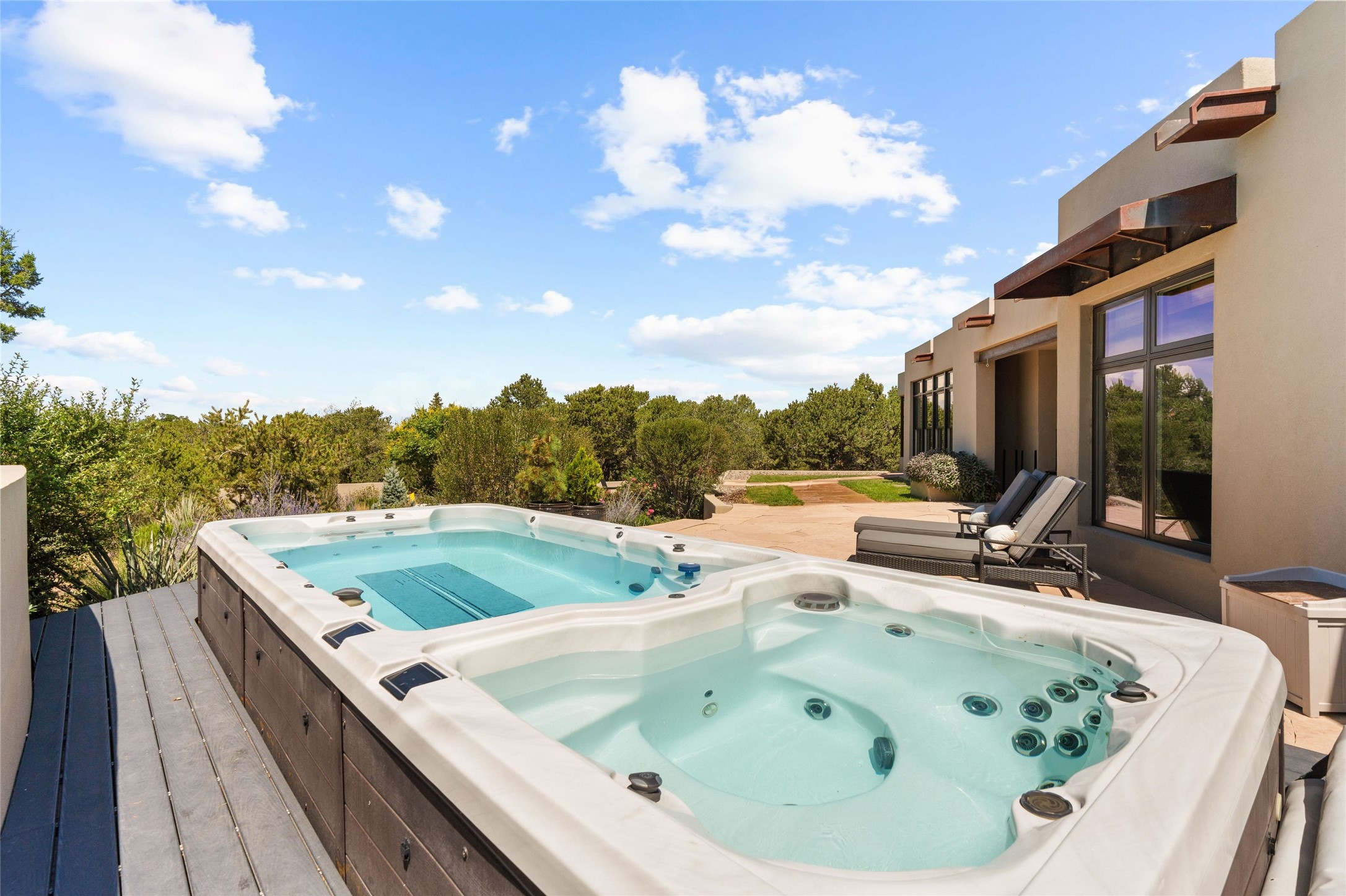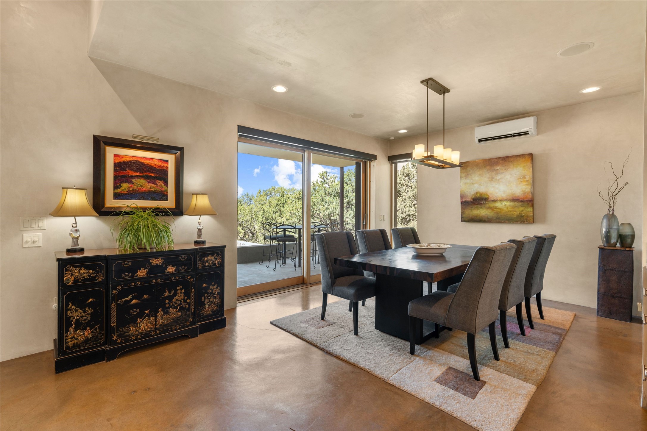 Rooted in natural materials and sustainable design, this serene Santa Fe residence offers a rare combination of tranquility, flexibility, and energy efficiency. Built using ICF (Insulated Concrete Forms) construction, the home maintains comfortable indoor temperatures year-round with radiant in-floor heating, mini-split systems, and solar power that keeps electric bills around $12 per month. Concrete floors add an earthy elegance throughout the main home, complemented by cork overlays in key living areas for warmth and comfort.The layout supports both daily ease and extended hosting, with multiple indoor living spaces, a dedicated office/utility room, and a bonus den ideal for hobbies or guest overflow. The separate casita provides a private retreat for visitors or live-in support, with its own kitchenette, spacious bathroom, and independent heating.Step outside to enjoy multiple landscaped patios that invite quiet mornings or lively evenings, enhanced by a gas fire pit, a swim spa and hot tub -- perfect for stargazing or unwinding after a day on the trails. From the main portal, take in inspiring views of Sun and Moon Mountain to the southeast and the distant Jemez range to the west, offering a shifting backdrop of natural beauty in every season.Located on a peaceful .82-acre lot, this home is just minutes from Santa Fe's Plaza, Museum Hill, the city's top medical centers, grocery stores, and shopping. Whether you're seeking a restful base for exploring town, a retreat for entertaining, or a long-term residence focused on well-being and sustainability, this property balances privacy and convenience in one thoughtfully designed package.