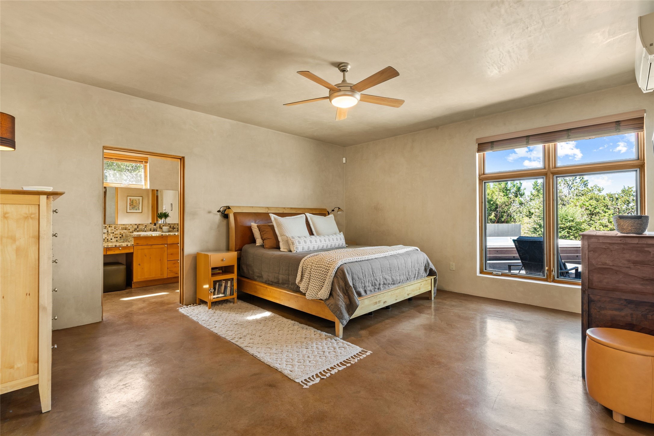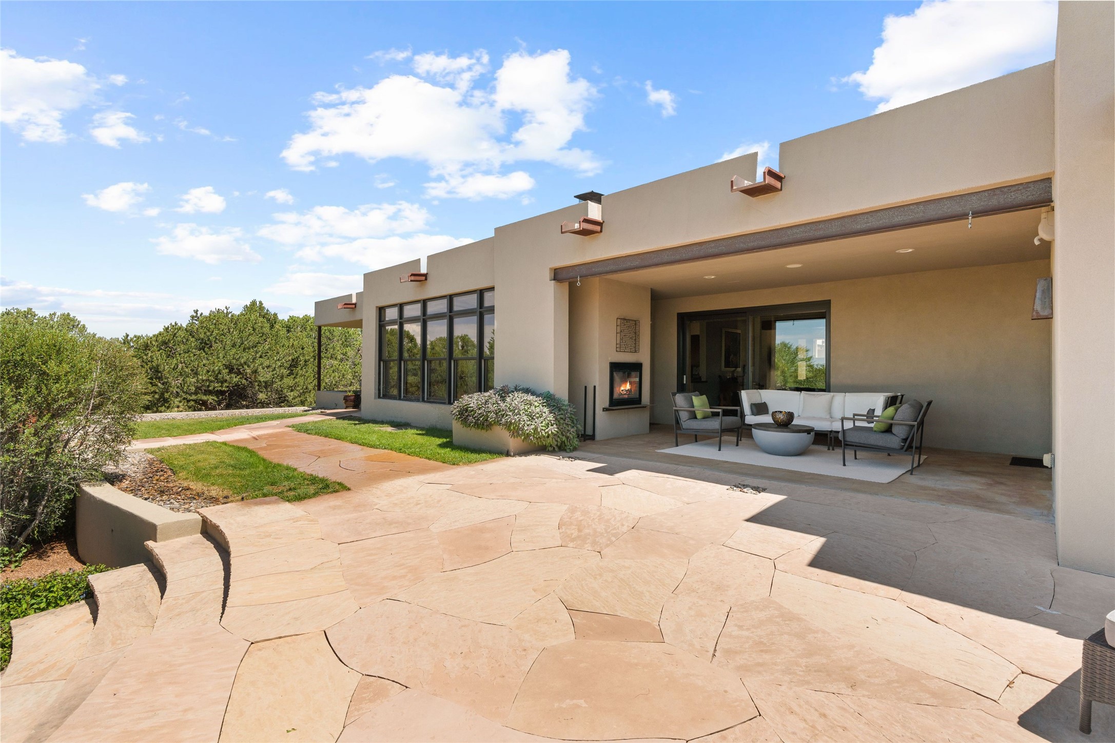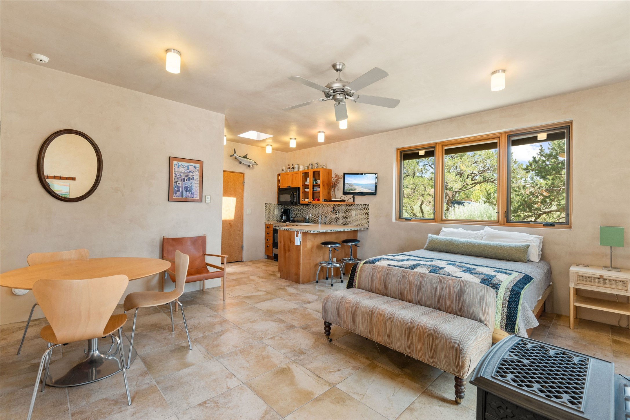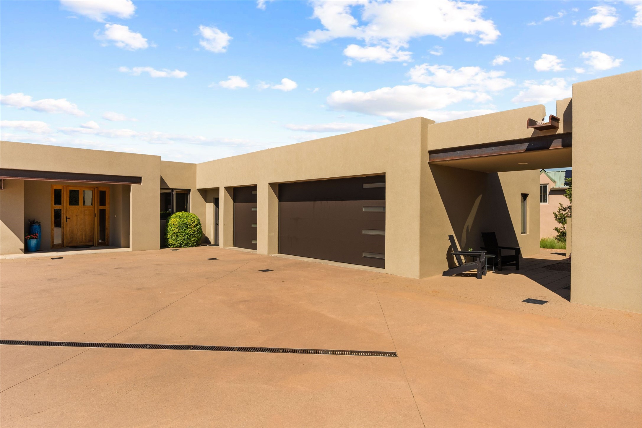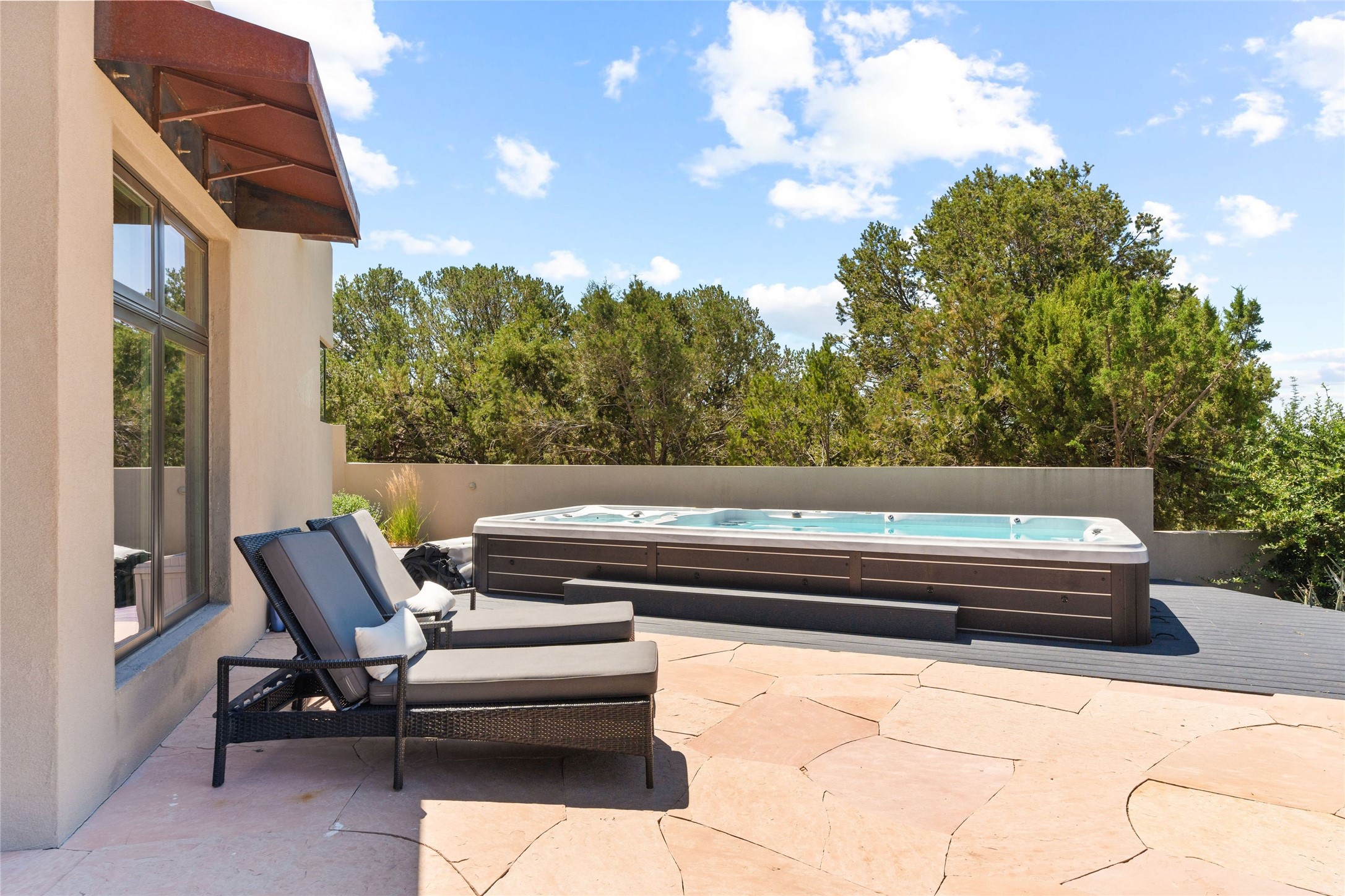 Rooted in natural materials and sustainable design, this serene Santa Fe residence offers a rare combination of tranquility, flexibility, and energy efficiency. Built using ICF (Insulated Concrete Forms) construction, the home maintains comfortable indoor temperatures year-round with radiant in-floor heating, mini-split systems, and solar power that keeps electric bills around $12 per month. Concrete floors add an earthy elegance throughout the main home, complemented by cork overlays in key living areas for warmth and comfort.The layout supports both daily ease and extended hosting, with multiple indoor living spaces, a dedicated office/utility room, and a bonus den ideal for hobbies or guest overflow. The separate casita provides a private retreat for visitors or live-in support, with its own kitchenette, spacious bathroom, and independent heating.Step outside to enjoy multiple landscaped patios that invite quiet mornings or lively evenings, enhanced by a gas fire pit, a swim spa and hot tub -- perfect for stargazing or unwinding after a day on the trails. From the main portal, take in inspiring views of Sun and Moon Mountain to the southeast and the distant Jemez range to the west, offering a shifting backdrop of natural beauty in every season.Located on a peaceful .82-acre lot, this home is just minutes from Santa Fe's Plaza, Museum Hill, the city's top medical centers, grocery stores, and shopping. Whether you're seeking a restful base for exploring town, a retreat for entertaining, or a long-term residence focused on well-being and sustainability, this property balances privacy and convenience in one thoughtfully designed package.