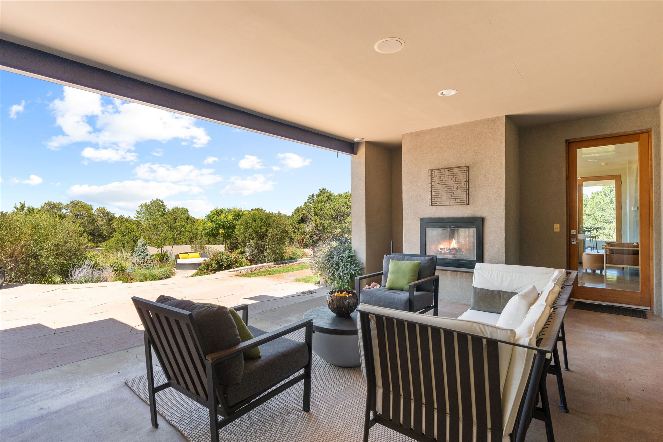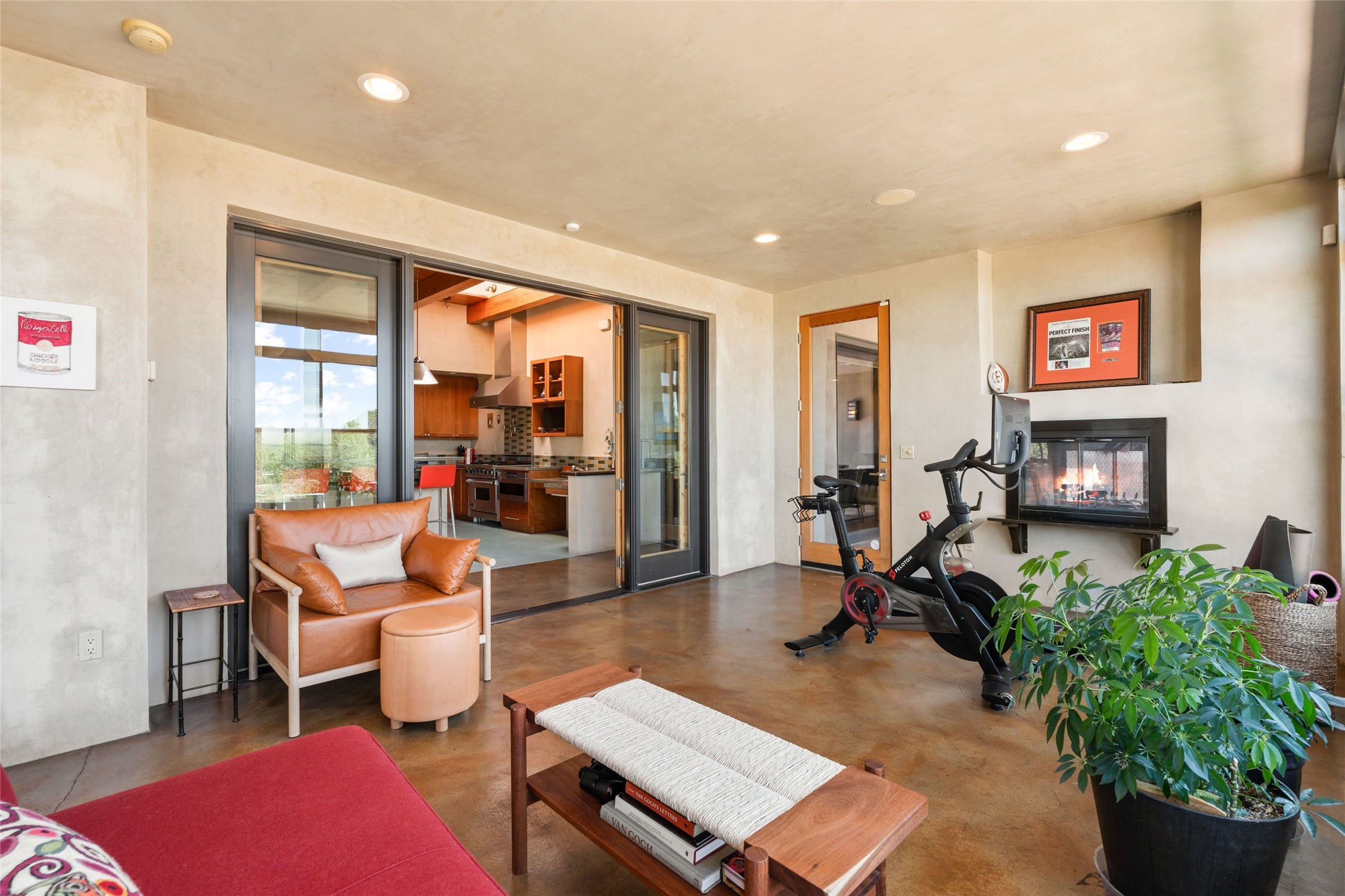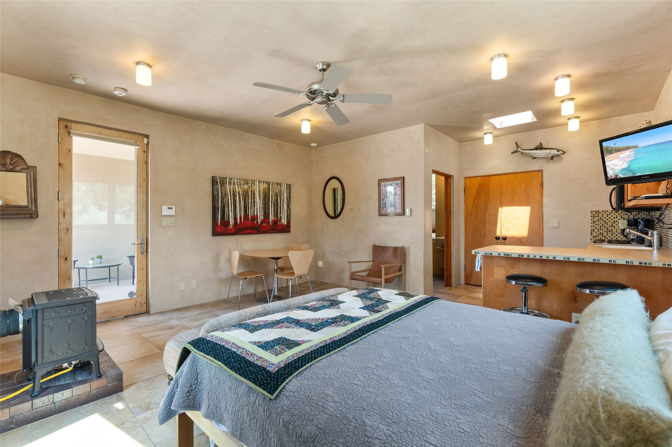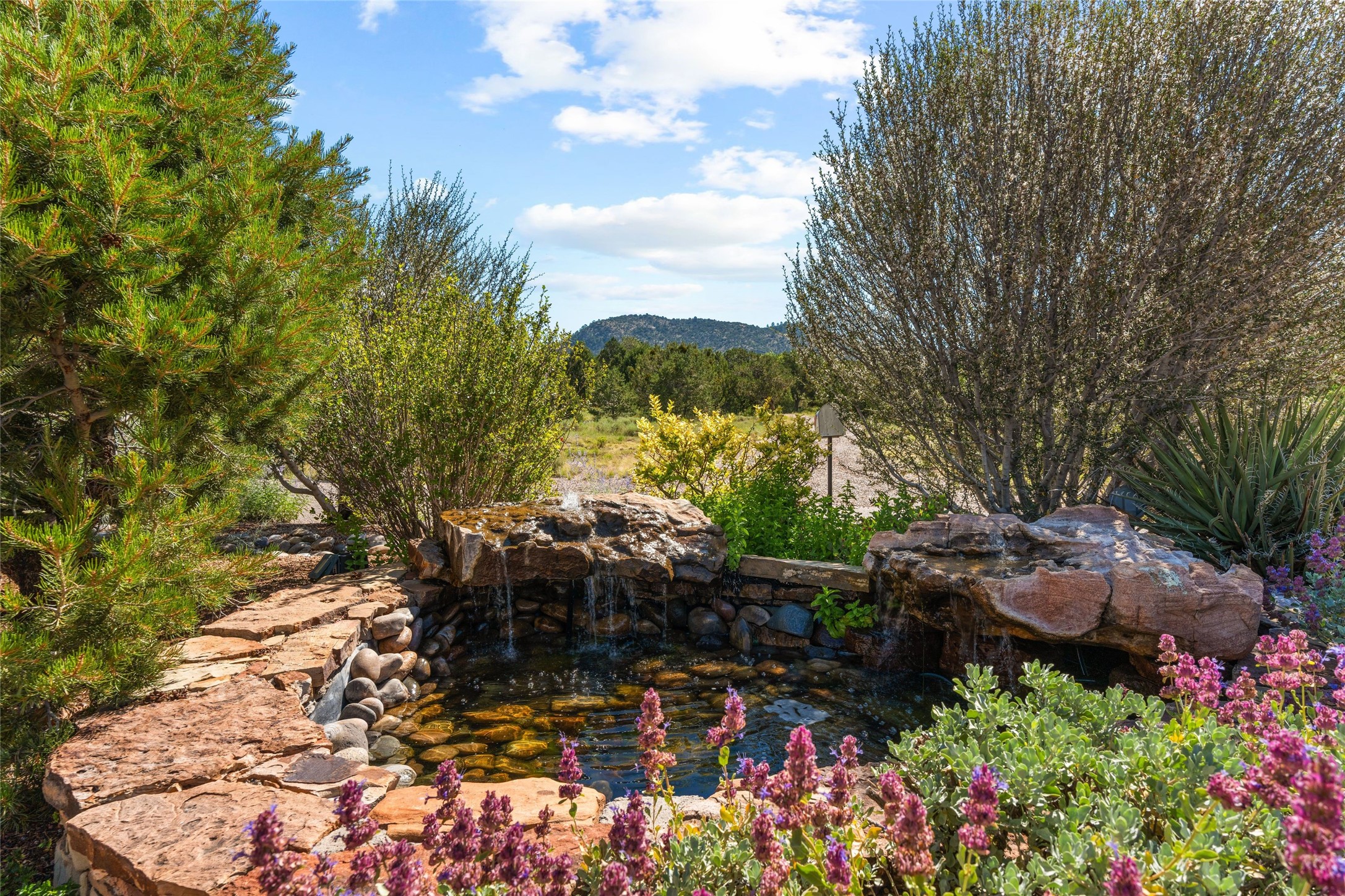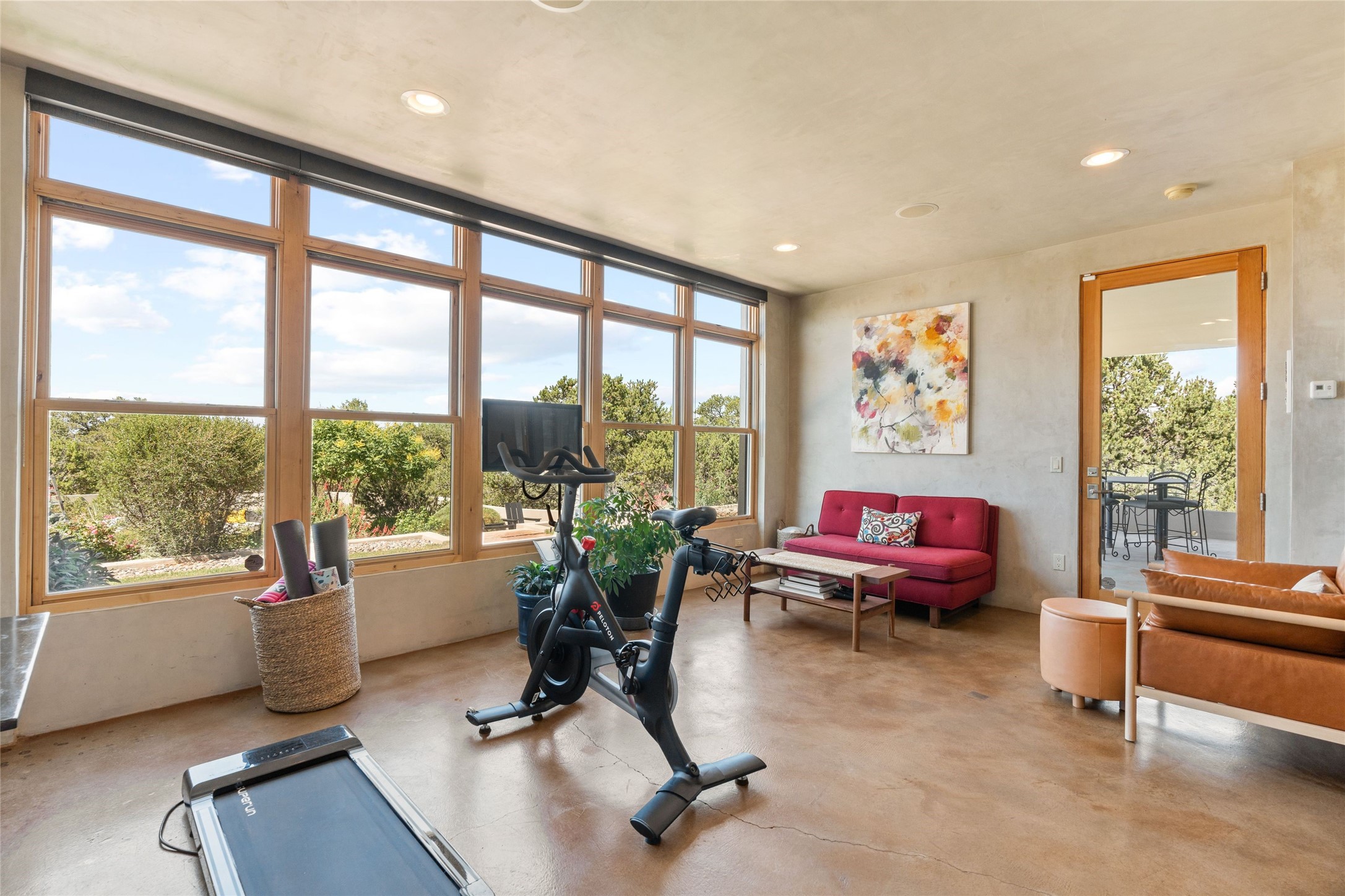 Rooted in natural materials and sustainable design, this serene Santa Fe residence offers a rare combination of tranquility, flexibility, and energy efficiency. Built using ICF (Insulated Concrete Forms) construction, the home maintains comfortable indoor temperatures year-round with radiant in-floor heating, mini-split systems, and solar power that keeps electric bills around $12 per month. Concrete floors add an earthy elegance throughout the main home, complemented by cork overlays in key living areas for warmth and comfort.The layout supports both daily ease and extended hosting, with multiple indoor living spaces, a dedicated office/utility room, and a bonus den ideal for hobbies or guest overflow. The separate casita provides a private retreat for visitors or live-in support, with its own kitchenette, spacious bathroom, and independent heating.Step outside to enjoy multiple landscaped patios that invite quiet mornings or lively evenings, enhanced by a gas fire pit, a swim spa and hot tub -- perfect for stargazing or unwinding after a day on the trails. From the main portal, take in inspiring views of Sun and Moon Mountain to the southeast and the distant Jemez range to the west, offering a shifting backdrop of natural beauty in every season.Located on a peaceful .82-acre lot, this home is just minutes from Santa Fe's Plaza, Museum Hill, the city's top medical centers, grocery stores, and shopping. Whether you're seeking a restful base for exploring town, a retreat for entertaining, or a long-term residence focused on well-being and sustainability, this property balances privacy and convenience in one thoughtfully designed package.