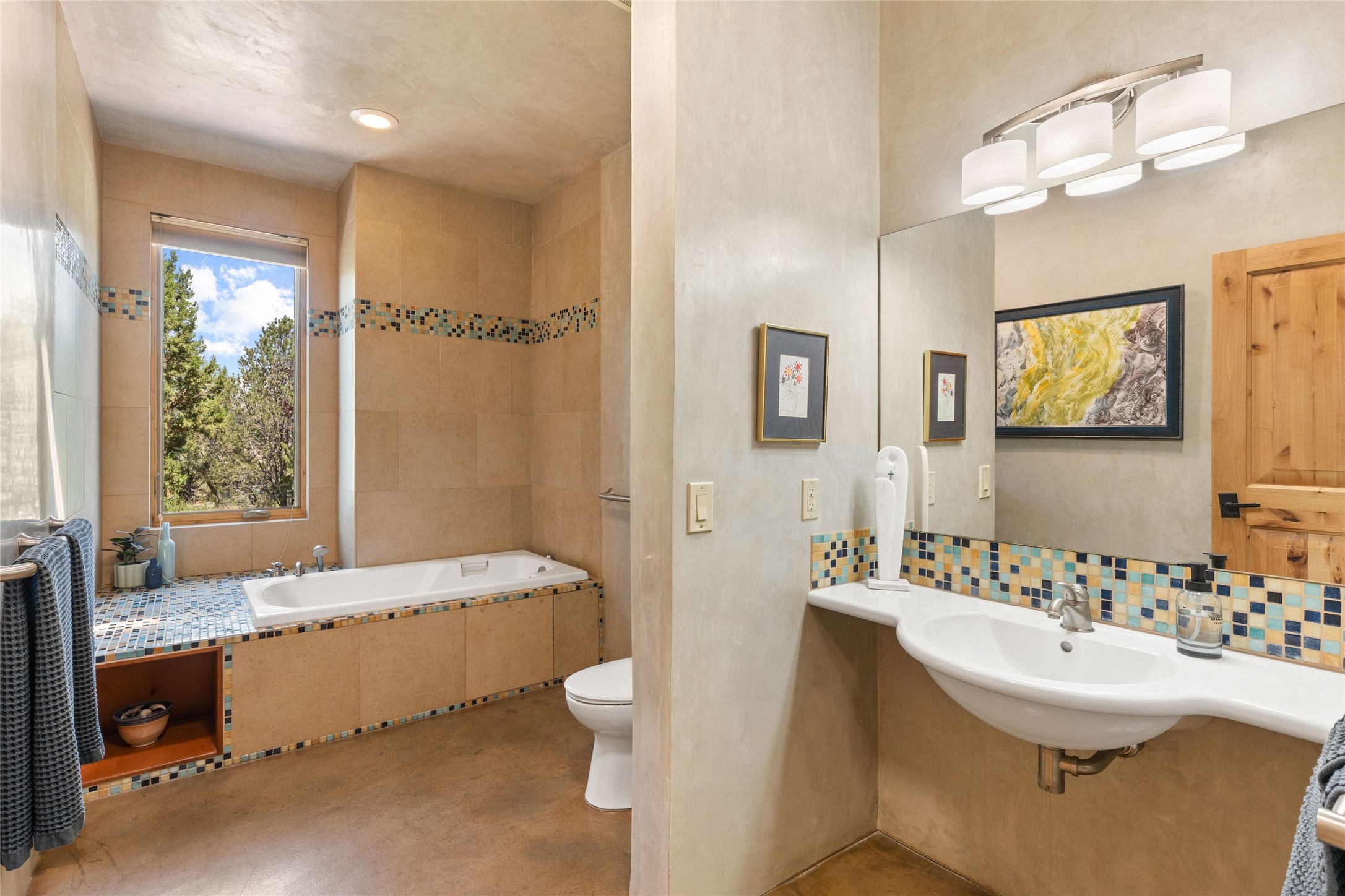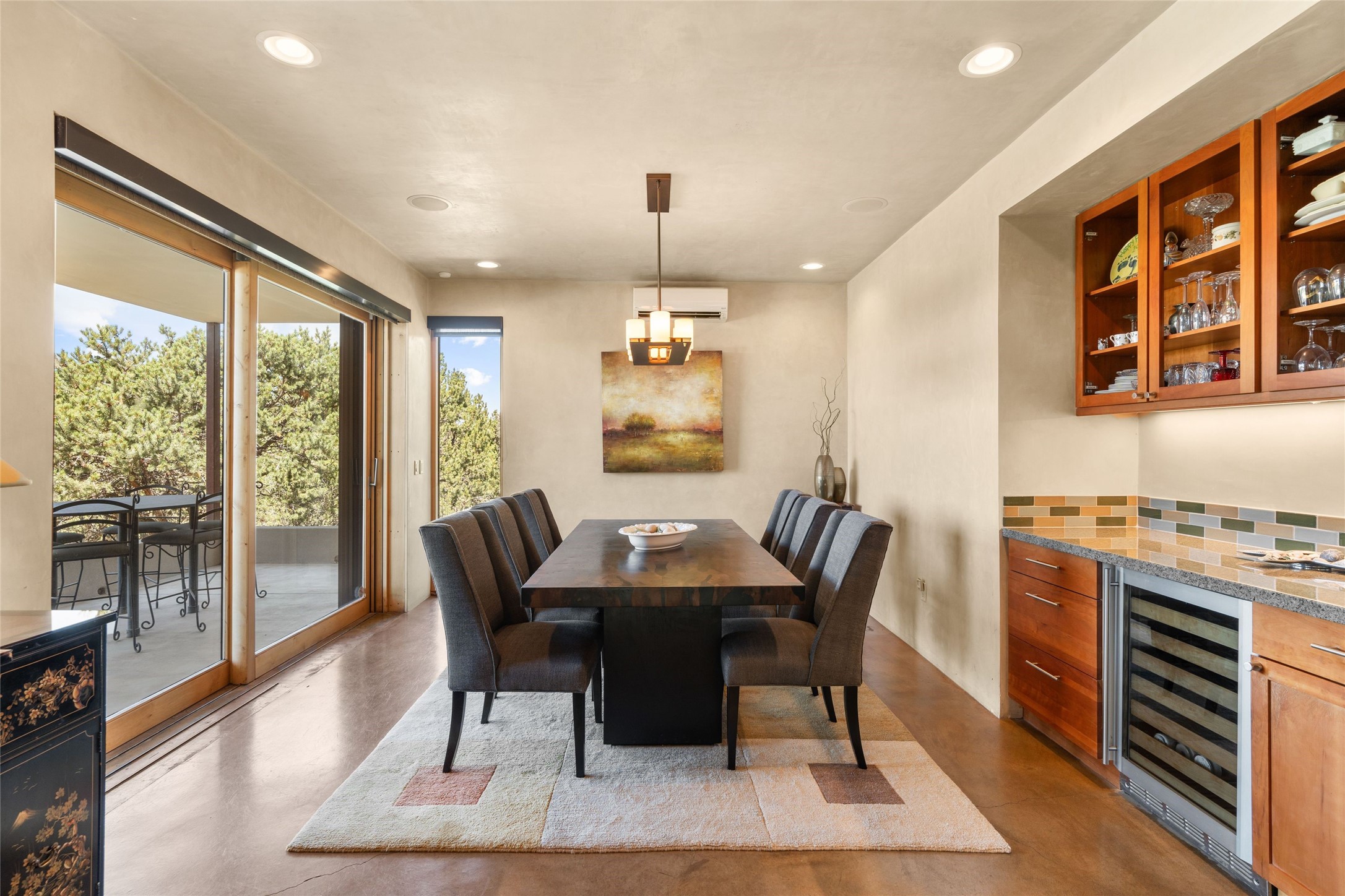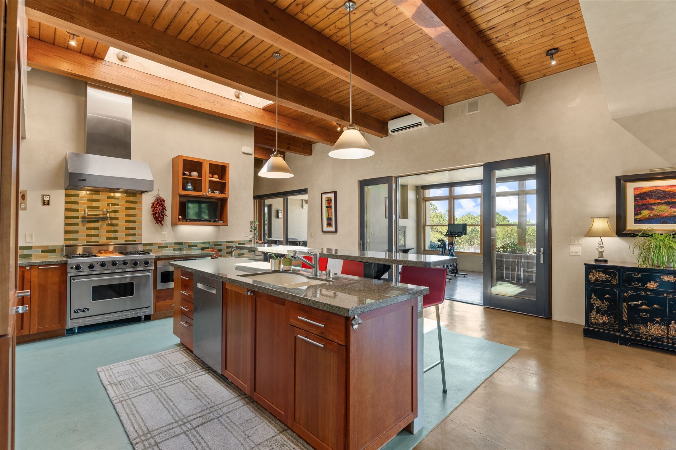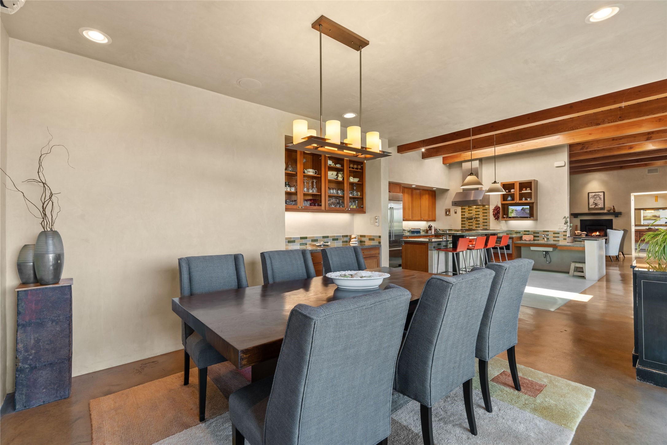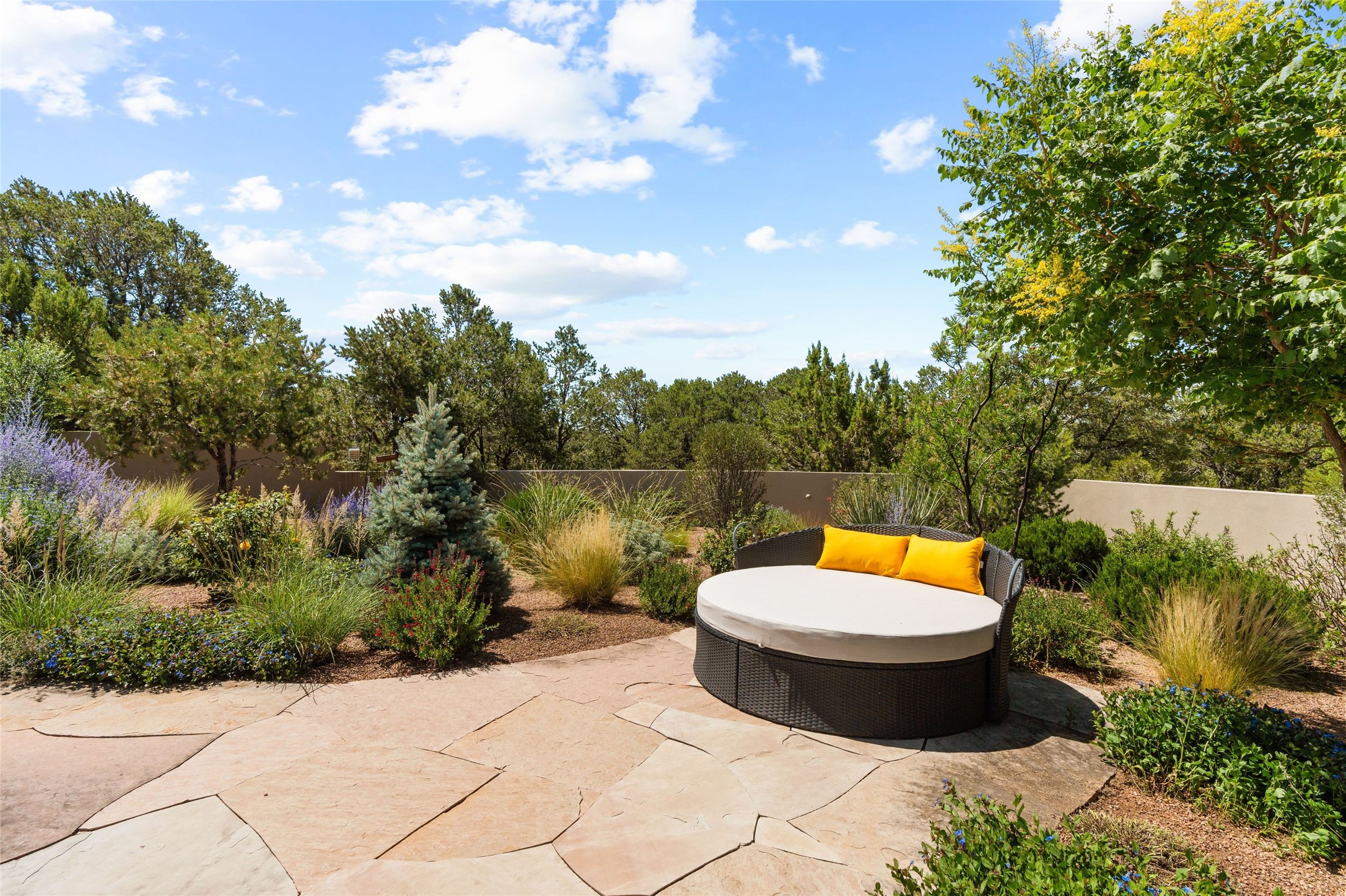 Rooted in natural materials and sustainable design, this serene Santa Fe residence offers a rare combination of tranquility, flexibility, and energy efficiency. Built using ICF (Insulated Concrete Forms) construction, the home maintains comfortable indoor temperatures year-round with radiant in-floor heating, mini-split systems, and solar power that keeps electric bills around $12 per month. Concrete floors add an earthy elegance throughout the main home, complemented by cork overlays in key living areas for warmth and comfort.The layout supports both daily ease and extended hosting, with multiple indoor living spaces, a dedicated office/utility room, and a bonus den ideal for hobbies or guest overflow. The separate casita provides a private retreat for visitors or live-in support, with its own kitchenette, spacious bathroom, and independent heating.Step outside to enjoy multiple landscaped patios that invite quiet mornings or lively evenings, enhanced by a gas fire pit, a swim spa and hot tub -- perfect for stargazing or unwinding after a day on the trails. From the main portal, take in inspiring views of Sun and Moon Mountain to the southeast and the distant Jemez range to the west, offering a shifting backdrop of natural beauty in every season.Located on a peaceful .82-acre lot, this home is just minutes from Santa Fe's Plaza, Museum Hill, the city's top medical centers, grocery stores, and shopping. Whether you're seeking a restful base for exploring town, a retreat for entertaining, or a long-term residence focused on well-being and sustainability, this property balances privacy and convenience in one thoughtfully designed package.