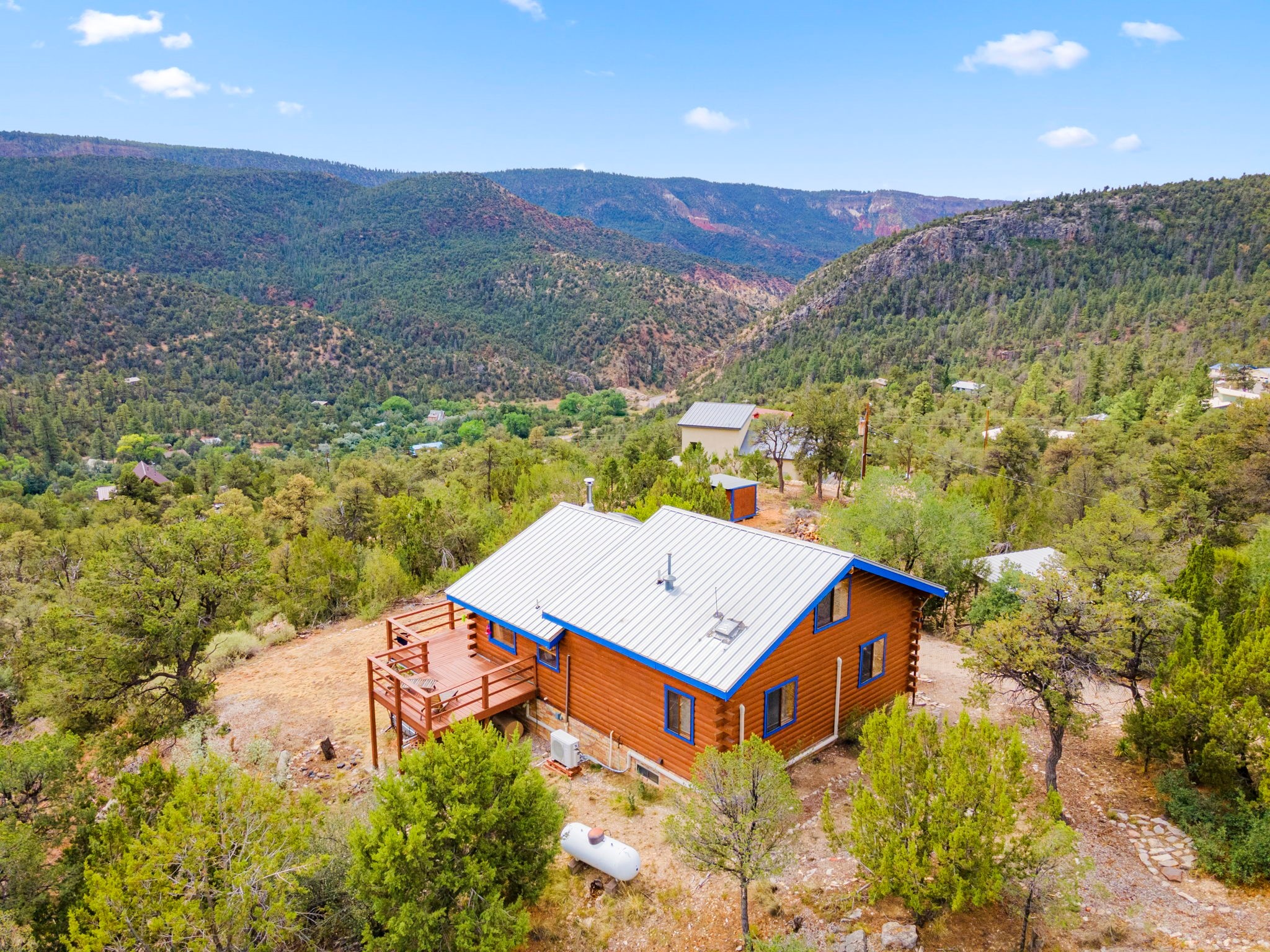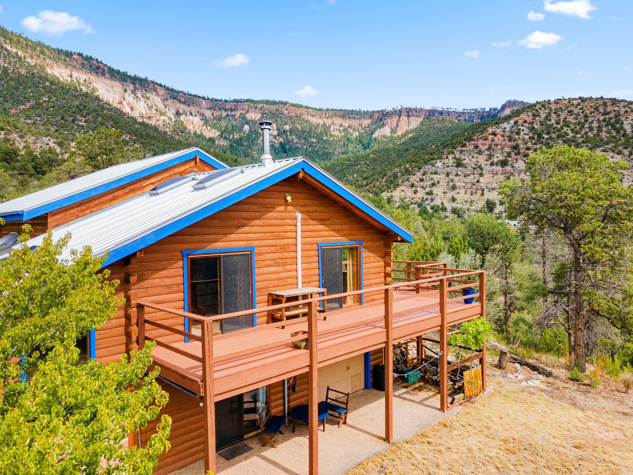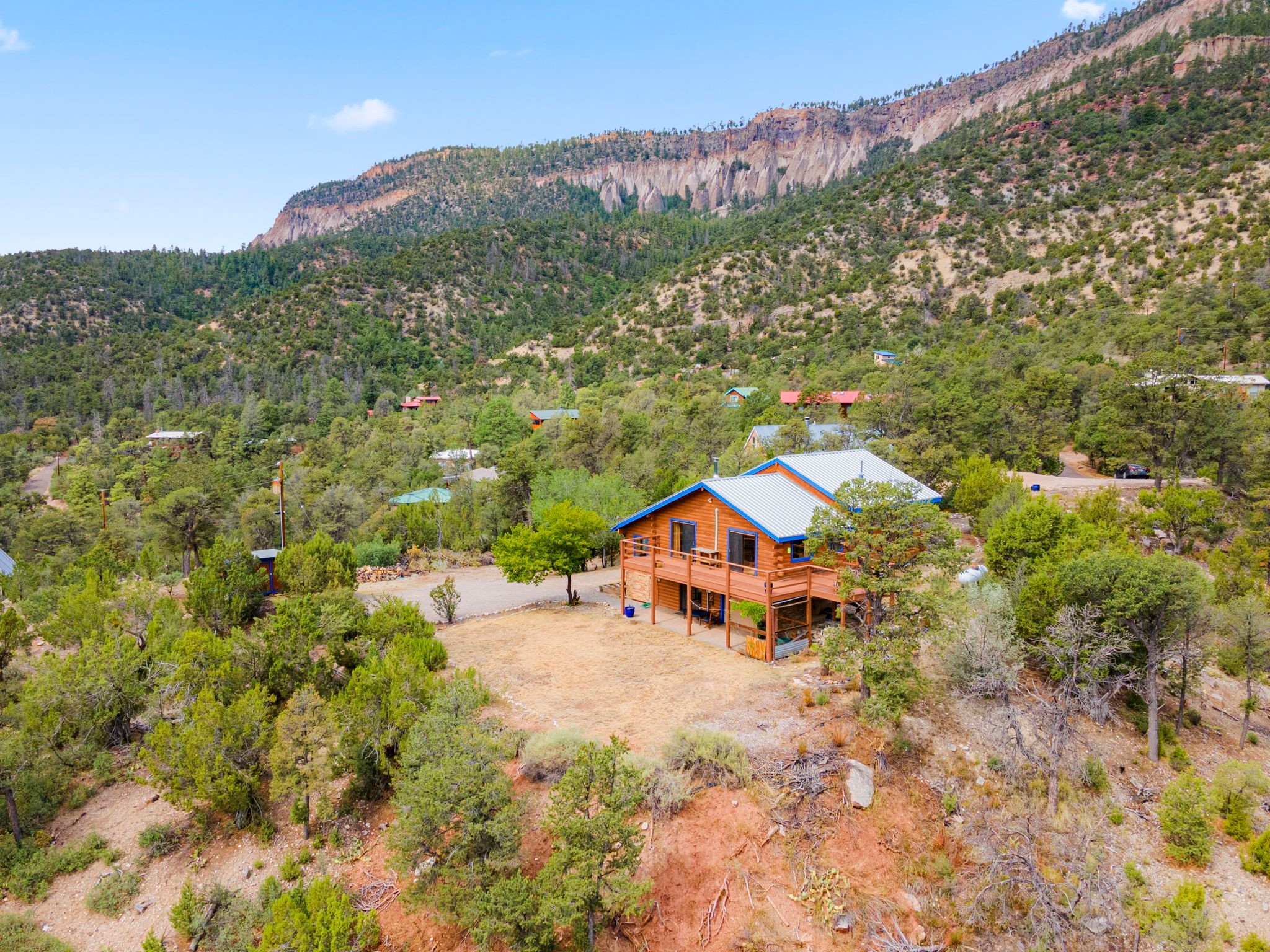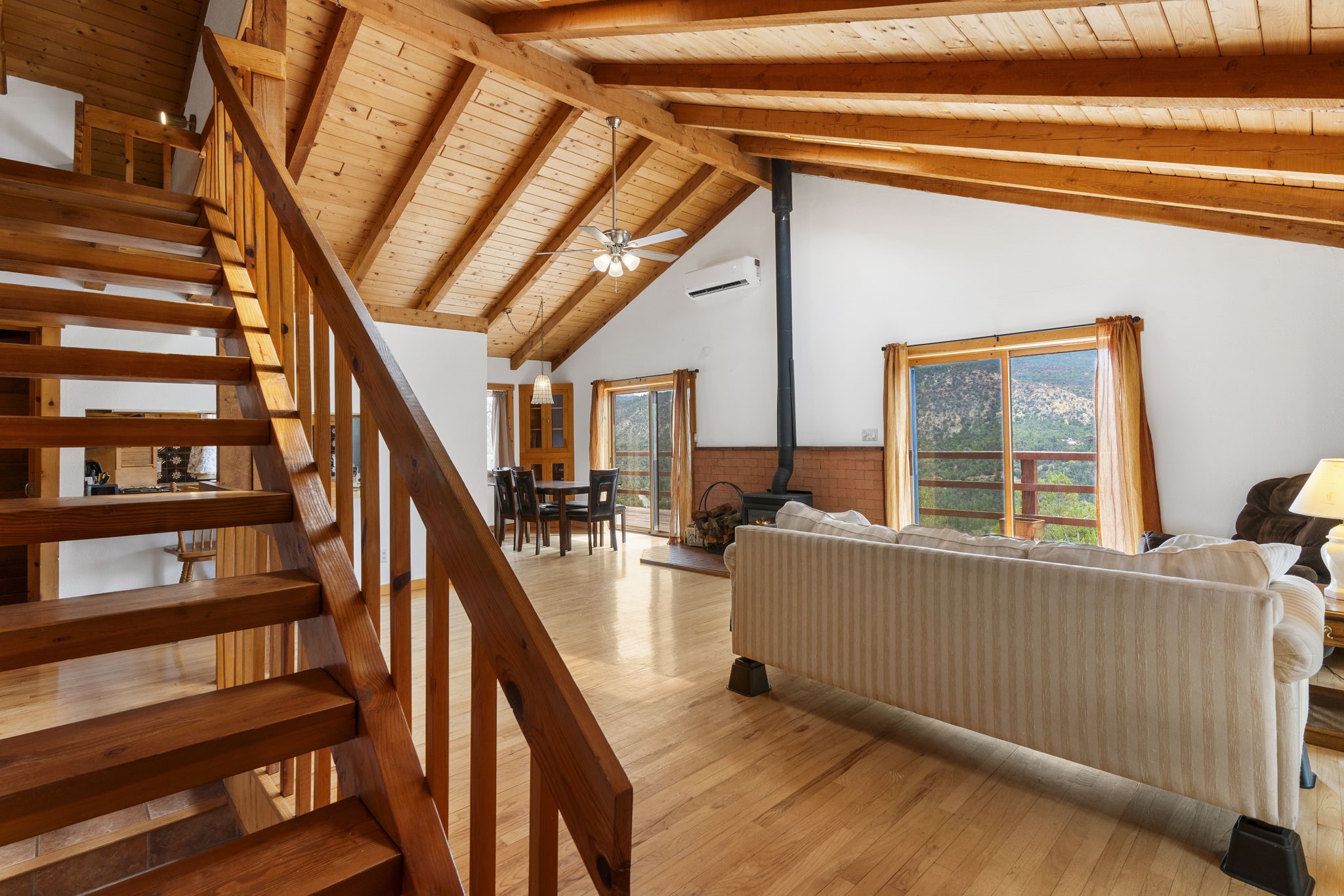 Breathtaking setting for this home in Jemez Springs perched among soaring mountain views. This spacious home has soaring beamed ceilings, wood floors, light-filled rooms, & loft with ample storage. Open floor plan with inviting living & dining area that expands to sunroom. Ideal for cozy reading rm, yoga/meditation or artist studio. Wood stove & mini splits making it comfortable all year long. Newer appliances in the kitchen. Access to expansive deck to enjoy mountain views and cool breezes. Lower level includes 2 flex spaces, a laundry room & full bathroom. Entry to an oversized one car garage. Could be used for a workshop. Property has a detached shed & covered carport, room for 2 vehicles. Home is on a very private lot at the end of cul-de-sac. Easy commute to LANL, Albuquerque, Fenton Lake. Buyer to confirm square footage.