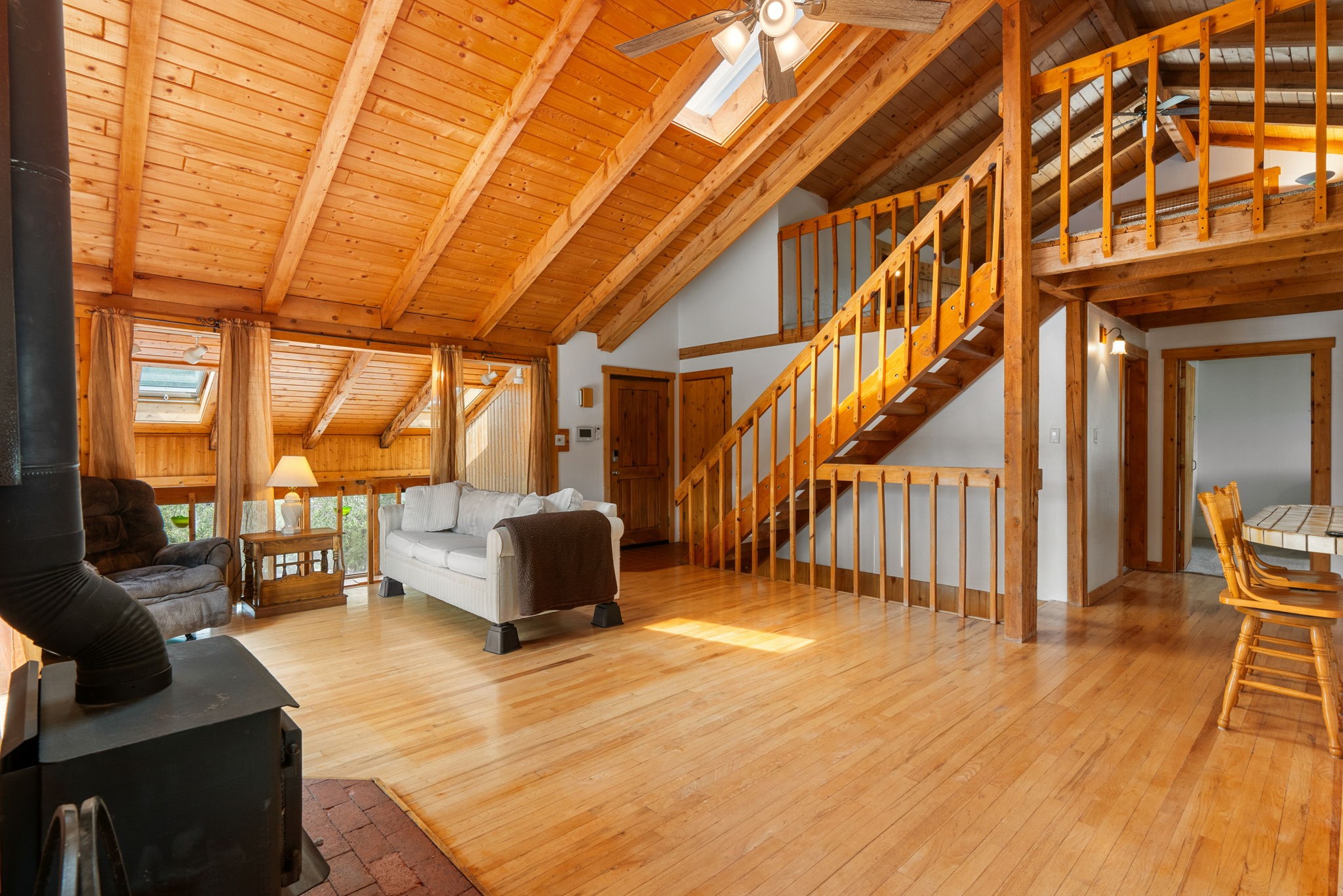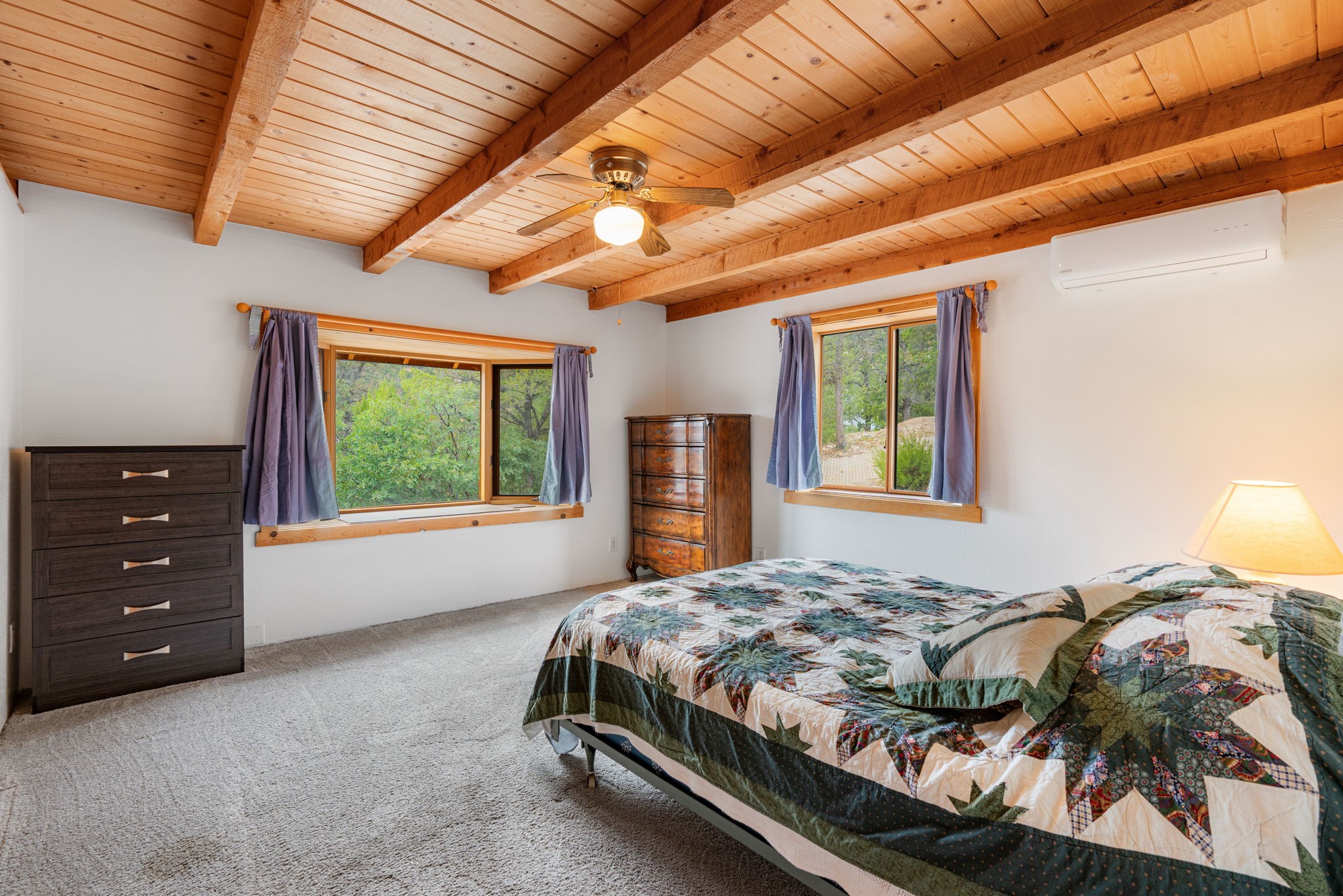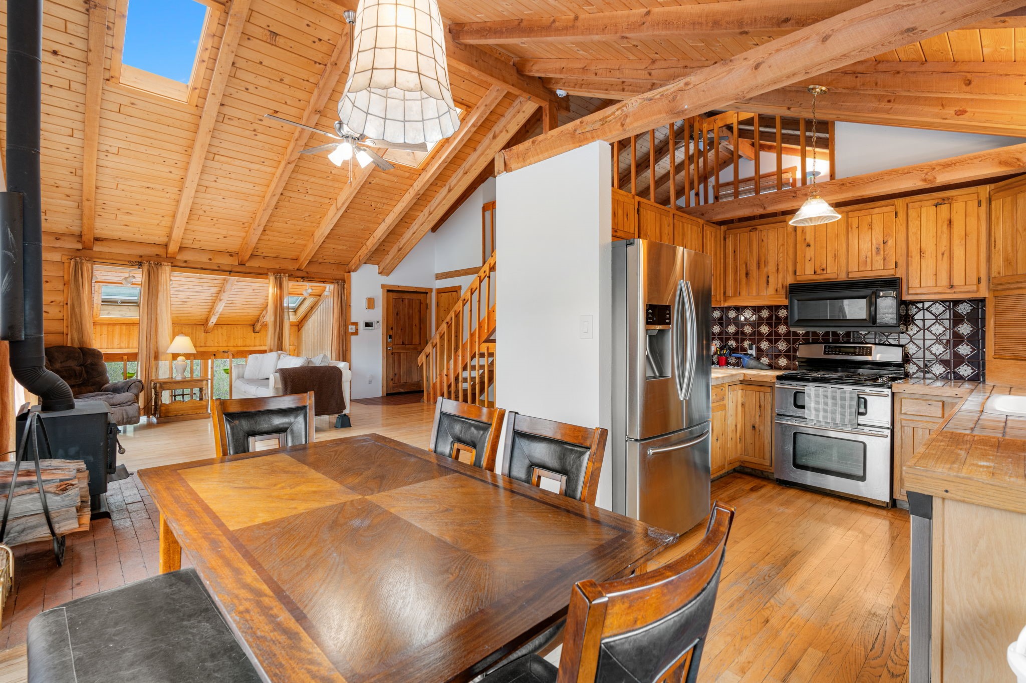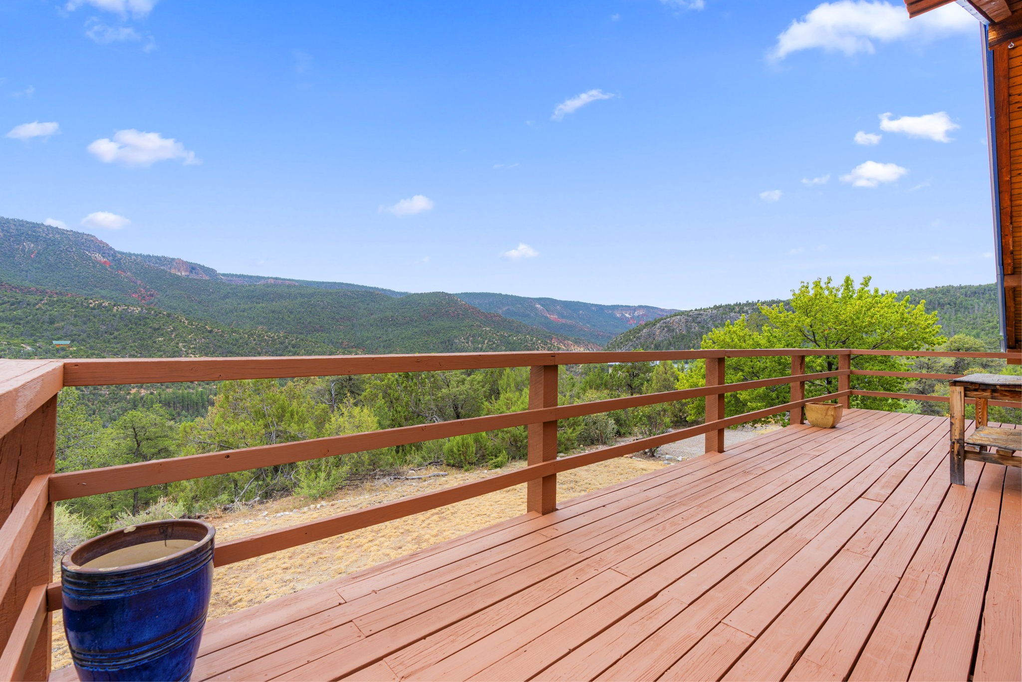 Breathtaking setting for this home in Jemez Springs perched among soaring mountain views. This spacious home has soaring beamed ceilings, wood floors, light-filled rooms, & loft with ample storage. Open floor plan with inviting living & dining area that expands to sunroom. Ideal for cozy reading rm, yoga/meditation or artist studio. Wood stove & mini splits making it comfortable all year long. Newer appliances in the kitchen. Access to expansive deck to enjoy mountain views and cool breezes. Lower level includes 2 flex spaces, a laundry room & full bathroom. Entry to an oversized one car garage. Could be used for a workshop. Property has a detached shed & covered carport, room for 2 vehicles. Home is on a very private lot at the end of cul-de-sac. Easy commute to LANL, Albuquerque, Fenton Lake. Buyer to confirm square footage.