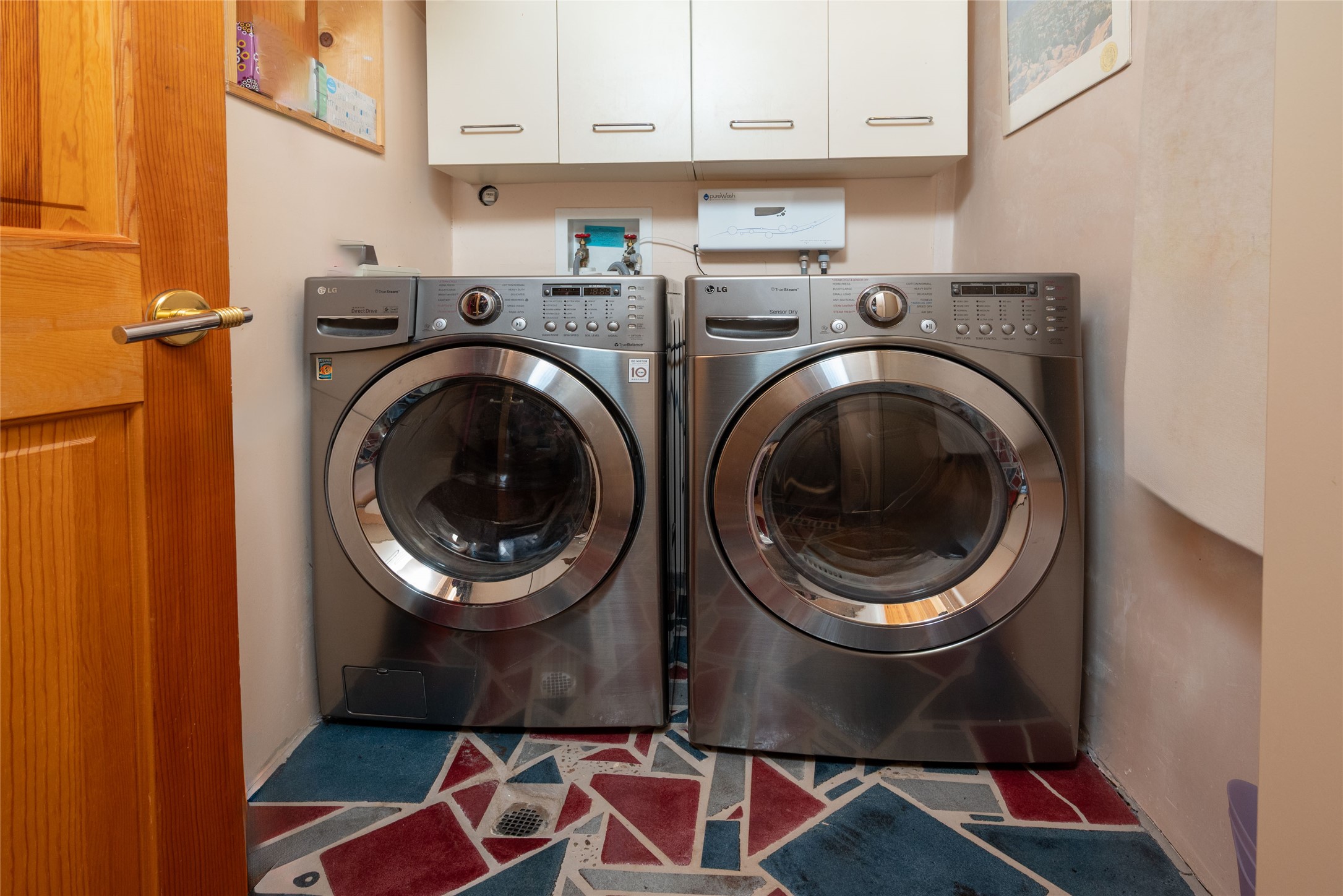 Just minutes from the vibrant City of Santa Fe begins the legendary Turquoise Trail. The iconic and historic byway is the location of this artistically inspired compound. Just minutes from all the conveniences of the City Different but a world away. Sited on a private and fully fenced 5.5 acre parcel the property enjoys expansive vistas, mountain views and dark night skies. The main house features strawbale construction with high cathedral wood deck and exposed steel truss ceilings. The interior walls are hard-trowelled plaster, the floors exposed concrete, and the countertops cast-in-place. The open-floor plan and numerous windows and patio doors invite the natural light while offering a great space for entertaining or just chilling. The chef's kitchen features a 6-burner Viking gas cooktop, Viking dual-burner convection oven, Viking compactor, Sub-Zero refrigerator/freezer, and Bosch dishwasher. Counterspace is beyond generous on the large island, extended counters and peninsula with casual dining bar. The primary bedroom opens to the courtyard and includes a spacious walk-through closet. The primary bath features a resort-sized walk-in shower. A jetted tub in the second bath awaits the end of the day. The stand-alone casita is close enough for convenience but separate enough for privacy. Ideal for visitors or rental income, it's cozy, modern and light-filled. The property also includes a finished garage & studio space, plus carport. The infrastructure includes roof-mounted Solar PV panels and a 3 ac/ft private well. There's plenty of room on the property to add your barn or other improvements. Santa Fe shopping, dining, and medical facilities are just minutes away, as is the Santa Fe airport and I-25 access.