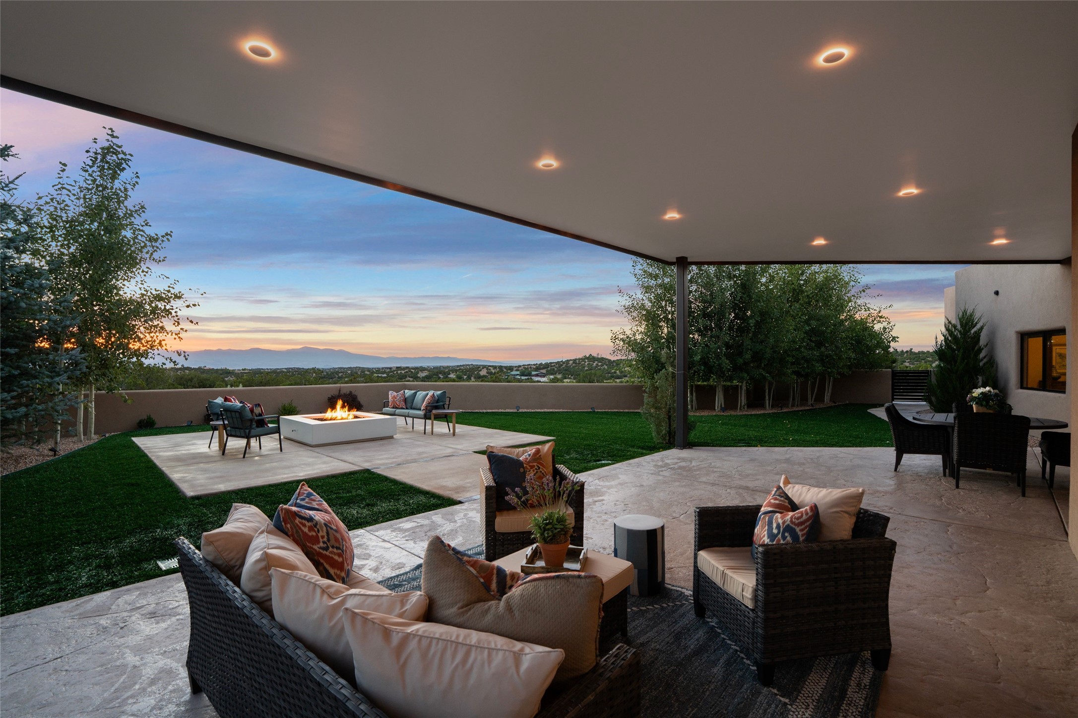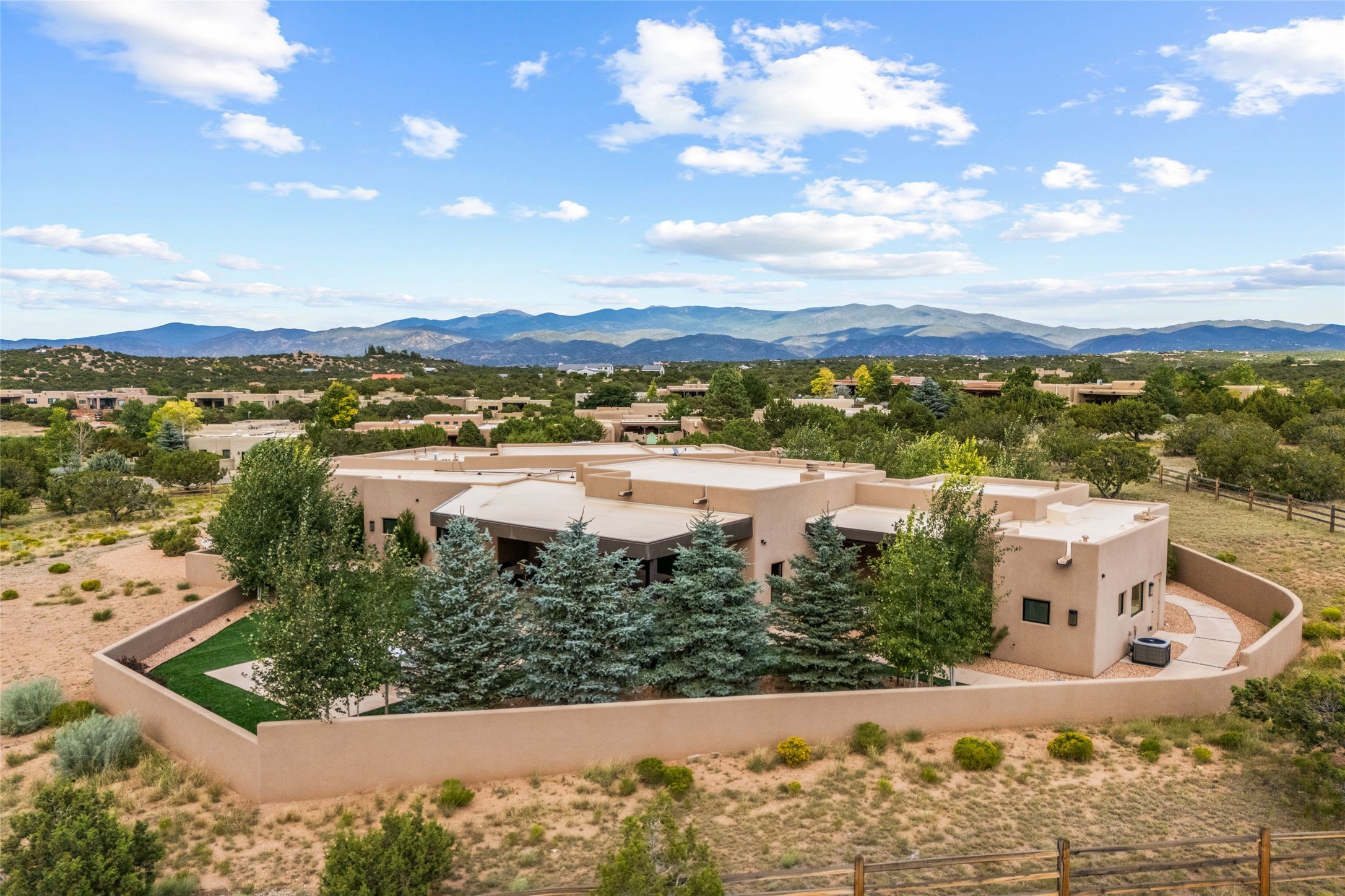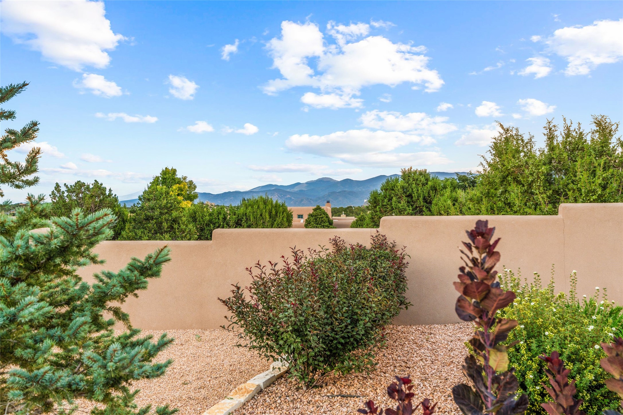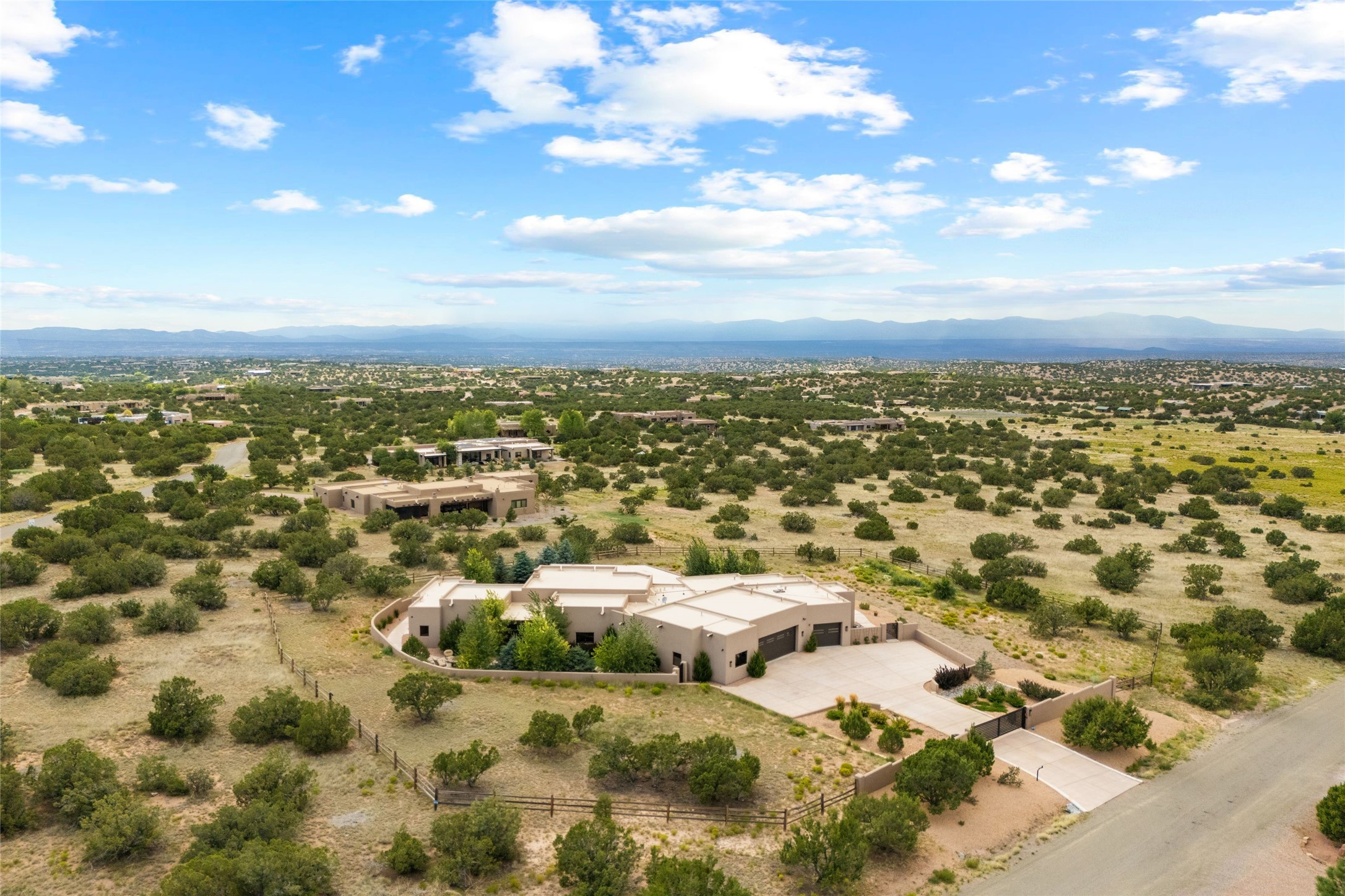 Santa Fe is a vibrant city and this is the home to enjoy it in. Nestled in one of the most sought after neighborhoods, this exceptional custom built home offers the perfect blend of luxury, tranquility, and design. Not far from the downtown, yet situated on 2.5 acres with breathtaking views in all directions. Not too grandiose but just the right amount of wonderful with tall beamed ceilings, tasteful wood floors and an impressive open concept that accommodates flawlessly while continually framing the captivating West views Santa Fe is famous for. Spend your mornings on the south of the home with a delightful seating area amongst fabulously landscaped outdoor spaces with mature spruce and aspen trees and fire pit but be sure to take in the evenings on the rear portal with the custom 65" Cubo Fire Table situated to capture the unparalleled views of the Jemez Mountains. With over a thousand sq ft of covered outdoor spaces, this is the ideal place to enjoy; as beautiful on the inside as on the outside and perfect for entertaining. Heated oversized three car garage, den/bedroom with extra soundproofing great for music enthusiasts or a media room, nicely appointed kitchen, bedrooms en suite, gated entry, Tpo roof, nearby trail systems, no dirt roads, Level 3 ev charger, whole home humidification system and more. If you're looking for a property that combines privacy, elegance, and a connection to the natural beauty of this incredible city, look no further. Come and experience this serene and tranquil beauty, and oh those outdoor spaces!