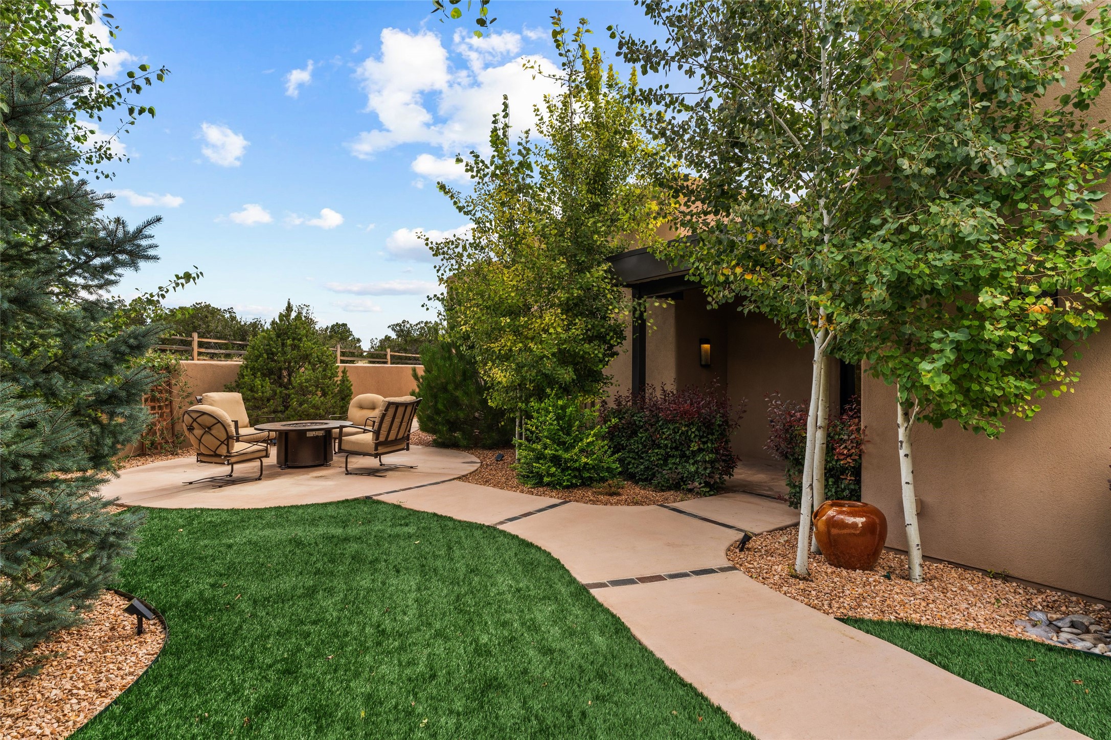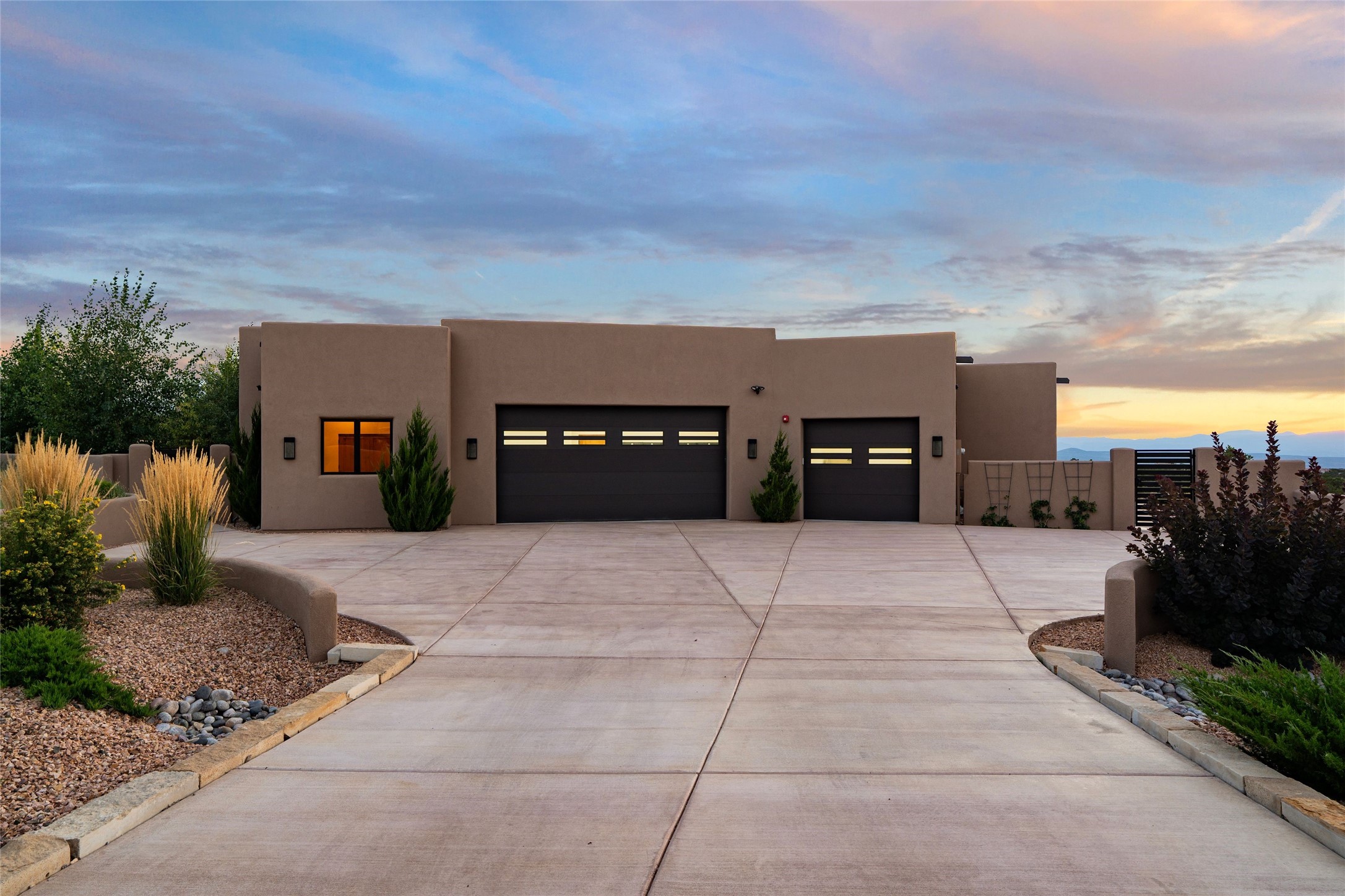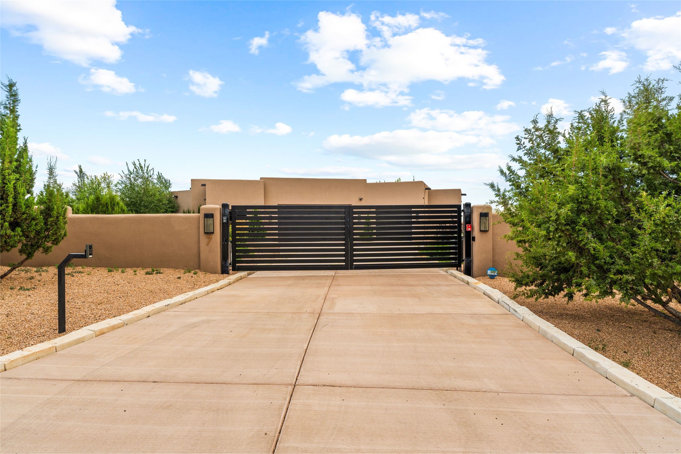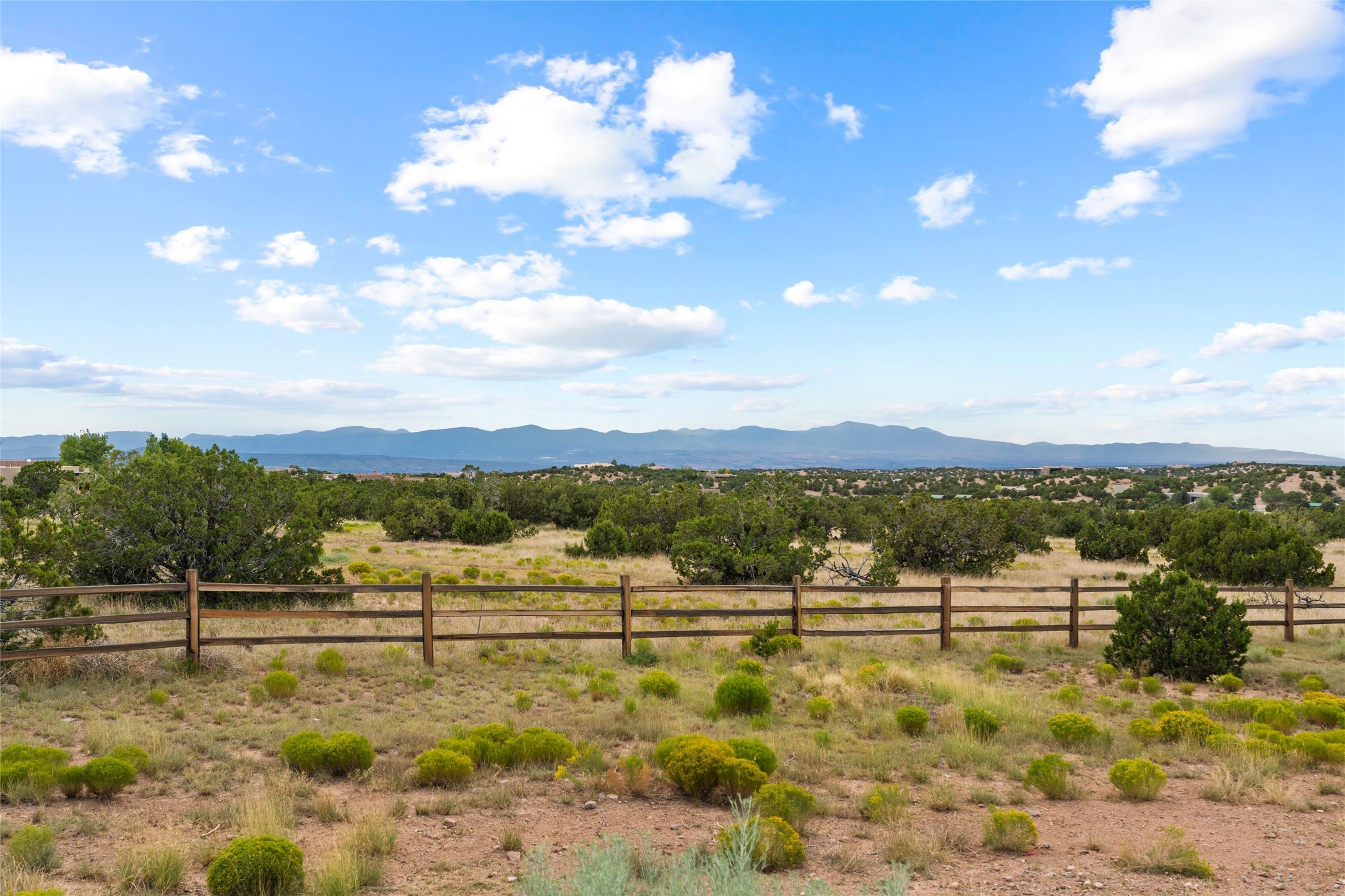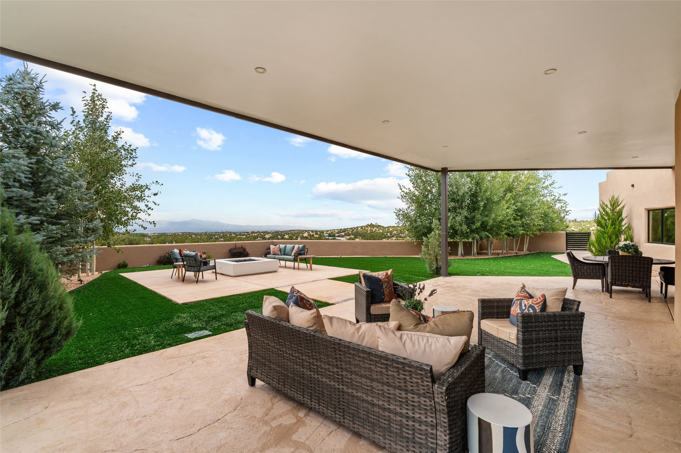 Santa Fe is a vibrant city and this is the home to enjoy it in. Nestled in one of the most sought after neighborhoods, this exceptional custom built home offers the perfect blend of luxury, tranquility, and design. Not far from the downtown, yet situated on 2.5 acres with breathtaking views in all directions. Not too grandiose but just the right amount of wonderful with tall beamed ceilings, tasteful wood floors and an impressive open concept that accommodates flawlessly while continually framing the captivating West views Santa Fe is famous for. Spend your mornings on the south of the home with a delightful seating area amongst fabulously landscaped outdoor spaces with mature spruce and aspen trees and fire pit but be sure to take in the evenings on the rear portal with the custom 65" Cubo Fire Table situated to capture the unparalleled views of the Jemez Mountains. With over a thousand sq ft of covered outdoor spaces, this is the ideal place to enjoy; as beautiful on the inside as on the outside and perfect for entertaining. Heated oversized three car garage, den/bedroom with extra soundproofing great for music enthusiasts or a media room, nicely appointed kitchen, bedrooms en suite, gated entry, Tpo roof, nearby trail systems, no dirt roads, Level 3 ev charger, whole home humidification system and more. If you're looking for a property that combines privacy, elegance, and a connection to the natural beauty of this incredible city, look no further. Come and experience this serene and tranquil beauty, and oh those outdoor spaces!