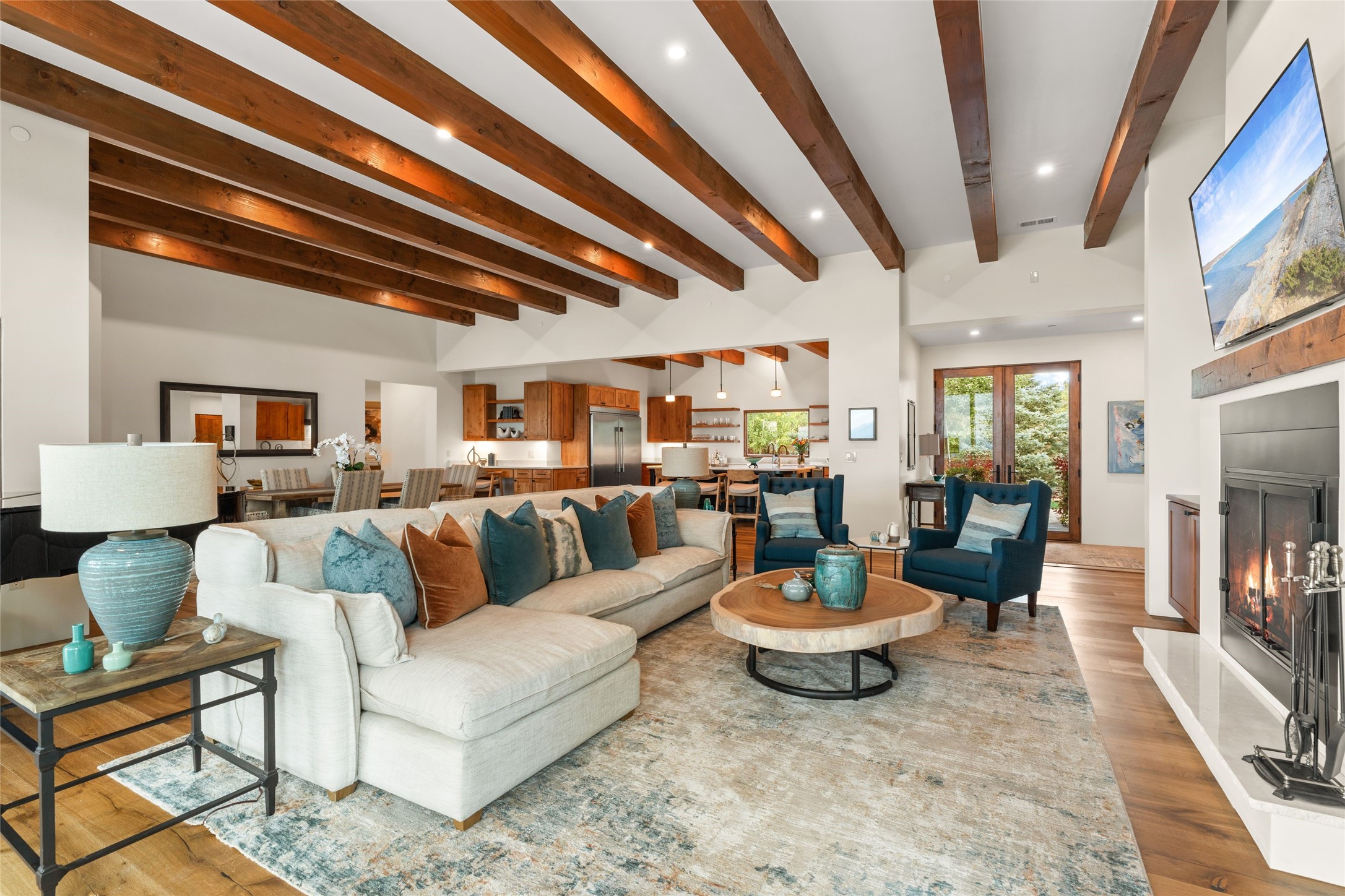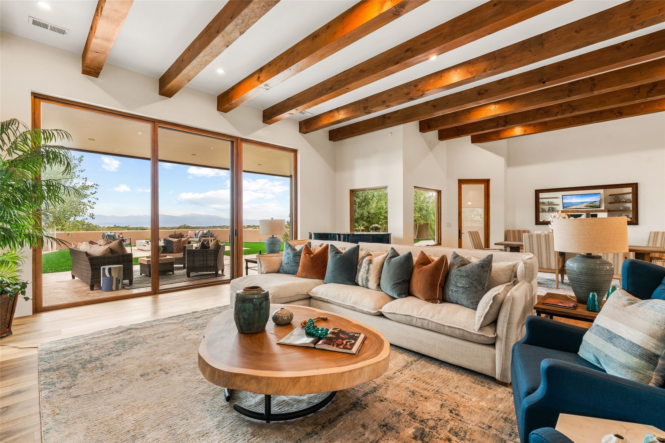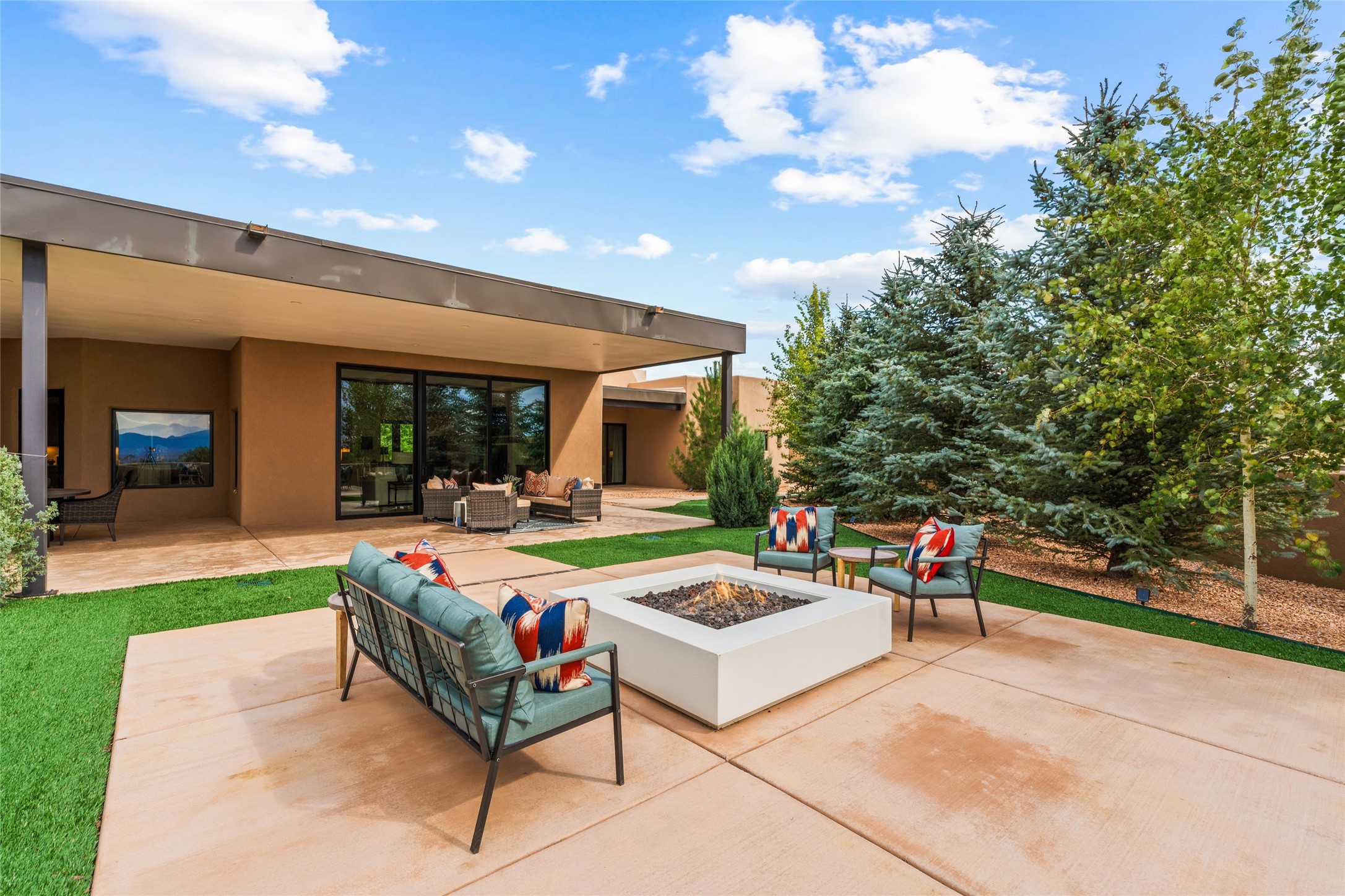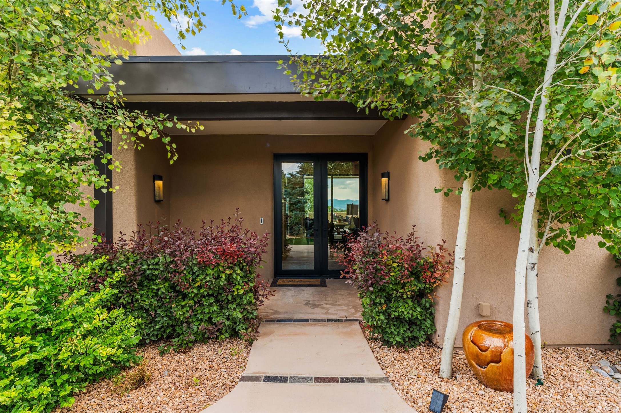Santa Fe is a vibrant city and this is the home to enjoy it in. Nestled in one of the most sought after neighborhoods, this exceptional custom built home offers the perfect blend of luxury, tranquility, and design. Not far from the downtown, yet situated on 2.5 acres with breathtaking views in all directions. Not too grandiose but just the right amount of wonderful with tall beamed ceilings, tasteful wood floors and an impressive open concept that accommodates flawlessly while continually framing the captivating West views Santa Fe is famous for. Spend your mornings on the south of the home with a delightful seating area amongst fabulously landscaped outdoor spaces with mature spruce and aspen trees and fire pit but be sure to take in the evenings on the rear portal with the custom 65" Cubo Fire Table situated to capture the unparalleled views of the Jemez Mountains. With over a thousand sq ft of covered outdoor spaces, this is the ideal place to enjoy; as beautiful on the inside as on the outside and perfect for entertaining. Heated oversized three car garage, den/bedroom with extra soundproofing great for music enthusiasts or a media room, nicely appointed kitchen, bedrooms en suite, gated entry, Tpo roof, nearby trail systems, no dirt roads, Level 3 ev charger, whole home humidification system and more. If you're looking for a property that combines privacy, elegance, and a connection to the natural beauty of this incredible city, look no further. Come and experience this serene and tranquil beauty, and oh those outdoor spaces!