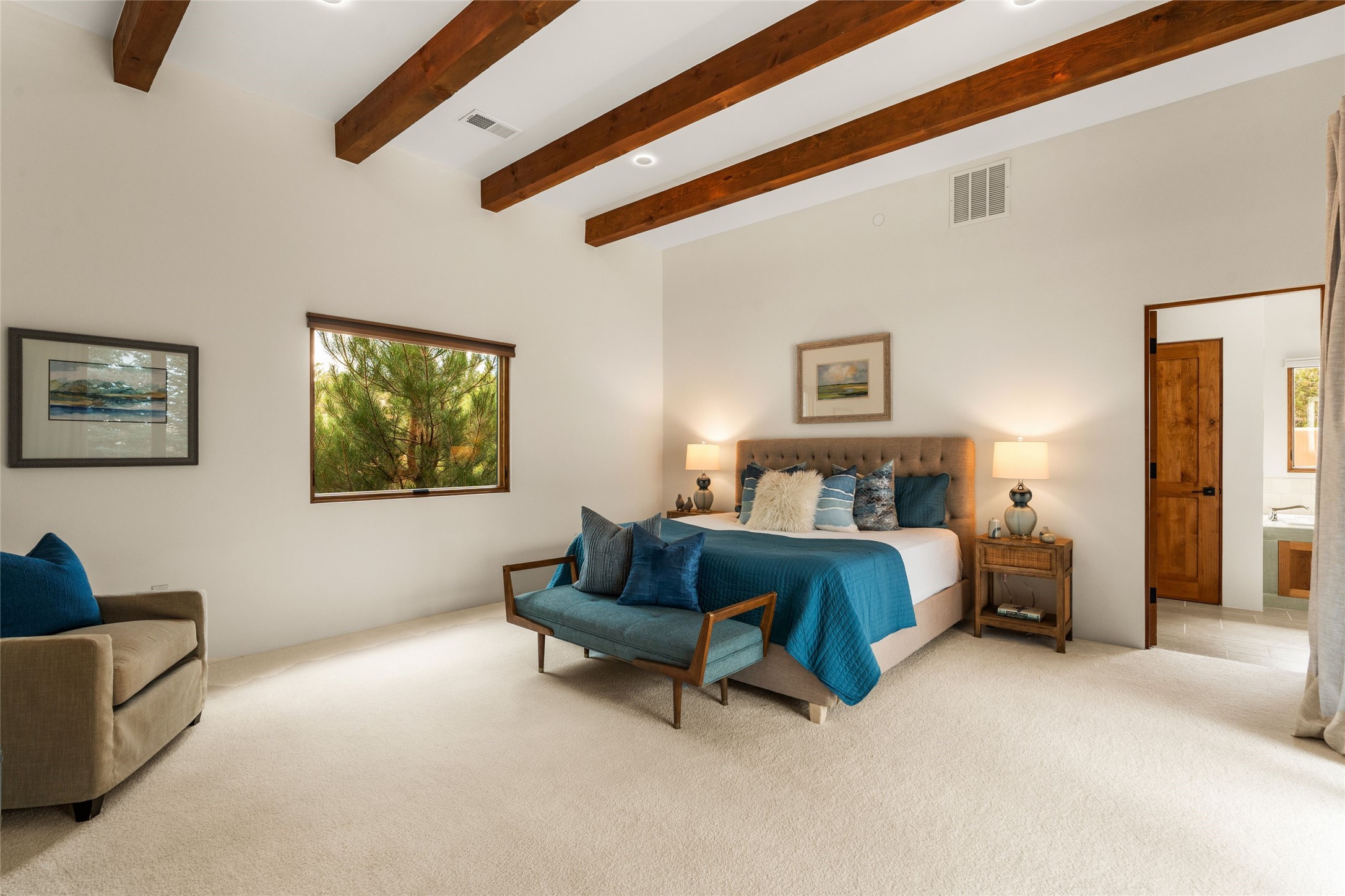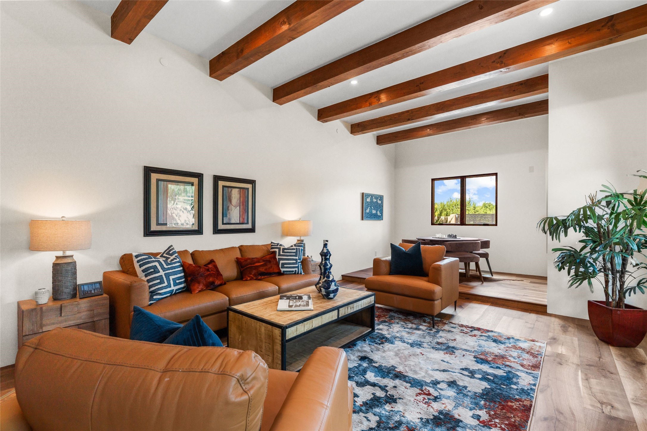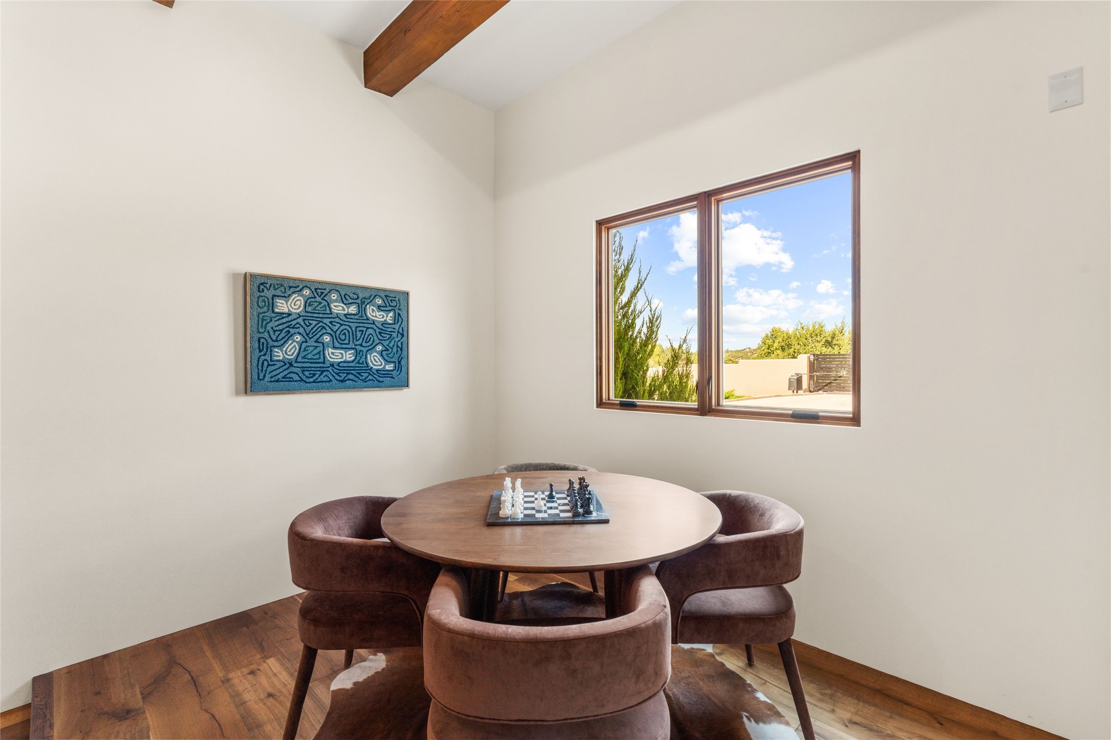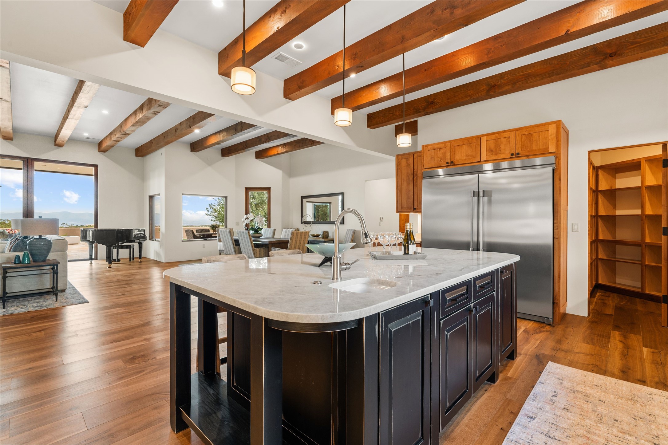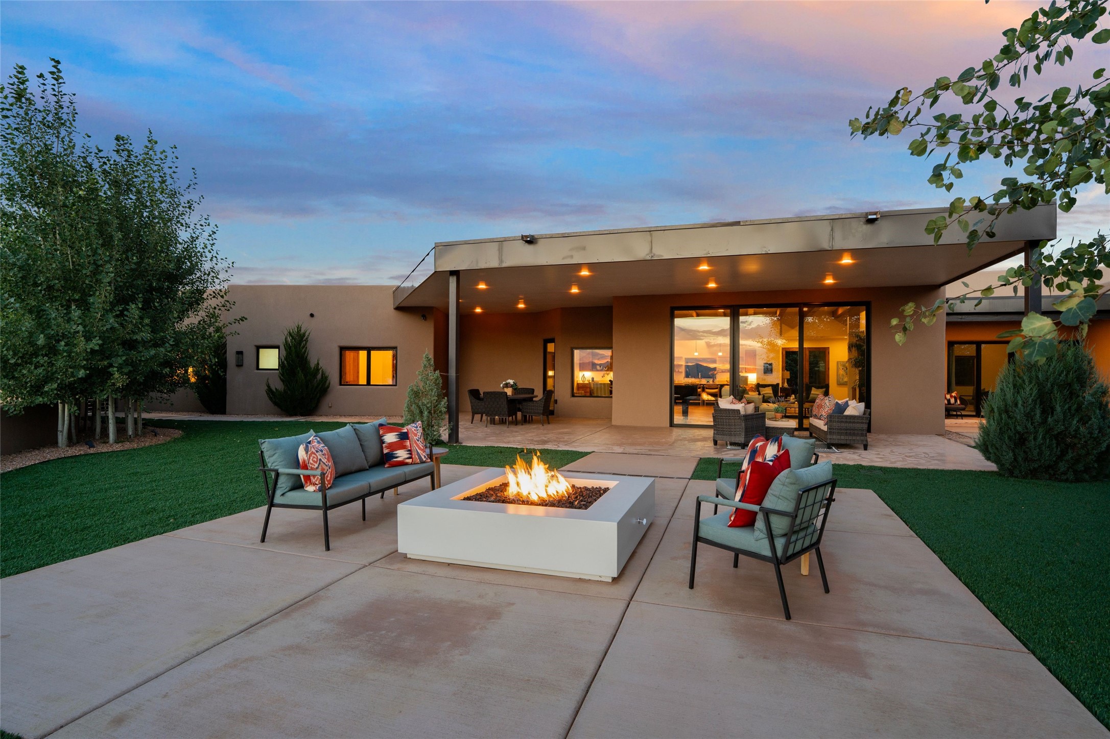 Santa Fe is a vibrant city and this is the home to enjoy it in. Nestled in one of the most sought after neighborhoods, this exceptional custom built home offers the perfect blend of luxury, tranquility, and design. Not far from the downtown, yet situated on 2.5 acres with breathtaking views in all directions. Not too grandiose but just the right amount of wonderful with tall beamed ceilings, tasteful wood floors and an impressive open concept that accommodates flawlessly while continually framing the captivating West views Santa Fe is famous for. Spend your mornings on the south of the home with a delightful seating area amongst fabulously landscaped outdoor spaces with mature spruce and aspen trees and fire pit but be sure to take in the evenings on the rear portal with the custom 65" Cubo Fire Table situated to capture the unparalleled views of the Jemez Mountains. With over a thousand sq ft of covered outdoor spaces, this is the ideal place to enjoy; as beautiful on the inside as on the outside and perfect for entertaining. Heated oversized three car garage, den/bedroom with extra soundproofing great for music enthusiasts or a media room, nicely appointed kitchen, bedrooms en suite, gated entry, Tpo roof, nearby trail systems, no dirt roads, Level 3 ev charger, whole home humidification system and more. If you're looking for a property that combines privacy, elegance, and a connection to the natural beauty of this incredible city, look no further. Come and experience this serene and tranquil beauty, and oh those outdoor spaces!