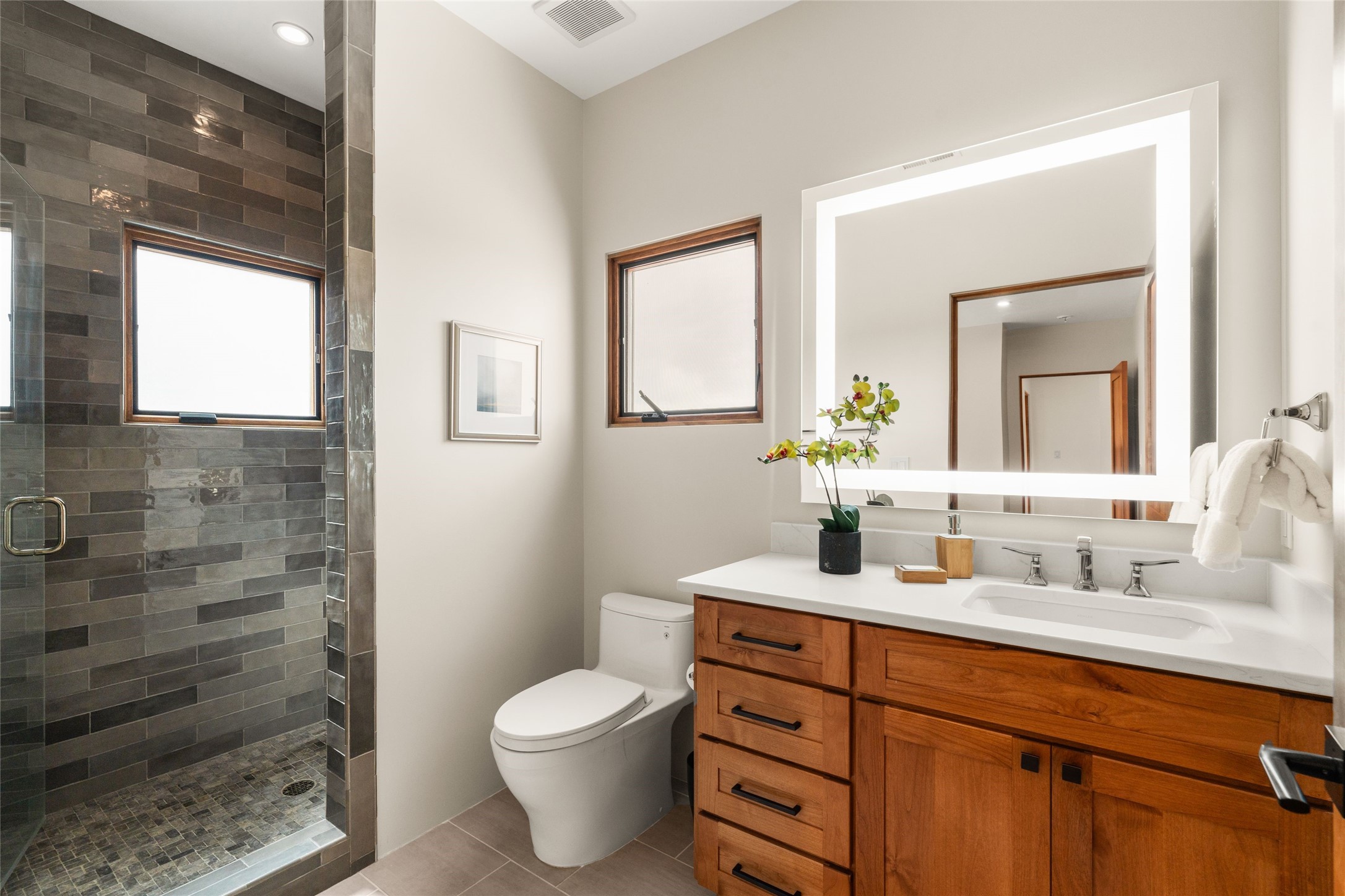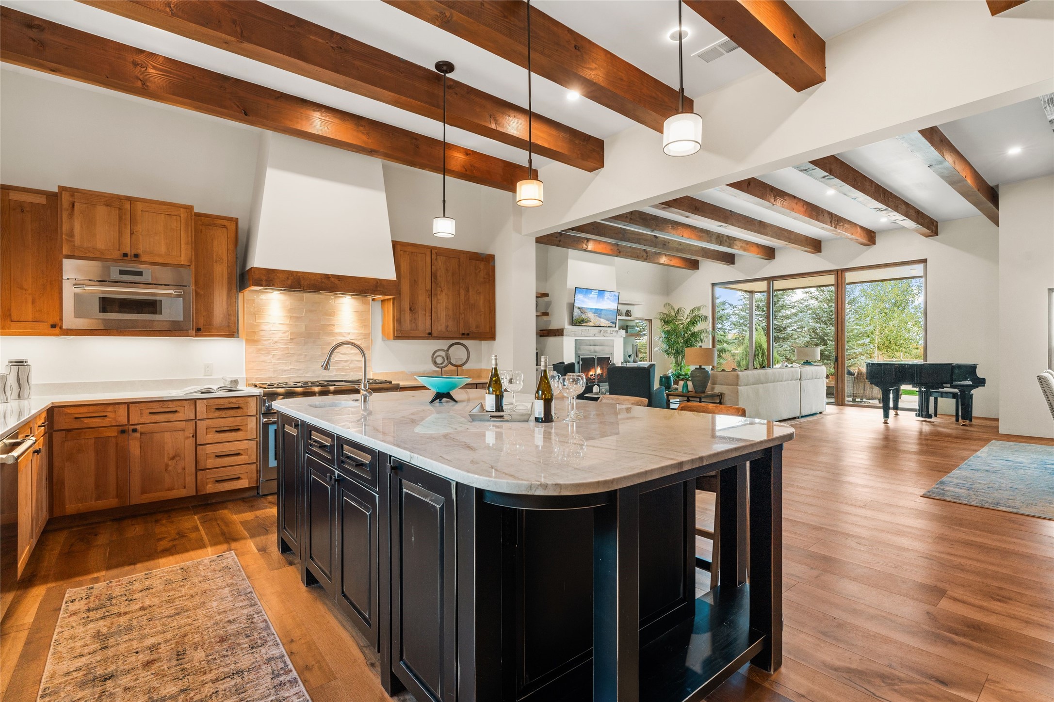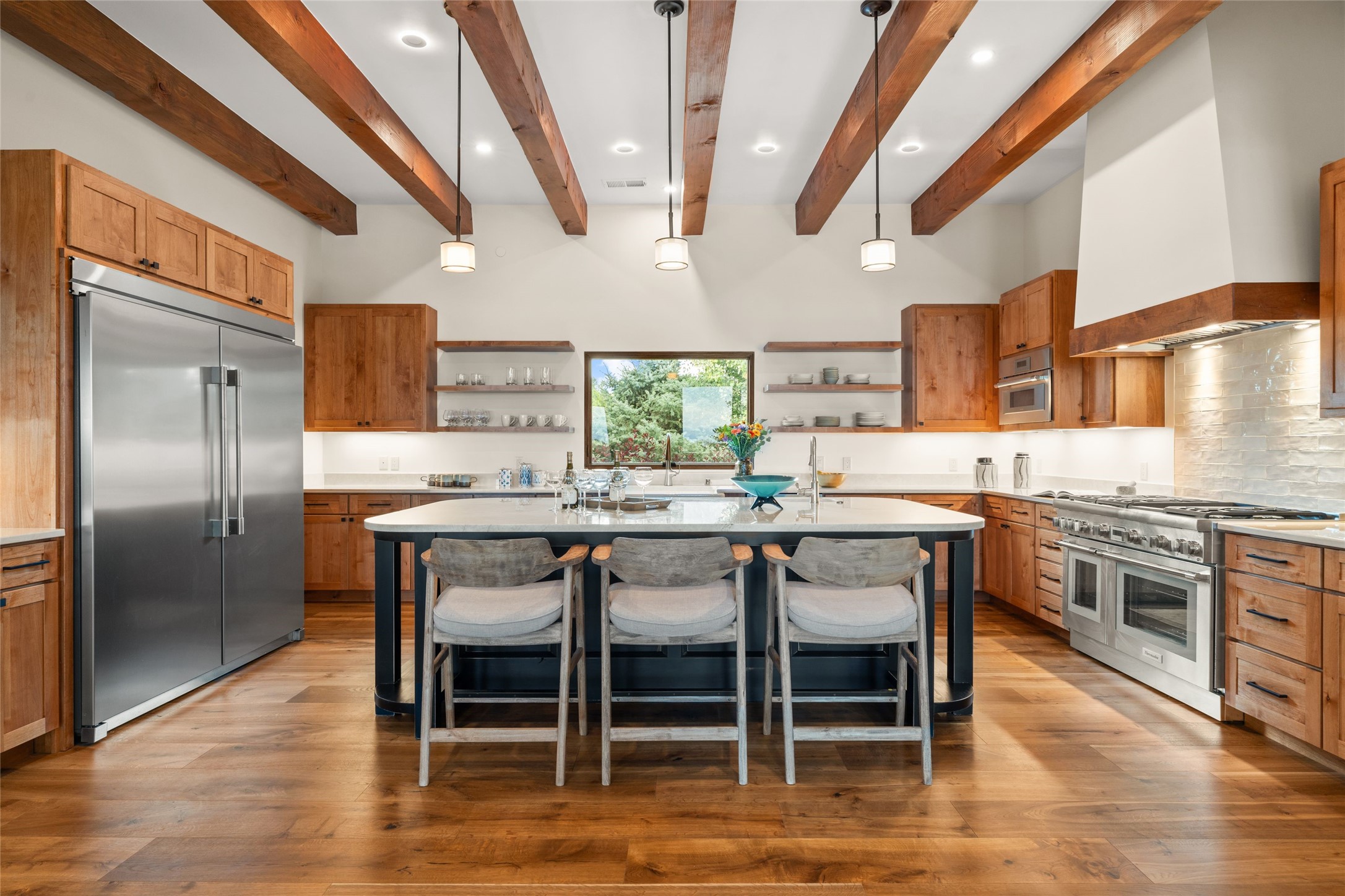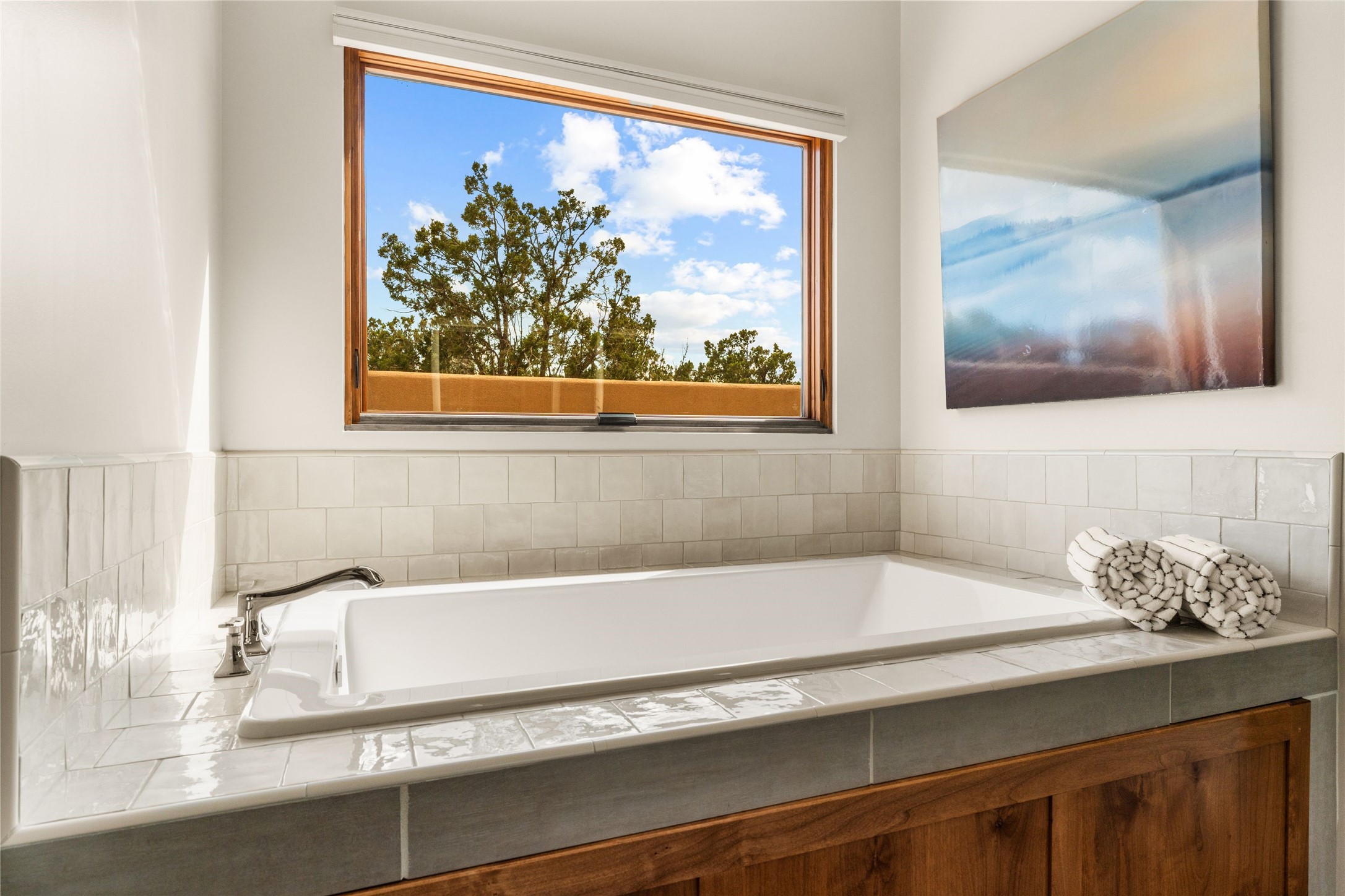 Santa Fe is a vibrant city and this is the home to enjoy it in. Nestled in one of the most sought after neighborhoods, this exceptional custom built home offers the perfect blend of luxury, tranquility, and design. Not far from the downtown, yet situated on 2.5 acres with breathtaking views in all directions. Not too grandiose but just the right amount of wonderful with tall beamed ceilings, tasteful wood floors and an impressive open concept that accommodates flawlessly while continually framing the captivating West views Santa Fe is famous for. Spend your mornings on the south of the home with a delightful seating area amongst fabulously landscaped outdoor spaces with mature spruce and aspen trees and fire pit but be sure to take in the evenings on the rear portal with the custom 65" Cubo Fire Table situated to capture the unparalleled views of the Jemez Mountains. With over a thousand sq ft of covered outdoor spaces, this is the ideal place to enjoy; as beautiful on the inside as on the outside and perfect for entertaining. Heated oversized three car garage, den/bedroom with extra soundproofing great for music enthusiasts or a media room, nicely appointed kitchen, bedrooms en suite, gated entry, Tpo roof, nearby trail systems, no dirt roads, Level 3 ev charger, whole home humidification system and more. If you're looking for a property that combines privacy, elegance, and a connection to the natural beauty of this incredible city, look no further. Come and experience this serene and tranquil beauty, and oh those outdoor spaces!