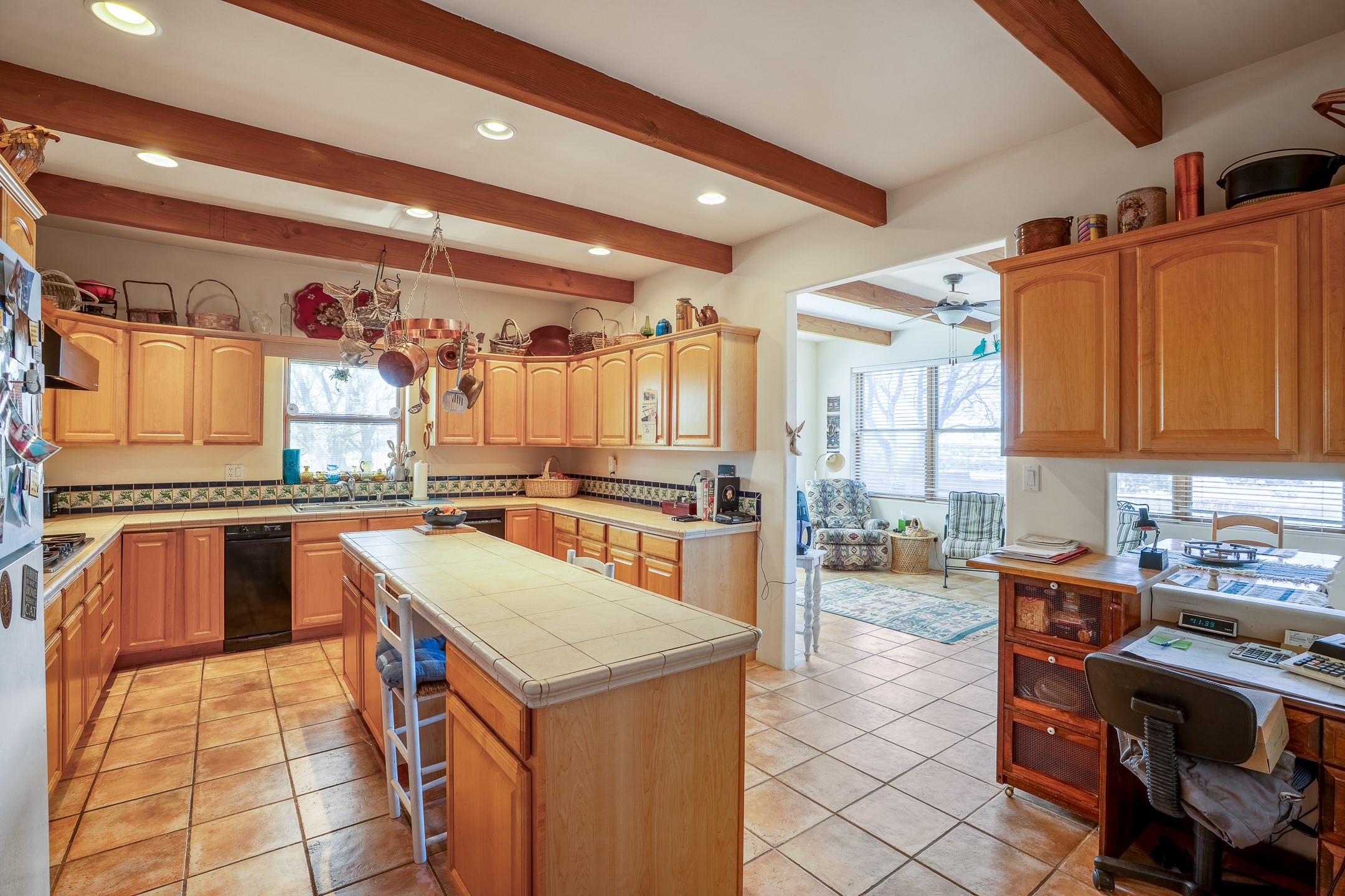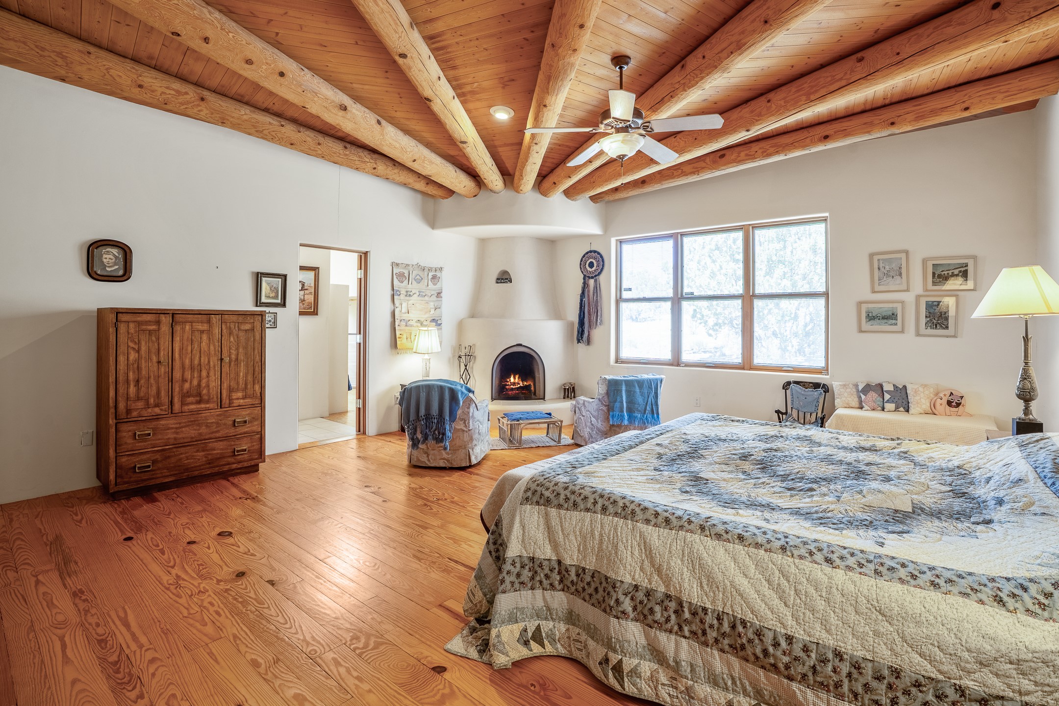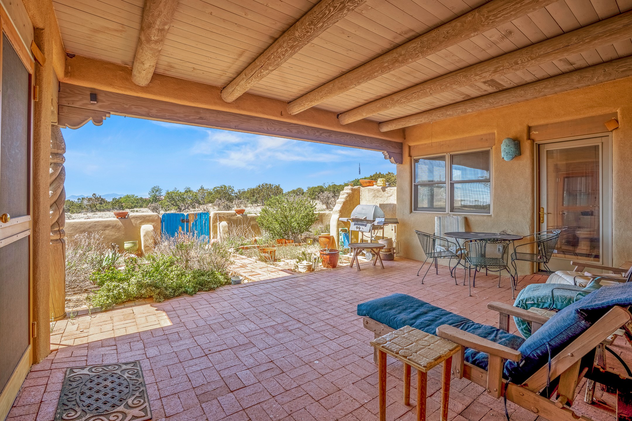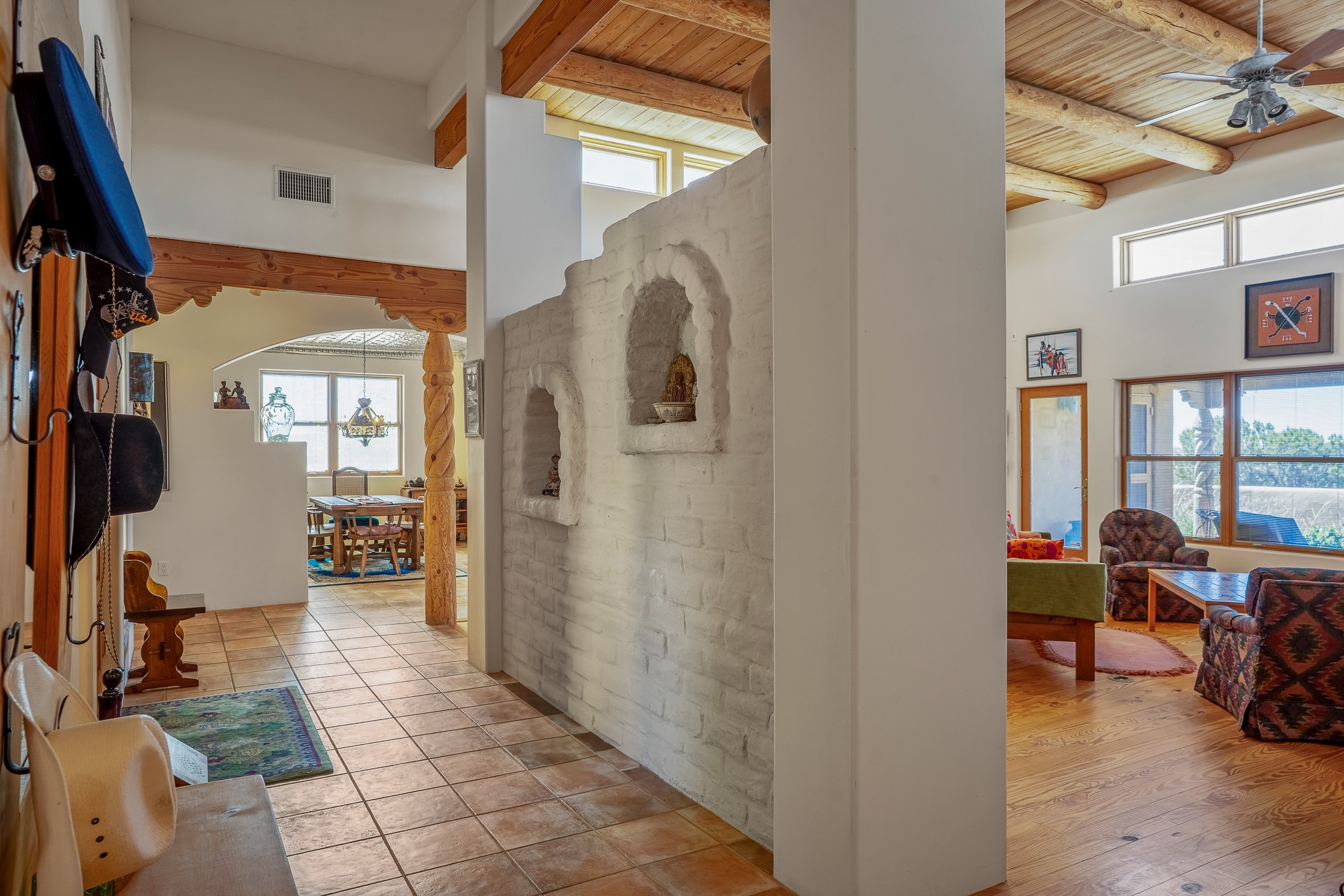 Welcome to Tierra de Casta, where spacious living meets breathtaking beauty! On five acres, with all the room you could ever desire to breathe, relax, and simply be. Step inside this homey residence, boasting over 4000 square feet of well designed space. From the moment you enter, you'll be captivated by the comfortable feeling of large rooms and soaring ceilings, all adorned with fine finishes that speak to a true sense of quality living. Prepare to be enchanted by the primary suite - it's a true sanctuary! Cozy evenings by the Kiva fireplace, with the rustic charm of vigas and tongue and groove ceilings adding a touch of authentic Southwestern warmth. The luxury bath invites you to unwind, whether you choose a soothing soak in the Jacuzzi tub or a refreshing rinse in the separate shower. Two additional generously sized bedrooms, each with its own ensuite bath, provide comfort and privacy for family or guests. Plus, a wonderfully large den, office, or library or another bedroom awaits your inspiration - for work, study, or simply curling up with a good book. The heart of the home, the great room, is truly something special. It offers breathtaking western views. From here, you have direct access to the formal dining room, where a beautifully stamped tin ceiling adds a unique and elegant touch to your gatherings. The well-appointed kitchen, featuring a spacious island, is ready for all your culinary adventures. And don't forget the sunroom! It's a cheerful spot with easy access to the rear portal, perfect for enjoying your morning coffee or evening refreshments in the fresh air. If you've been searching for a place with ample space to live, entertain, and create lasting memories, look no further. This home truly has all you need and so much more. Welcome to Tierra de Casta - we're so happy to have you!
