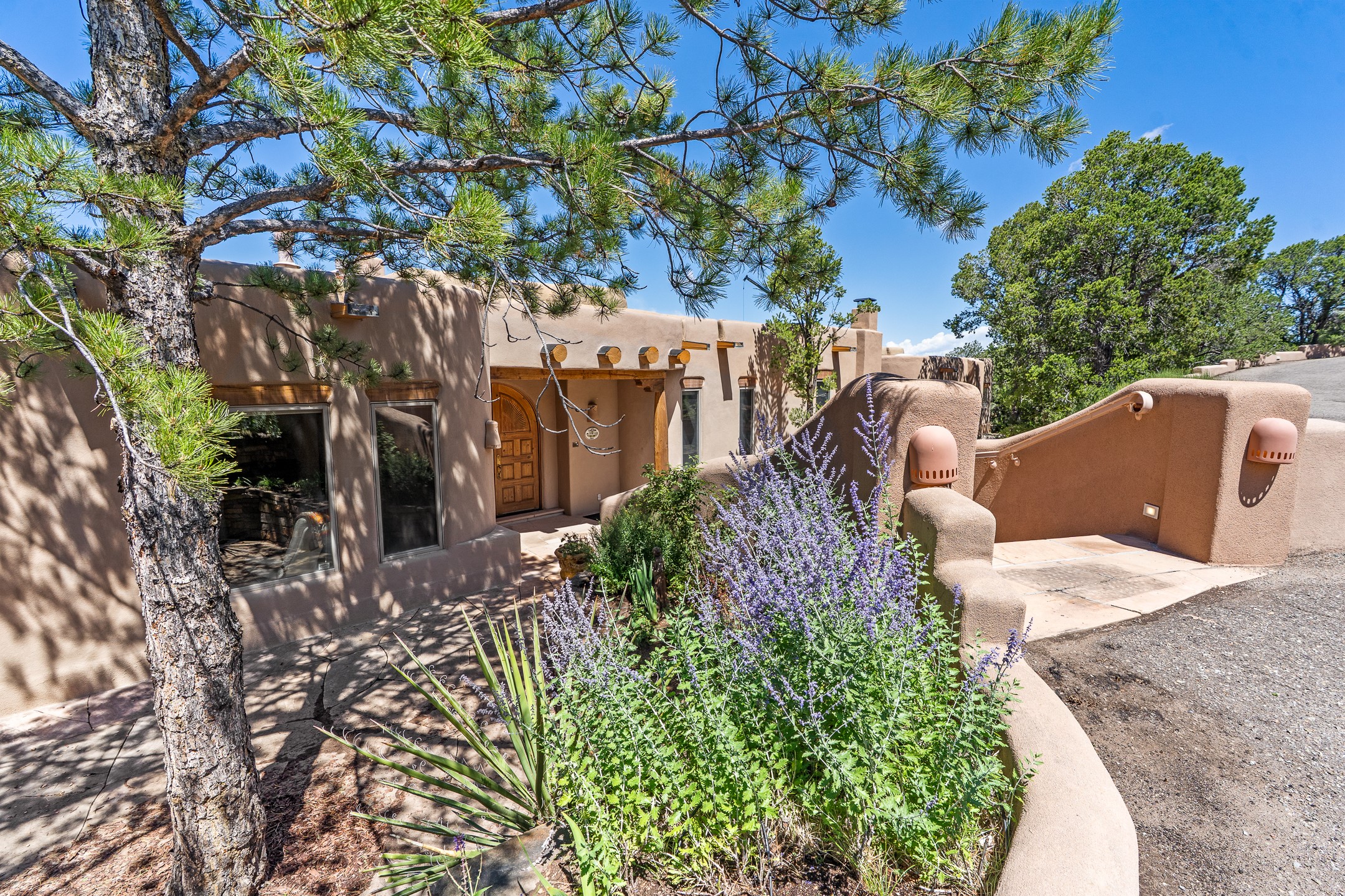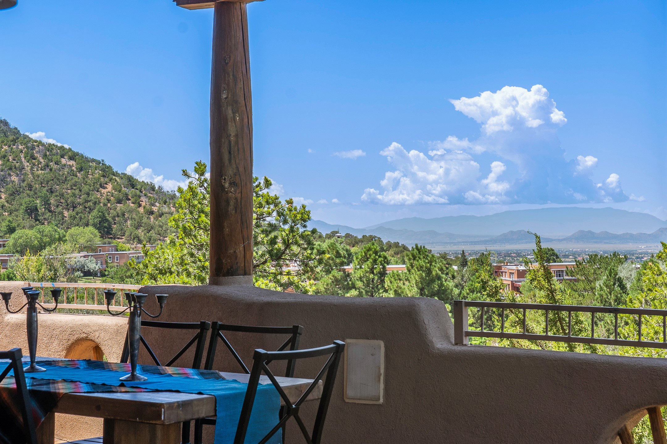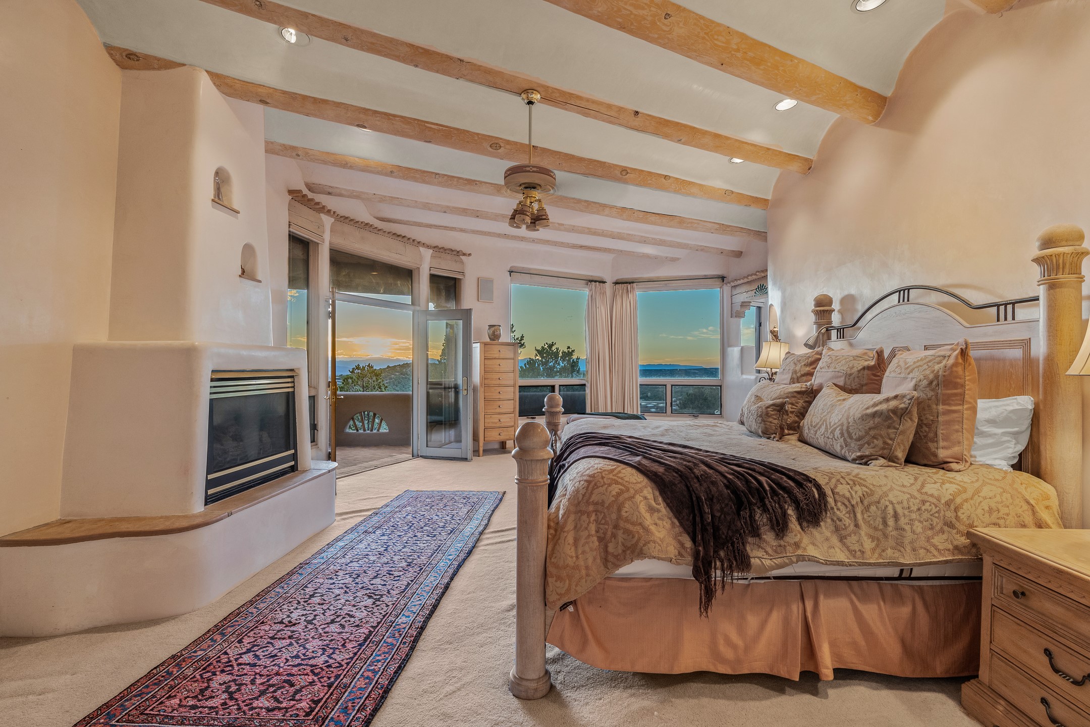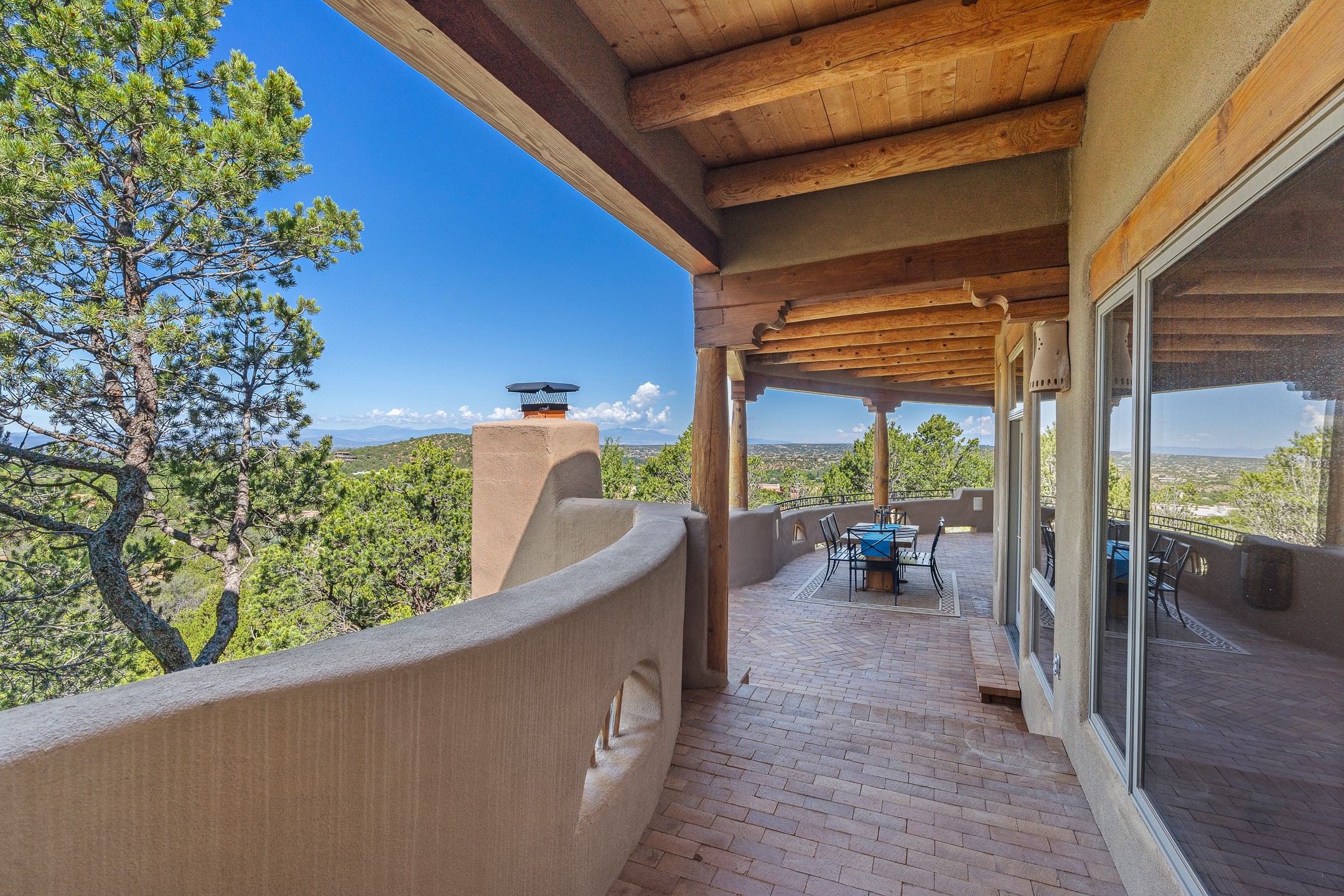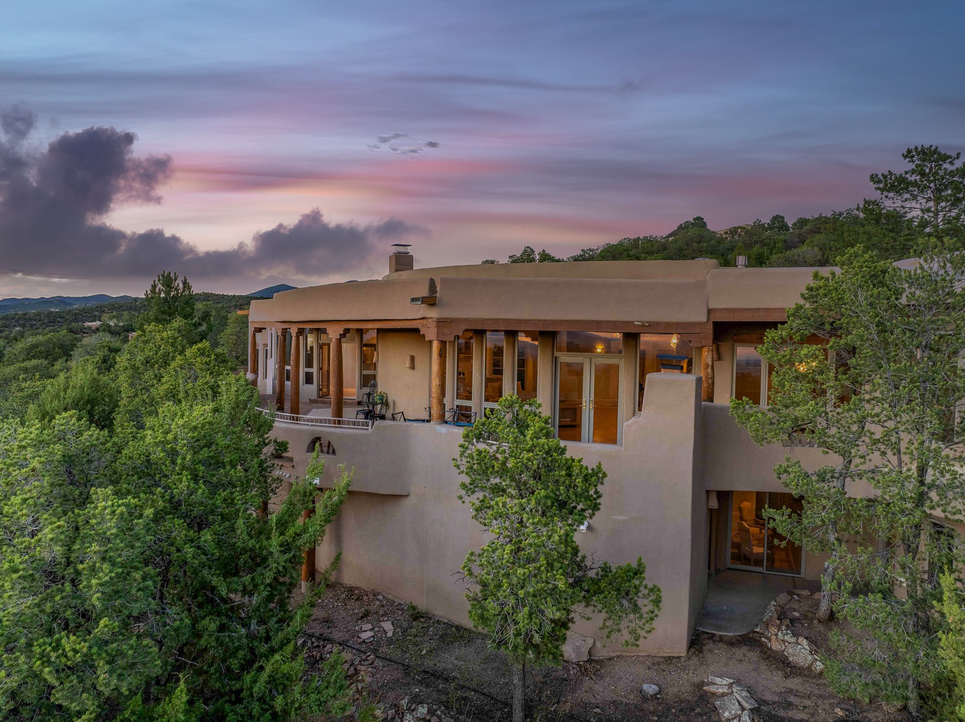 This gated sanctuary, less than 3 miles from the Plaza and Canyon Road, with unmatched views is on the market for first time. The pueblo-style property sits perched on approximately 2.24 acres of abundant aspens and blue spruce that frame the unparalleled city view and distant Sangre de Cristo and Jemez Mountains. Its thick wrap around brick patio is perfect for indoor-outdoor living and entertaining by the outdoor fireplace and skies. The extensive windows and glass doors on the westside of the home allow sunsets to bathe the home in shades of pink nightly. Upon entering the foyer you are warmed by a small kiva fireplace to greet your entrance. The main residence consists of 3 bedrooms, 2 1/2 baths, a library, an office, a den, an expansive sized great room, a bar, a gourmet kitchen, and 6 fireplaces. The 2 bedroom, 1 full bath guest house also offers panoramic views with a full kitchen, private covered patio, and kiva adorning the living room. Direct access to the main house as well as its own private entrance. The curved living quarters of the guest house boasts wall to wall windows of city views. Discover the magic of this property that sits perched above downtown Santa Fe with direct access to the Wilderness trails and the natural beauty of Santa Fe.