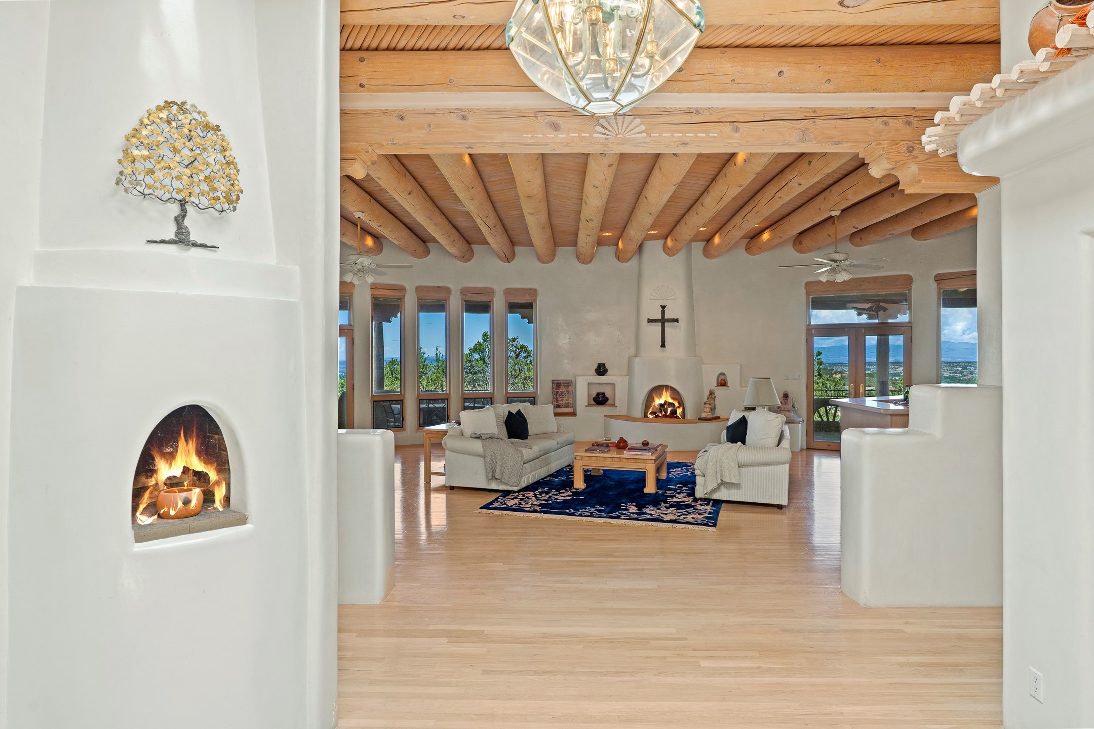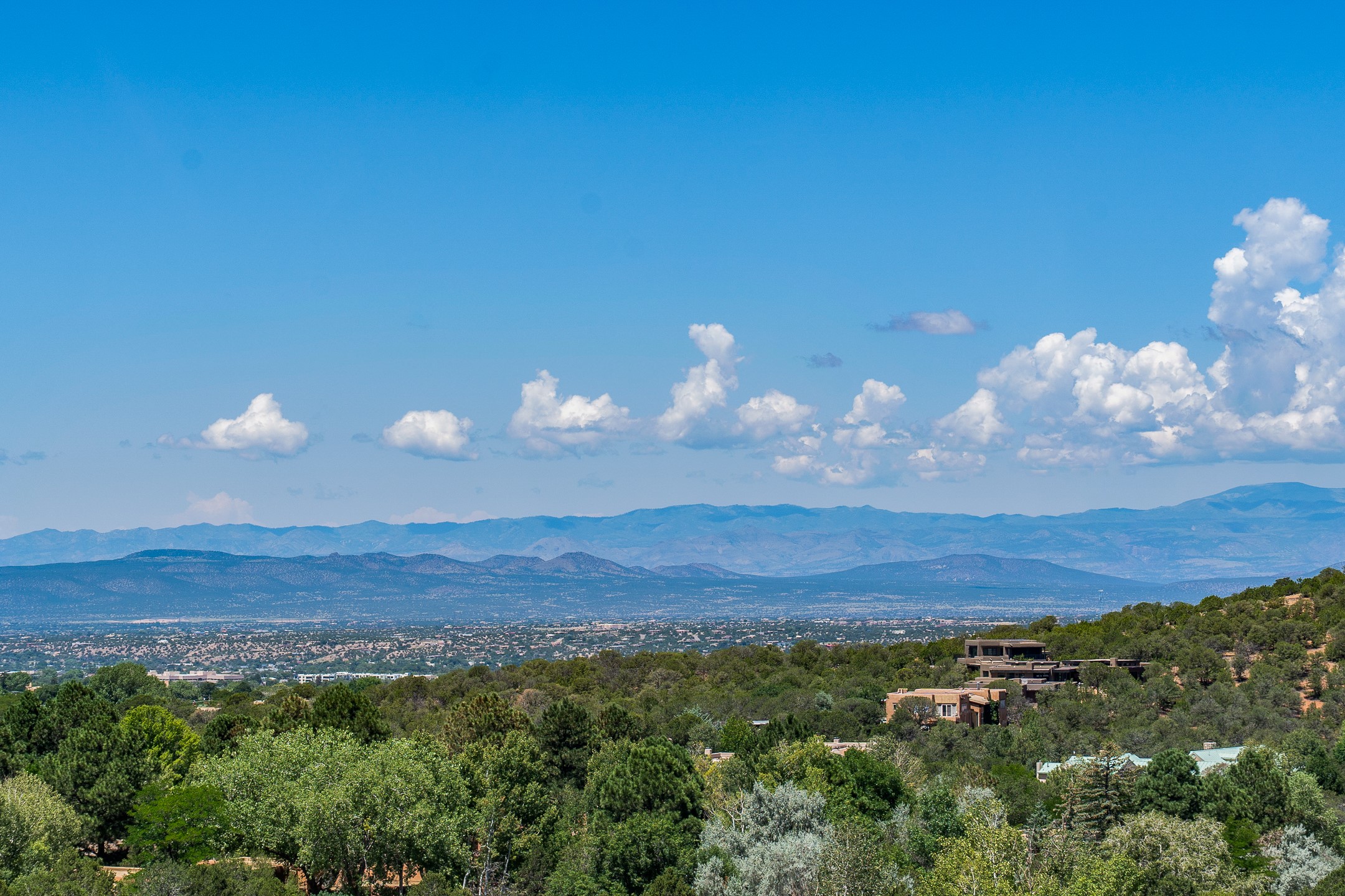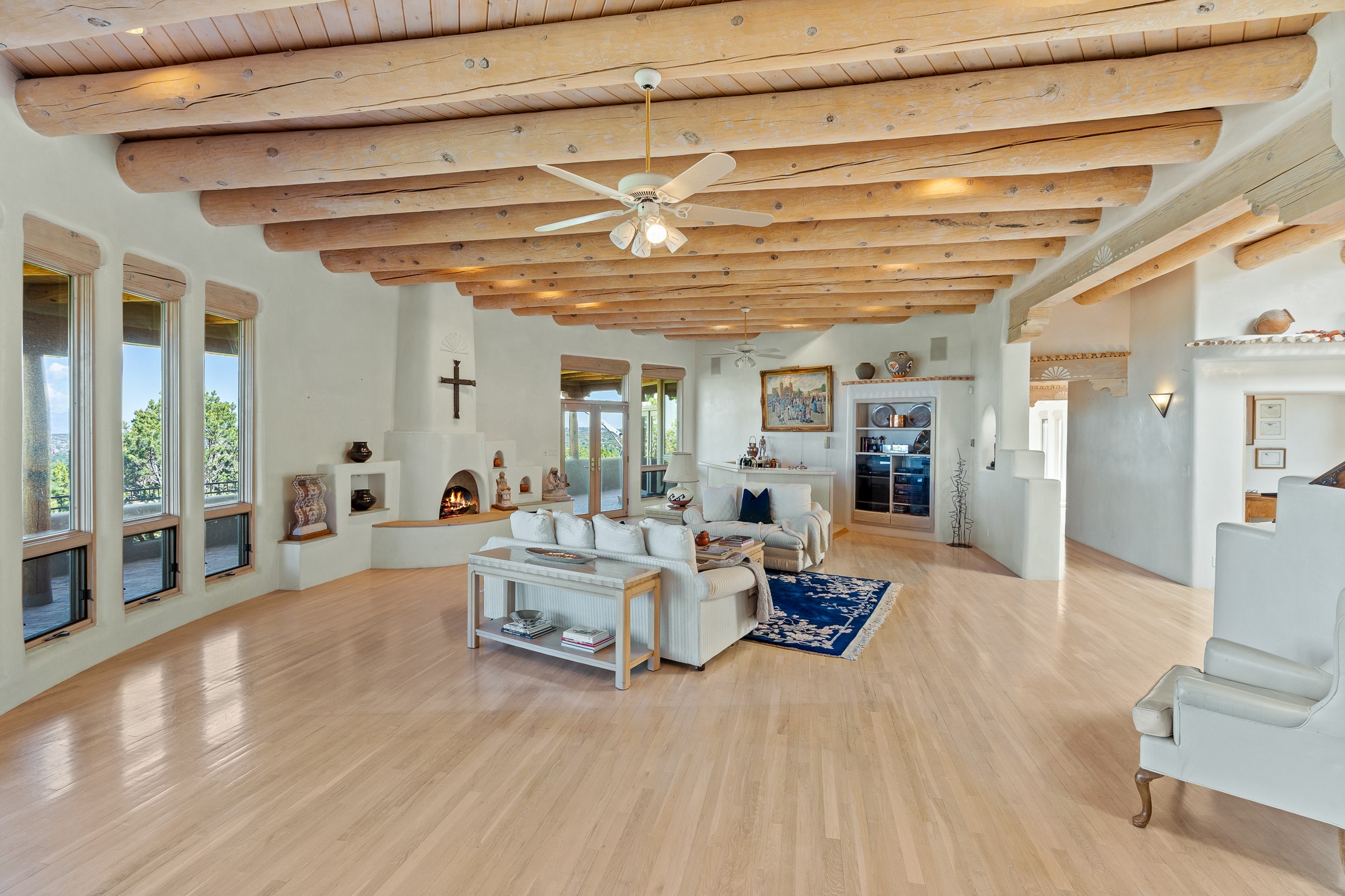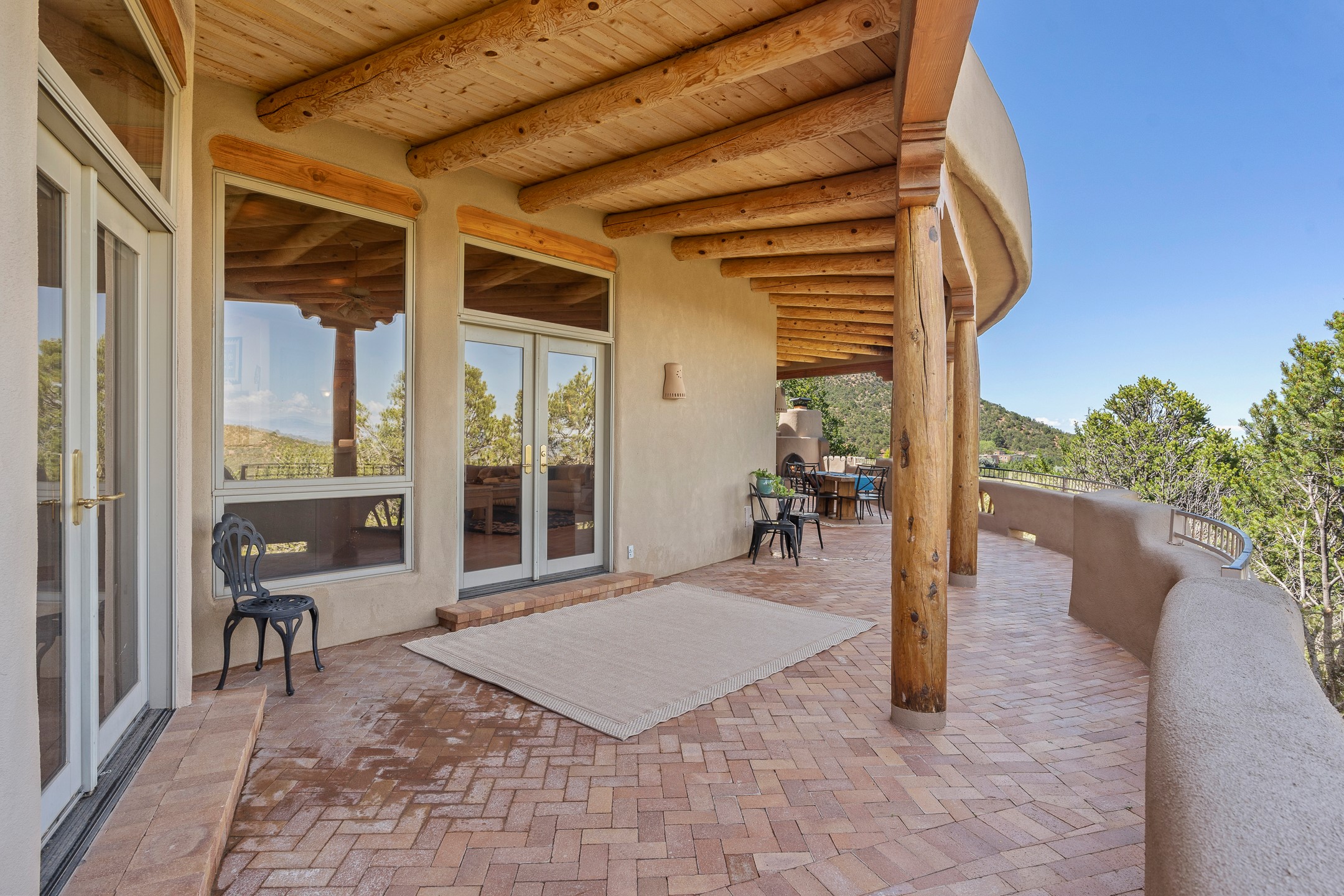 This gated sanctuary, less than 3 miles from the Plaza and Canyon Road, with unmatched views is on the market for first time. The pueblo-style property sits perched on approximately 2.24 acres of abundant aspens and blue spruce that frame the unparalleled city view and distant Sangre de Cristo and Jemez Mountains. Its thick wrap around brick patio is perfect for indoor-outdoor living and entertaining by the outdoor fireplace and skies. The extensive windows and glass doors on the westside of the home allow sunsets to bathe the home in shades of pink nightly. Upon entering the foyer you are warmed by a small kiva fireplace to greet your entrance. The main residence consists of 3 bedrooms, 2 1/2 baths, a library, an office, a den, an expansive sized great room, a bar, a gourmet kitchen, and 6 fireplaces. The 2 bedroom, 1 full bath guest house also offers panoramic views with a full kitchen, private covered patio, and kiva adorning the living room. Direct access to the main house as well as its own private entrance. The curved living quarters of the guest house boasts wall to wall windows of city views. Discover the magic of this property that sits perched above downtown Santa Fe with direct access to the Wilderness trails and the natural beauty of Santa Fe.