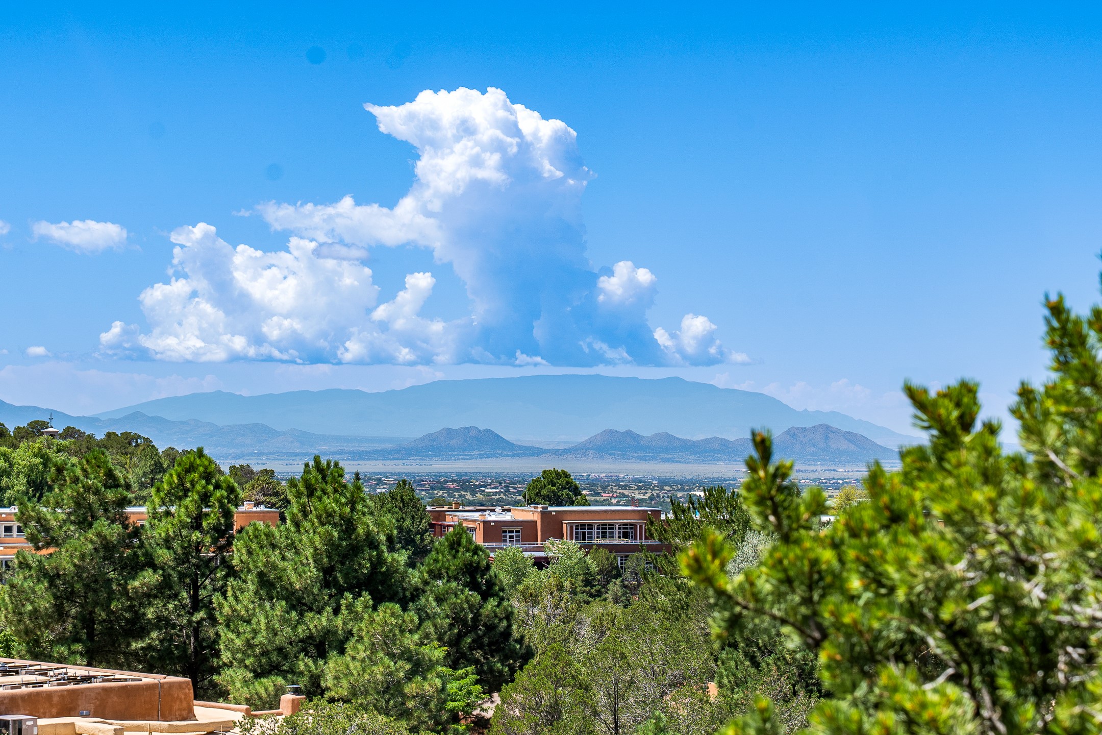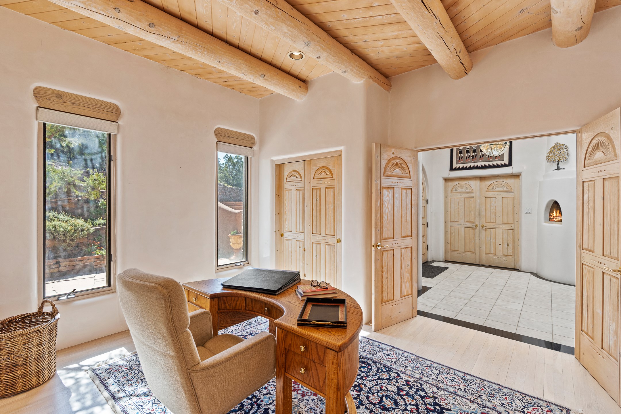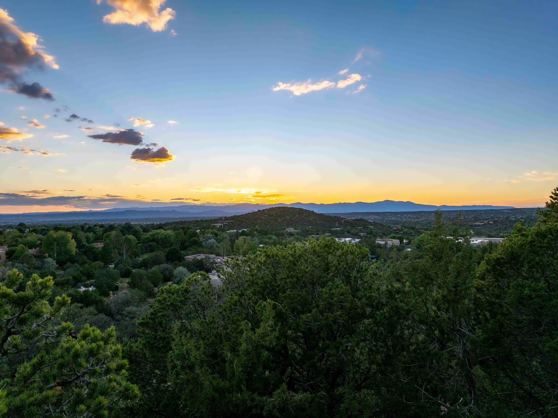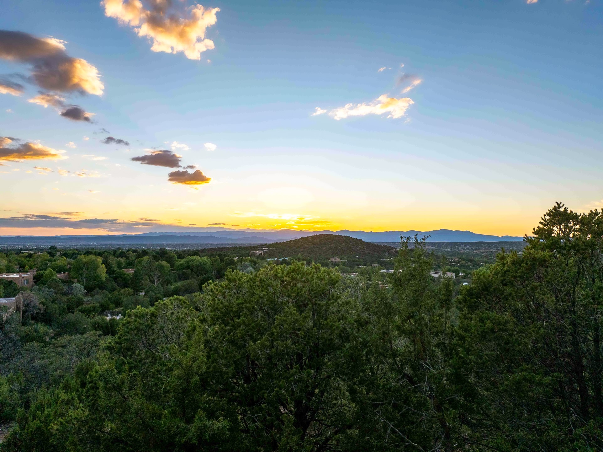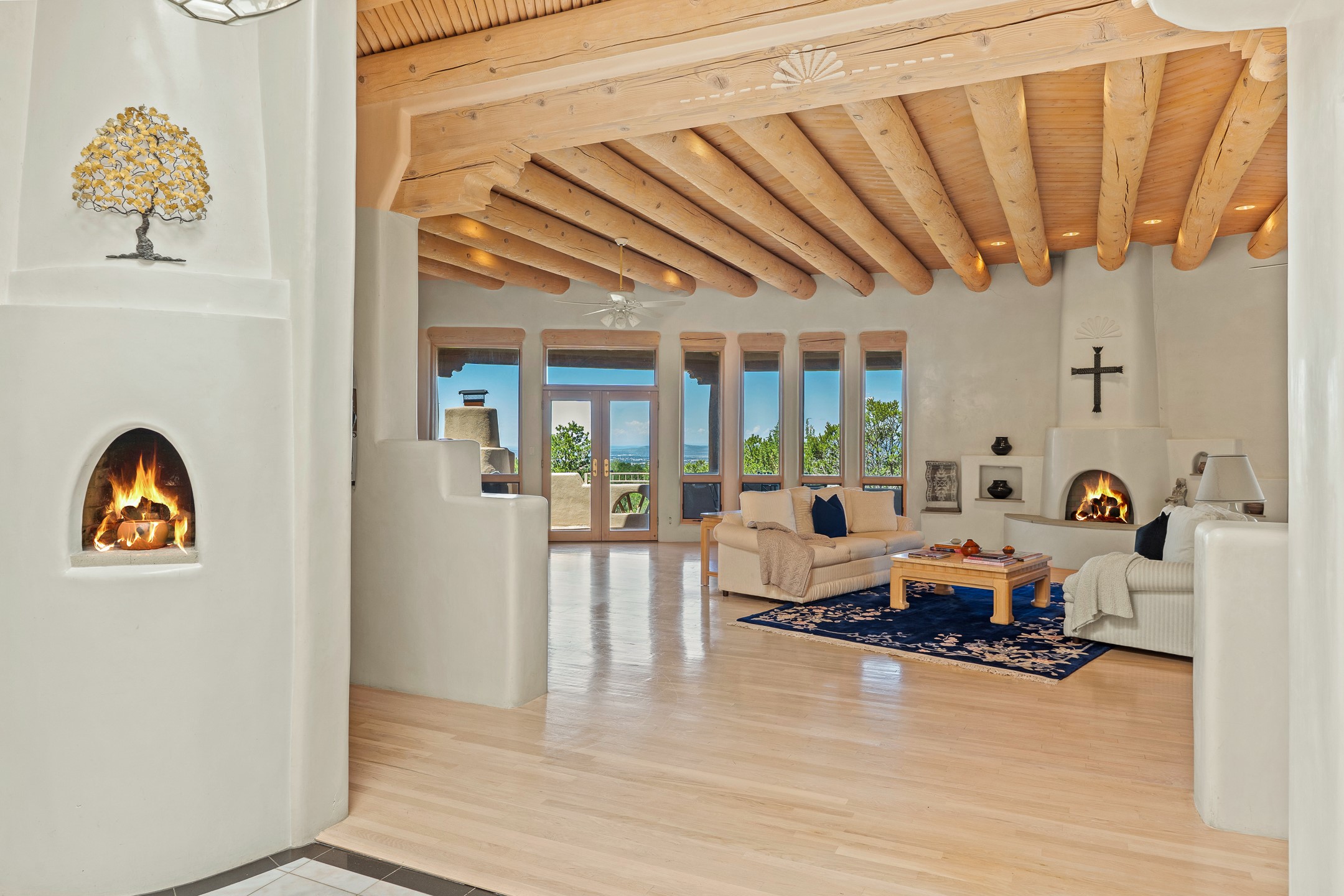 This gated sanctuary, less than 3 miles from the Plaza and Canyon Road, with unmatched views is on the market for first time. The pueblo-style property sits perched on approximately 2.24 acres of abundant aspens and blue spruce that frame the unparalleled city view and distant Sangre de Cristo and Jemez Mountains. Its thick wrap around brick patio is perfect for indoor-outdoor living and entertaining by the outdoor fireplace and skies. The extensive windows and glass doors on the westside of the home allow sunsets to bathe the home in shades of pink nightly. Upon entering the foyer you are warmed by a small kiva fireplace to greet your entrance. The main residence consists of 3 bedrooms, 2 1/2 baths, a library, an office, a den, an expansive sized great room, a bar, a gourmet kitchen, and 6 fireplaces. The 2 bedroom, 1 full bath guest house also offers panoramic views with a full kitchen, private covered patio, and kiva adorning the living room. Direct access to the main house as well as its own private entrance. The curved living quarters of the guest house boasts wall to wall windows of city views. Discover the magic of this property that sits perched above downtown Santa Fe with direct access to the Wilderness trails and the natural beauty of Santa Fe.