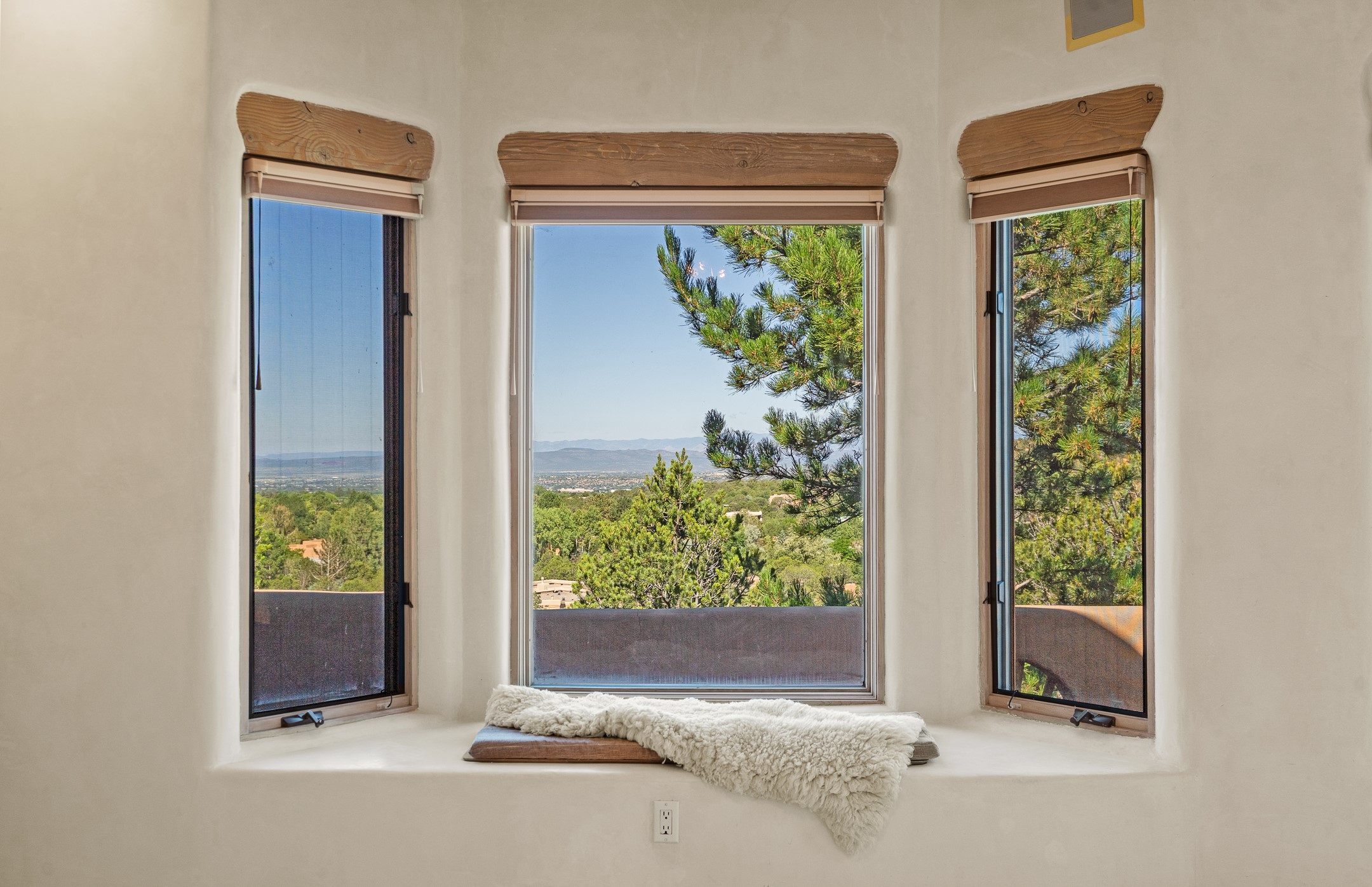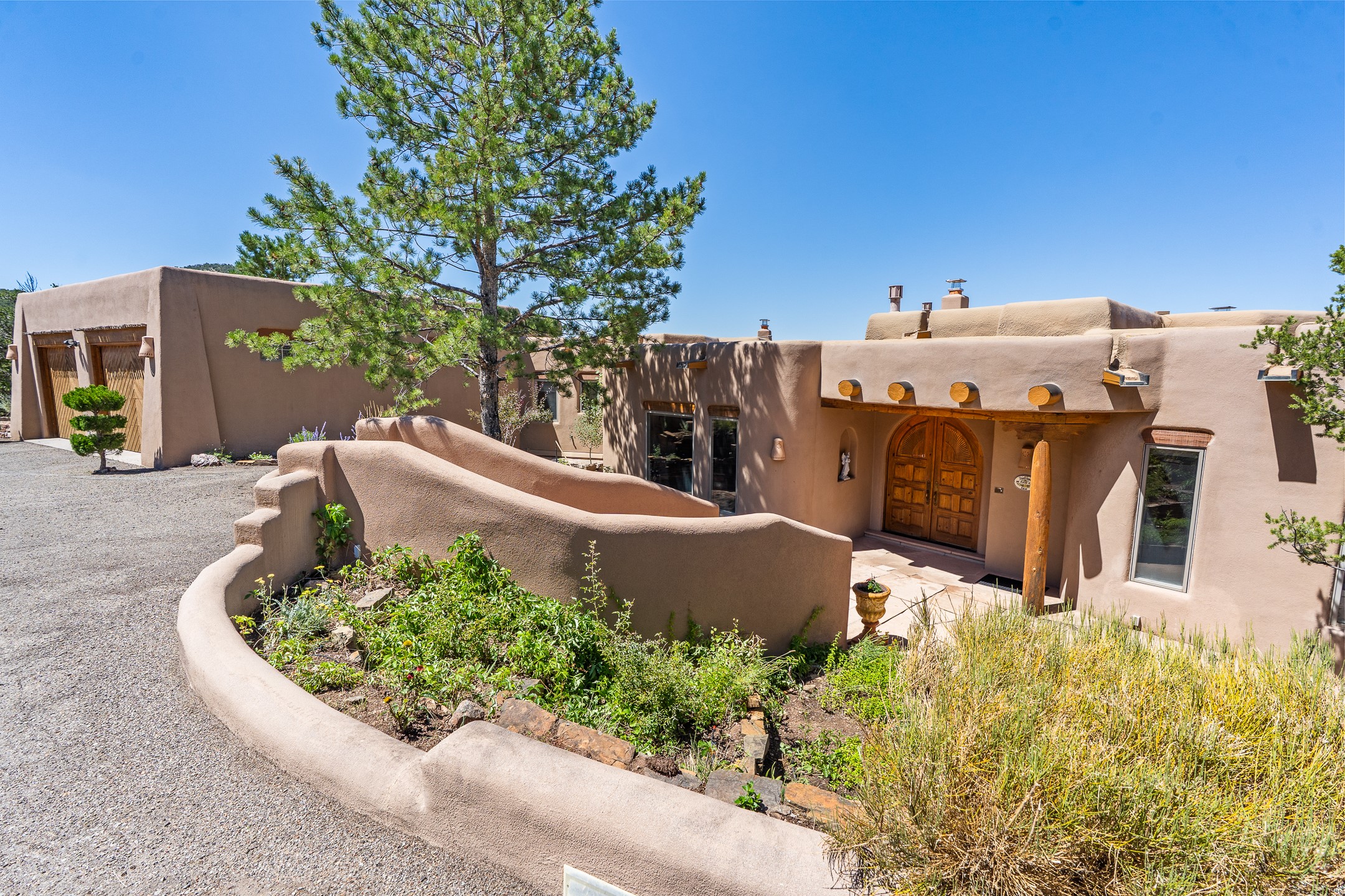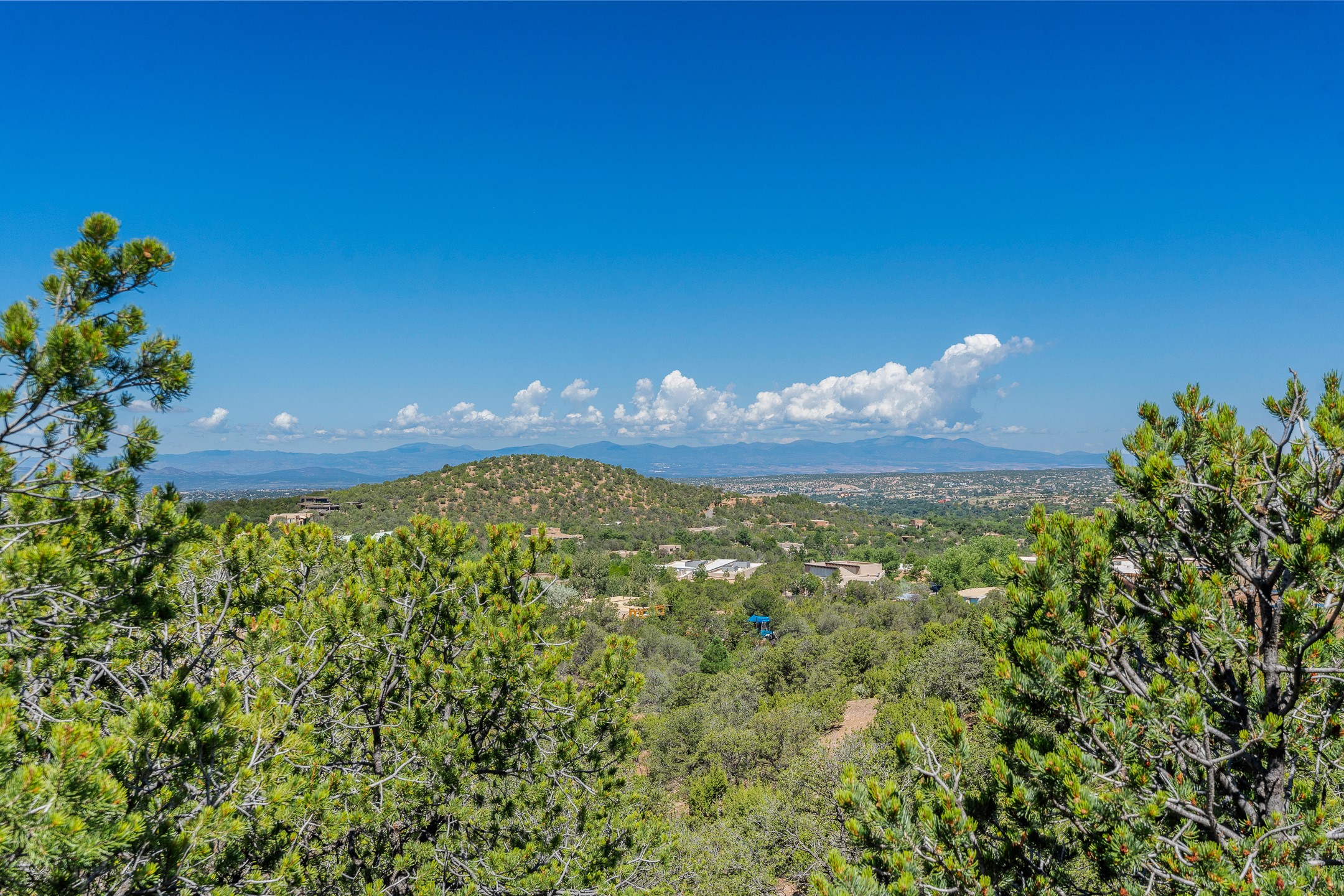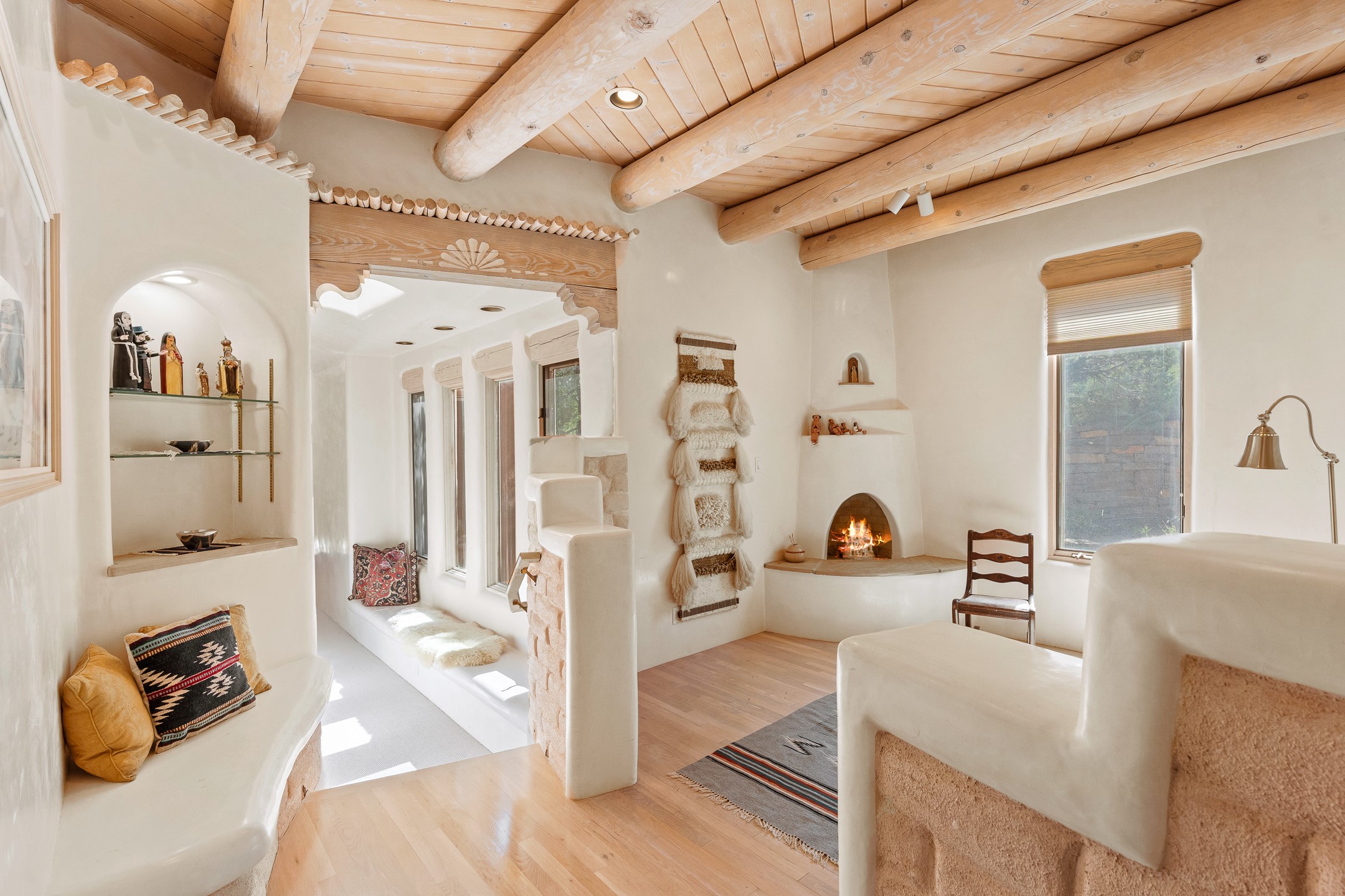 This gated sanctuary, less than 3 miles from the Plaza and Canyon Road, with unmatched views is on the market for first time. The pueblo-style property sits perched on approximately 2.24 acres of abundant aspens and blue spruce that frame the unparalleled city view and distant Sangre de Cristo and Jemez Mountains. Its thick wrap around brick patio is perfect for indoor-outdoor living and entertaining by the outdoor fireplace and skies. The extensive windows and glass doors on the westside of the home allow sunsets to bathe the home in shades of pink nightly. Upon entering the foyer you are warmed by a small kiva fireplace to greet your entrance. The main residence consists of 3 bedrooms, 2 1/2 baths, a library, an office, a den, an expansive sized great room, a bar, a gourmet kitchen, and 6 fireplaces. The 2 bedroom, 1 full bath guest house also offers panoramic views with a full kitchen, private covered patio, and kiva adorning the living room. Direct access to the main house as well as its own private entrance. The curved living quarters of the guest house boasts wall to wall windows of city views. Discover the magic of this property that sits perched above downtown Santa Fe with direct access to the Wilderness trails and the natural beauty of Santa Fe.
