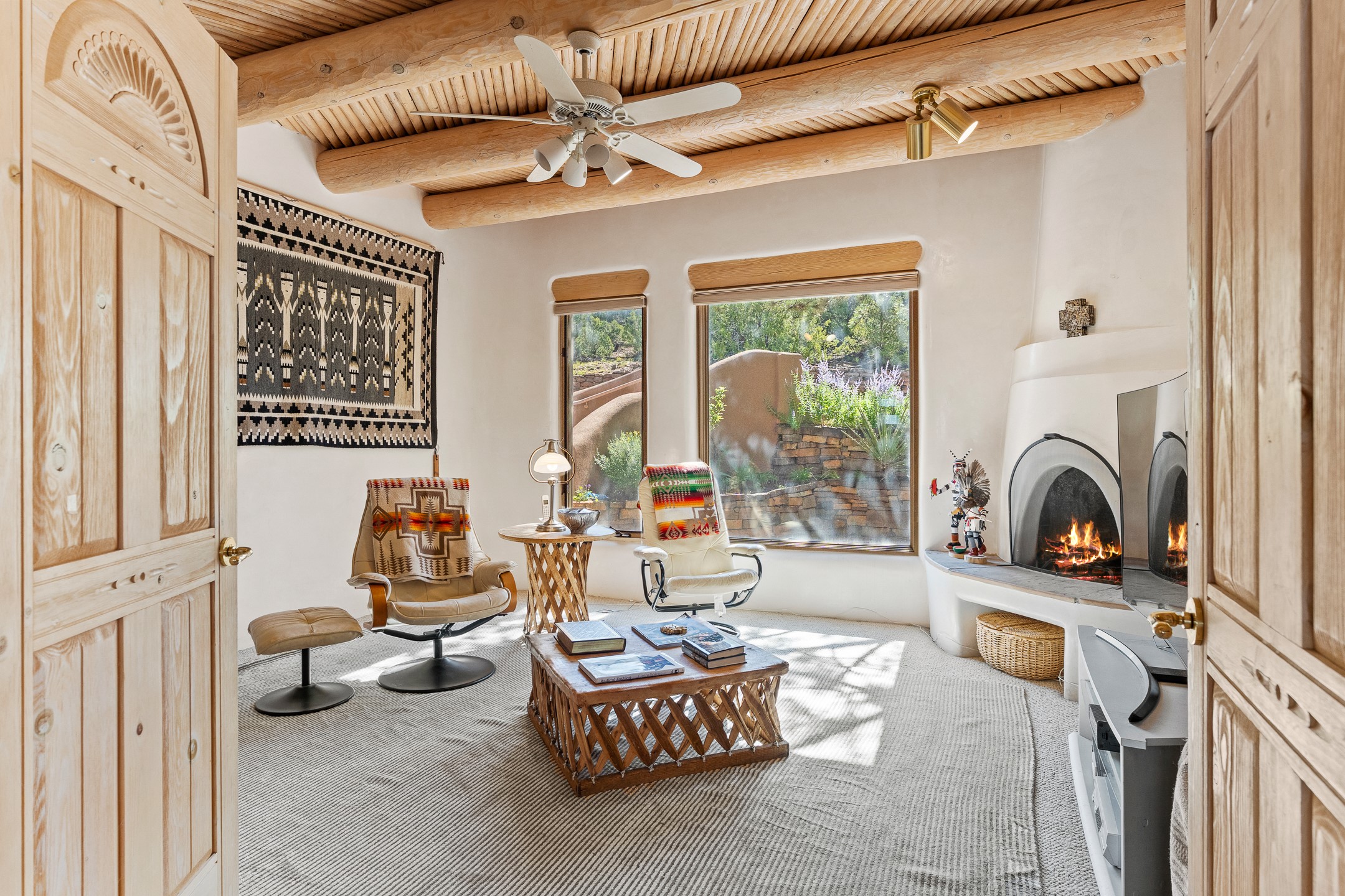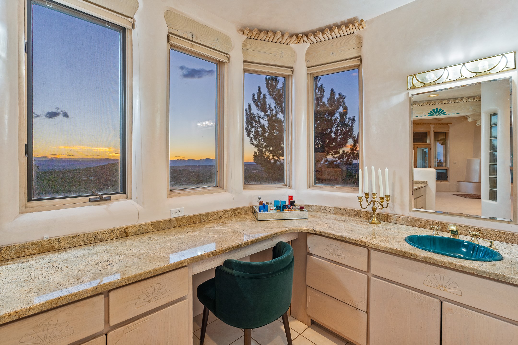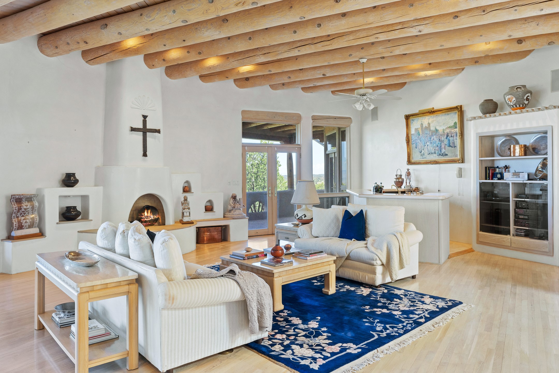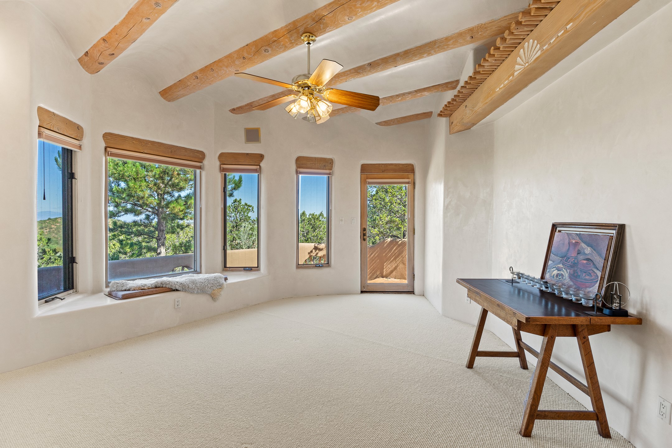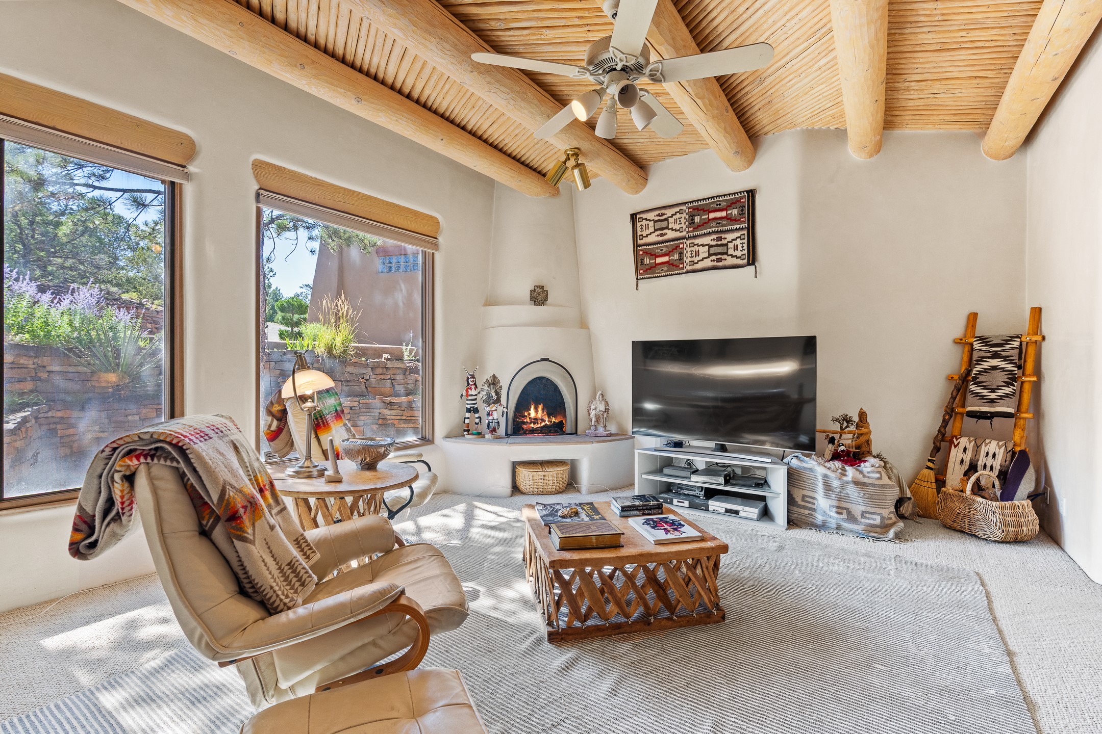 This gated sanctuary, less than 3 miles from the Plaza and Canyon Road, with unmatched views is on the market for first time. The pueblo-style property sits perched on approximately 2.24 acres of abundant aspens and blue spruce that frame the unparalleled city view and distant Sangre de Cristo and Jemez Mountains. Its thick wrap around brick patio is perfect for indoor-outdoor living and entertaining by the outdoor fireplace and skies. The extensive windows and glass doors on the westside of the home allow sunsets to bathe the home in shades of pink nightly. Upon entering the foyer you are warmed by a small kiva fireplace to greet your entrance. The main residence consists of 3 bedrooms, 2 1/2 baths, a library, an office, a den, an expansive sized great room, a bar, a gourmet kitchen, and 6 fireplaces. The 2 bedroom, 1 full bath guest house also offers panoramic views with a full kitchen, private covered patio, and kiva adorning the living room. Direct access to the main house as well as its own private entrance. The curved living quarters of the guest house boasts wall to wall windows of city views. Discover the magic of this property that sits perched above downtown Santa Fe with direct access to the Wilderness trails and the natural beauty of Santa Fe.