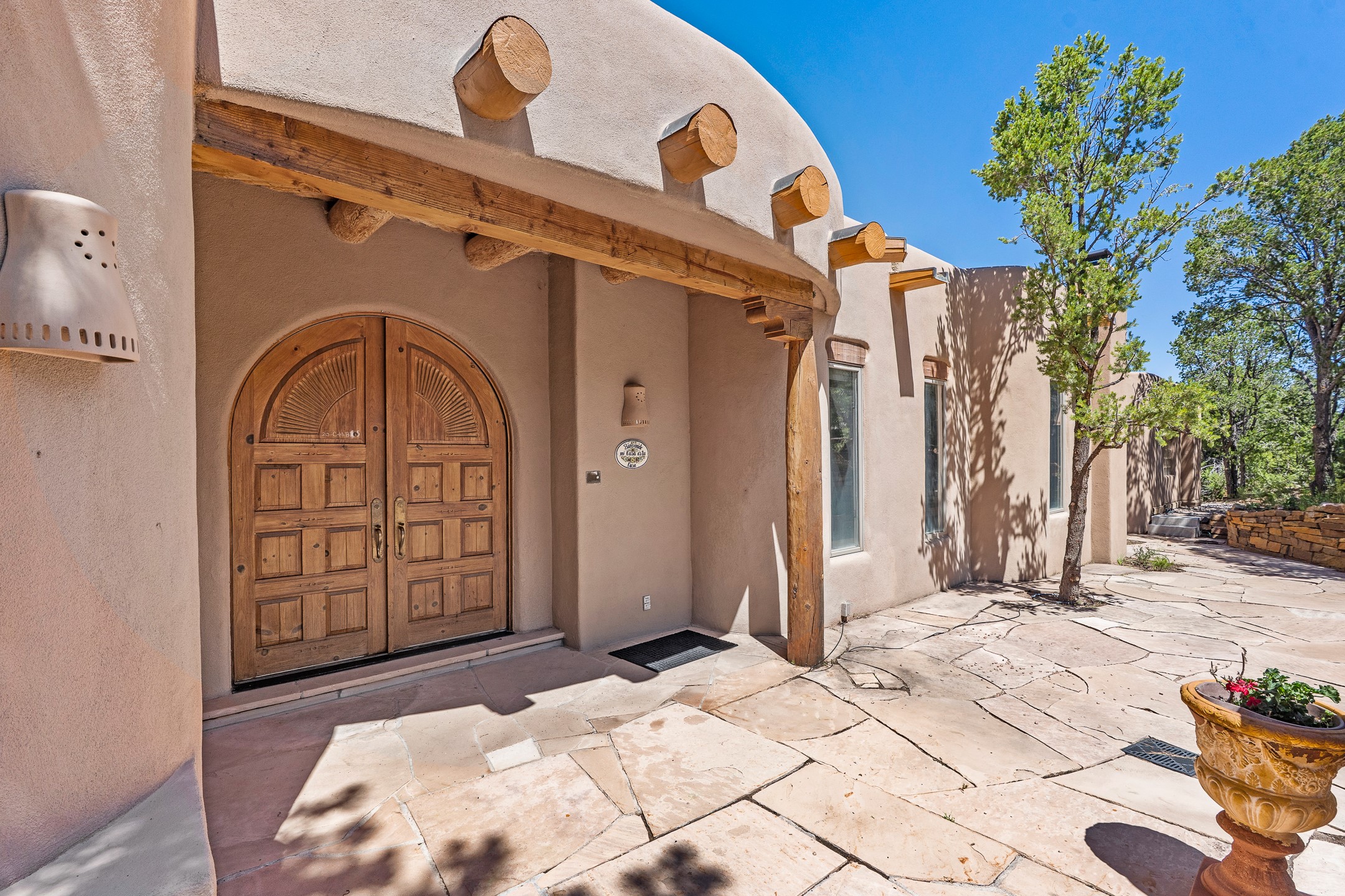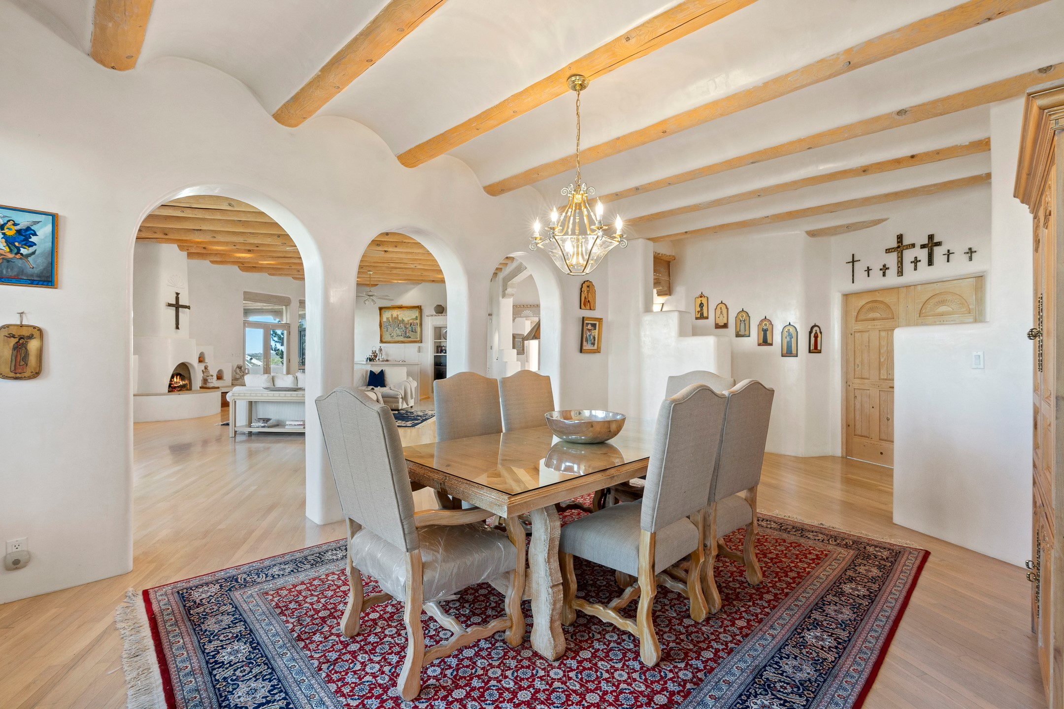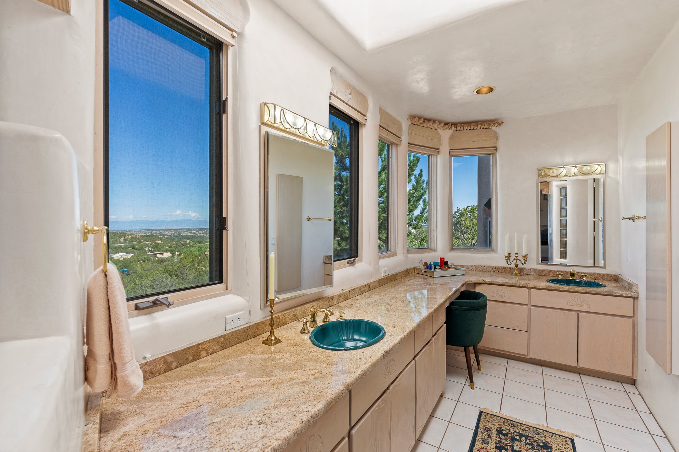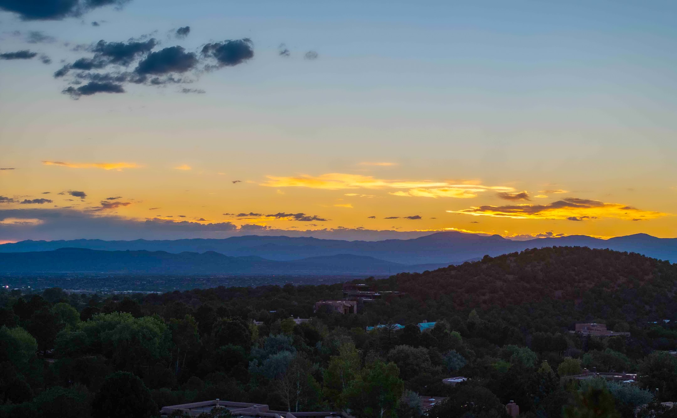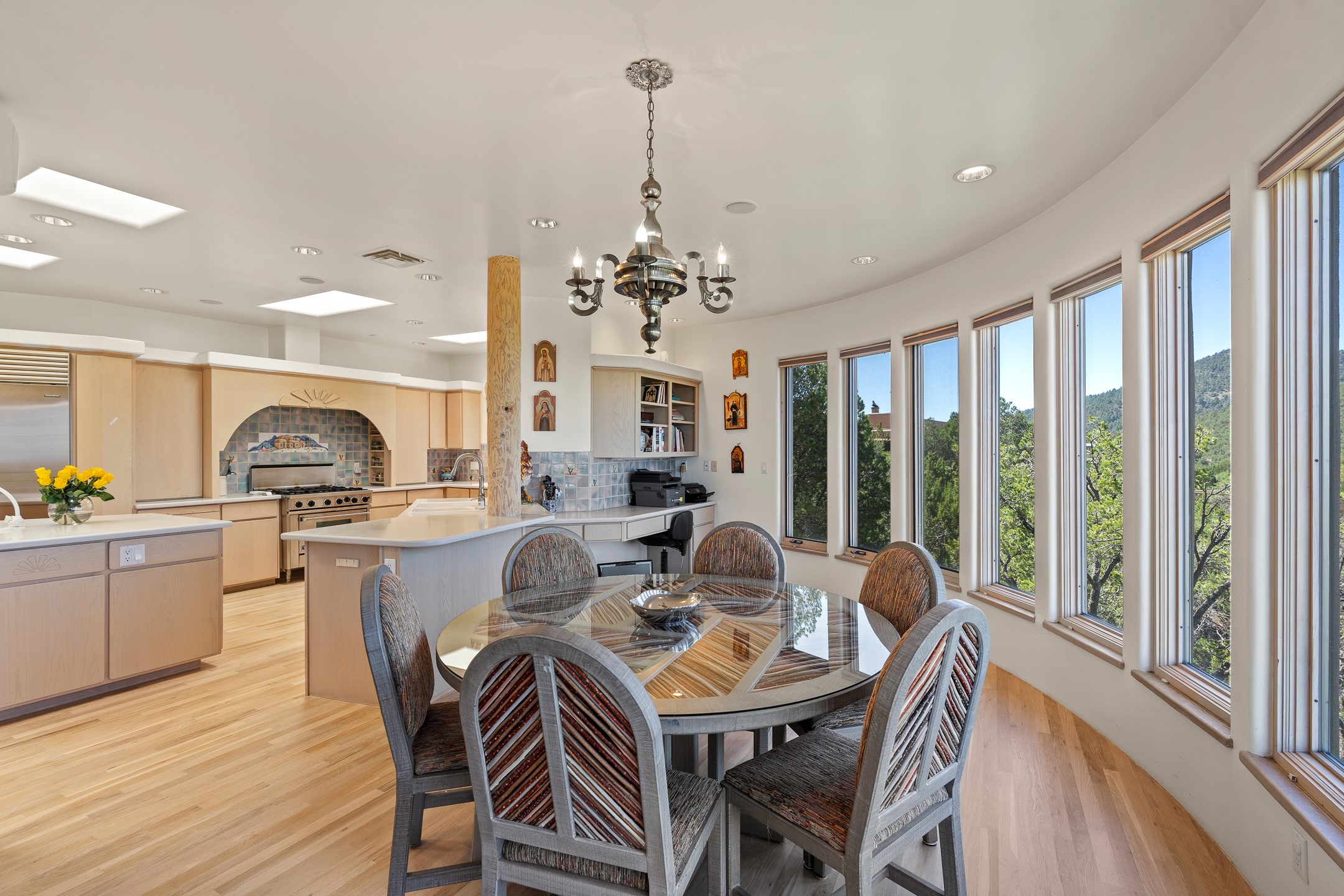 This gated sanctuary, less than 3 miles from the Plaza and Canyon Road, with unmatched views is on the market for first time. The pueblo-style property sits perched on approximately 2.24 acres of abundant aspens and blue spruce that frame the unparalleled city view and distant Sangre de Cristo and Jemez Mountains. Its thick wrap around brick patio is perfect for indoor-outdoor living and entertaining by the outdoor fireplace and skies. The extensive windows and glass doors on the westside of the home allow sunsets to bathe the home in shades of pink nightly. Upon entering the foyer you are warmed by a small kiva fireplace to greet your entrance. The main residence consists of 3 bedrooms, 2 1/2 baths, a library, an office, a den, an expansive sized great room, a bar, a gourmet kitchen, and 6 fireplaces. The 2 bedroom, 1 full bath guest house also offers panoramic views with a full kitchen, private covered patio, and kiva adorning the living room. Direct access to the main house as well as its own private entrance. The curved living quarters of the guest house boasts wall to wall windows of city views. Discover the magic of this property that sits perched above downtown Santa Fe with direct access to the Wilderness trails and the natural beauty of Santa Fe.