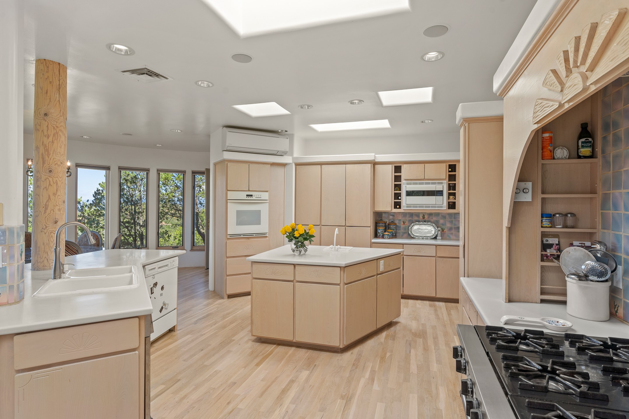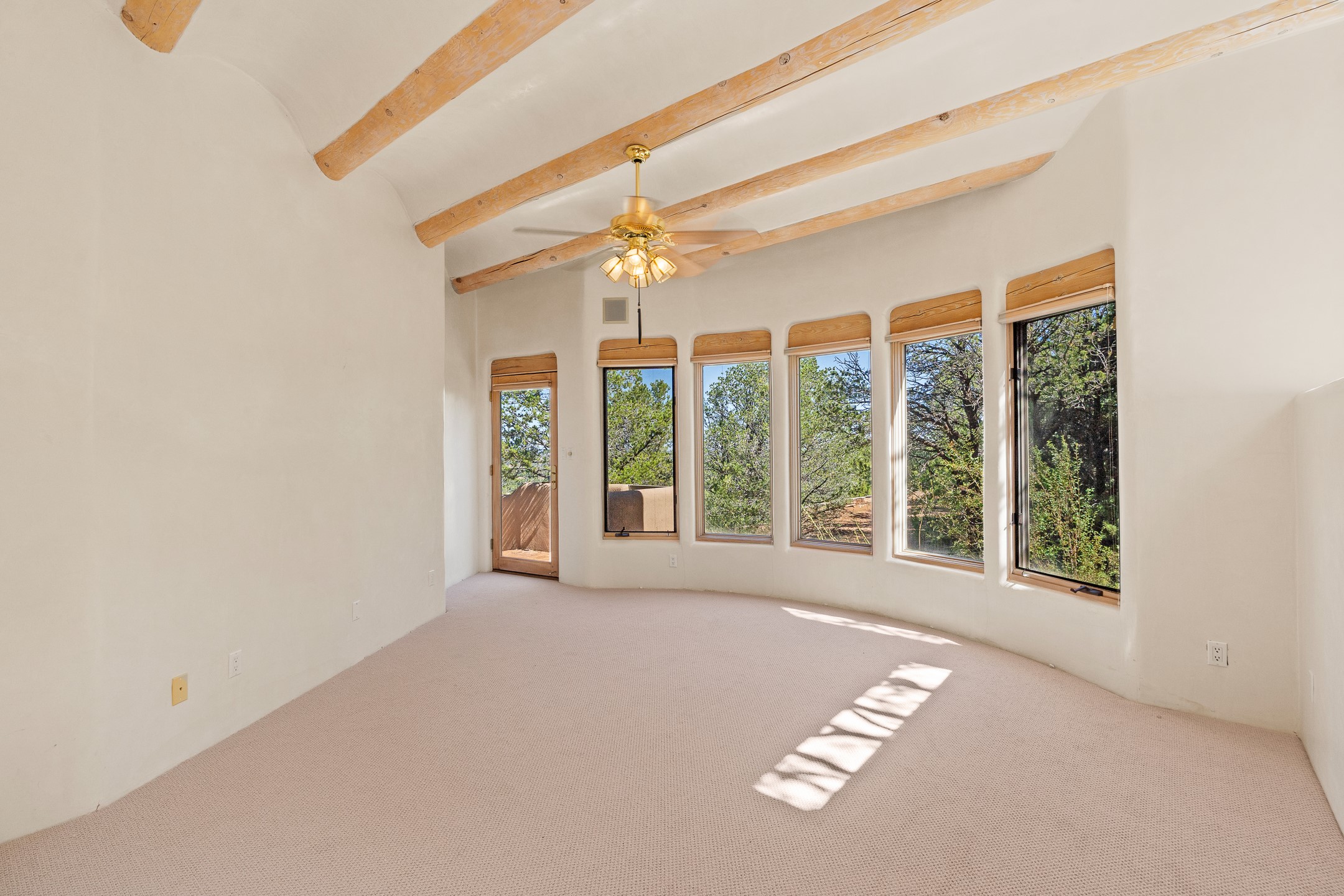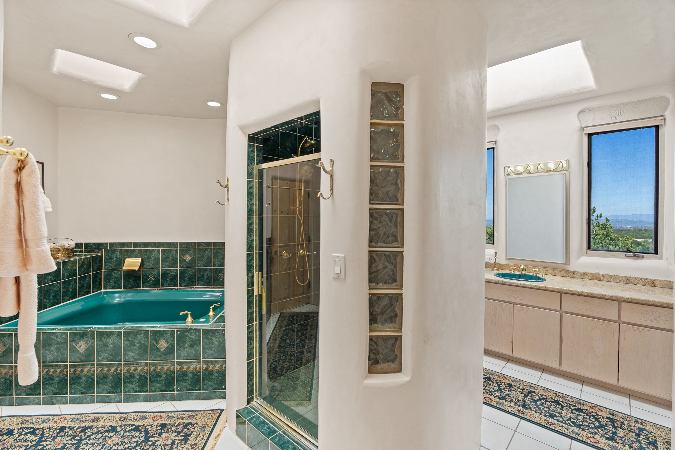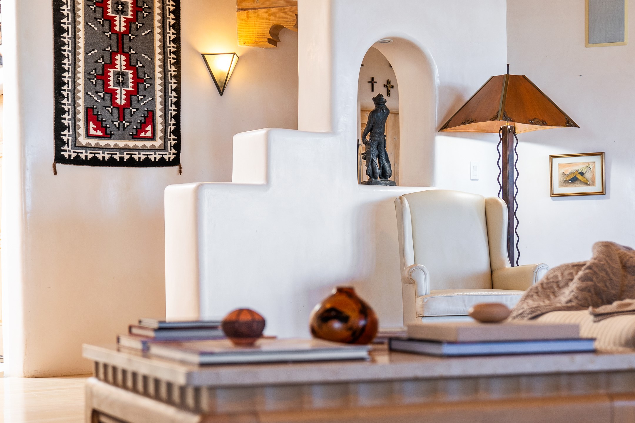 This gated sanctuary, less than 3 miles from the Plaza and Canyon Road, with unmatched views is on the market for first time. The pueblo-style property sits perched on approximately 2.24 acres of abundant aspens and blue spruce that frame the unparalleled city view and distant Sangre de Cristo and Jemez Mountains. Its thick wrap around brick patio is perfect for indoor-outdoor living and entertaining by the outdoor fireplace and skies. The extensive windows and glass doors on the westside of the home allow sunsets to bathe the home in shades of pink nightly. Upon entering the foyer you are warmed by a small kiva fireplace to greet your entrance. The main residence consists of 3 bedrooms, 2 1/2 baths, a library, an office, a den, an expansive sized great room, a bar, a gourmet kitchen, and 6 fireplaces. The 2 bedroom, 1 full bath guest house also offers panoramic views with a full kitchen, private covered patio, and kiva adorning the living room. Direct access to the main house as well as its own private entrance. The curved living quarters of the guest house boasts wall to wall windows of city views. Discover the magic of this property that sits perched above downtown Santa Fe with direct access to the Wilderness trails and the natural beauty of Santa Fe.