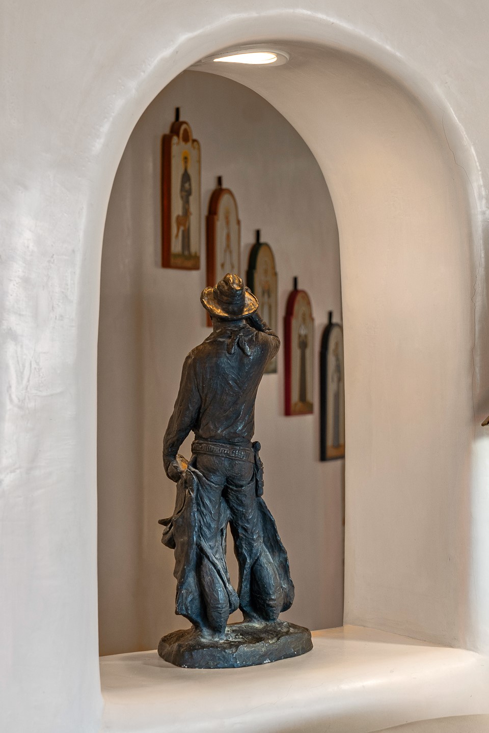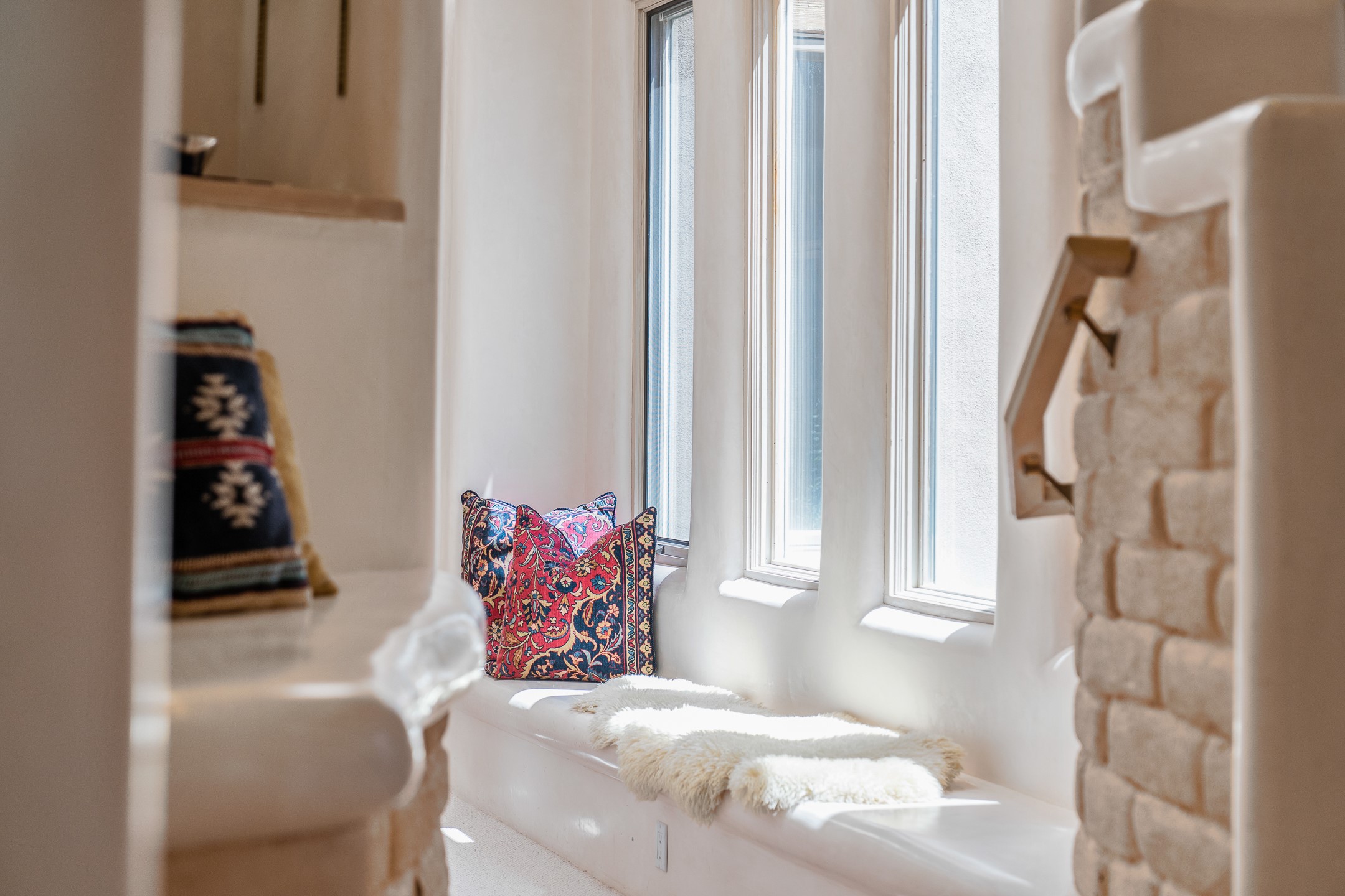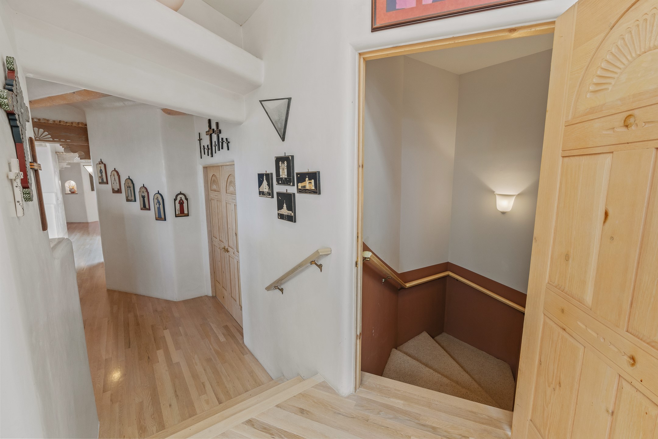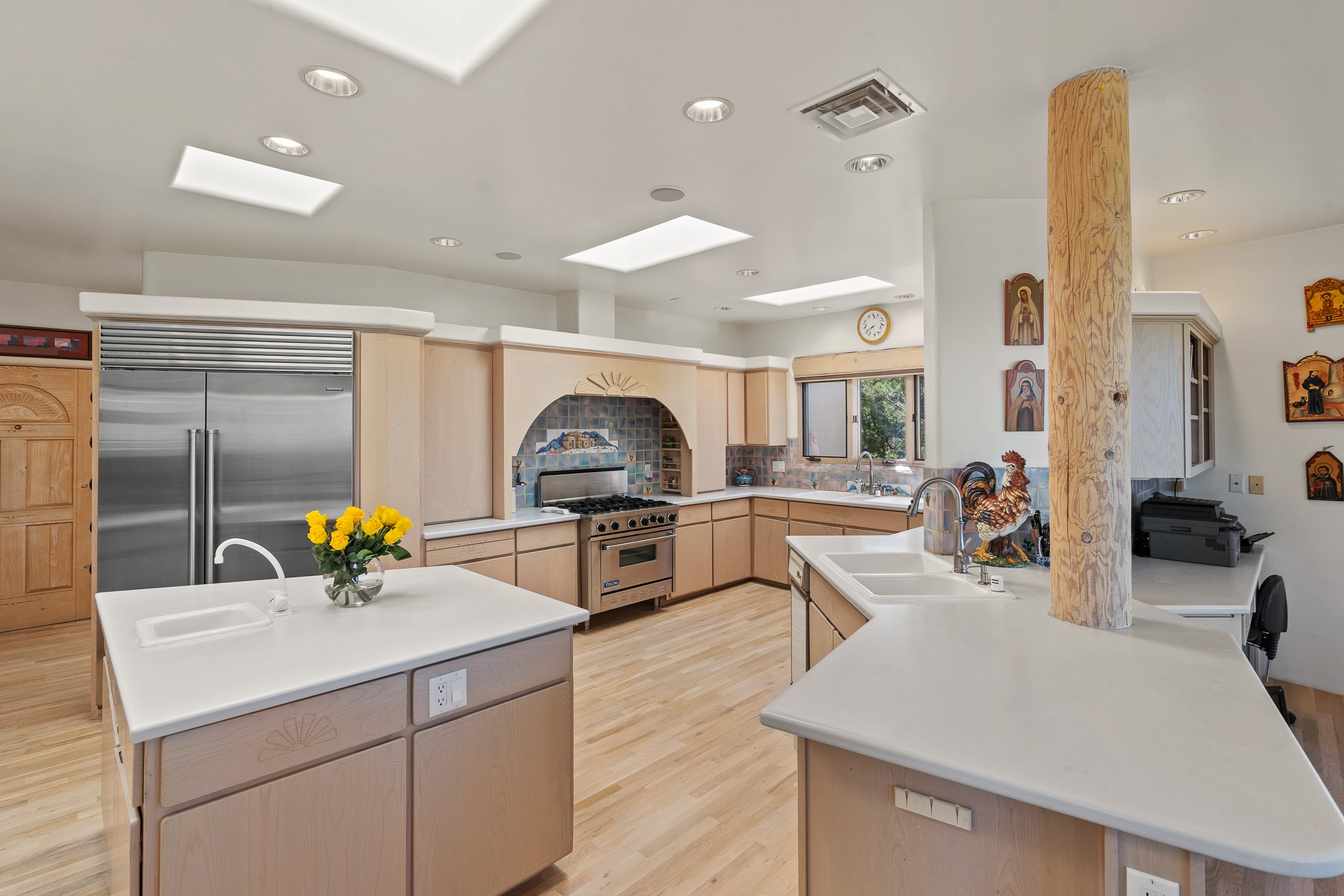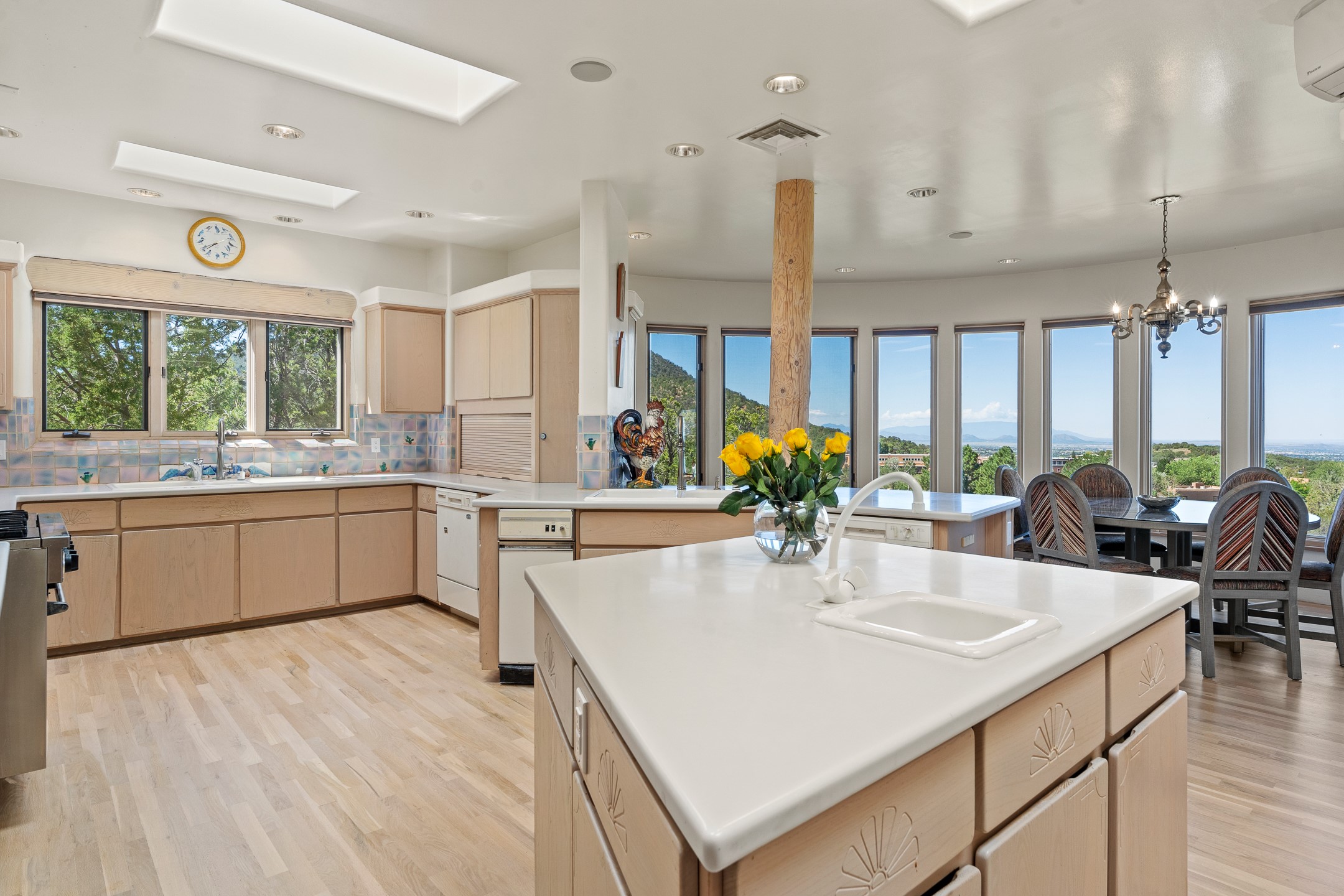 This gated sanctuary, less than 3 miles from the Plaza and Canyon Road, with unmatched views is on the market for first time. The pueblo-style property sits perched on approximately 2.24 acres of abundant aspens and blue spruce that frame the unparalleled city view and distant Sangre de Cristo and Jemez Mountains. Its thick wrap around brick patio is perfect for indoor-outdoor living and entertaining by the outdoor fireplace and skies. The extensive windows and glass doors on the westside of the home allow sunsets to bathe the home in shades of pink nightly. Upon entering the foyer you are warmed by a small kiva fireplace to greet your entrance. The main residence consists of 3 bedrooms, 2 1/2 baths, a library, an office, a den, an expansive sized great room, a bar, a gourmet kitchen, and 6 fireplaces. The 2 bedroom, 1 full bath guest house also offers panoramic views with a full kitchen, private covered patio, and kiva adorning the living room. Direct access to the main house as well as its own private entrance. The curved living quarters of the guest house boasts wall to wall windows of city views. Discover the magic of this property that sits perched above downtown Santa Fe with direct access to the Wilderness trails and the natural beauty of Santa Fe.