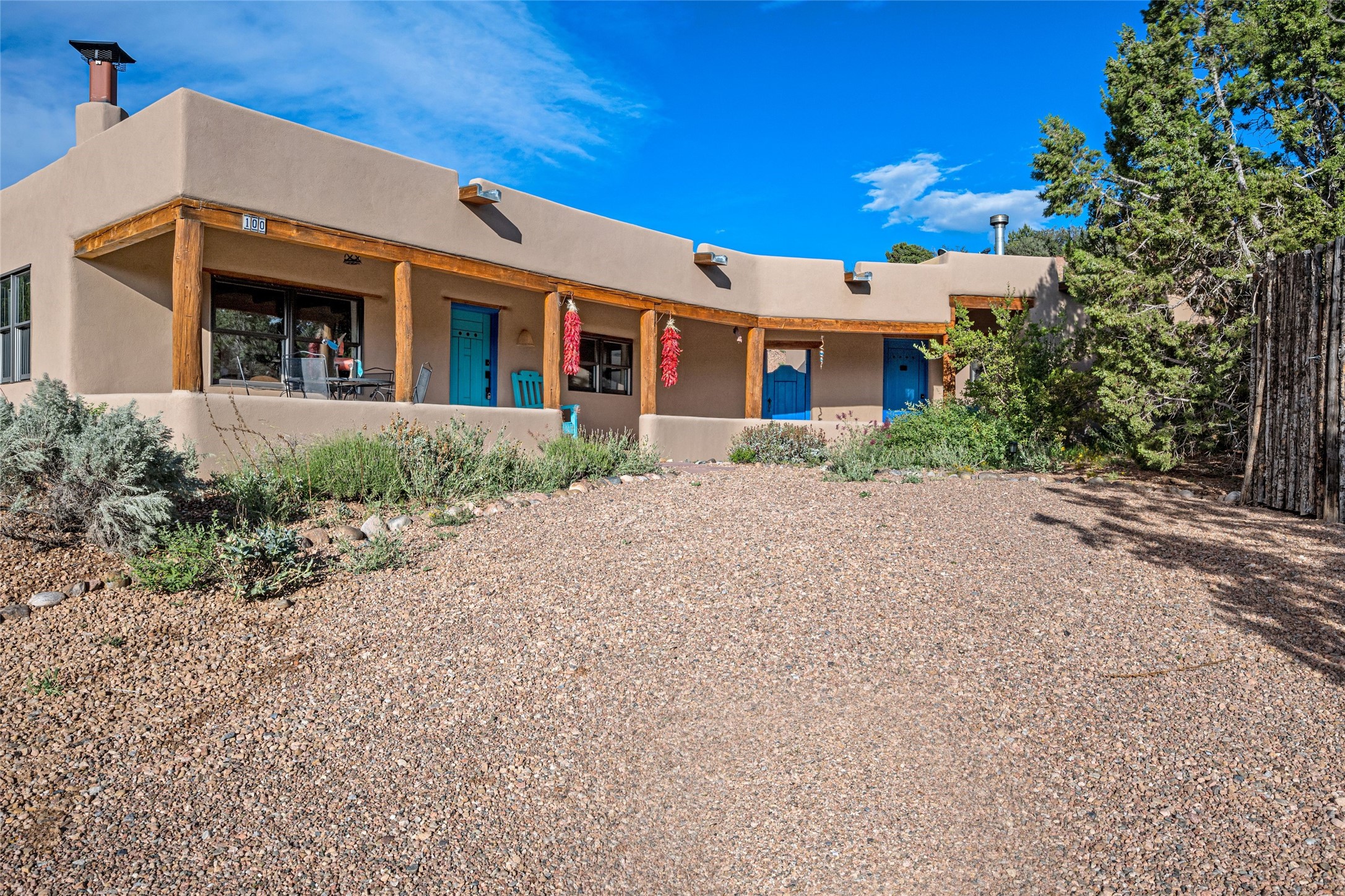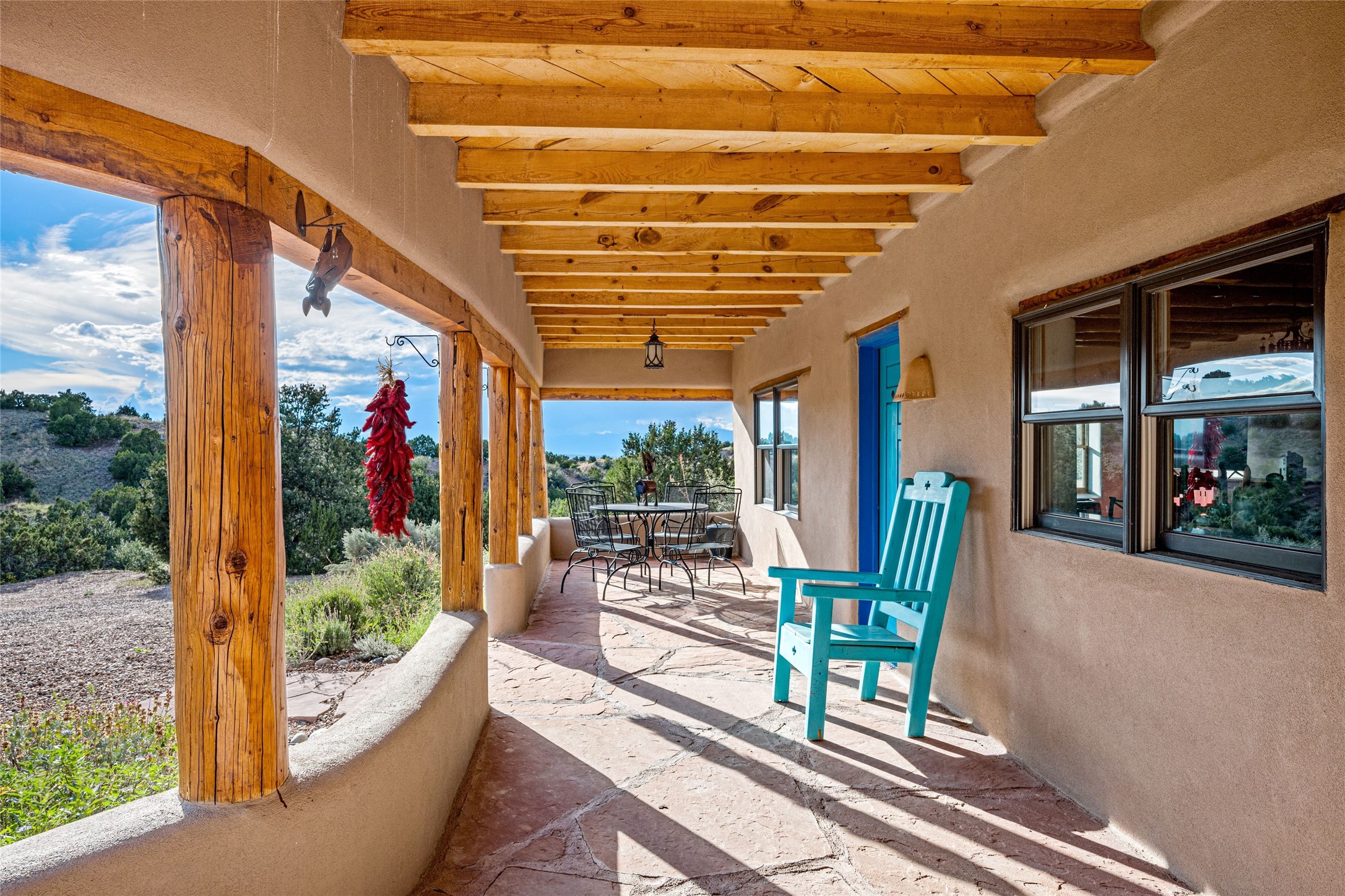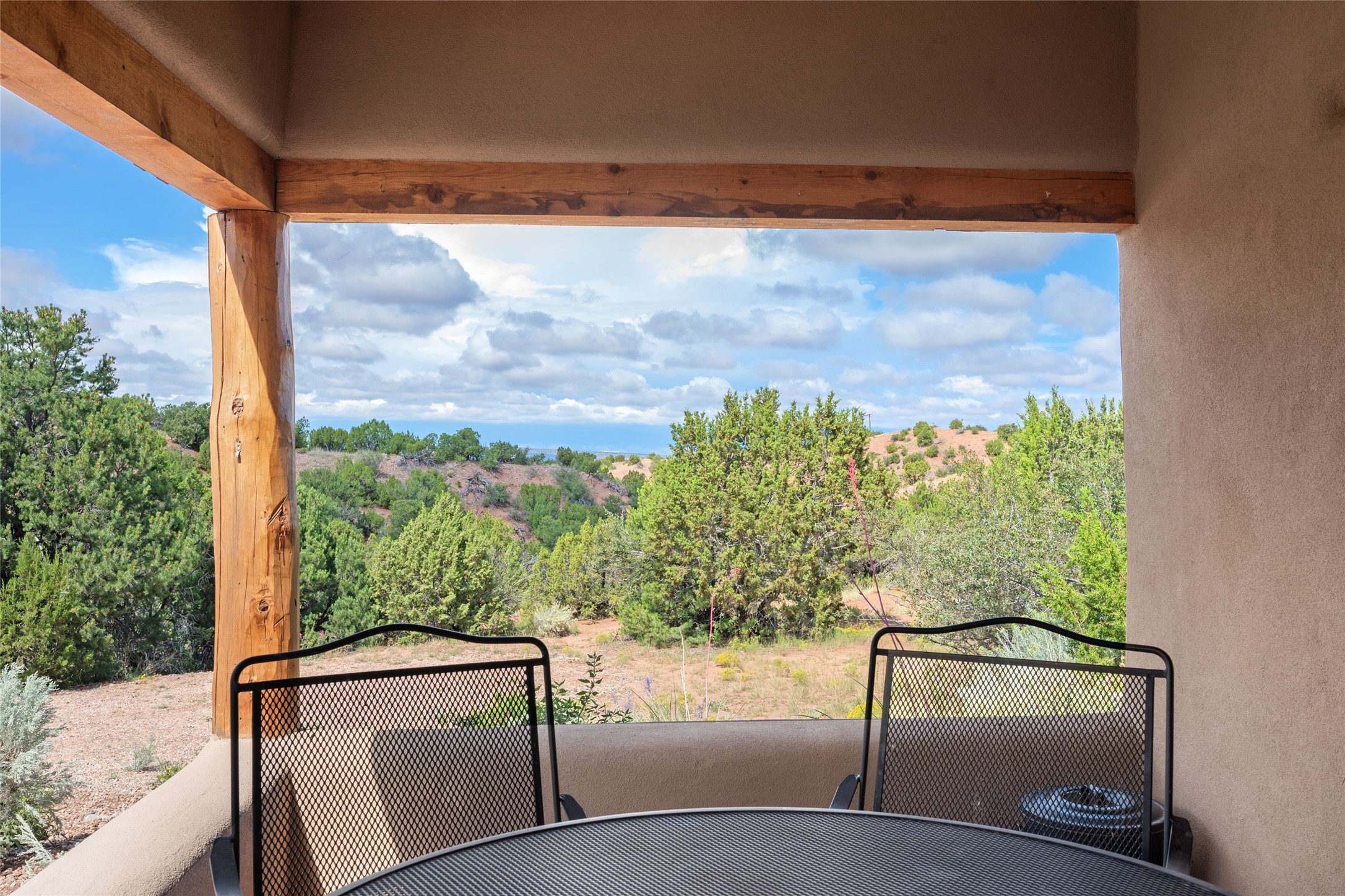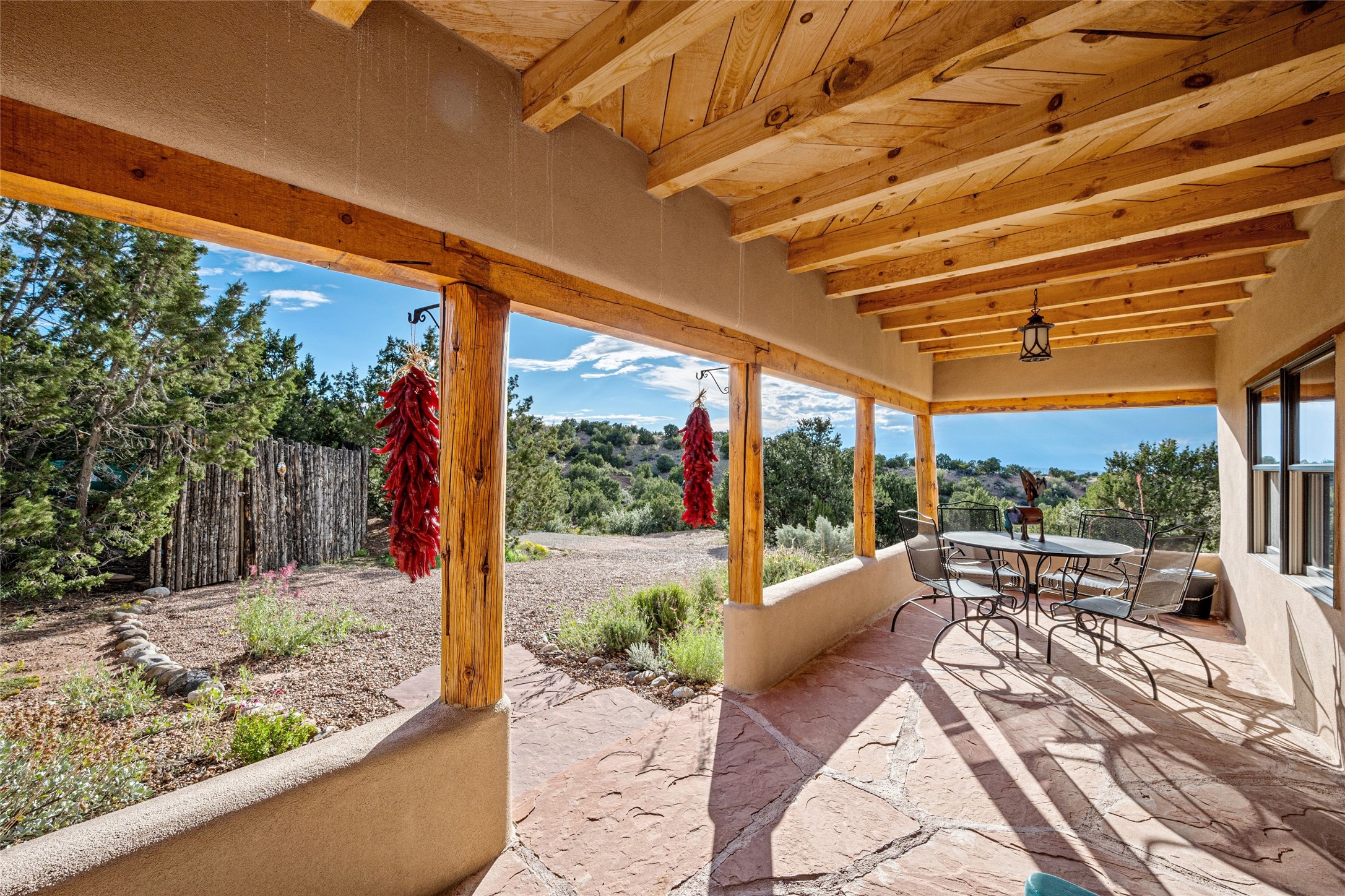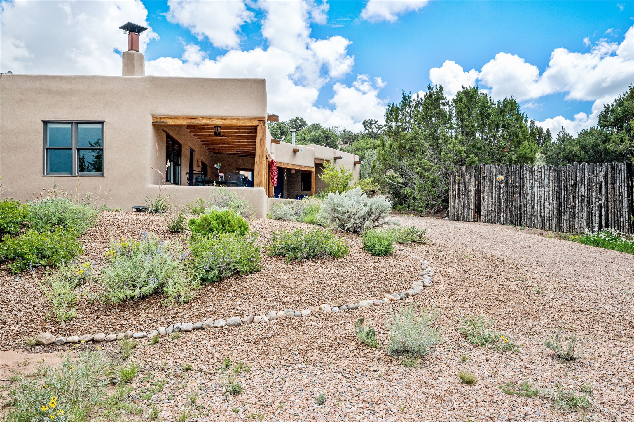 Turnkey house and guesthouse in Tesuque with furniture package (a few exclusions apply), so you can start living the Santa Fe dream now! Full of Santa Fe character, the main residence highlights vigas, beams, and a wood-burning fireplace that sets a warm and inviting tone. Built in 1997, the 1,312 sq. ft. single-level home offers 2 bedrooms and 2 baths. A 288 sq. ft. guest house adds an additional 1 bedroom and 1 bath, bringing total living space to 1,600 sq. ft. Recent improvements include a brand-new driveway, a private well with a new pump and control panel, a new boiler, and fresh stucco finish. The property also features baseboard electric heating, evaporative central cooling, and a gated driveway for added privacy and security. Surrounded by natural beauty, this 5-acre retreat offers peace, quiet, abundant wildlife, and stunning sunset views over the Jemez Mountains. Just 20 minutes to the historic Plaza and close to the Four Seasons, it's the perfect blend of seclusion and convenience--an exceptional chance to enjoy the best of Tesuque living.