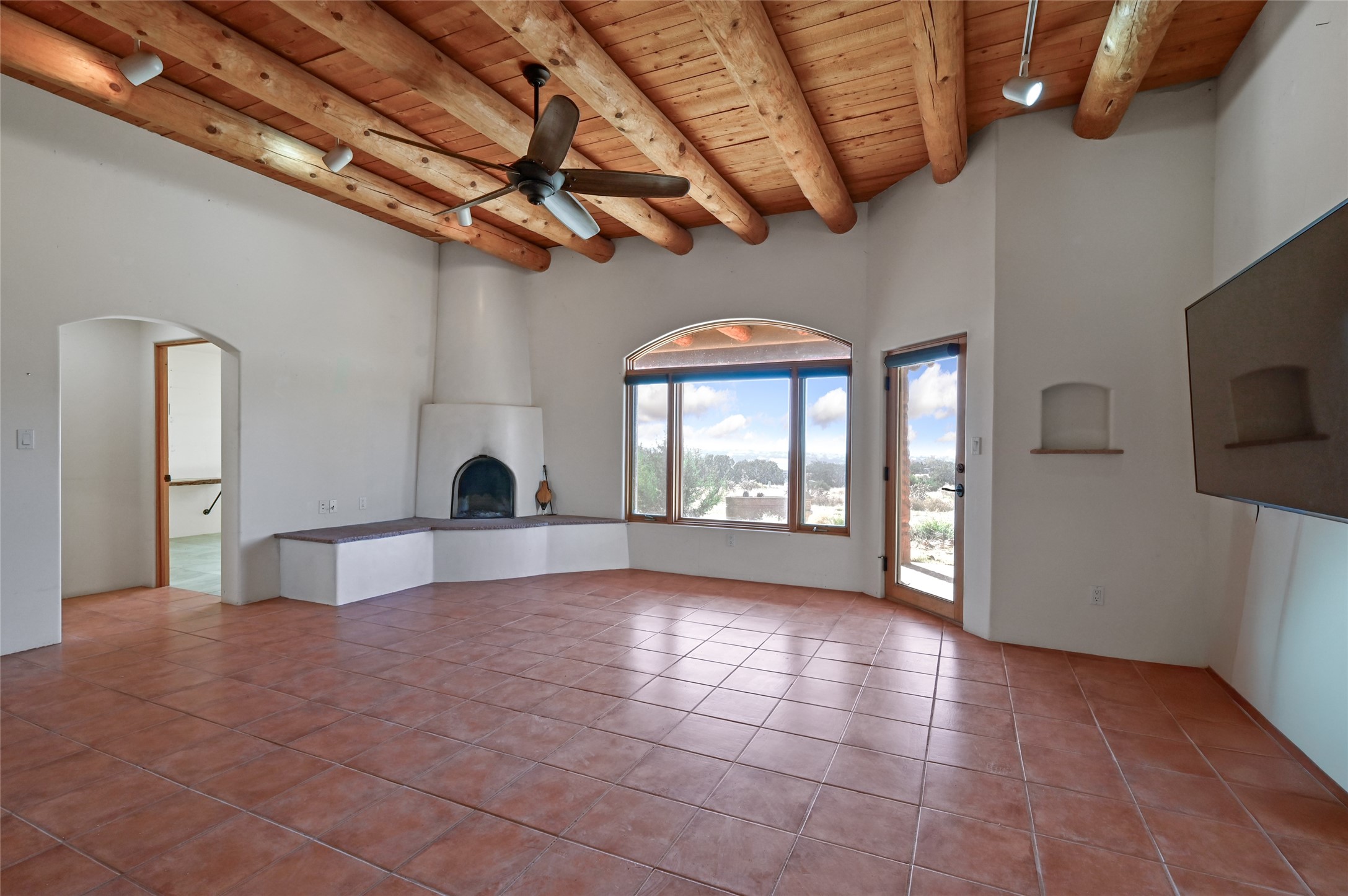 Desirable Eldorado location with stunning Sangre de Cristo and Sandia Mountain views! Set on almost two acres, this beautiful home offers the perfect balance of rural serenity and easy access to Santa Fe's shops, dining, and amenities. Featuring viga ceilings, a very large open floor plan, and generously sized rooms throughout, the home combines spaciousness with classic Santa Fe charm. The flexible layout includes three ensuite bedrooms, four bathrooms, plus an office, ideal for guests, family, or a home workspace. Numerous recent upgrades include the kitchen, bathrooms, well equipment, and roof, providing modern comfort and peace of mind. The modern eat-in kitchen opens to bright living areas accented by wood vigas and a kiva fireplace. Enjoy in-floor radiant heat and take in the expansive mountain views from the covered portal, perfect for outdoor dining or quiet evenings. A two-car garage and workshop/artist studio offer ample space for projects and storage. With breathtaking views, thoughtful upgrades, and an unbeatable Eldorado setting, this home truly has it all--space, style, and comfort in every detail.