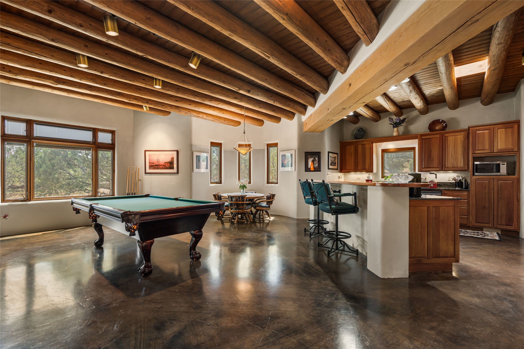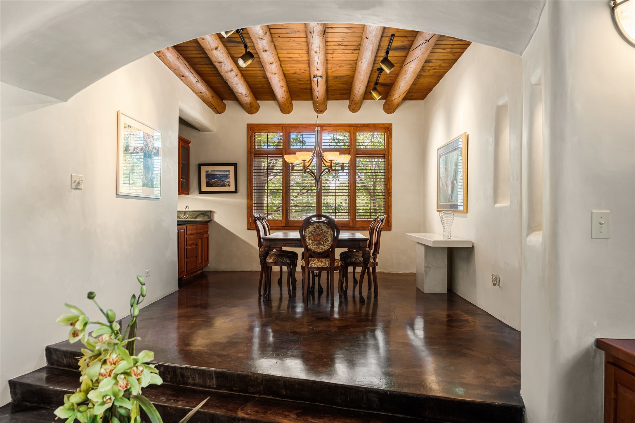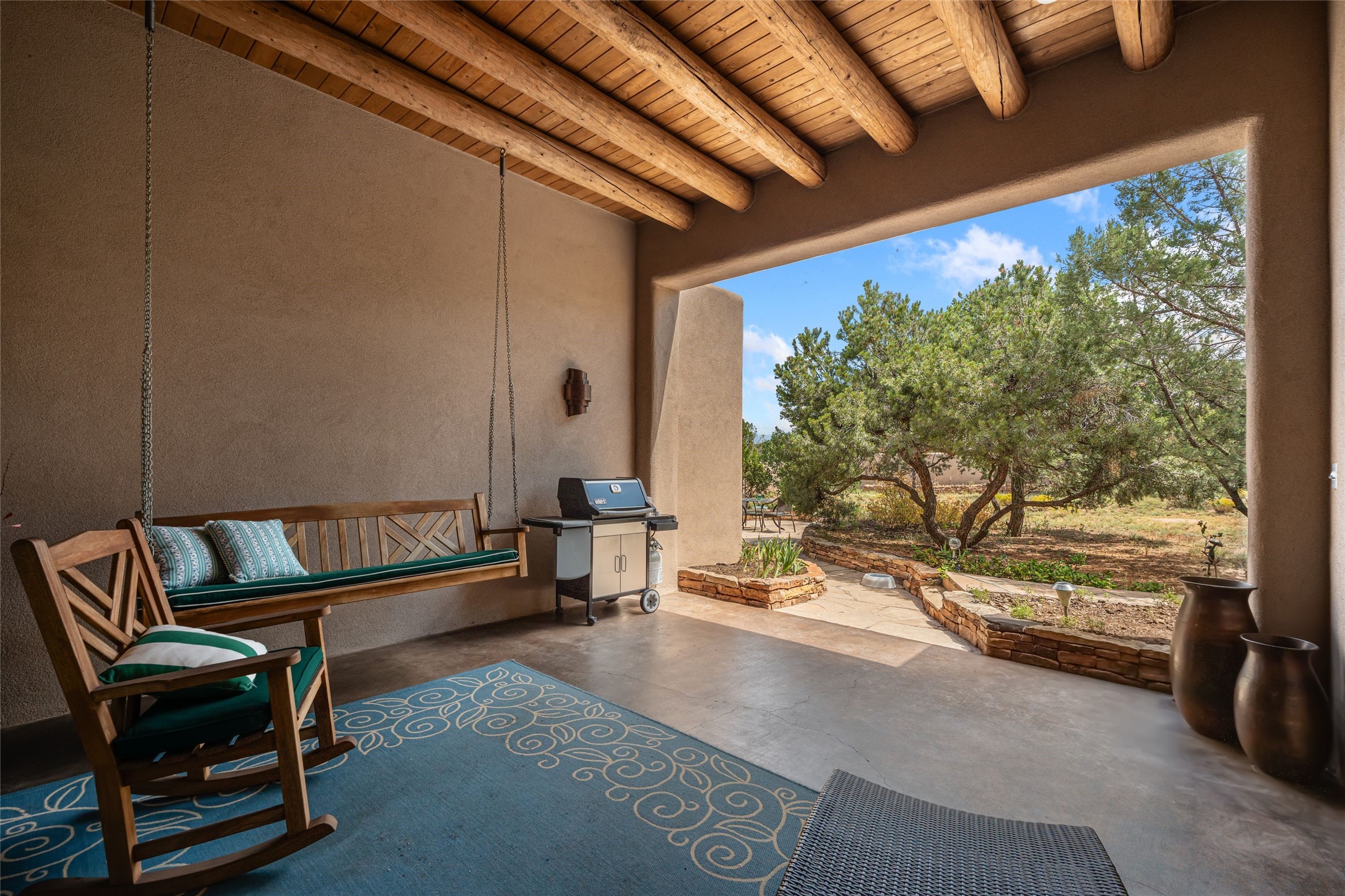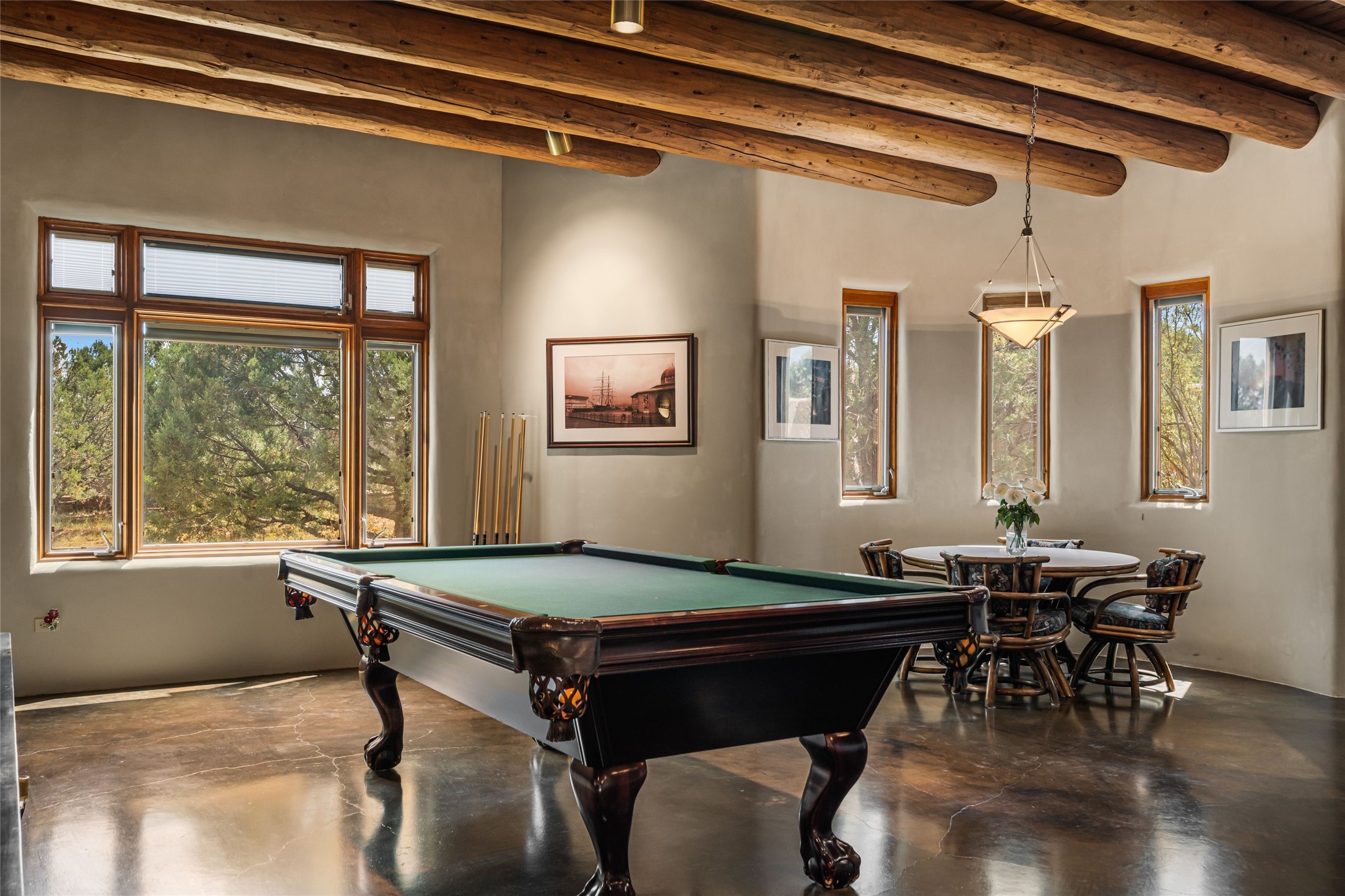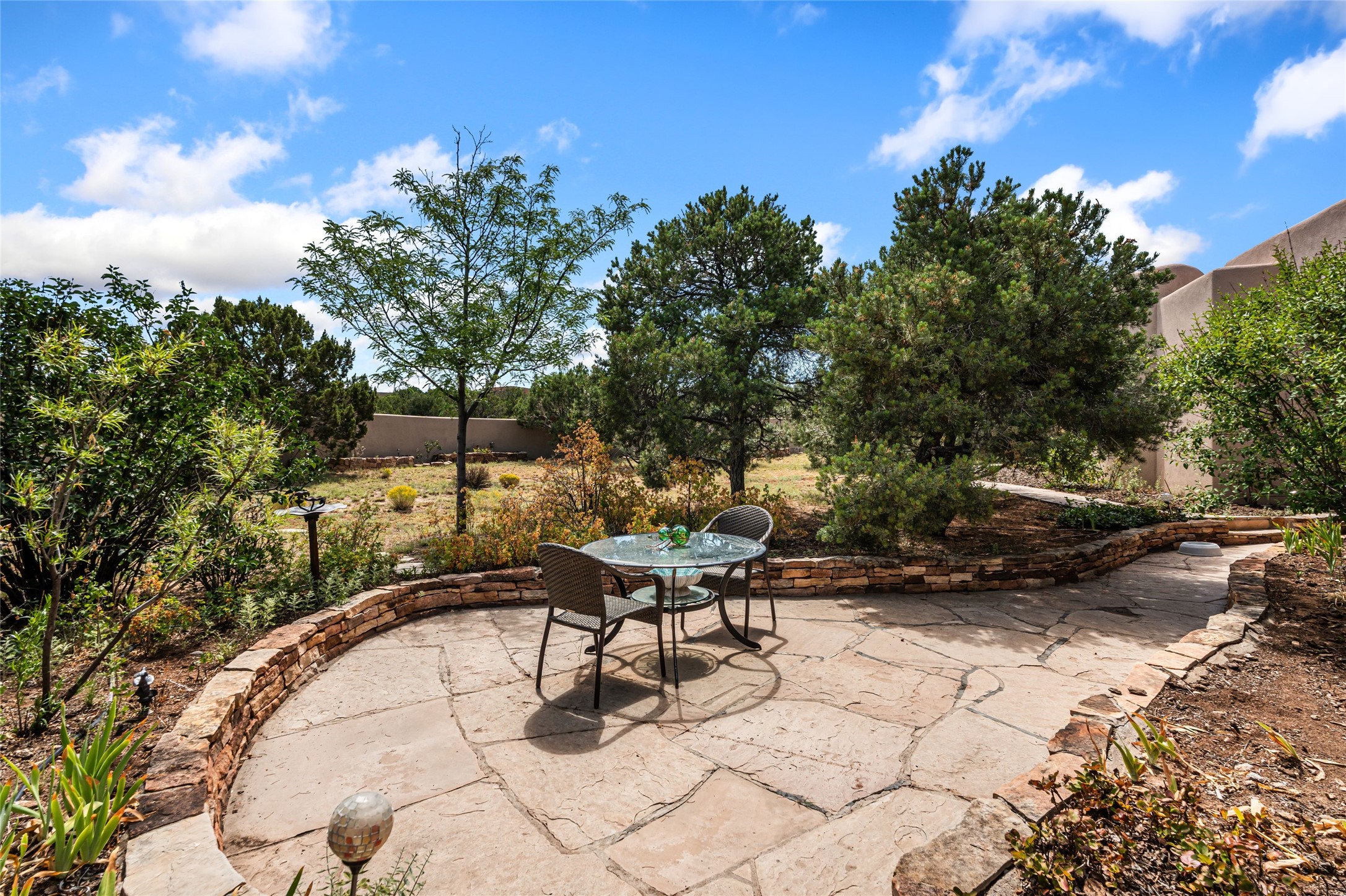 Welcome to 4 Astor, an elegant 3-bedroom, 3-bath home in the prestigious Las Campanas community of Santa Fe. Set on 1.72 acres, this 3,358 sq. ft. residence blends refined design with comfortable living, offering spacious interiors and timeless Southwestern style. Beautiful diamond plaster walls, elegant concrete floors, and lovely hall archways add warmth and sophistication throughout. Built with 12-inch Rastra construction, the home offers exceptional efficiency and durability, keeping it cool in summer and warm in winter. A 3-car garage provides plenty of room for vehicles, storage, or a workshop.Living in Las Campanas means enjoying world-class amenities, including a clubhouse, fitness center, gated security, horse facilities, jogging paths, playground, pool, sauna, spa, and tennis courts. Whether you're looking for an active lifestyle or a serene retreat, this property delivers the best of both worlds.