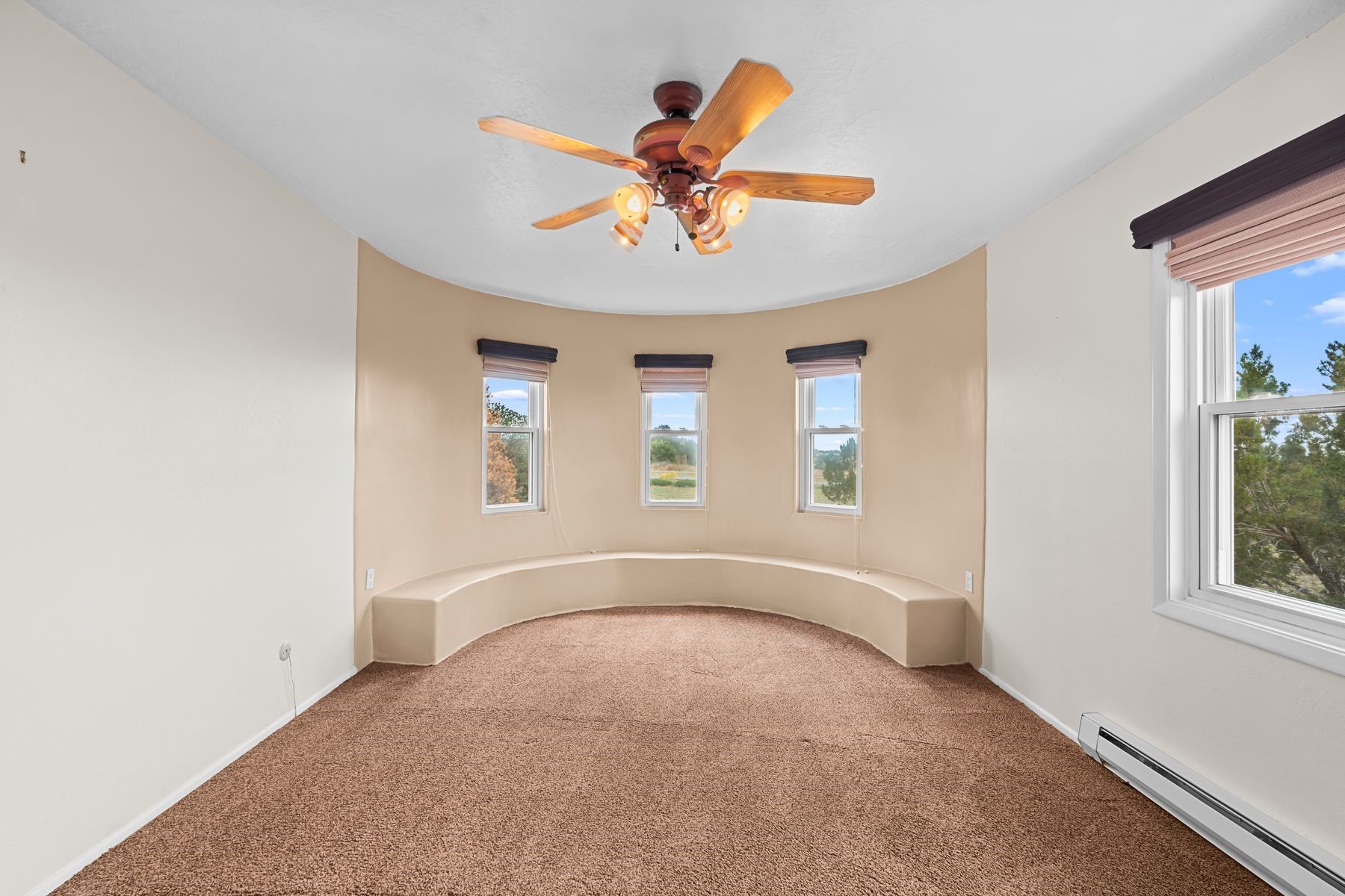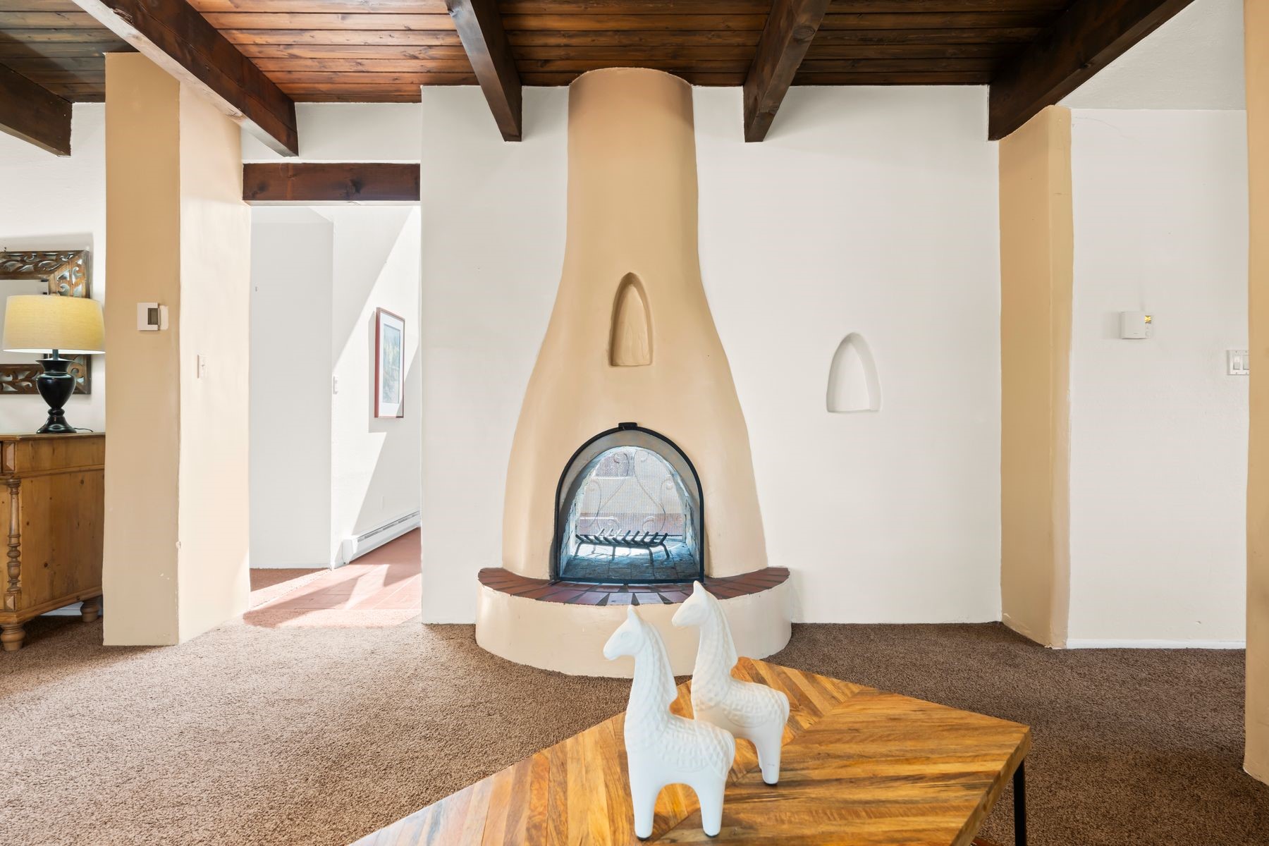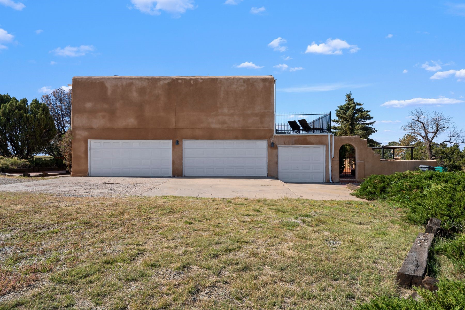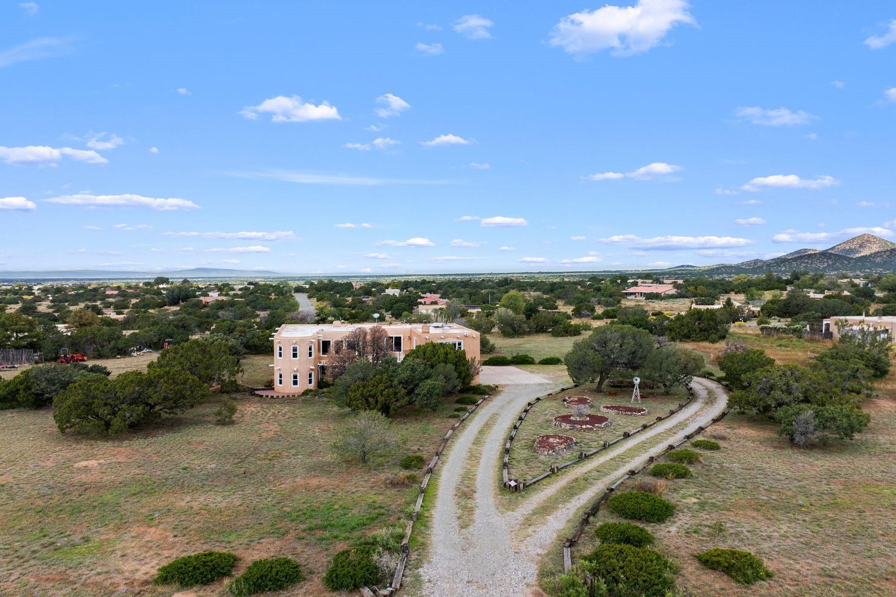 Discover the creative potential of this Pueblo Revival home in Eldorado -- a sought-after Santa Fe community known for its trail network, community amenities, and easy access to I-25 and downtown. Set on a flat, private 1.65-acre lot just 15 minutes from Santa Fe's historic Plaza, this spacious 4-bedroom, 4-bathroom, 3,758 square foot two-story residence blends Southwestern character with abundant flexible space, ideal for artists, hobbyists, or anyone seeking room to live, work, and create. A dramatic entry welcomes you into a spacious living room with dual-sided kiva fireplace that flows into a flex space and sunroom opening to a secluded walled patio with Sangre de Cristo mountain views. The kitchen features quartz countertops, dual ovens, custom cabinetry, and a generous dining area, while brick and tile floors, banco seating, custom kachina-painted doors, and beamed ceilings add timeless style. Upstairs are four bedrooms with walk-in closets, including a large primary suite with two decks, dual baths, bonus room, and a second fireplace. A main-level bonus room off the oversized five-car garage offers additional options for a studio, workshop, or gym. Additional highlights include skylights, a greenhouse with hot tub, storage shed, and private outdoor living spaces ideal for sunrise and sunset views. The level acreage offers space for future gardens, with community trails and Santa Fe Rail Trail access just steps away. Eldorado's community center with pool, tennis courts, stables, shopping, and Eldorado Community School are minutes from your door, while downtown Santa Fe, medical centers, and galleries are a short drive away. This versatile property offers rare space, privacy, and flexibility in one of Santa Fe's most desirable communities -- a peaceful retreat that can evolve with your lifestyle and fuel your creative pursuits.