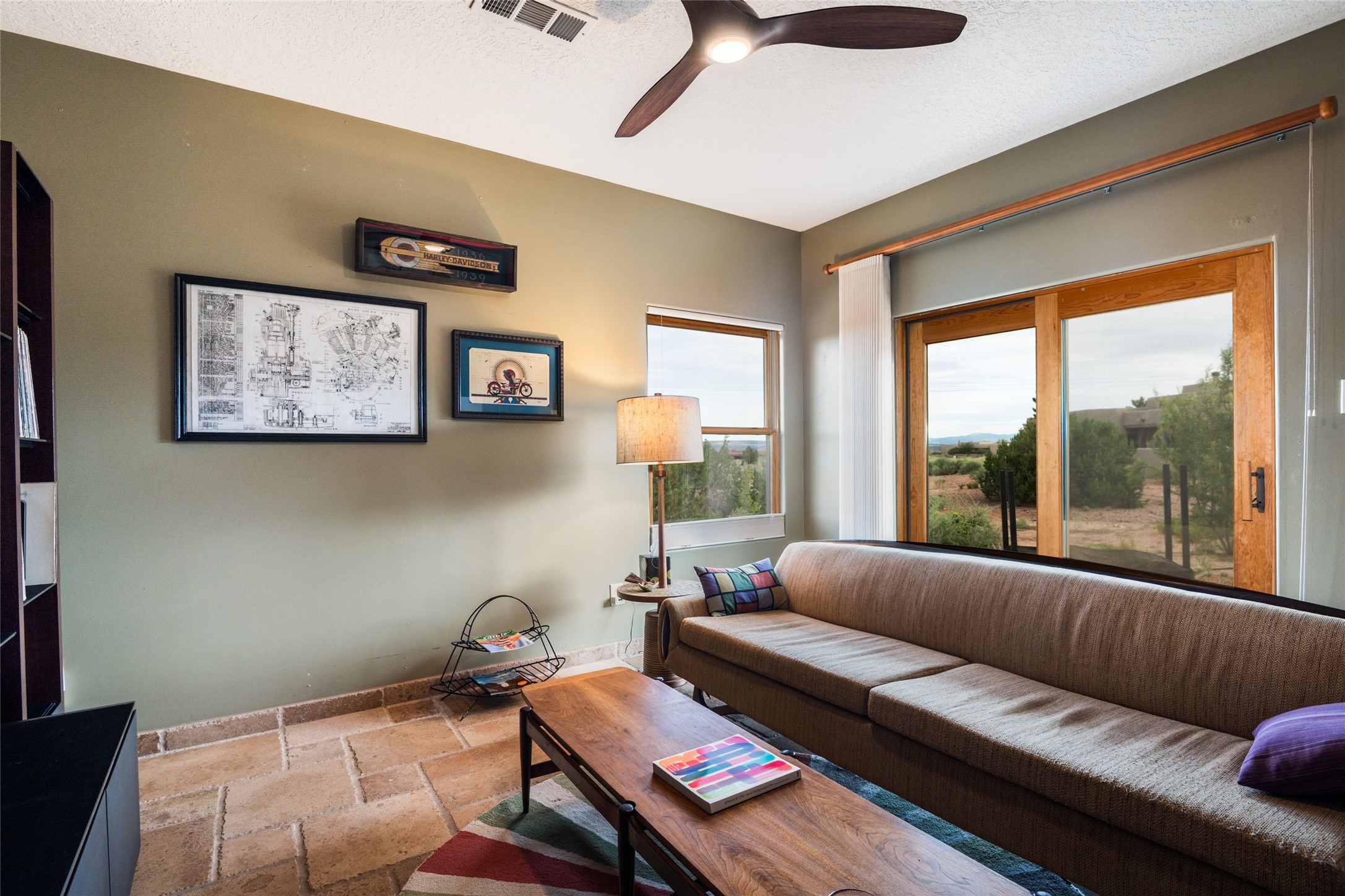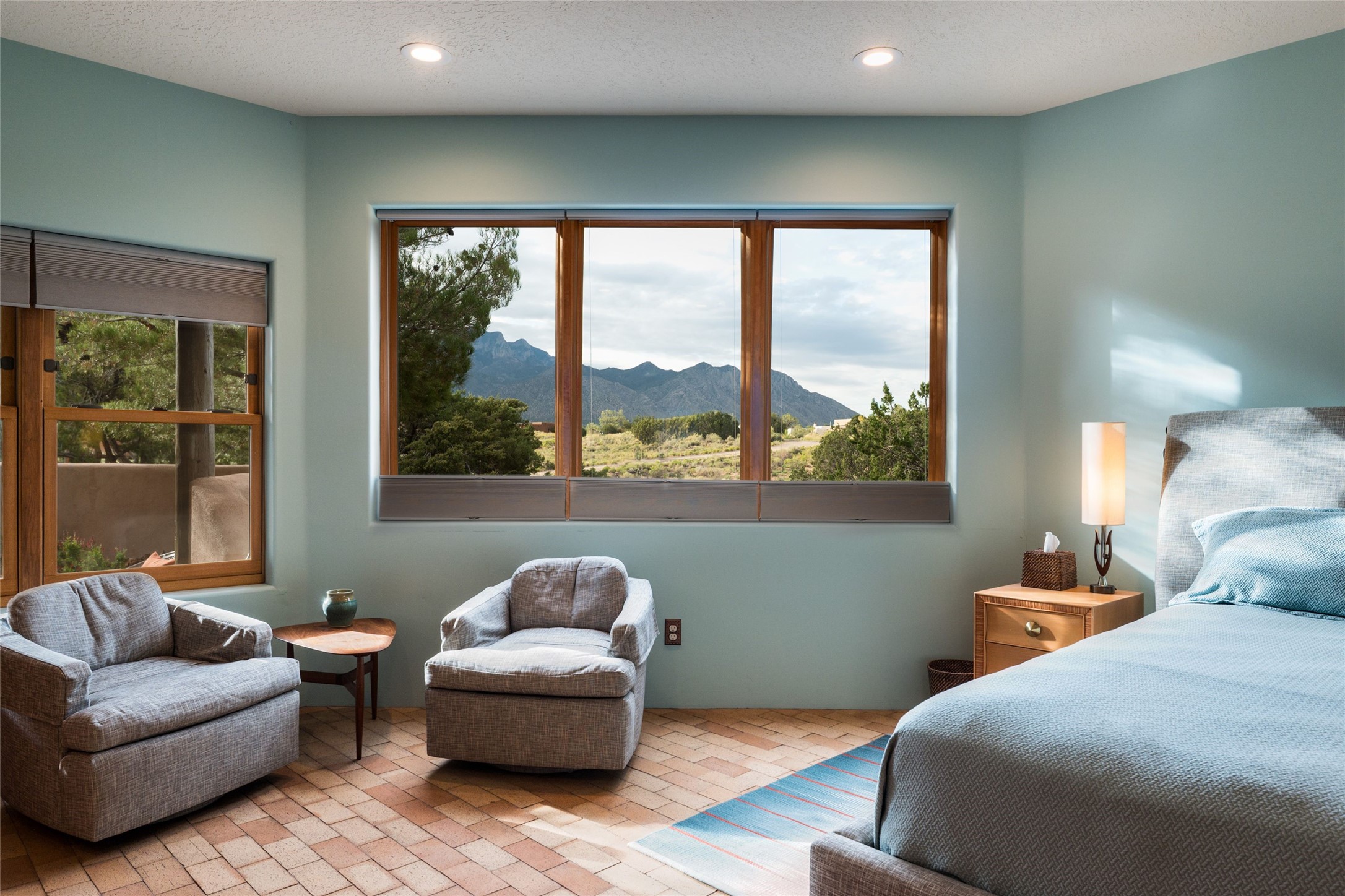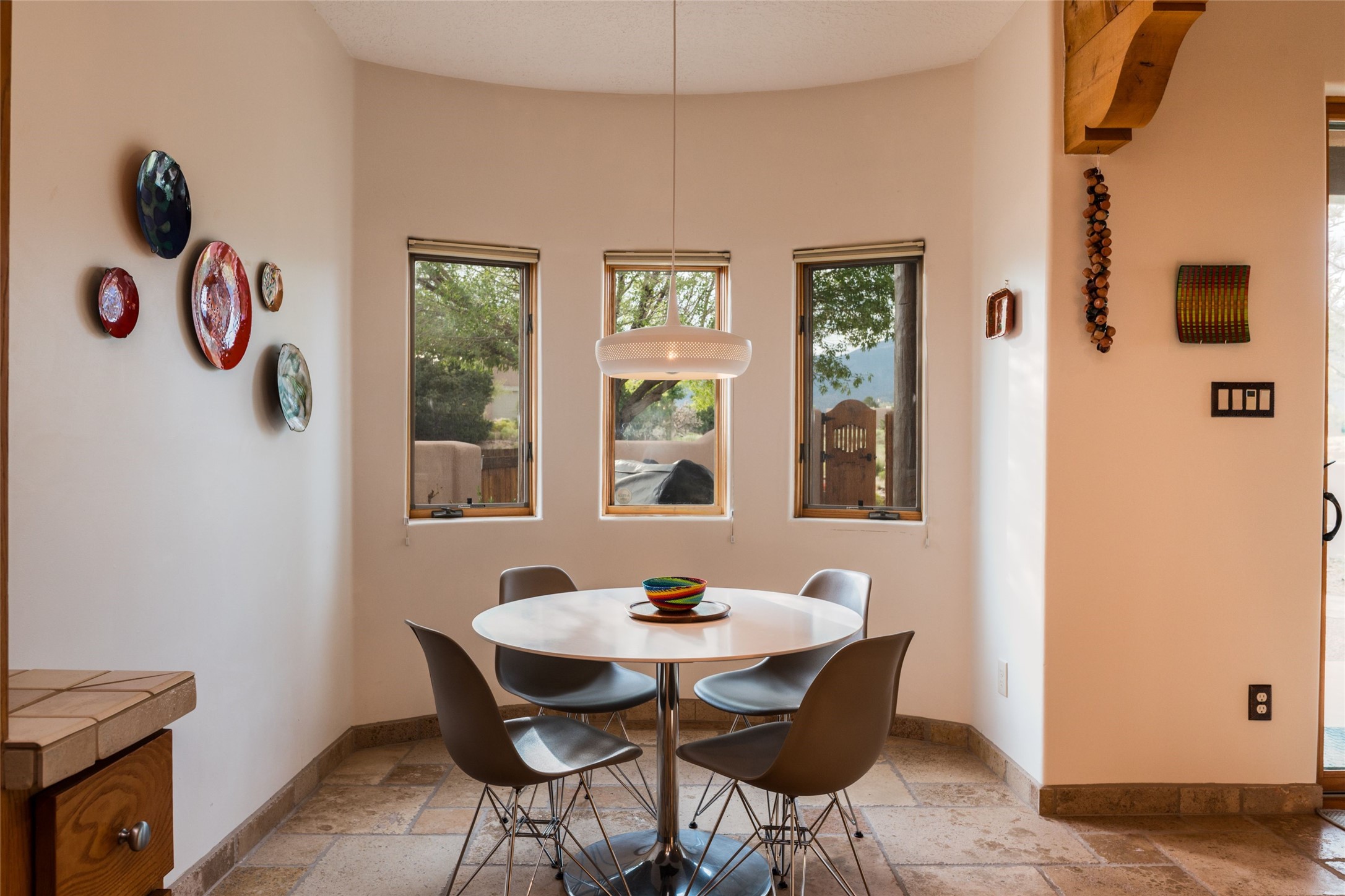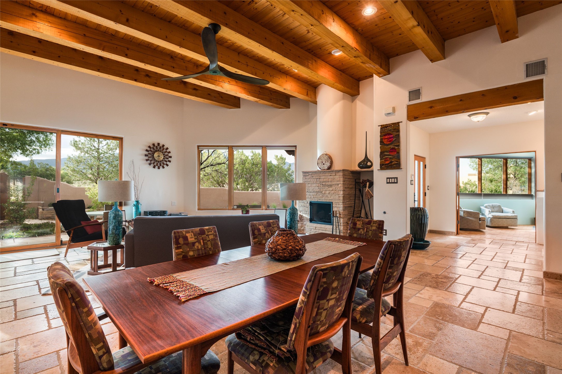 Discover the perfect Placitas home that offers peace, stunning views, charm, and an ideal location. This meticulously maintained single-level residence features 3 bedrooms and 2 bathrooms, with an updated kitchen including a Wolf cooktop. The spacious 3-car garage is ideal for parking or a workshop, and a separate 351 sq ft heated and cooled building provides versatile space as an office, studio, or craft room. Located at the end of a quiet road, it's just a 35-minute drive to Santa Fe, close to the RailRunner, grocery stores, golf, and amenities. The home boasts beautiful stone floors throughout, with brick flooring and a large walk-in closet in the primary suite. The landscaped front courtyard and covered patio offers breathtaking mountain views, perfect for relaxing and entertaining.