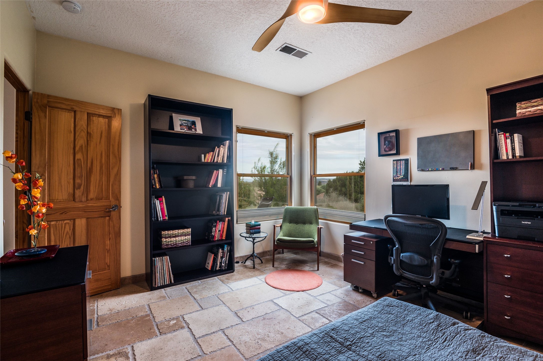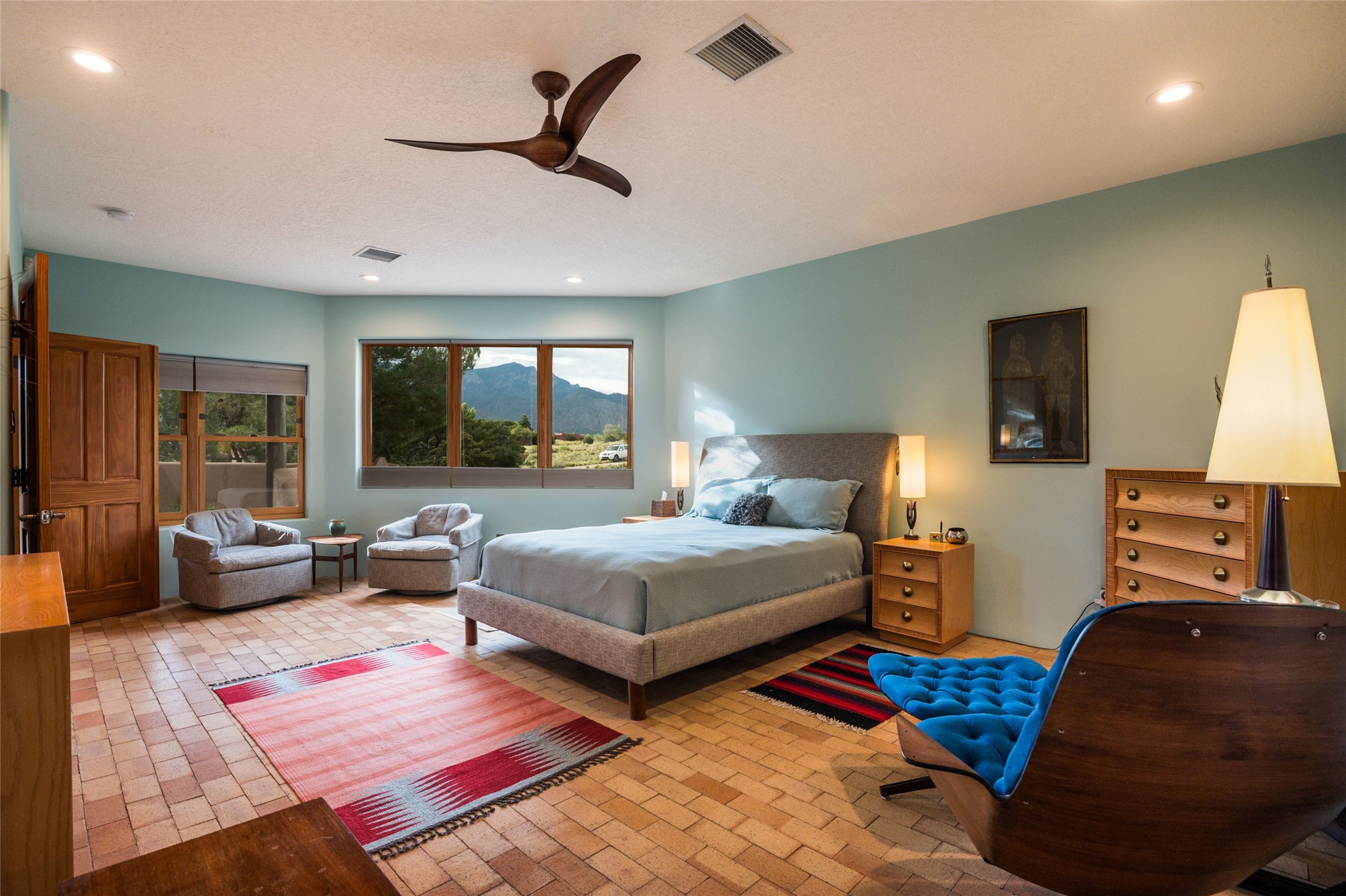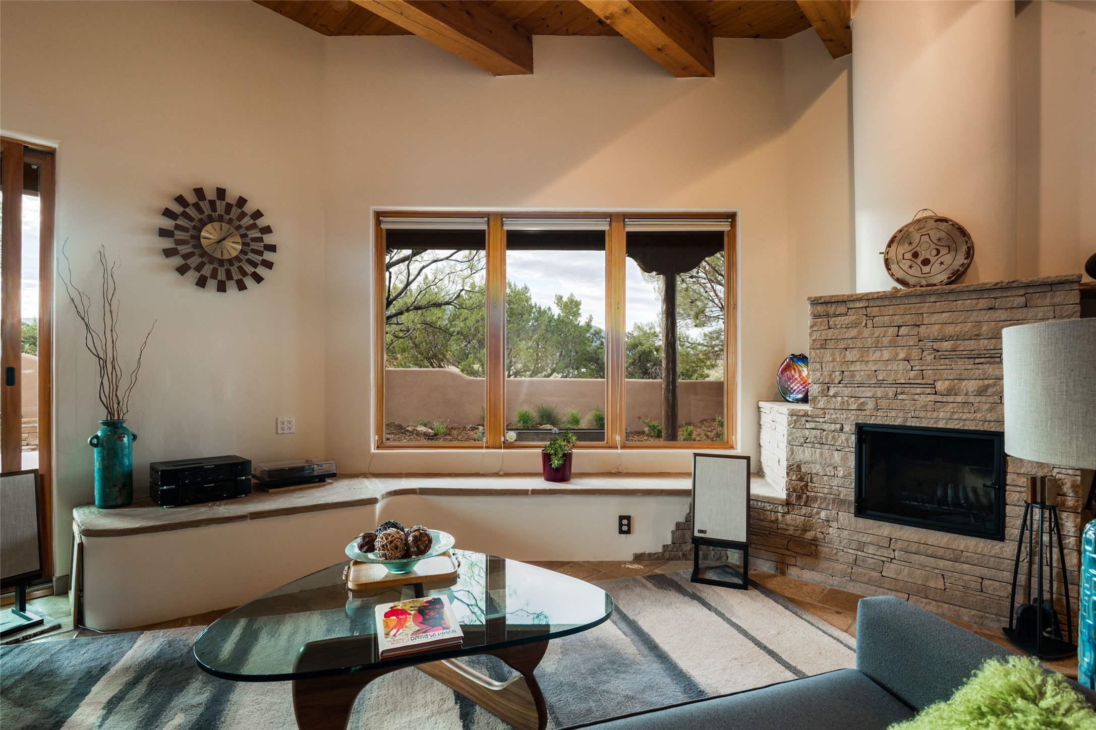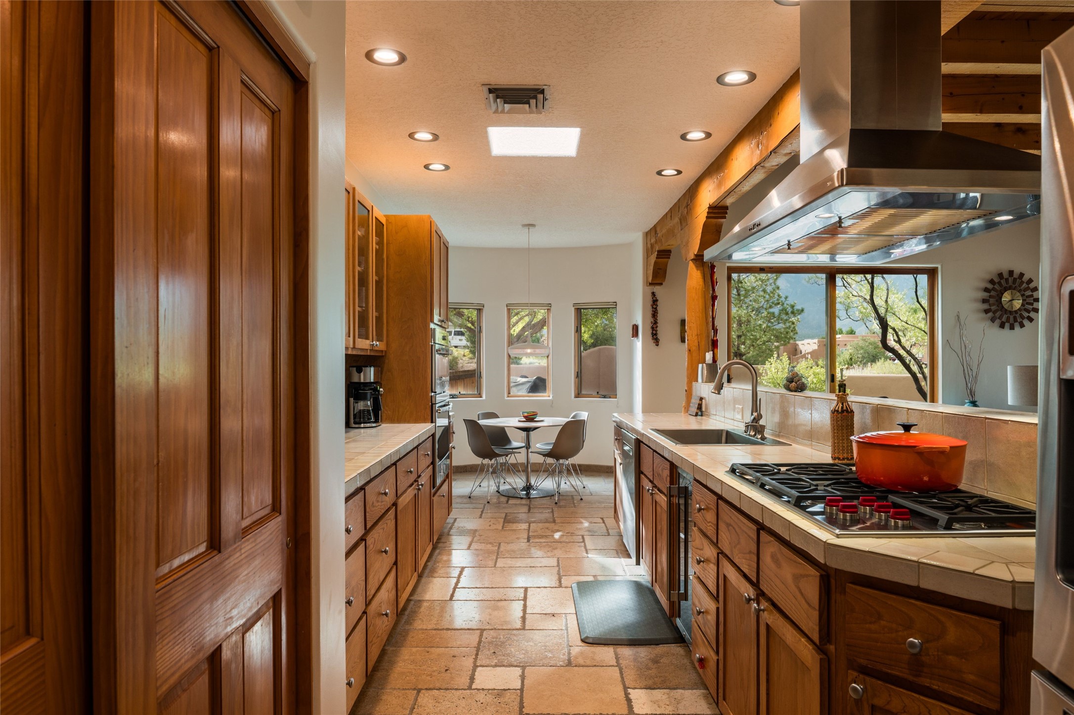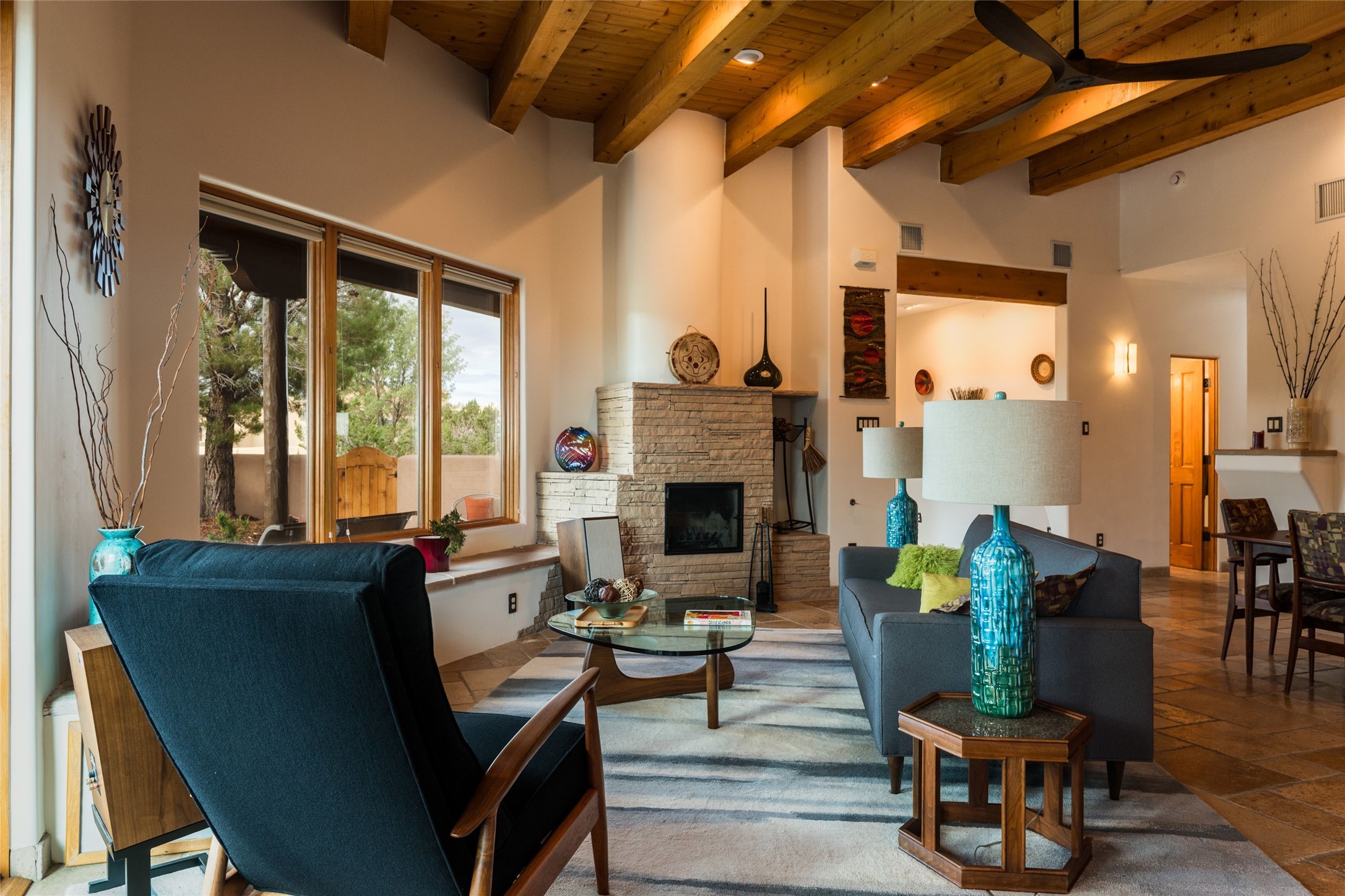 Discover the perfect Placitas home that offers peace, stunning views, charm, and an ideal location. This meticulously maintained single-level residence features 3 bedrooms and 2 bathrooms, with an updated kitchen including a Wolf cooktop. The spacious 3-car garage is ideal for parking or a workshop, and a separate 351 sq ft heated and cooled building provides versatile space as an office, studio, or craft room. Located at the end of a quiet road, it's just a 35-minute drive to Santa Fe, close to the RailRunner, grocery stores, golf, and amenities. The home boasts beautiful stone floors throughout, with brick flooring and a large walk-in closet in the primary suite. The landscaped front courtyard and covered patio offers breathtaking mountain views, perfect for relaxing and entertaining.