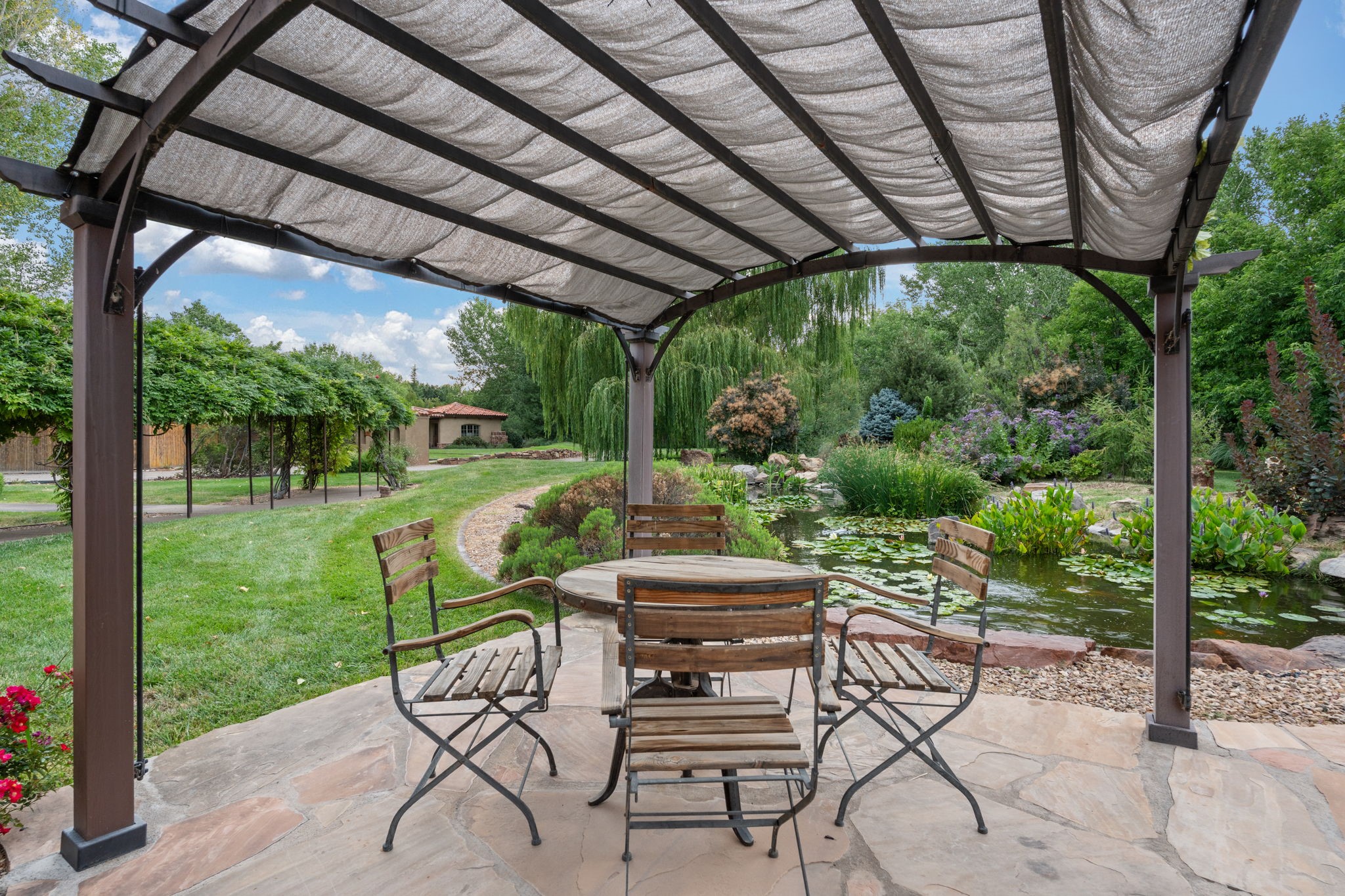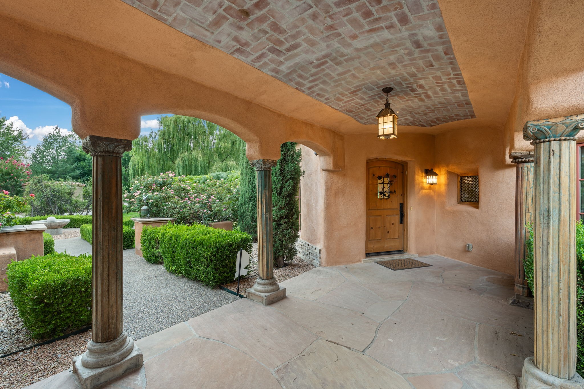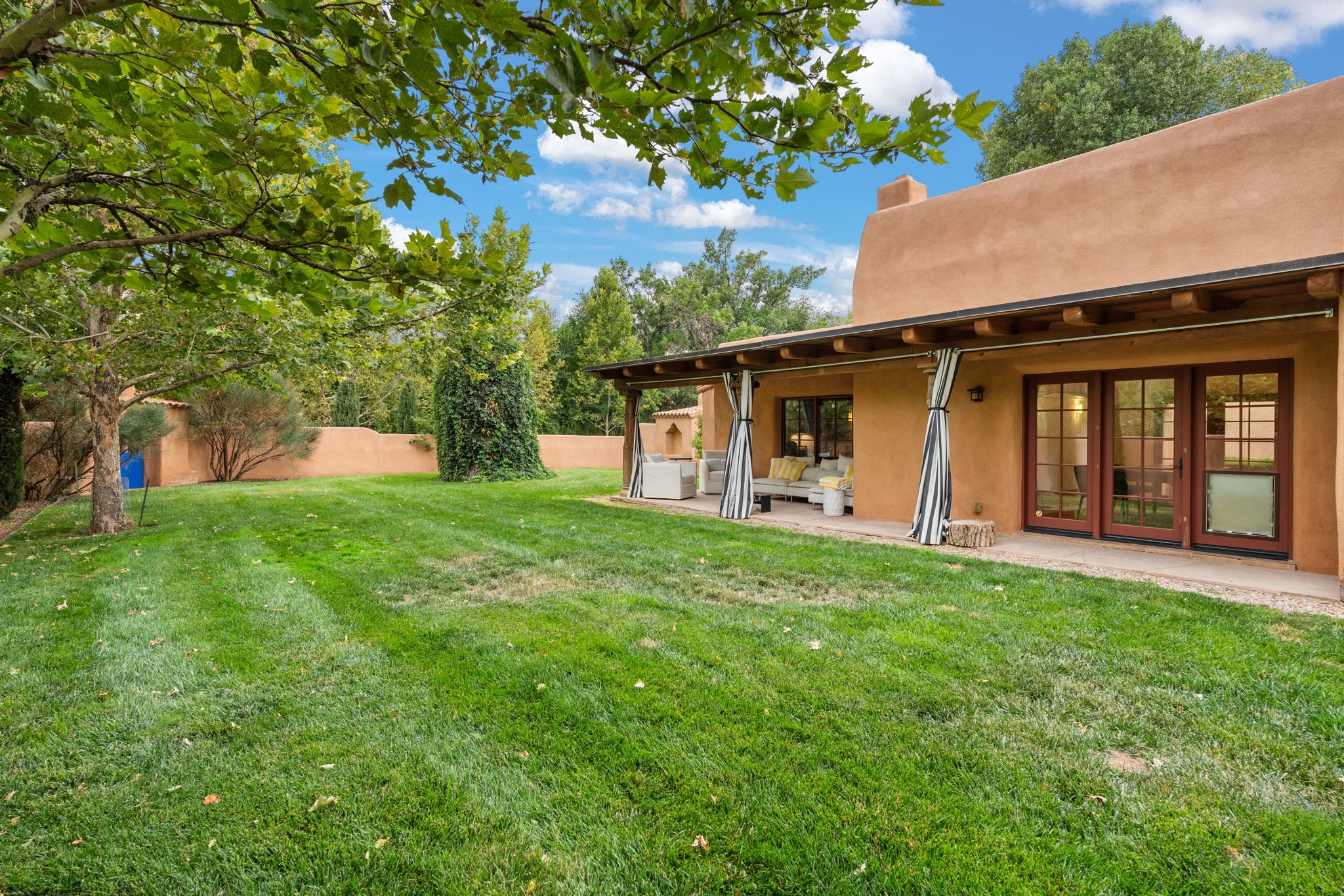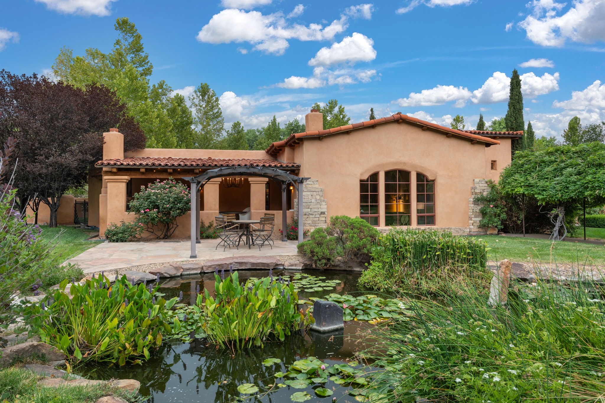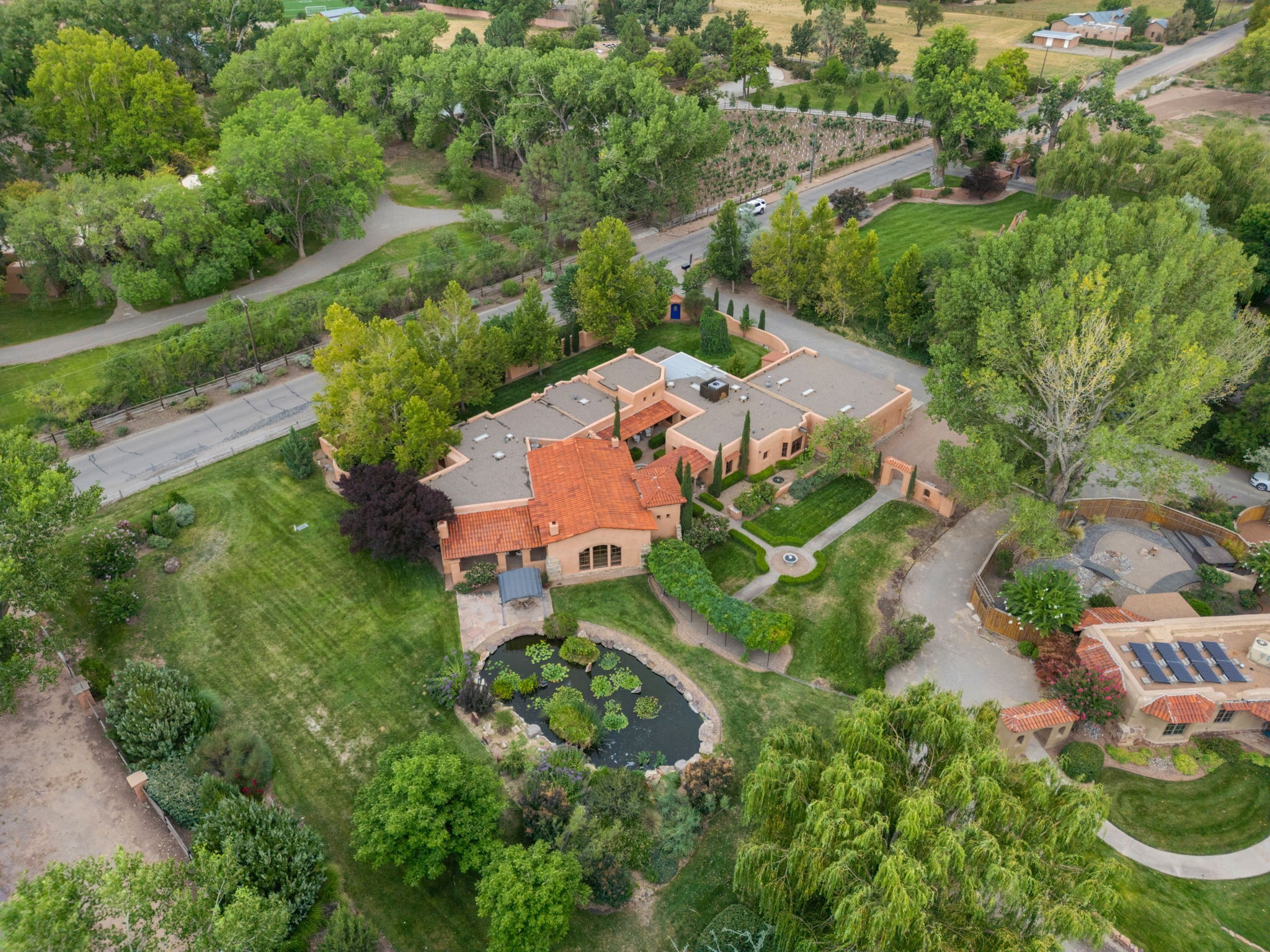 Gorgeous, peaceful, remarkable. A beautiful mediterranean adobe villa by John Calvin. Set in a lush and well-manicured setting on a very special street in the Village of Los Ranchos. Walk or ride your bike to Los Poblanos Historic Inn, Campo, Los Ranchos Growers Market, and much more. The home features a chef's kitchen, spacious en-suite bedrooms, stunning garden views from every window, and a large koi pond and a private irrigation well. Radiant heat, central AC, Wolf range, 5 fireplaces including an outdoor kiva, travertine floors, 3 Car garage. Separated & Quiet Master Suite. Kitchen features include Wolf range, subzero fridge, double-oven, wine cooler, & oversized island. Enjoy views of the gardens and landscaping from every room, with a walled backyard.