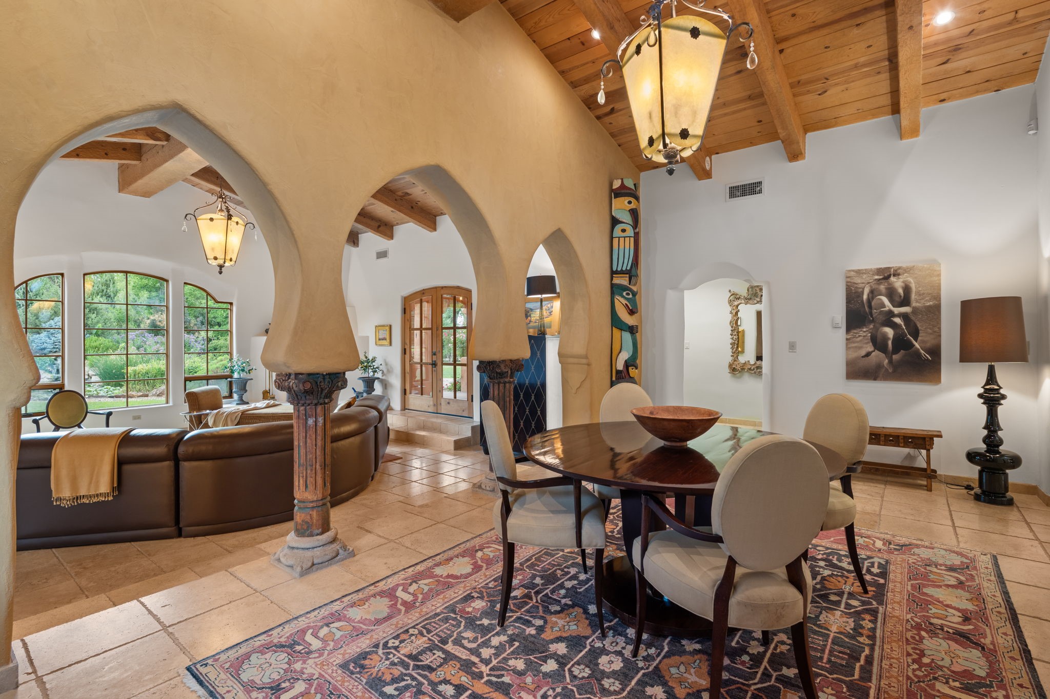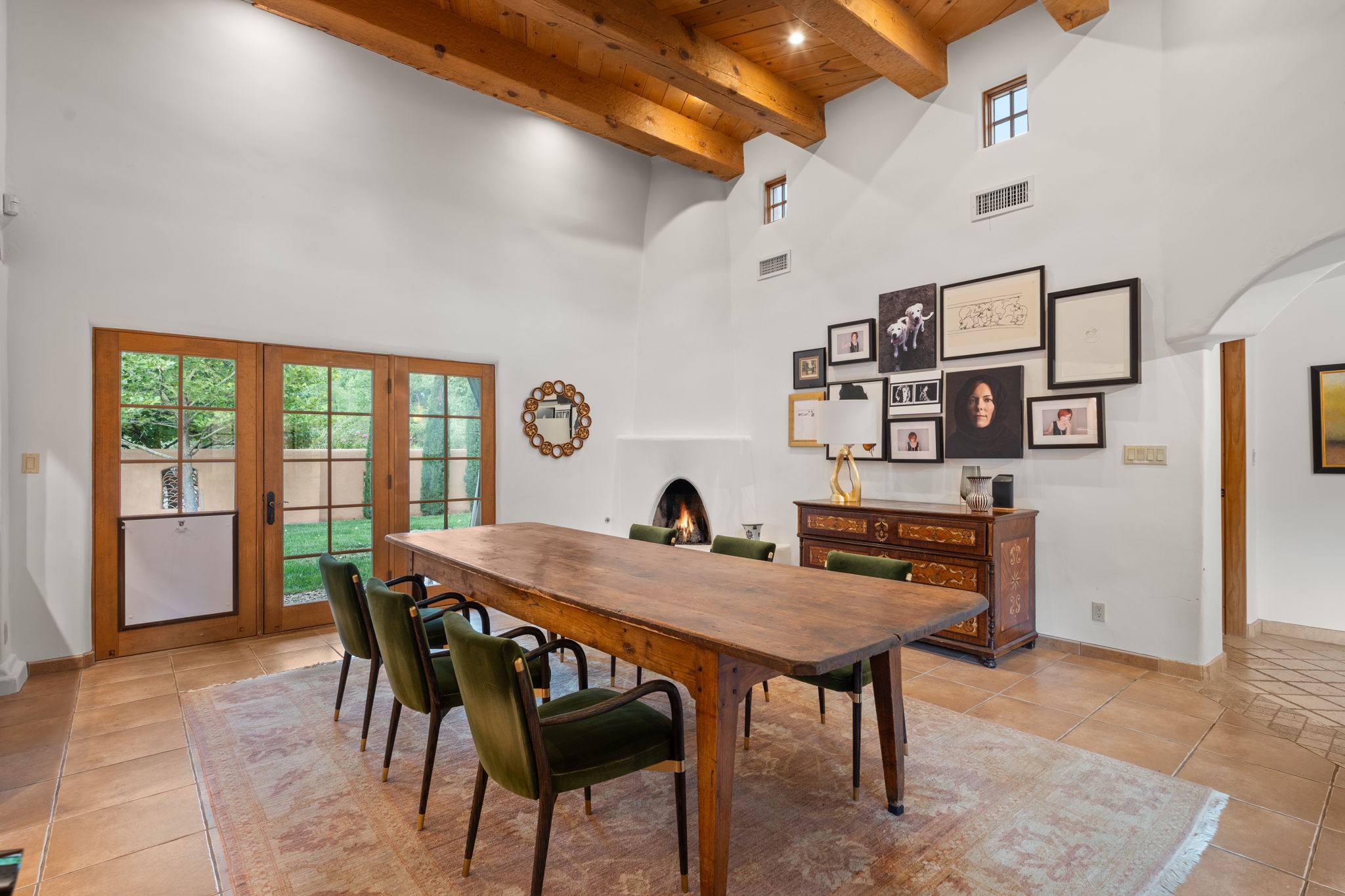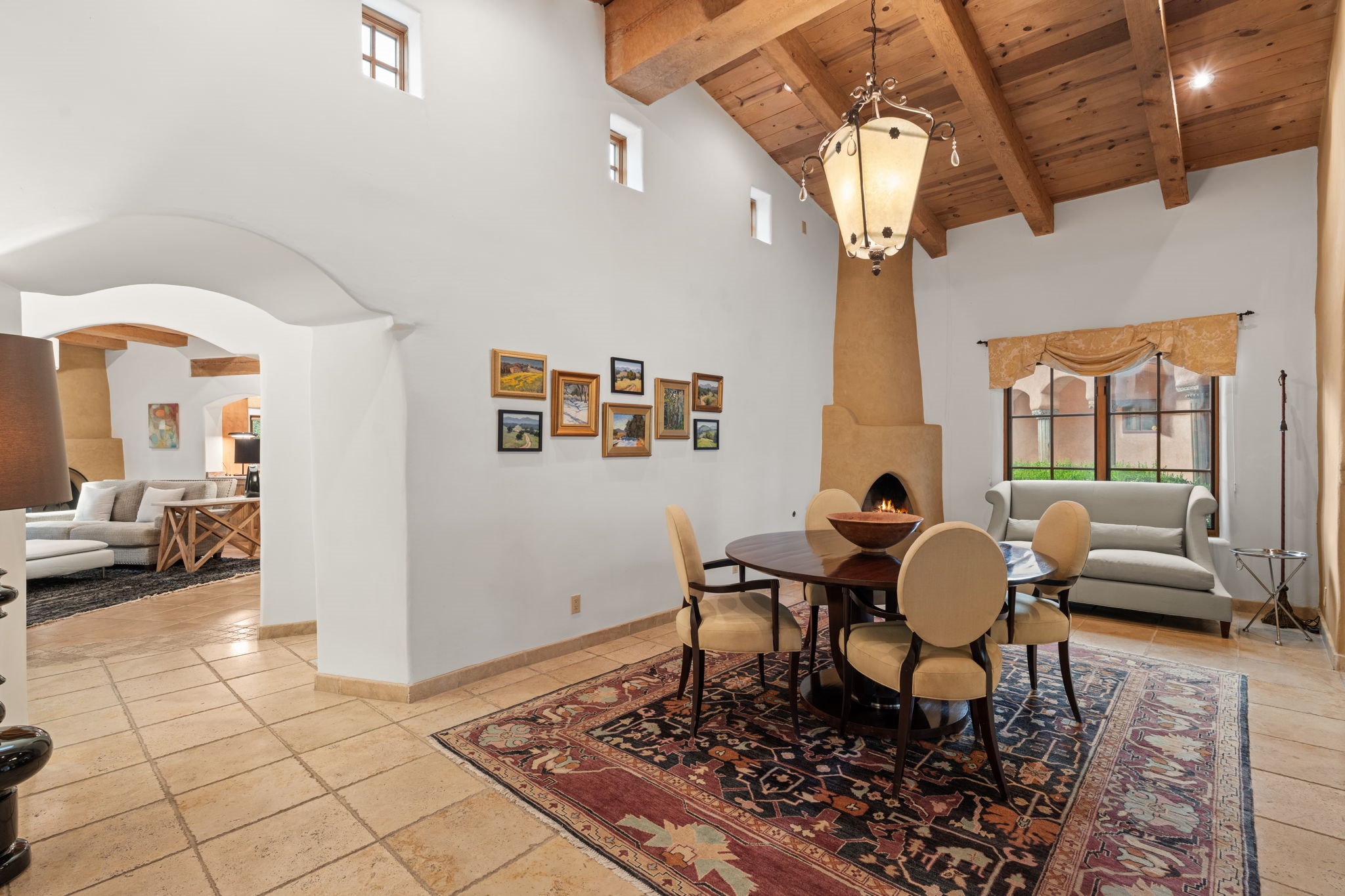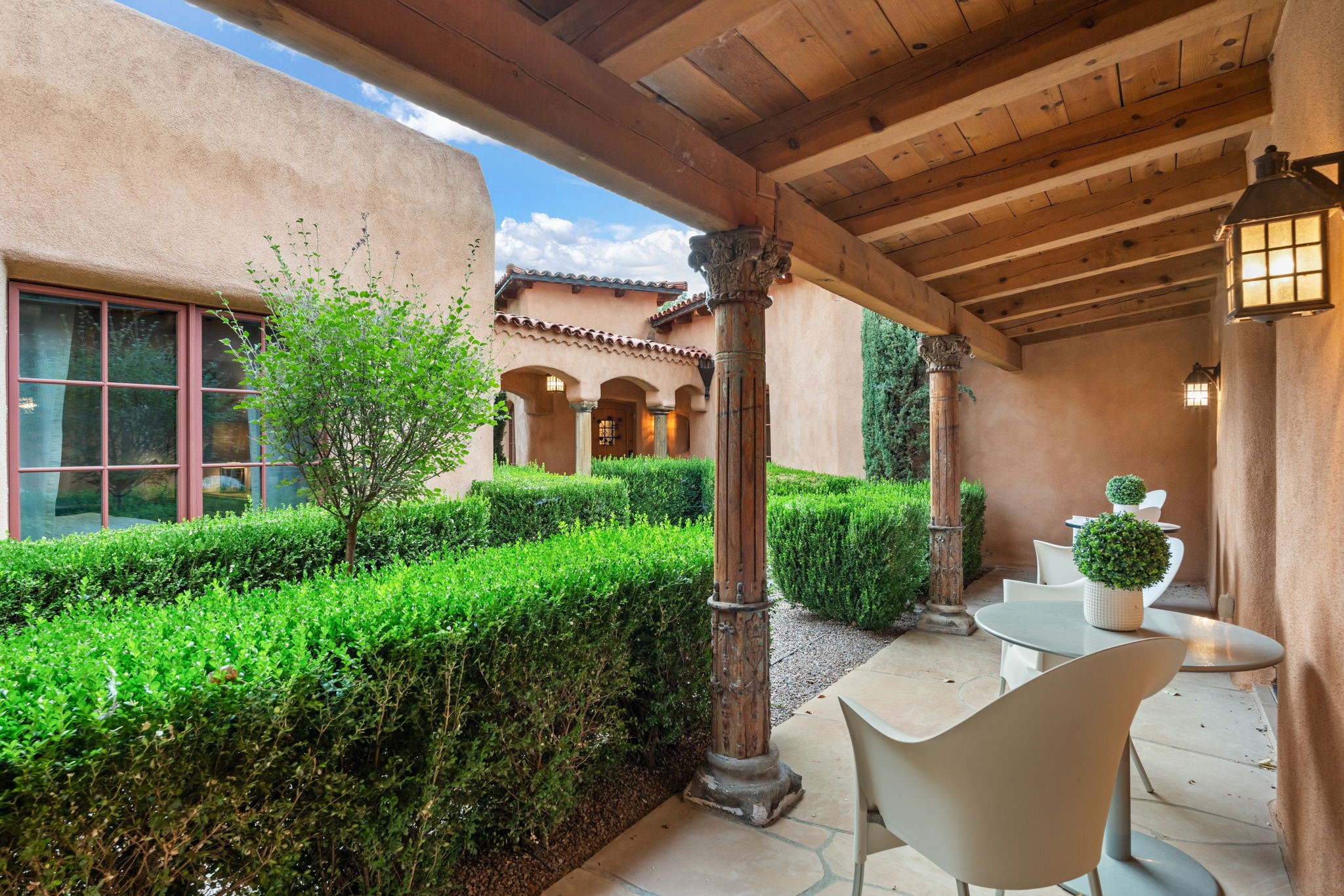 Gorgeous, peaceful, remarkable. A beautiful mediterranean adobe villa by John Calvin. Set in a lush and well-manicured setting on a very special street in the Village of Los Ranchos. Walk or ride your bike to Los Poblanos Historic Inn, Campo, Los Ranchos Growers Market, and much more. The home features a chef's kitchen, spacious en-suite bedrooms, stunning garden views from every window, and a large koi pond and a private irrigation well. Radiant heat, central AC, Wolf range, 5 fireplaces including an outdoor kiva, travertine floors, 3 Car garage. Separated & Quiet Master Suite. Kitchen features include Wolf range, subzero fridge, double-oven, wine cooler, & oversized island. Enjoy views of the gardens and landscaping from every room, with a walled backyard.