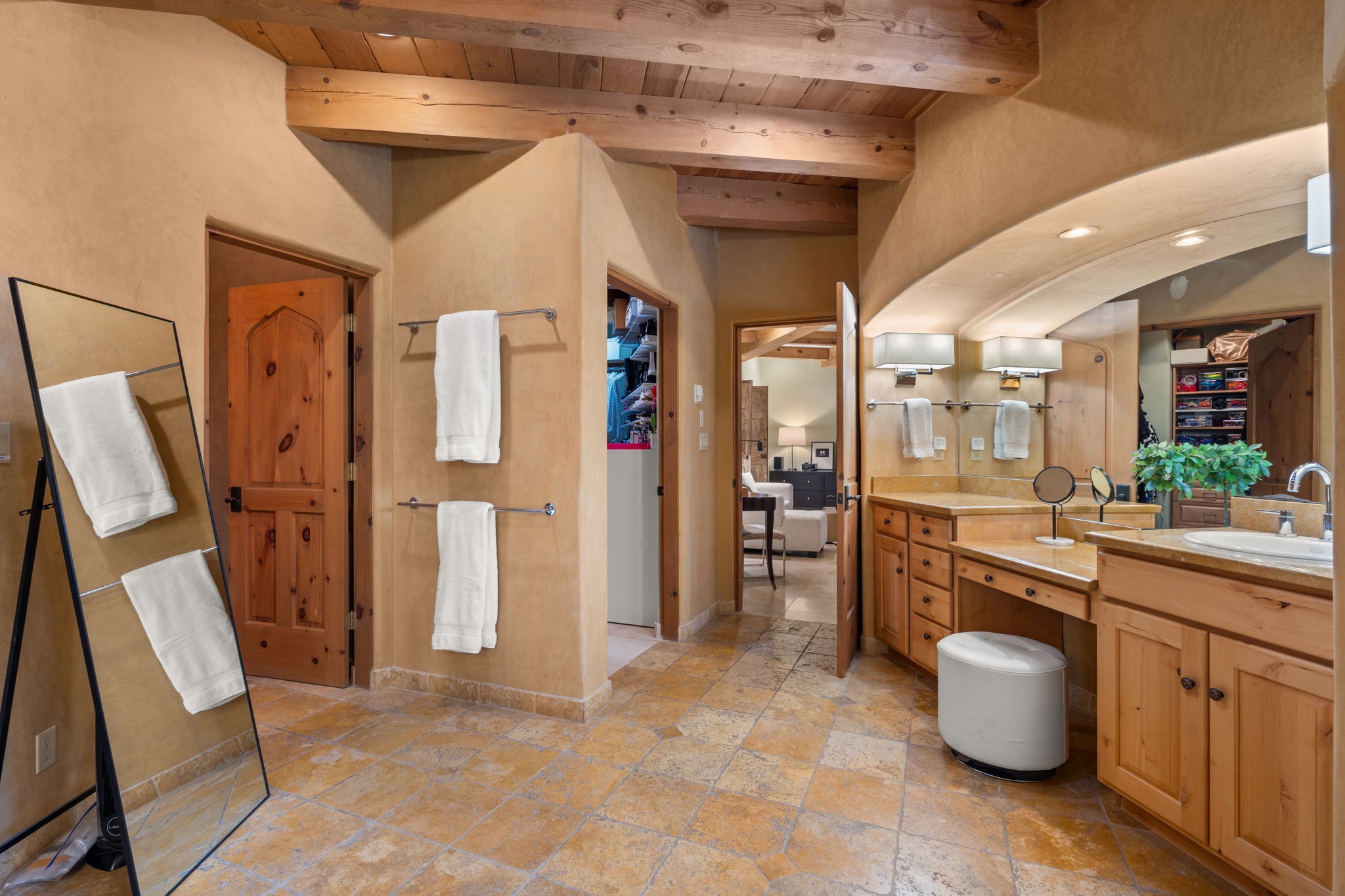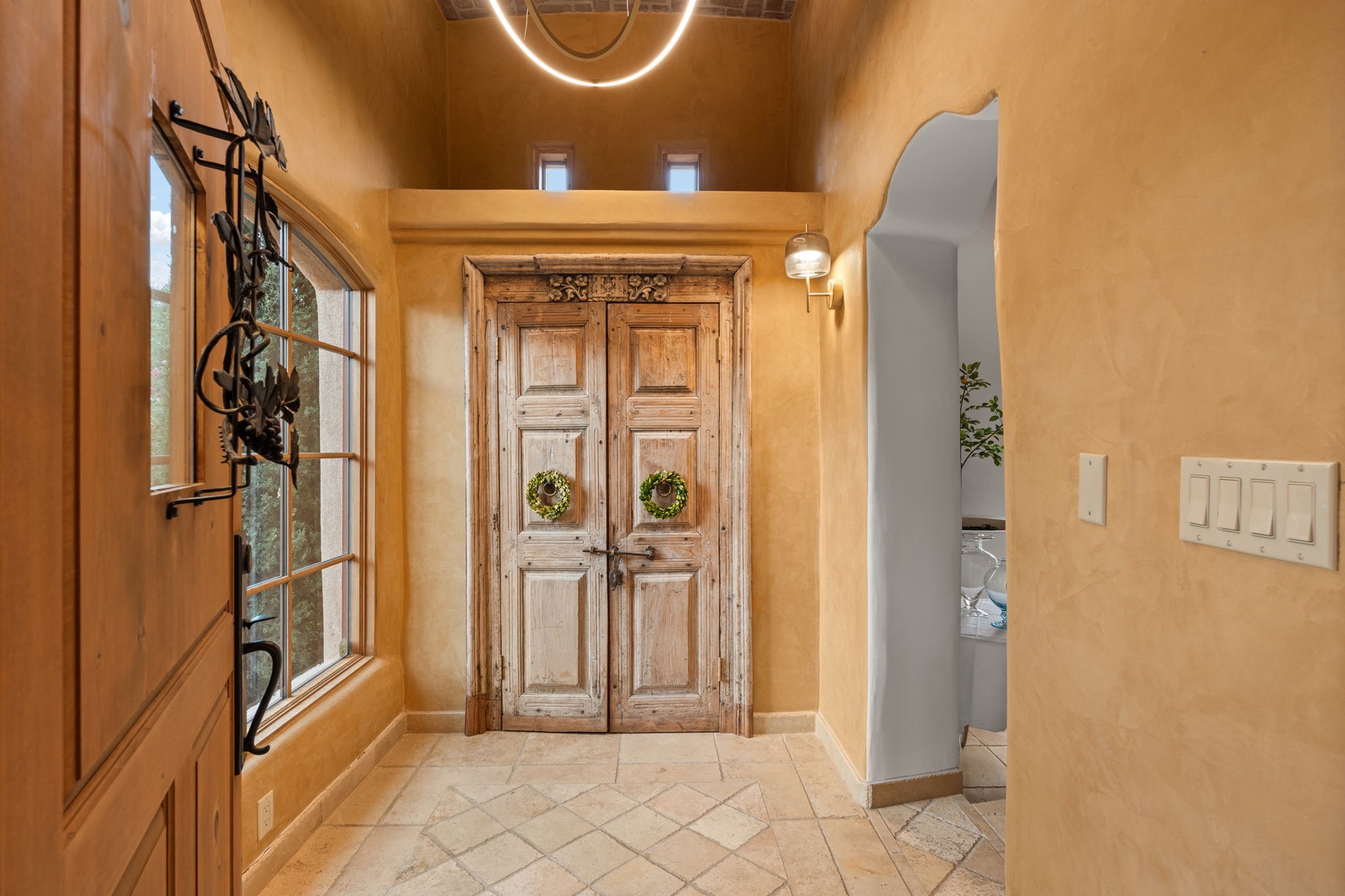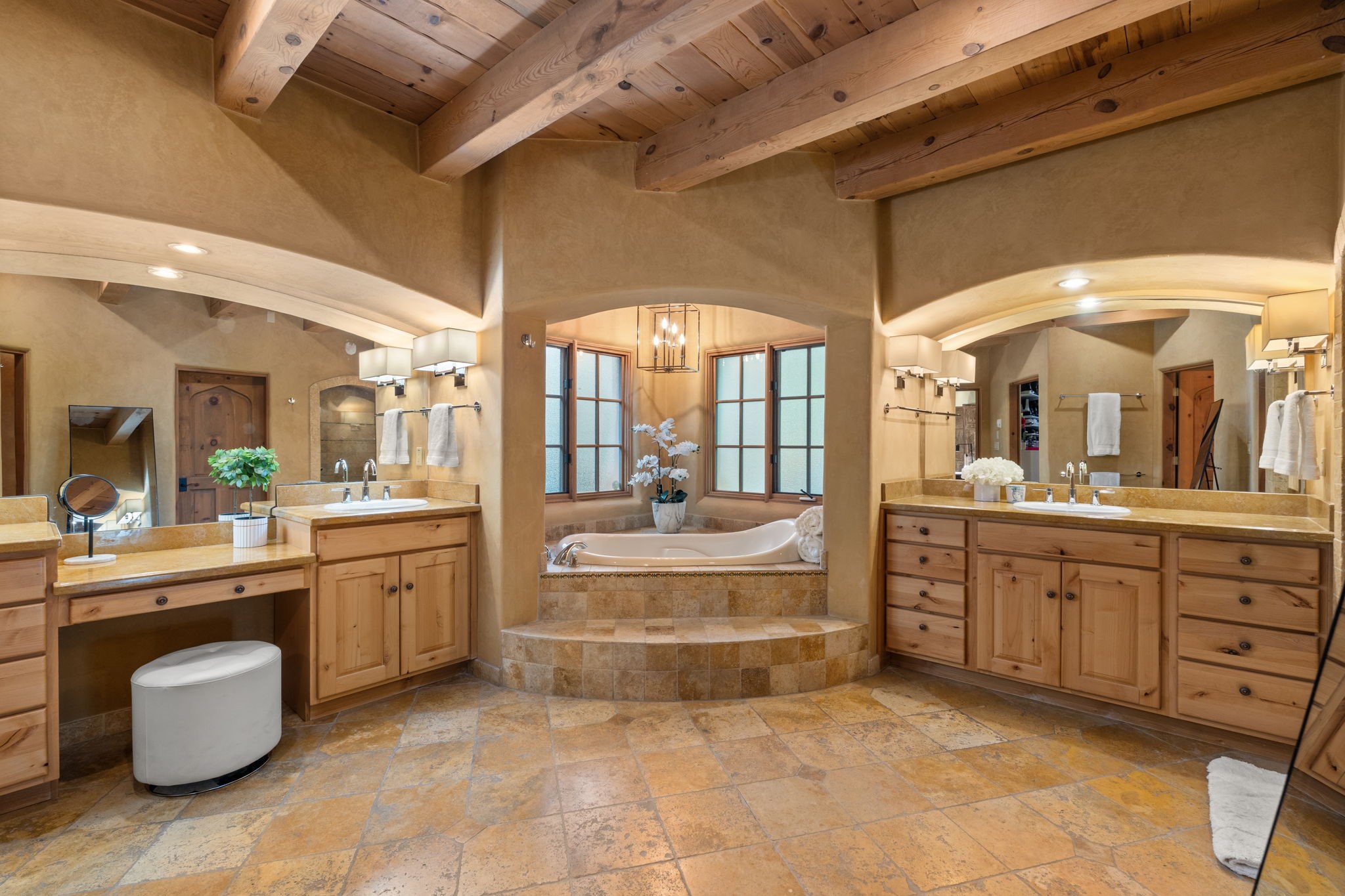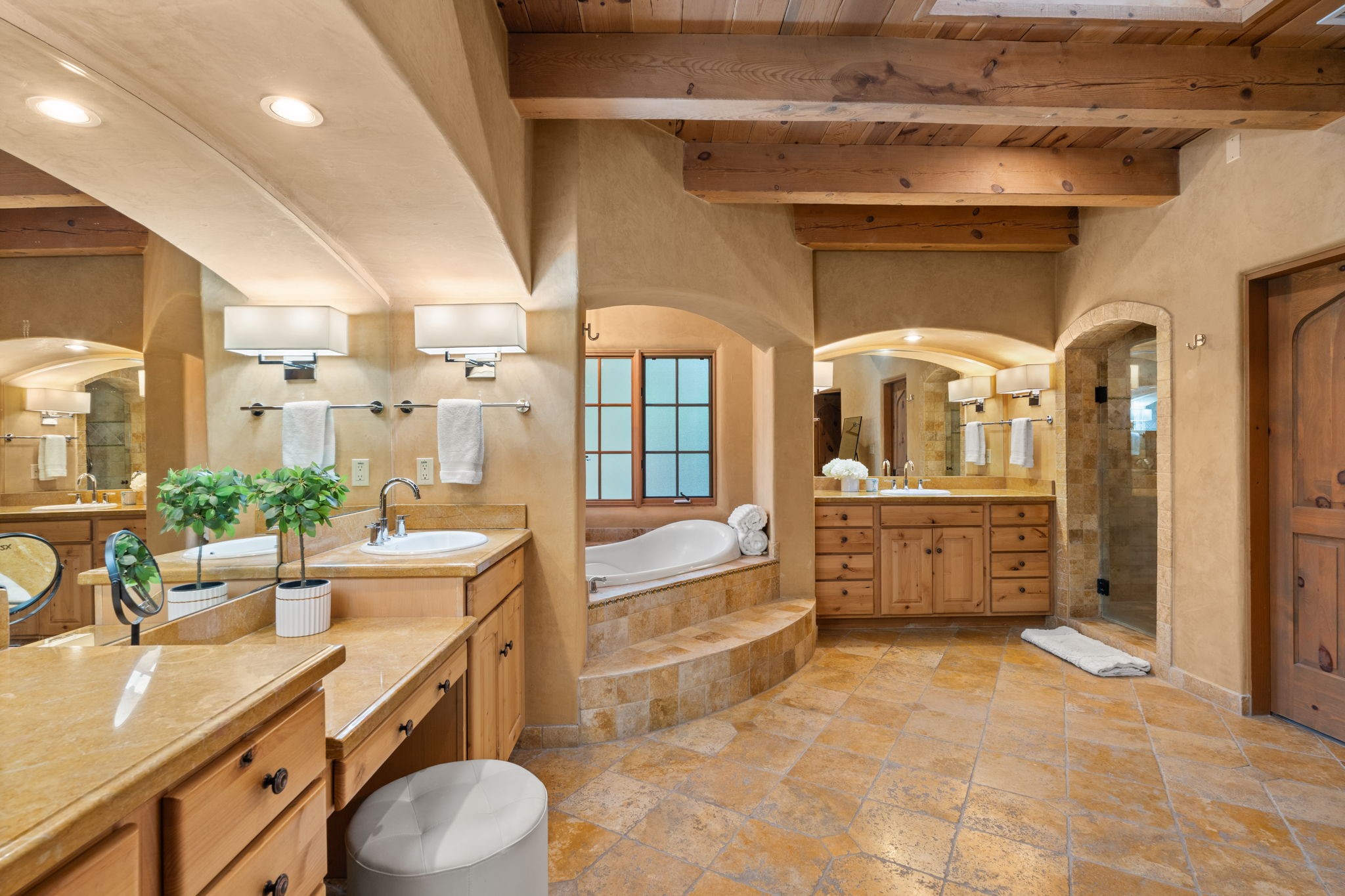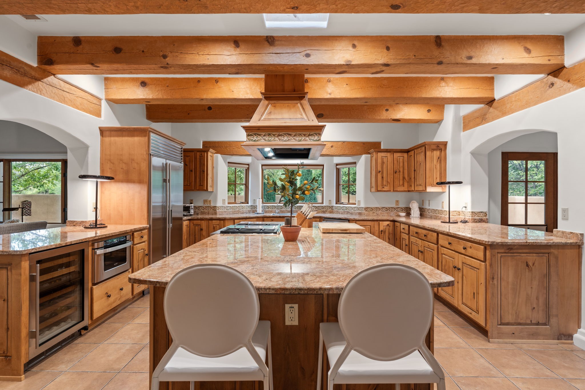 Gorgeous, peaceful, remarkable. A beautiful mediterranean adobe villa by John Calvin. Set in a lush and well-manicured setting on a very special street in the Village of Los Ranchos. Walk or ride your bike to Los Poblanos Historic Inn, Campo, Los Ranchos Growers Market, and much more. The home features a chef's kitchen, spacious en-suite bedrooms, stunning garden views from every window, and a large koi pond and a private irrigation well. Radiant heat, central AC, Wolf range, 5 fireplaces including an outdoor kiva, travertine floors, 3 Car garage. Separated & Quiet Master Suite. Kitchen features include Wolf range, subzero fridge, double-oven, wine cooler, & oversized island. Enjoy views of the gardens and landscaping from every room, with a walled backyard.