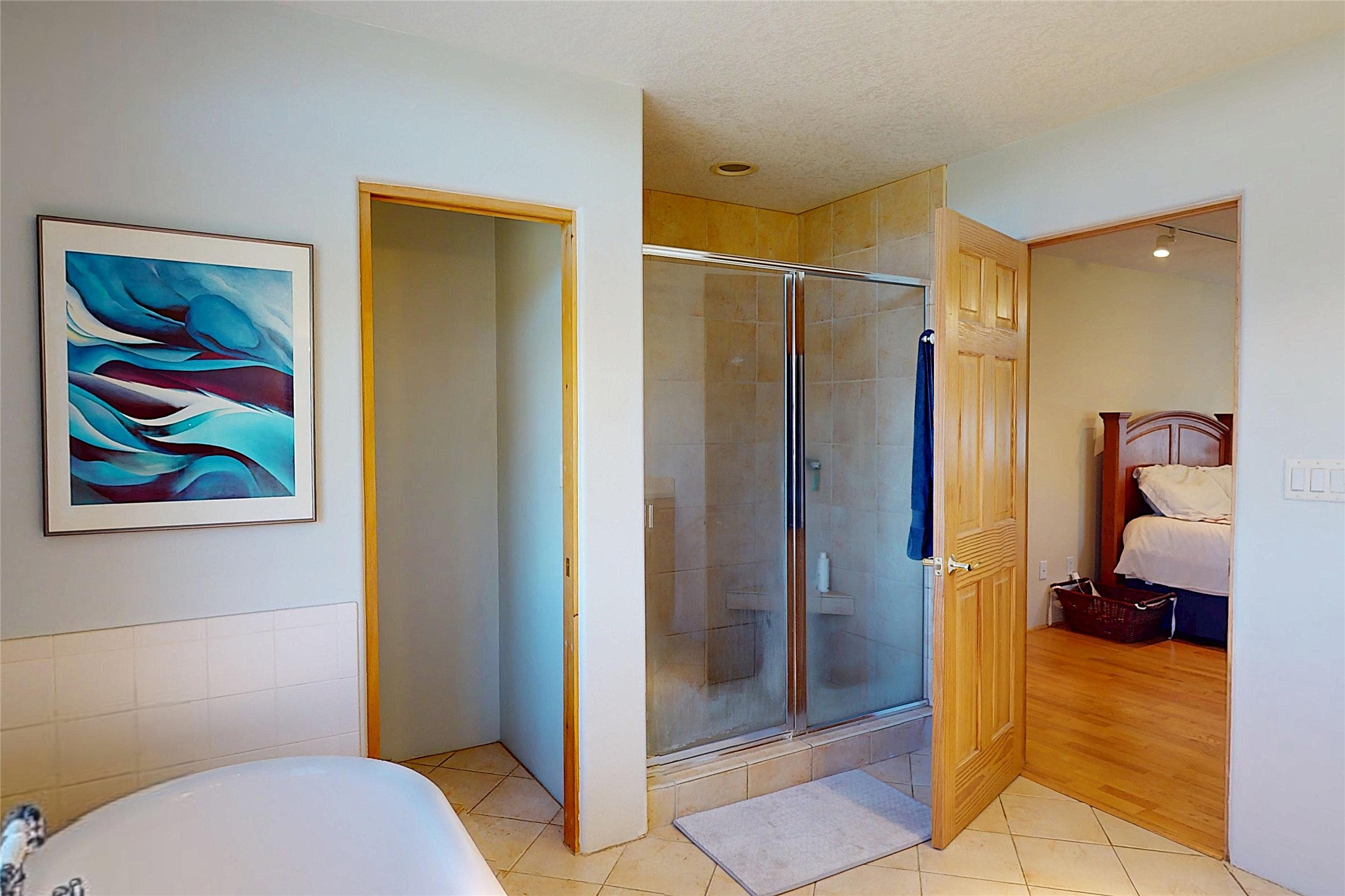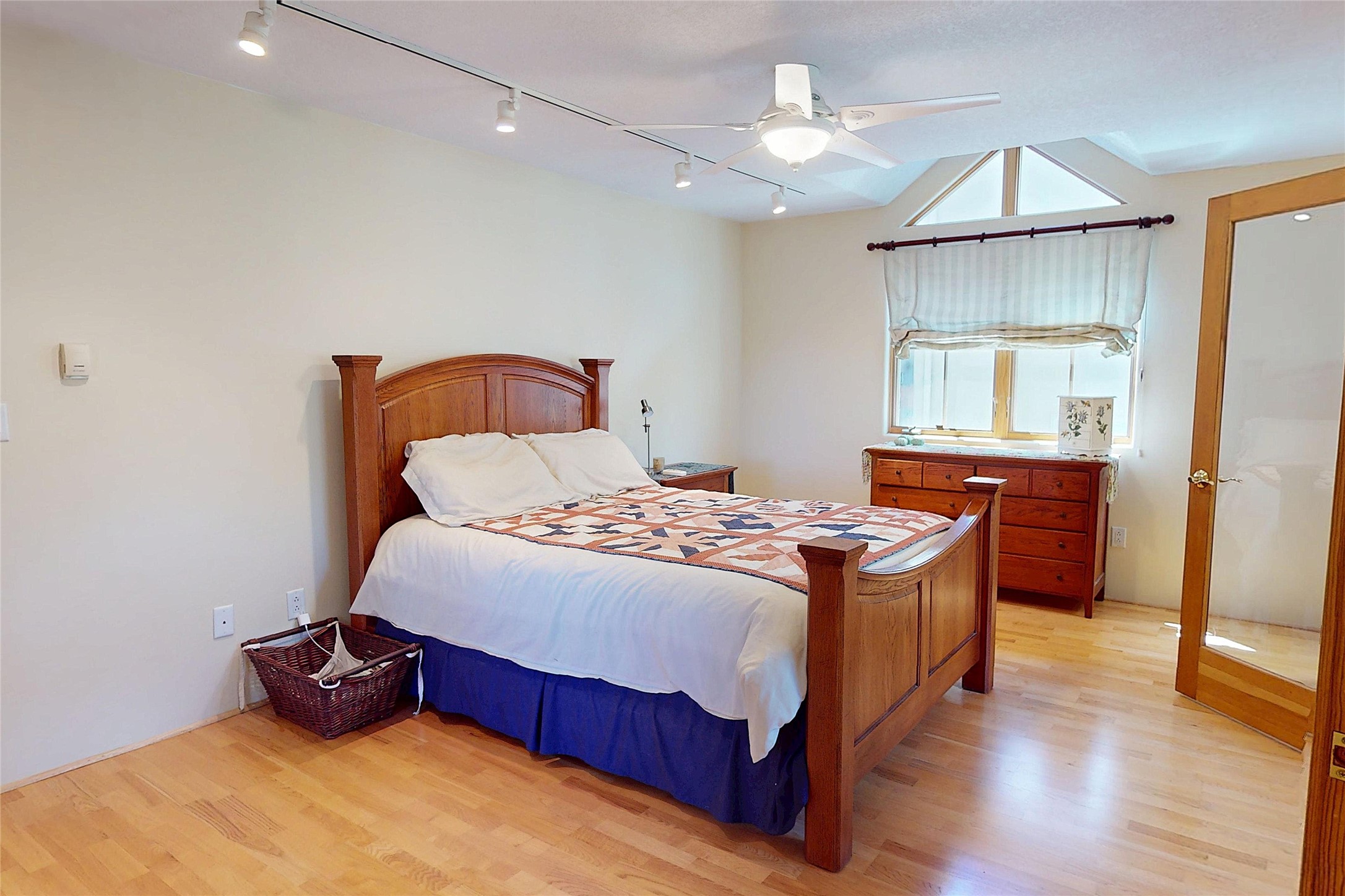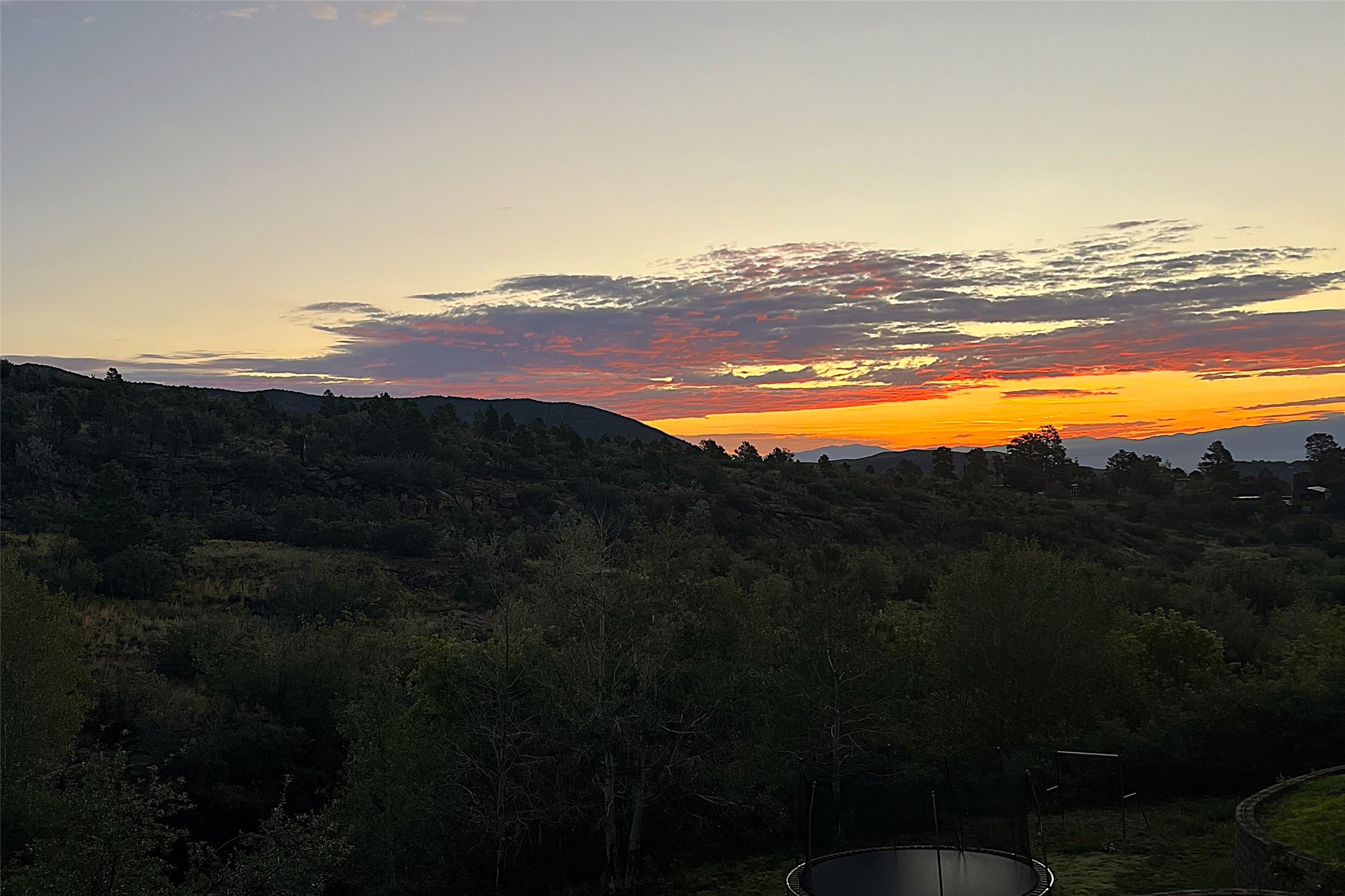 This stunning 4-bedroom, 2.5-bath Quemazon home backs to open space, offering privacy and direct access to the Perimeter Trail. The open floor plan flows seamlessly between the kitchen, dining, and living areas, with easy access to the covered Trex deck--perfect for enjoying mountain and forest views as well as the private backyard. The spacious primary suite includes a private study framed by French doors, dual walk-in closets, and a luxurious en-suite bath with dual sinks and a freestanding tub. Three additional bedrooms and a well-appointed hall bath complete the layout. A walk-out basement with additional living space and a crawl space for storage adds flexibility. Thoughtful details include architectural touches throughout the home, in-floor radiant heat with four zones, WindsorLite windows, six-panel wood doors, ceiling fans in every bedroom and the living room, track lighting, and Kohler fixtures. The kitchen is equipped with a Bosch dishwasher, gas stove/oven, and a newer refrigerator (2022). Major updates include roof replacement in 2009 with a lower-roof update in 2025, and a full stucco renovation in 2019. Outdoors, mature fruit trees--cherry, apple, pear, plum, apricot, nectarine, and peach--along with raspberries, drought-tolerant blue grama grass, and a private front yard with precision-cut stone walls, create a serene retreat. French drains along the west side provide peace of mind. This Quemazon gem blends comfort, thoughtful upgrades, and a premier setting with trails at your doorstep.