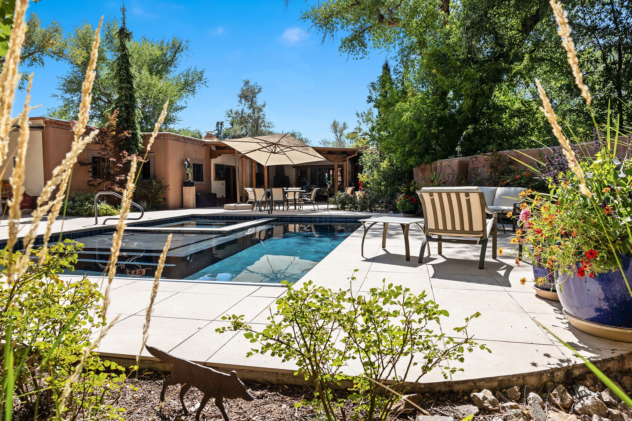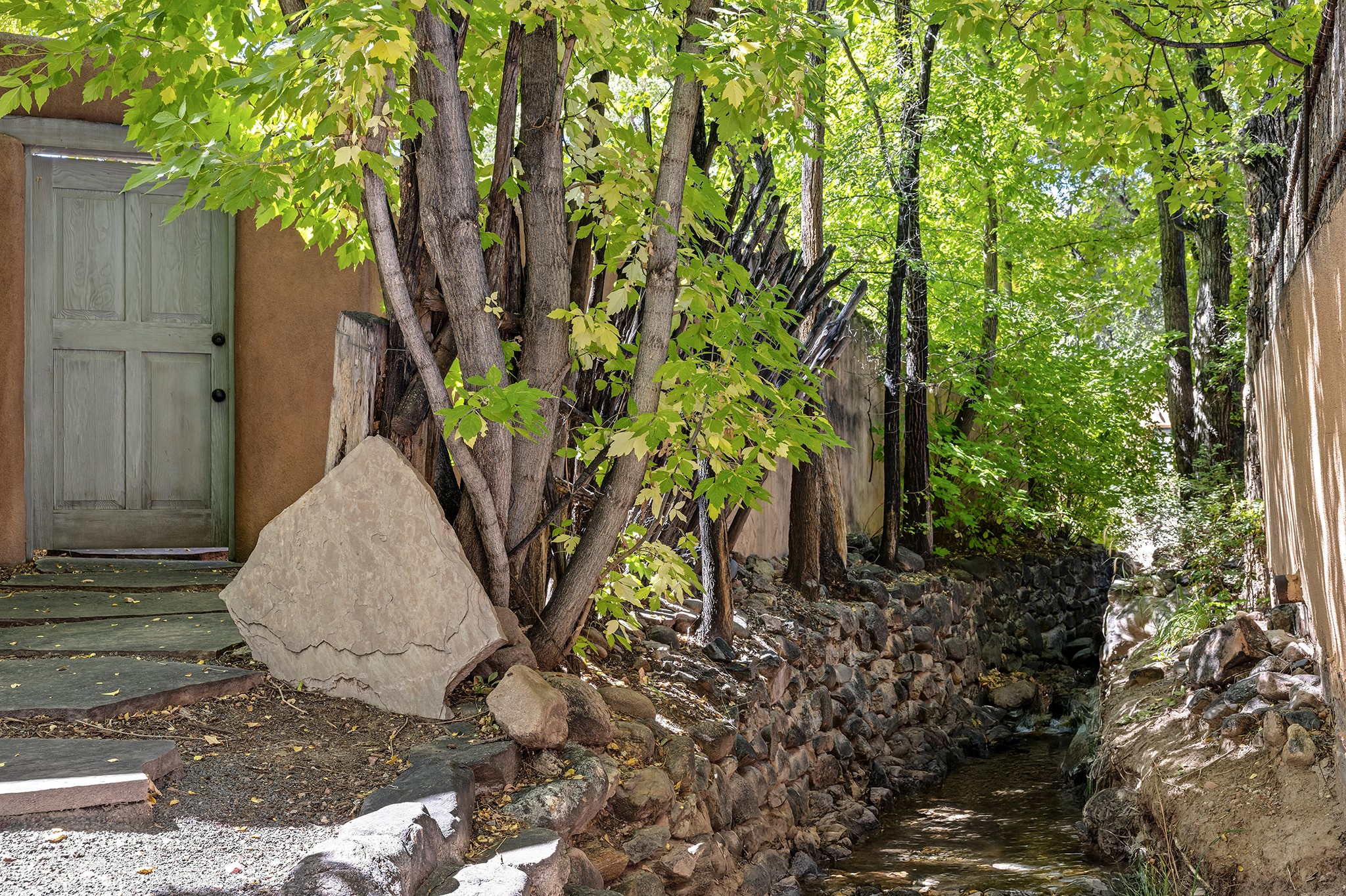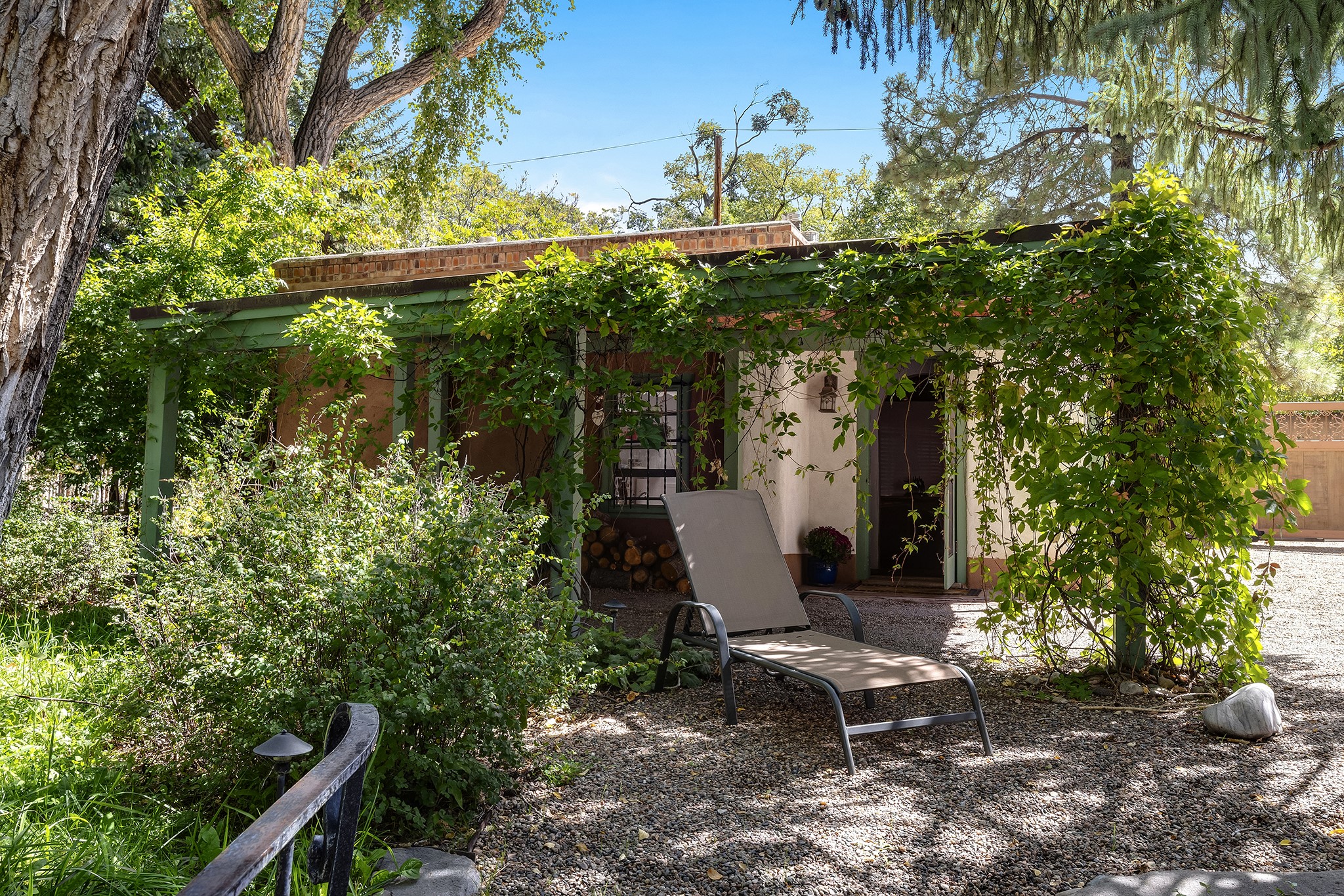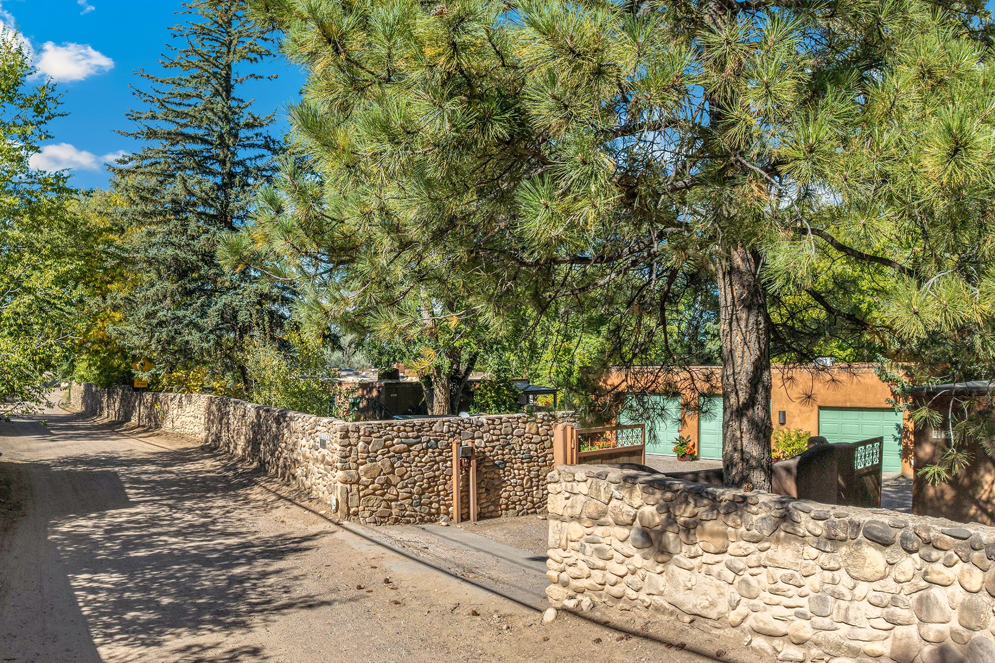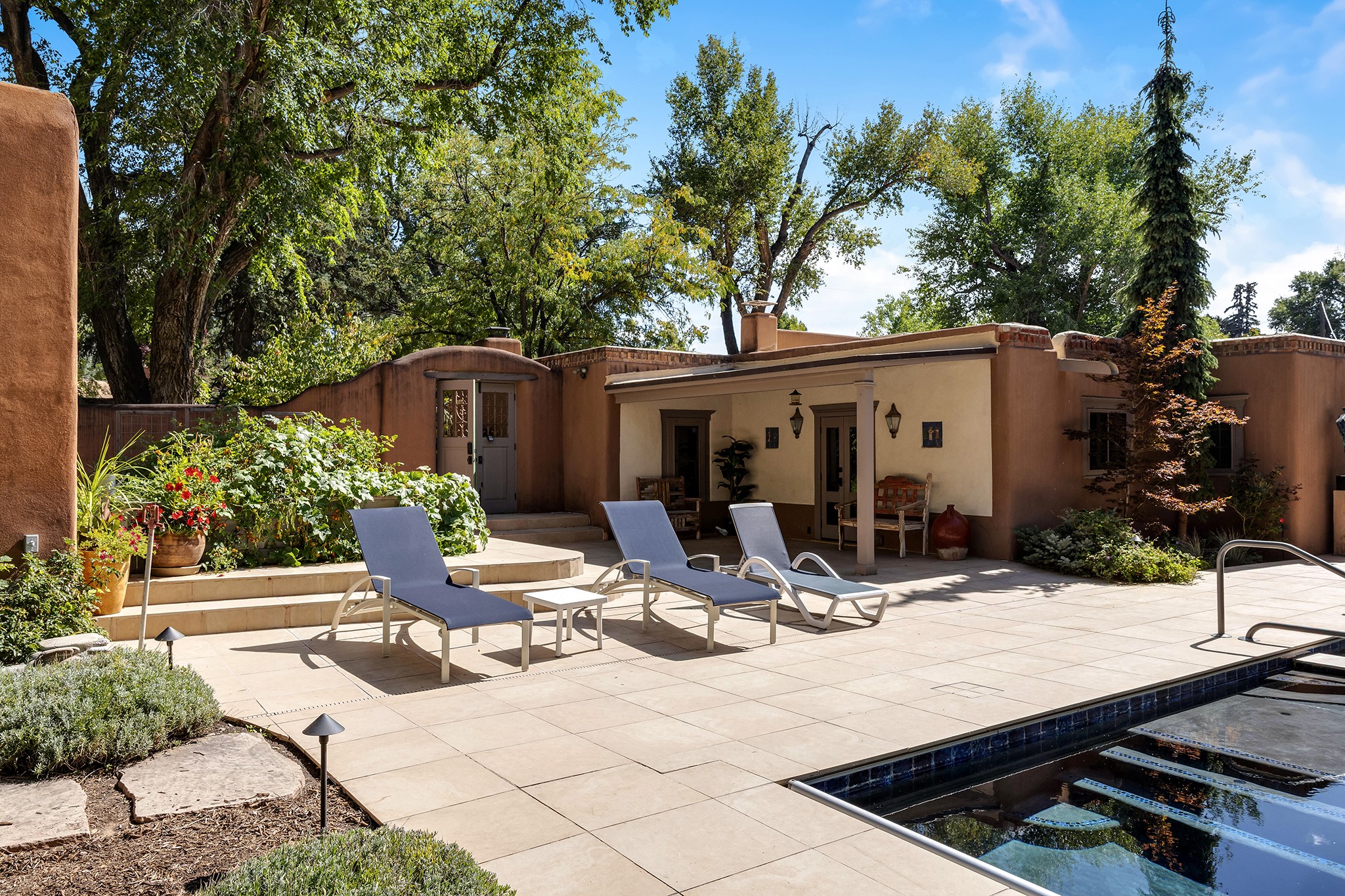 481 Arroyo Tenorio, behind an iconic stonewall in the heart of the Historic East side and the Acequia Madre runs through it! Tucked away and gated on a serene lane in the coveted Historic District is this enviable compound which blends traditional Santa Fe architecture with modern comforts. Thick plastered walls, vigas, coved ceilings, and multiple fireplaces create warmth and authenticity, while large windows and French doors invite abundant natural light. An elegantly designed pool, hot tub and extended outdoor living space and vegetable garden were added in 2022. The main house flexible floor plan offers gracious living and dining areas, a well-appointed kitchen, two private bedroom suites , additional guest bedroom , 2.5 baths office and media room. Perfect for full-time living or part time with privacy and security . The guest house features one bedroom , one bath , living area ,dining and kitchenette. Outdoor living is equally inviting, with lush, landscaped gardens, flagstone patios, and shaded portals ideal for entertaining or quiet retreat.Just moments from Canyon Road, the Plaza, and some of Santa Fe's finest restaurants and galleries, around the corner from famous local Downtown Subscription coffee shop and Garcia Street Books. This home provides the perfect balance of privacy and proximity. A rare opportunity to own a classic East side property in one of the city's most sought-after neighborhoods.