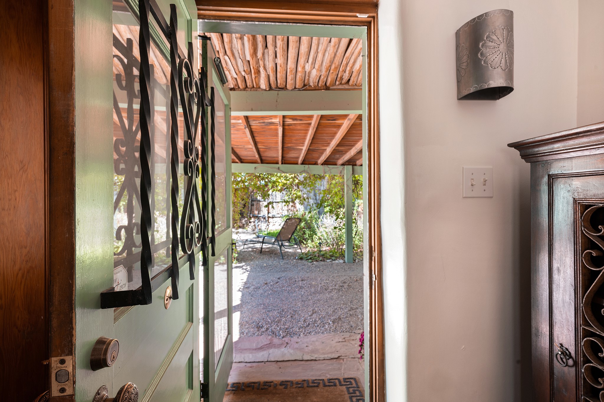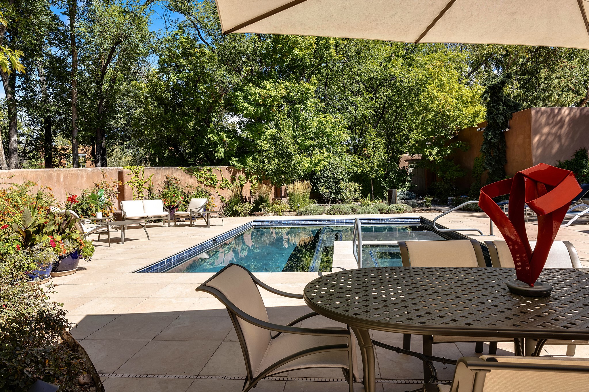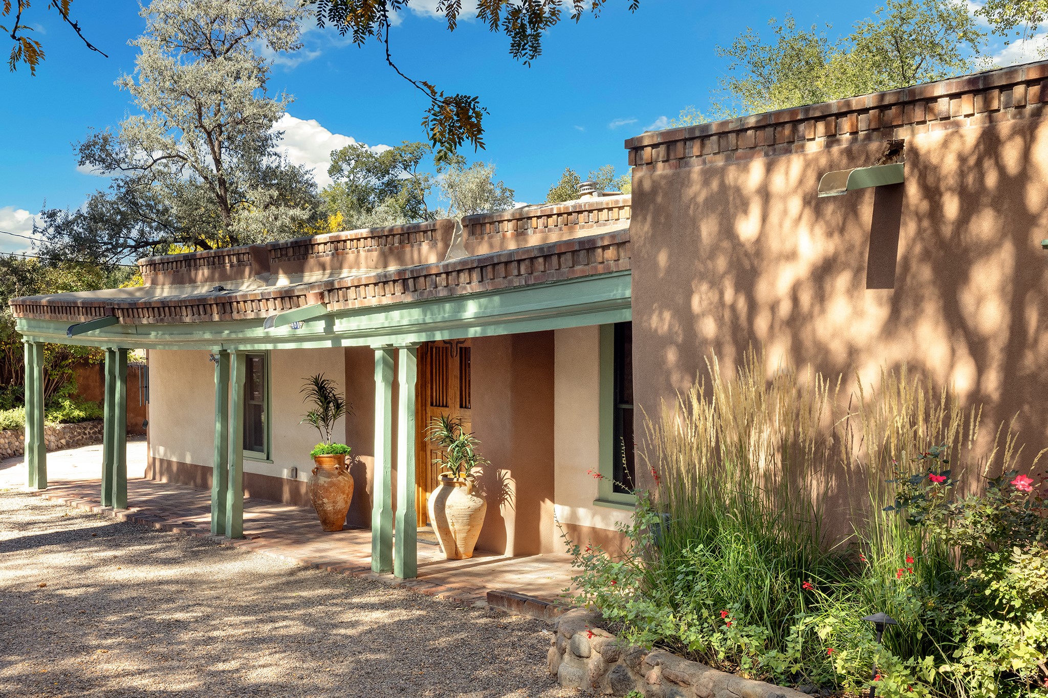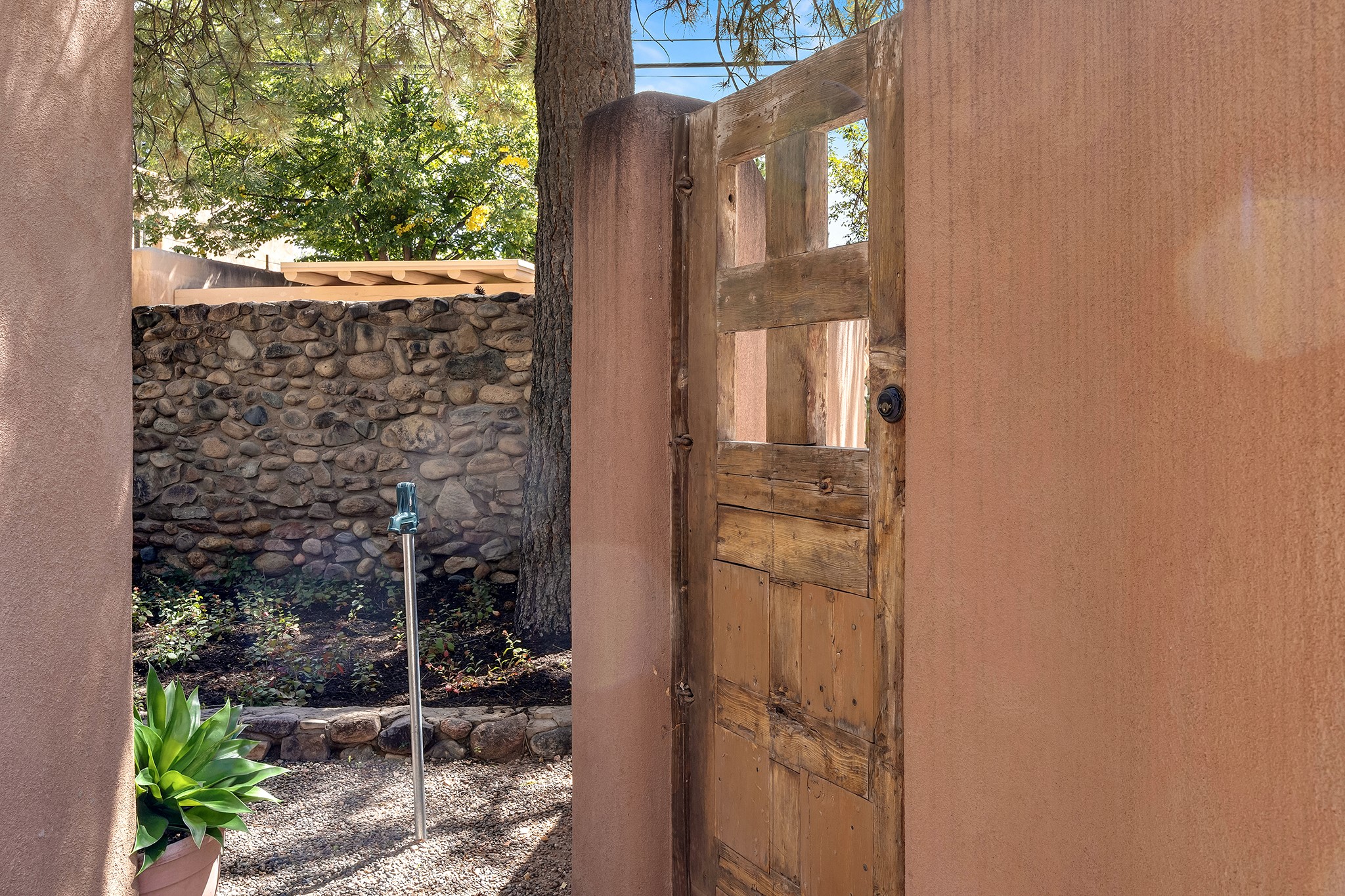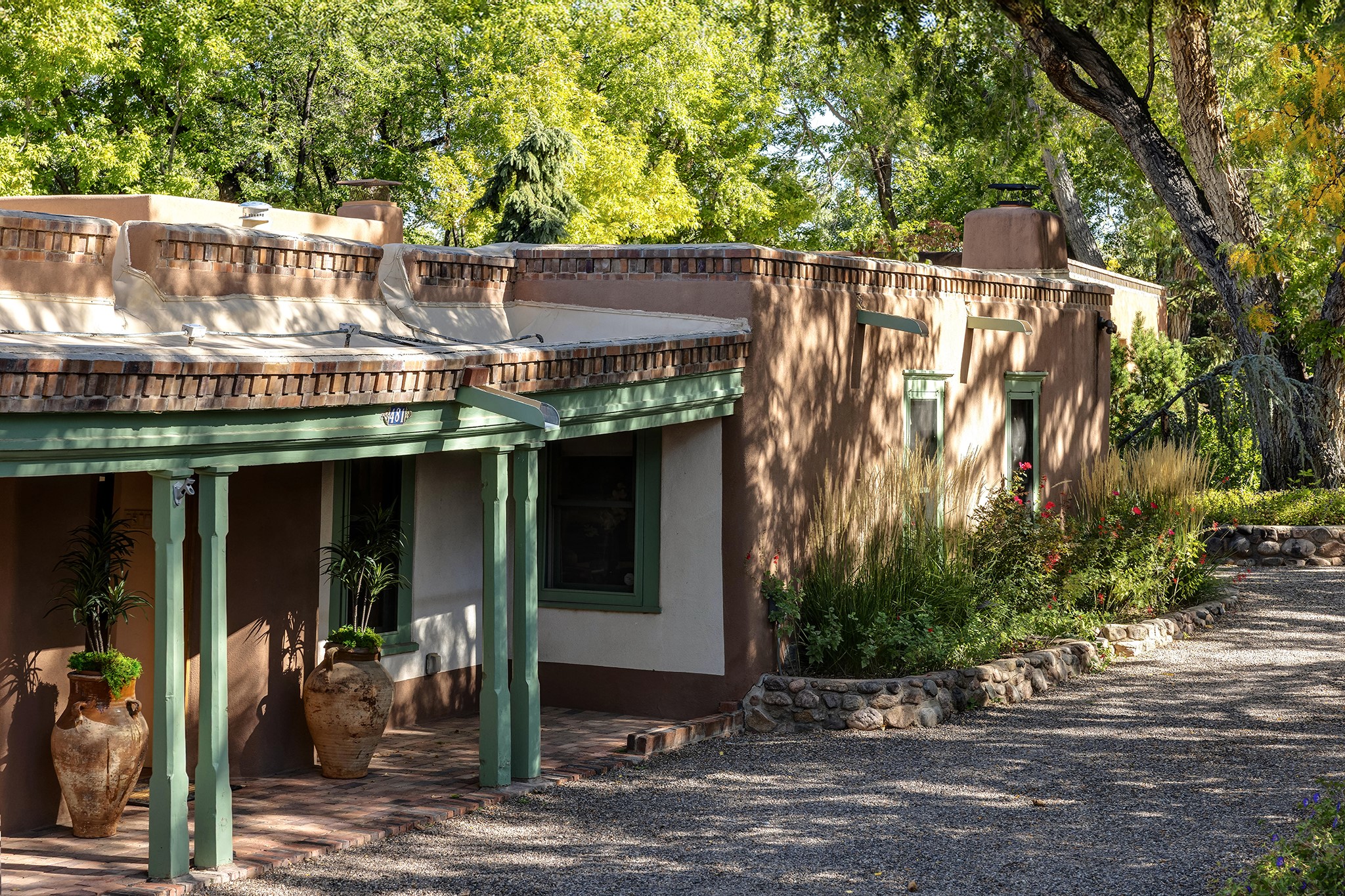 481 Arroyo Tenorio, behind an iconic stonewall in the heart of the Historic East side and the Acequia Madre runs through it! Tucked away and gated on a serene lane in the coveted Historic District is this enviable compound which blends traditional Santa Fe architecture with modern comforts. Thick plastered walls, vigas, coved ceilings, and multiple fireplaces create warmth and authenticity, while large windows and French doors invite abundant natural light. An elegantly designed pool, hot tub and extended outdoor living space and vegetable garden were added in 2022. The main house flexible floor plan offers gracious living and dining areas, a well-appointed kitchen, two private bedroom suites , additional guest bedroom , 2.5 baths office and media room. Perfect for full-time living or part time with privacy and security . The guest house features one bedroom , one bath , living area ,dining and kitchenette. Outdoor living is equally inviting, with lush, landscaped gardens, flagstone patios, and shaded portals ideal for entertaining or quiet retreat.Just moments from Canyon Road, the Plaza, and some of Santa Fe's finest restaurants and galleries, around the corner from famous local Downtown Subscription coffee shop and Garcia Street Books. This home provides the perfect balance of privacy and proximity. A rare opportunity to own a classic East side property in one of the city's most sought-after neighborhoods.