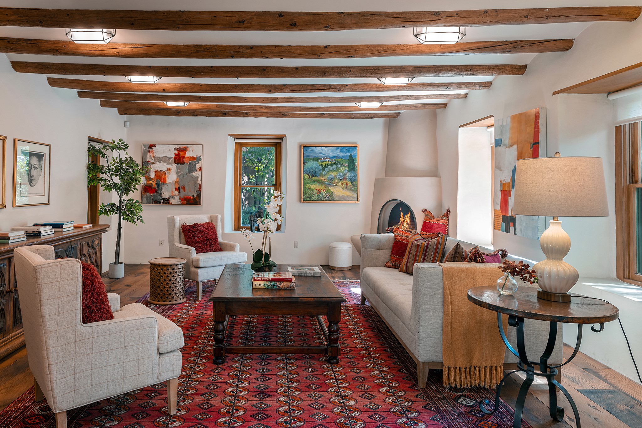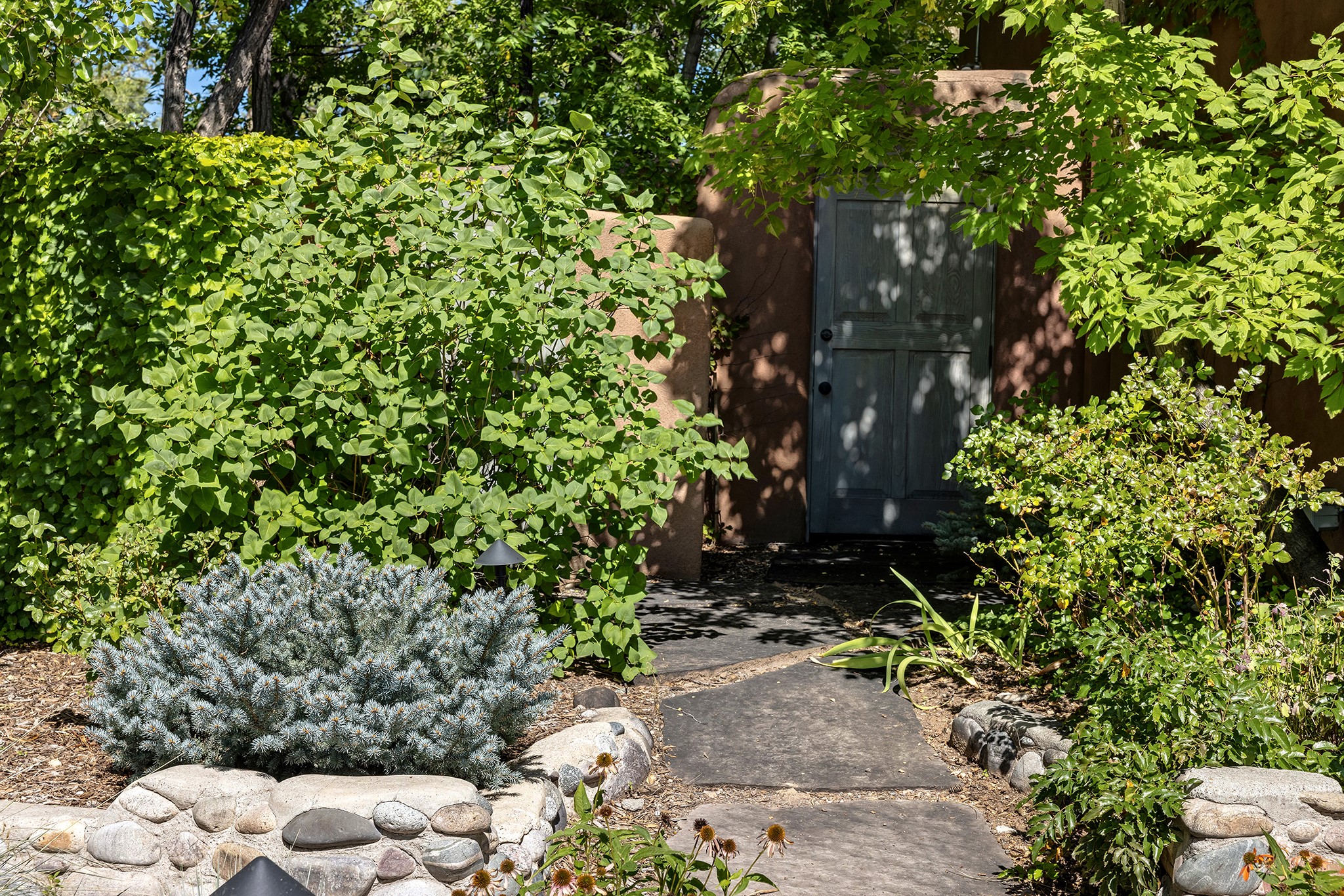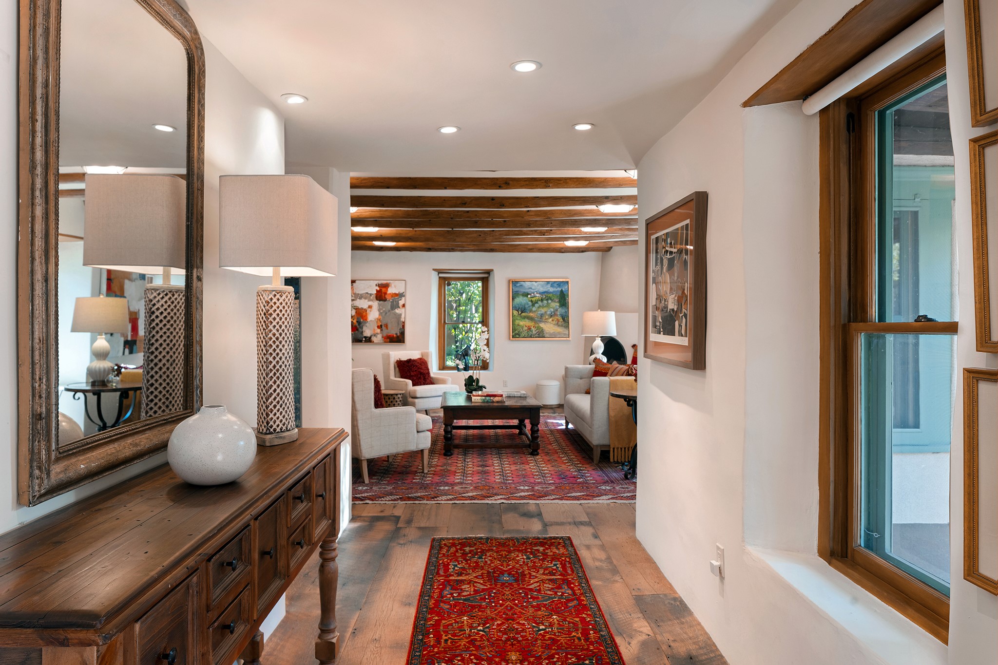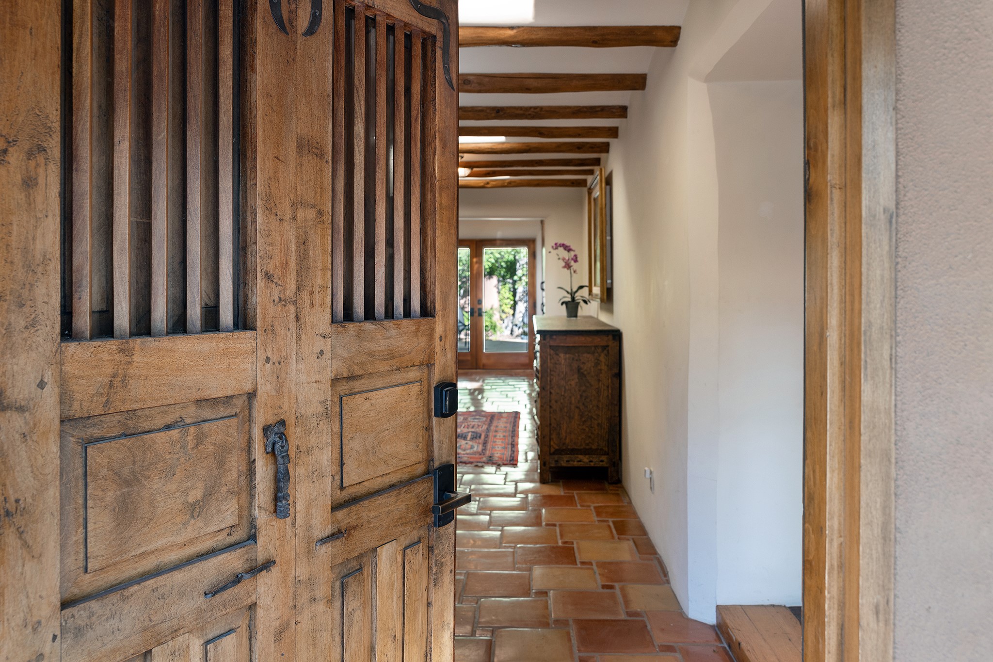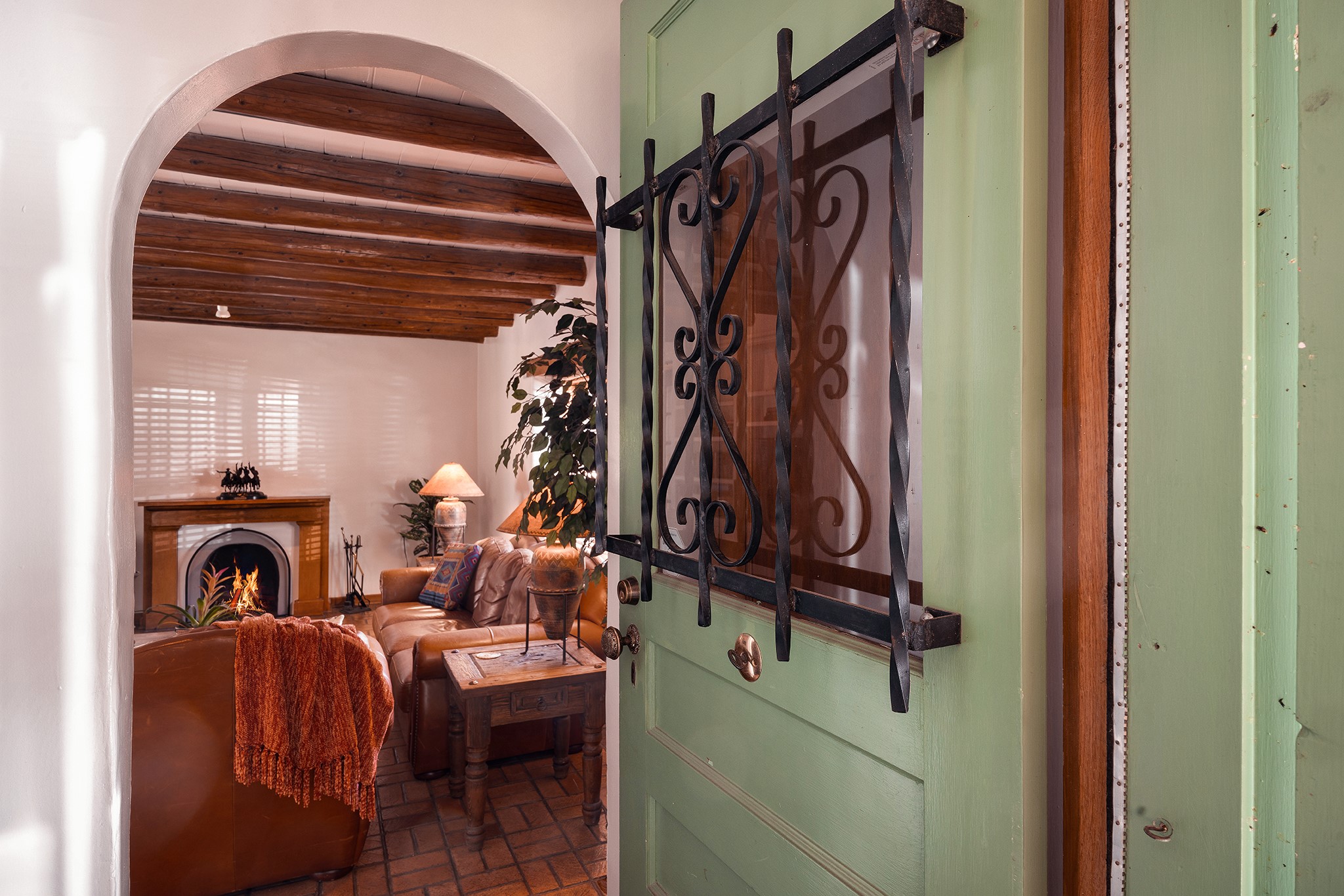 481 Arroyo Tenorio, behind an iconic stonewall in the heart of the Historic East side and the Acequia Madre runs through it! Tucked away and gated on a serene lane in the coveted Historic District is this enviable compound which blends traditional Santa Fe architecture with modern comforts. Thick plastered walls, vigas, coved ceilings, and multiple fireplaces create warmth and authenticity, while large windows and French doors invite abundant natural light. An elegantly designed pool, hot tub and extended outdoor living space and vegetable garden were added in 2022. The main house flexible floor plan offers gracious living and dining areas, a well-appointed kitchen, two private bedroom suites , additional guest bedroom , 2.5 baths office and media room. Perfect for full-time living or part time with privacy and security . The guest house features one bedroom , one bath , living area ,dining and kitchenette. Outdoor living is equally inviting, with lush, landscaped gardens, flagstone patios, and shaded portals ideal for entertaining or quiet retreat.Just moments from Canyon Road, the Plaza, and some of Santa Fe's finest restaurants and galleries, around the corner from famous local Downtown Subscription coffee shop and Garcia Street Books. This home provides the perfect balance of privacy and proximity. A rare opportunity to own a classic East side property in one of the city's most sought-after neighborhoods.