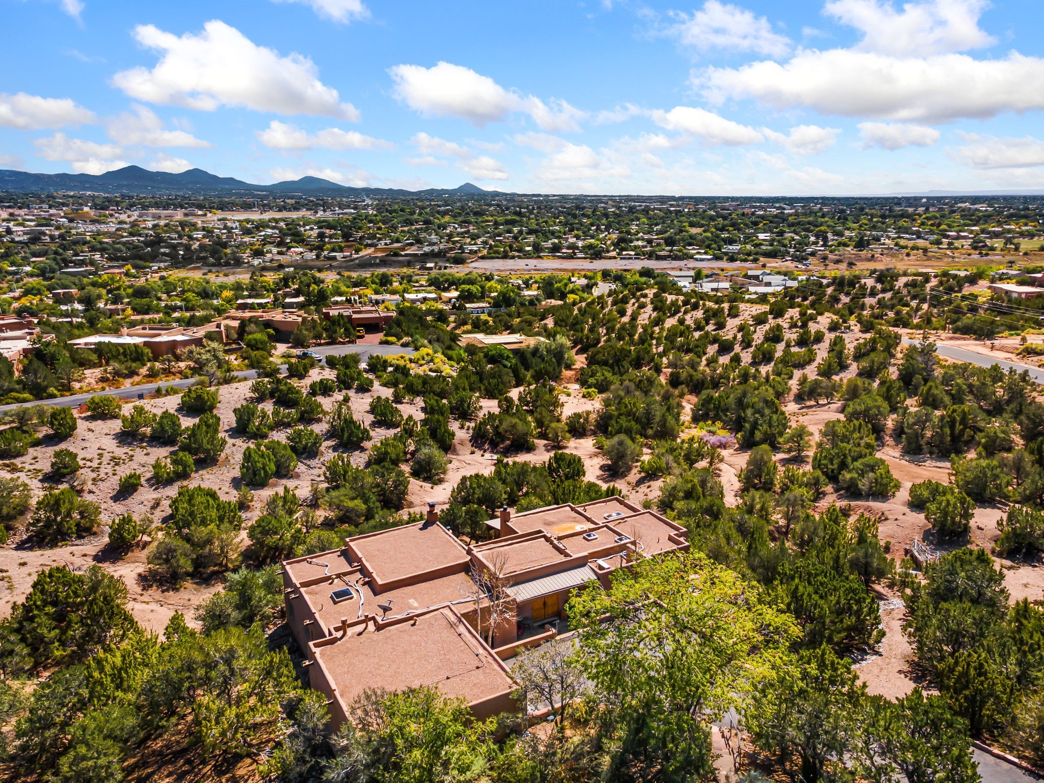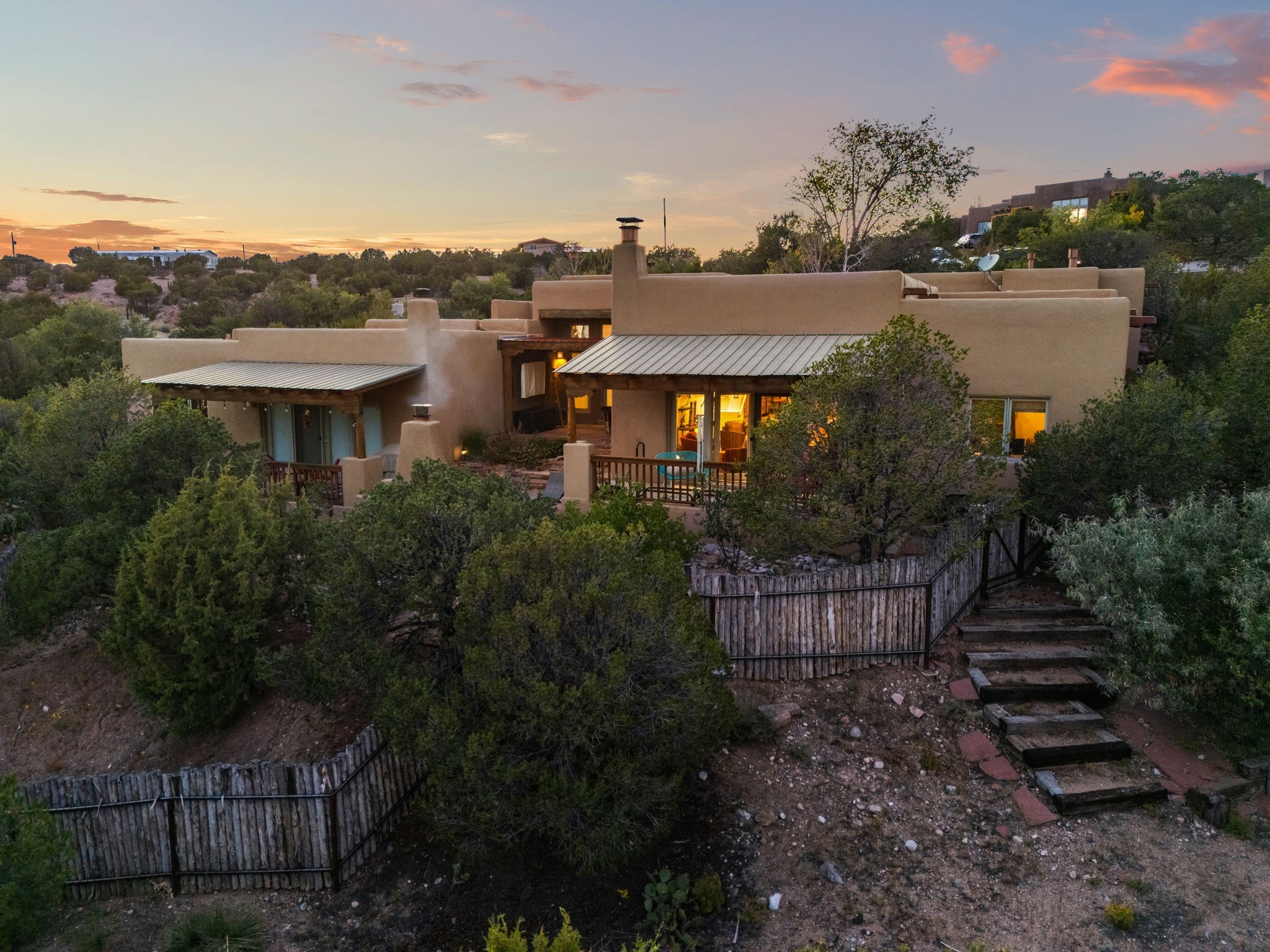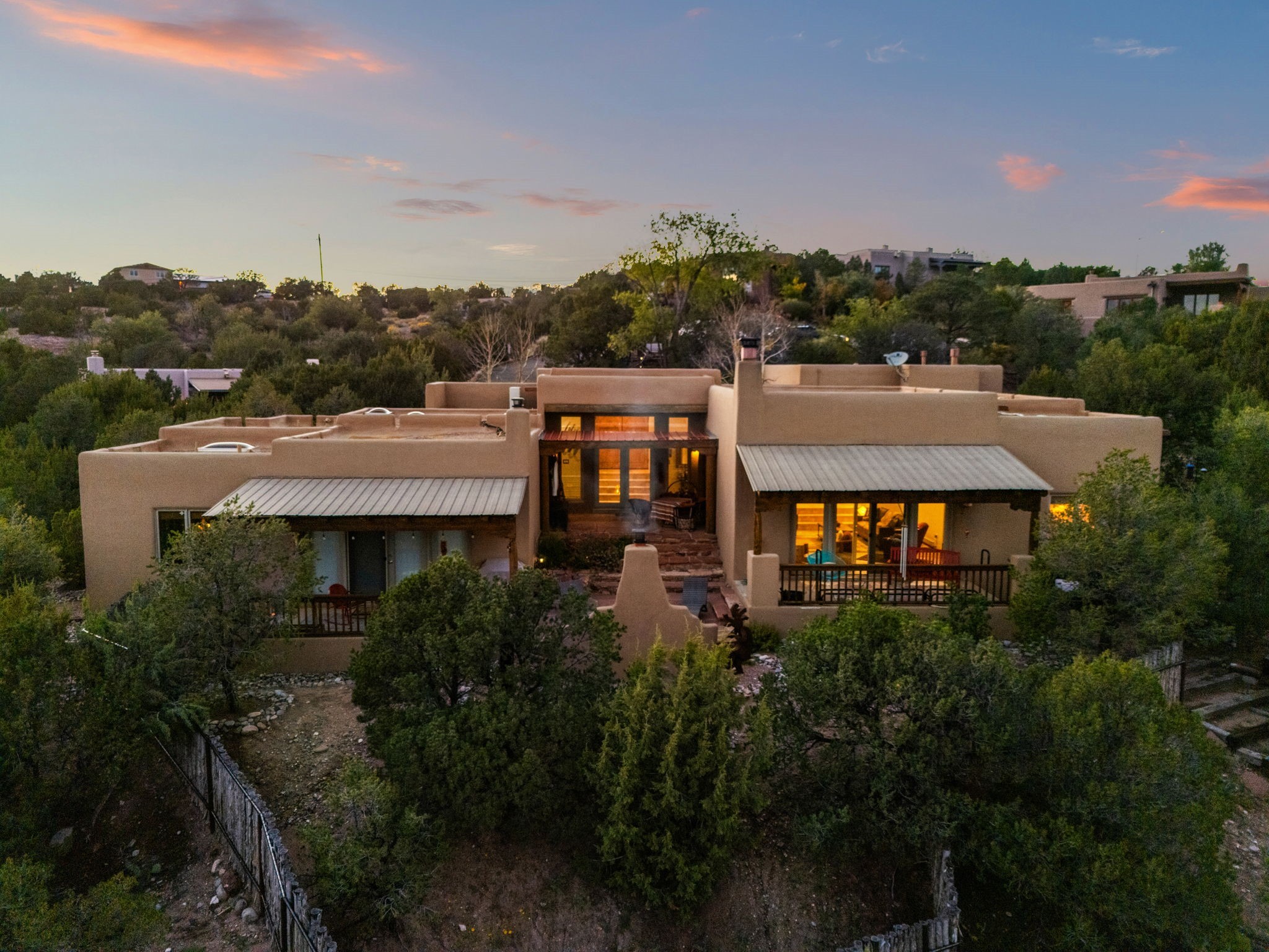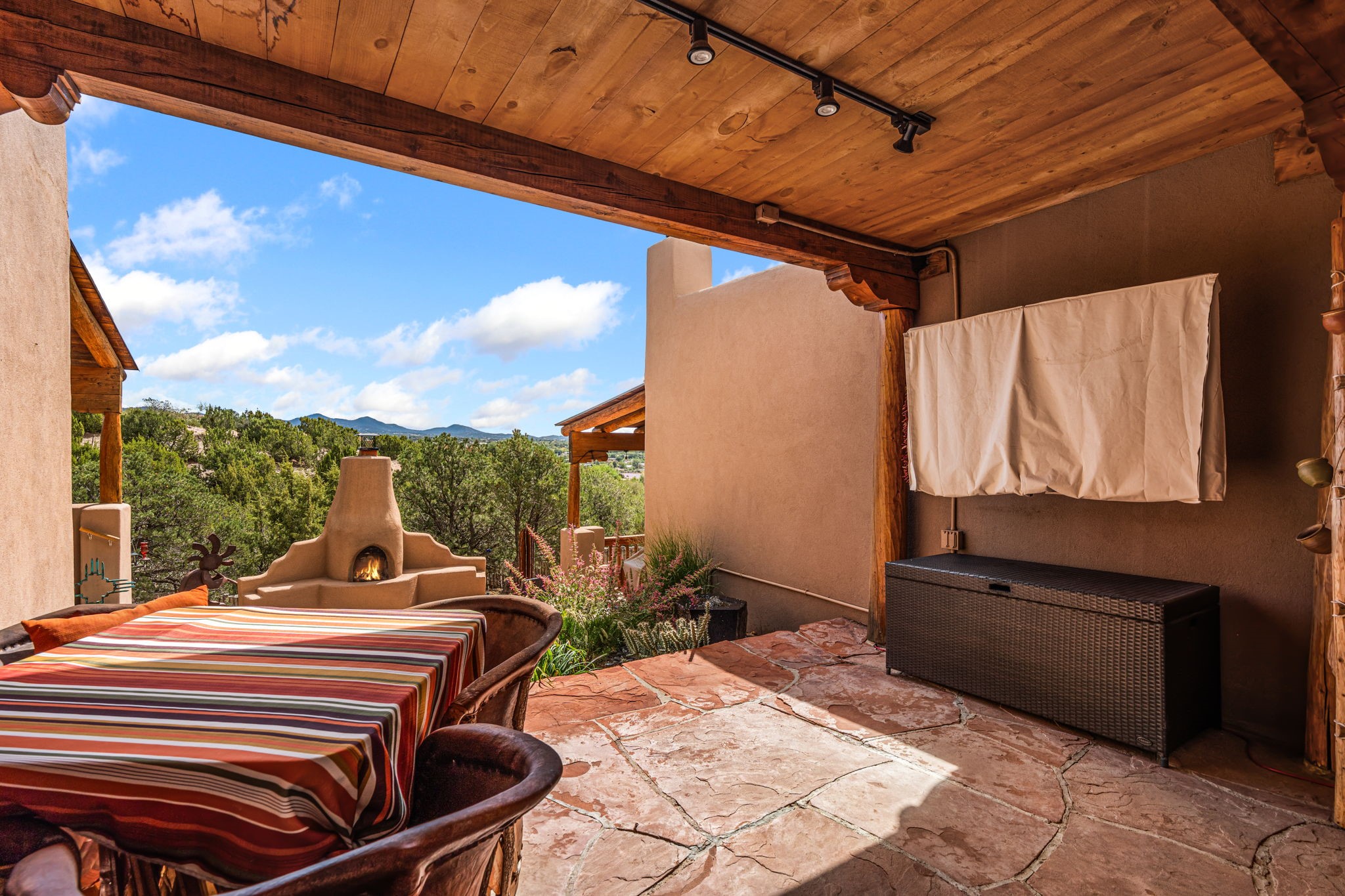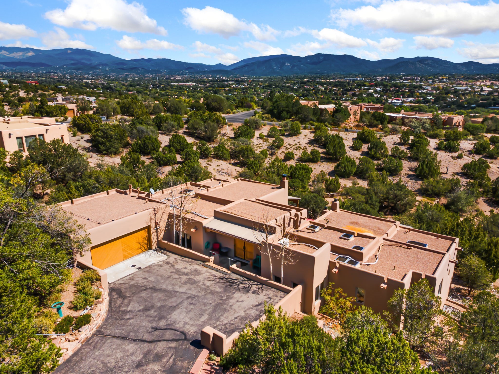 Very rarely, there is a property that combines incredible views from almost every room, ultimate Santa Fe style, modern amenities and an unbeatable location! 5 minutes from downtown, this 3 bed 3 bath custom build is the complete package!Enter the hand carved front doors and be greeted by dramatic views straight away. From here, step into the grand salon with soaring ceilings, a kiva fireplace and stately hand-troweled plaster. The dining room features a drop ceiling and recessed lighting for the most intimate ambience. You'll be serving your happy guests in style from the updated chef's kitchen -featuring Silestone quartz countertops, stainless appliances, a playful handpainted tile backsplash, and a sleek modern design. Almost every room in the home has house outdoor access for that seamless indoor-outdoor living. The views from the portal will be sure to impress: city lights at night and Sangre De Cristo-facing sunsets for that gorgeous Santa Fe color palette. The generous primary suite has its own kiva fireplace, outdoor portal, and a sumptuous bath - with oversized pebble shower, dedicated water closet, deep-soaking tub and dual sinks. The two guest rooms share a large full bath. Recent upgrades (2022) include a new foam and gravel roof with a 10-year warranty, plaster walls in the main living areas, latilla ceilings and 40 new recessed lights in dining and guest rooms, a new alarm system, and an outdoor kiva fireplace flanked by bancos. The oversized 2-car garage has direct entry into the kitchen and dedicated laundry area for easy access. With plenty of storage, this home is perfect for a primary residence, or make it your Santa Fe getaway! Don't miss this opportunity to own all the best Santa Fe has to offer! Schedule a showing today!