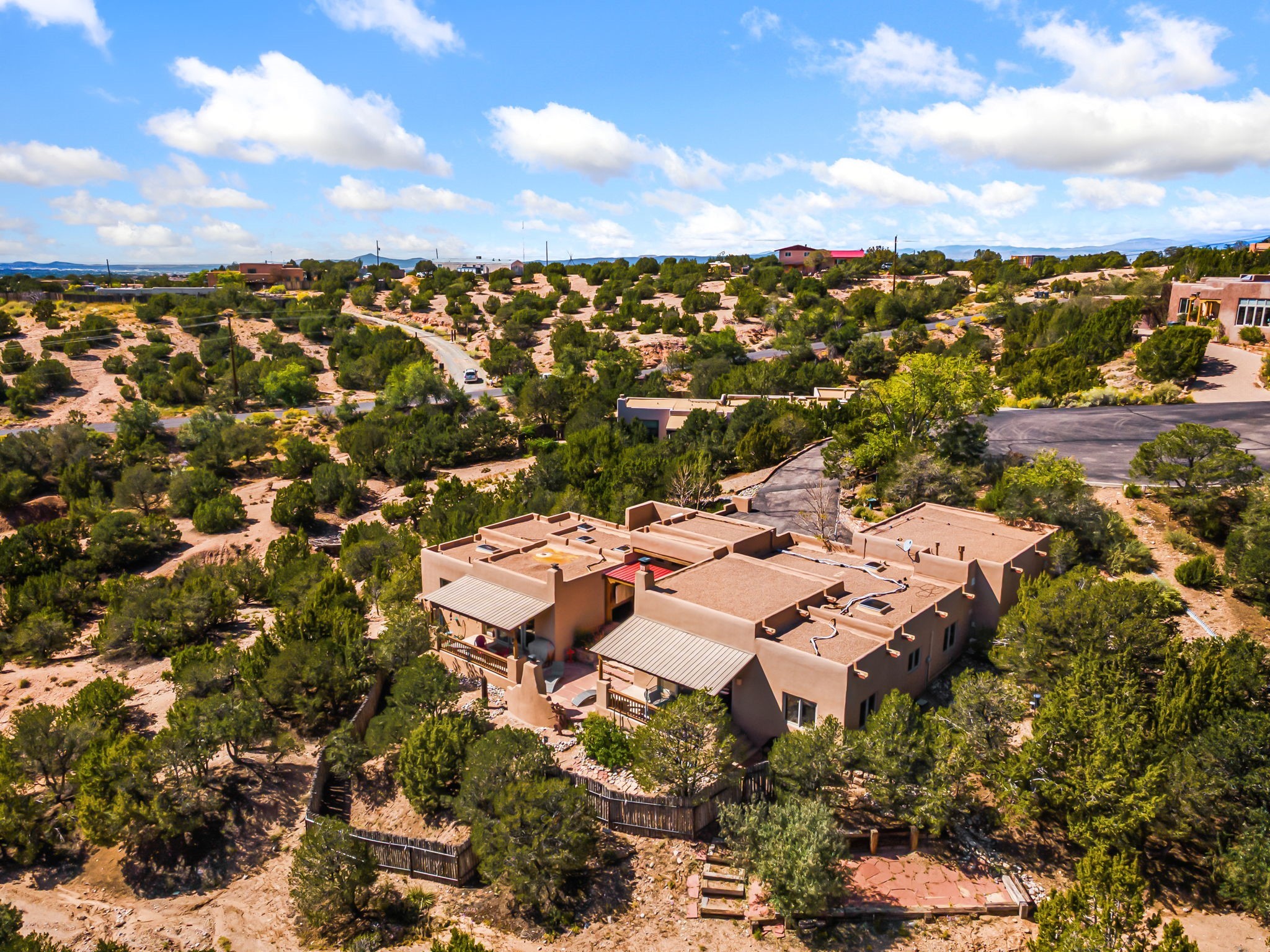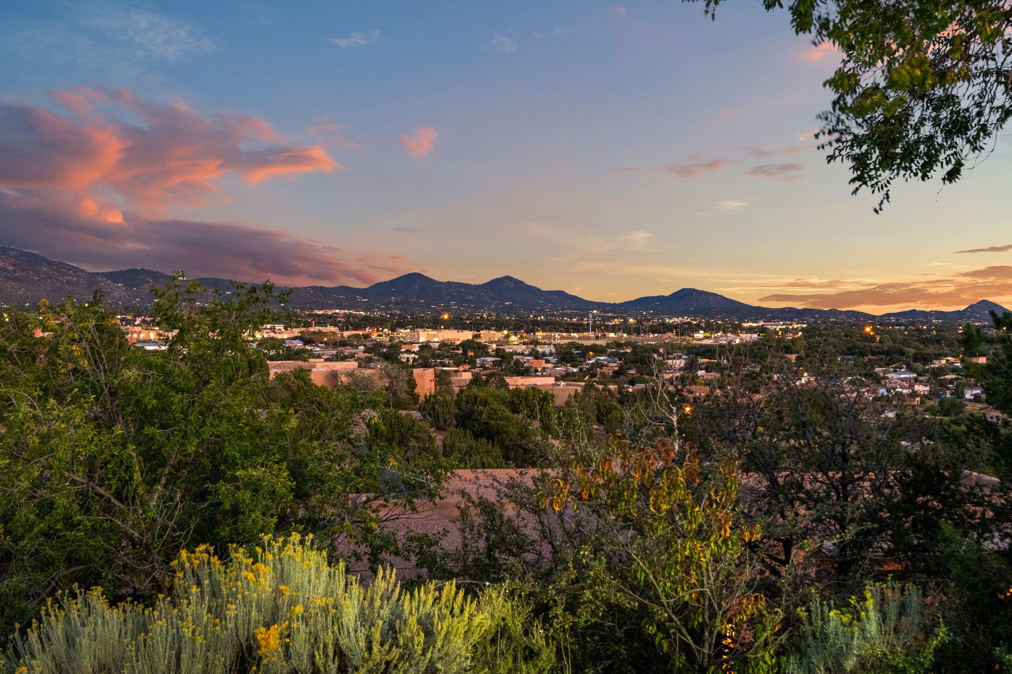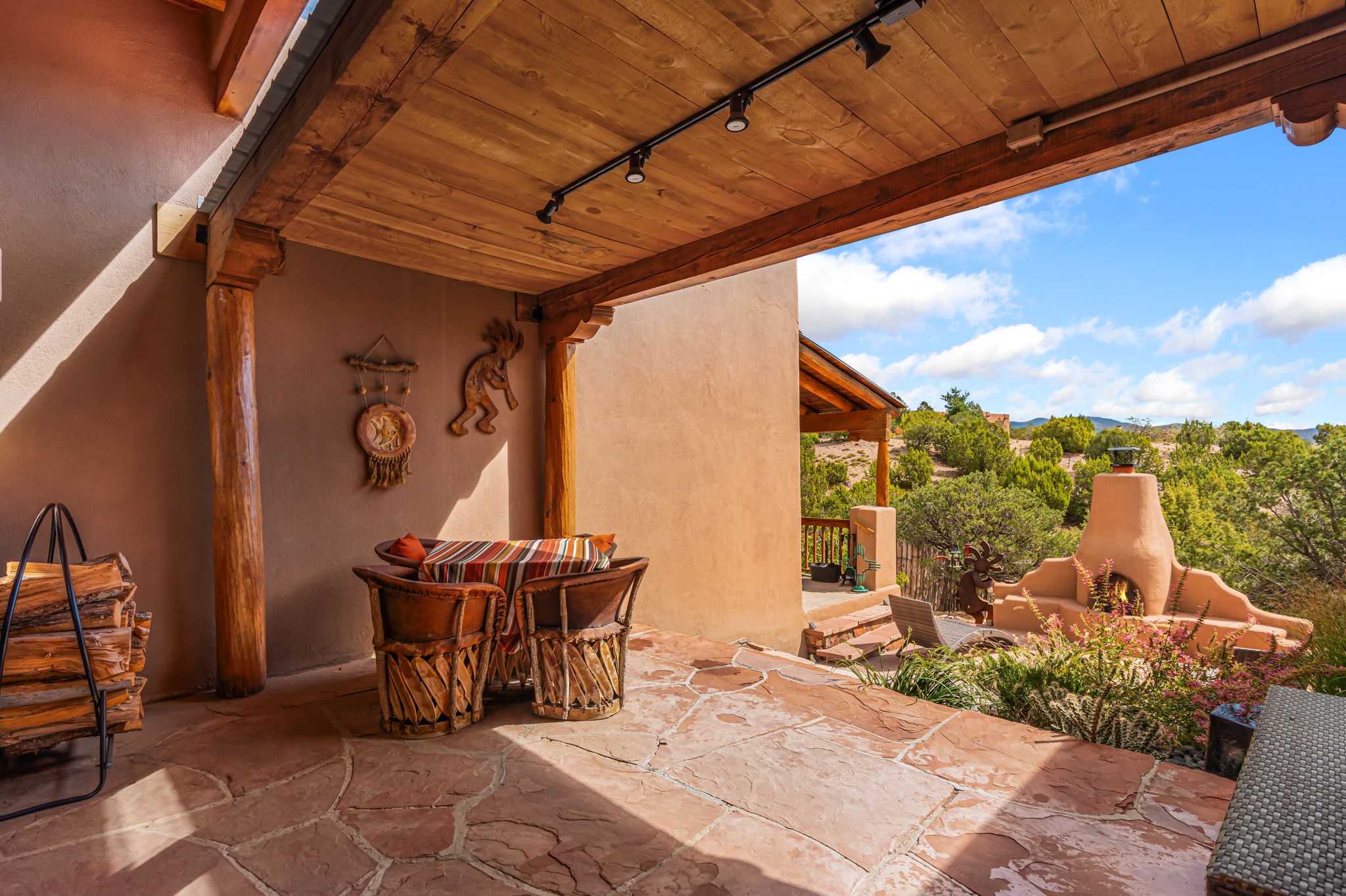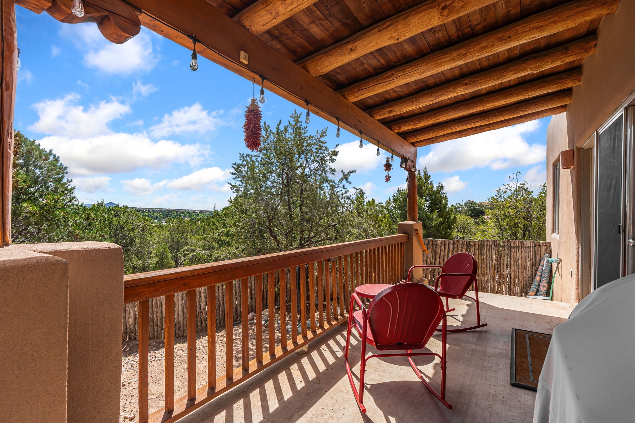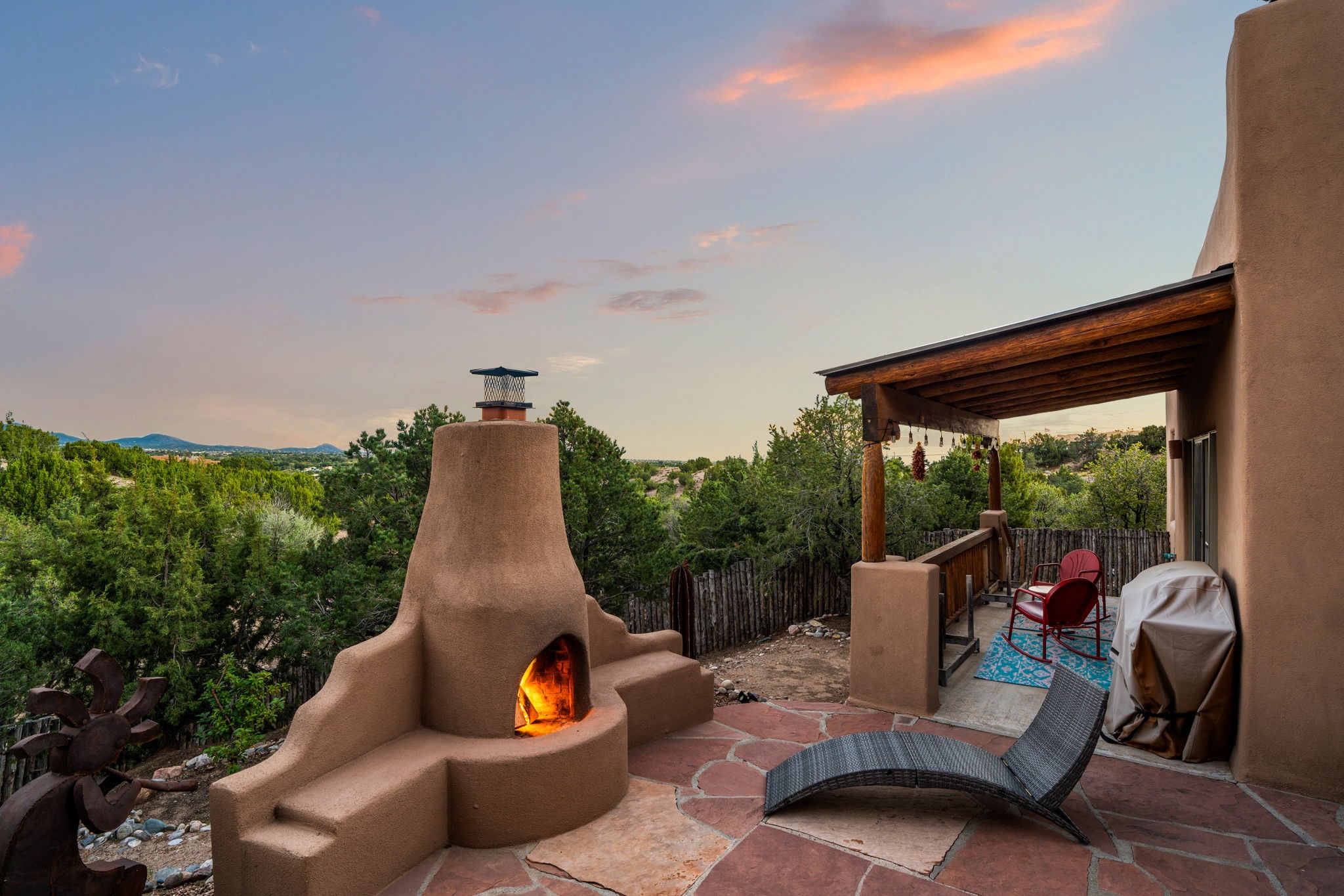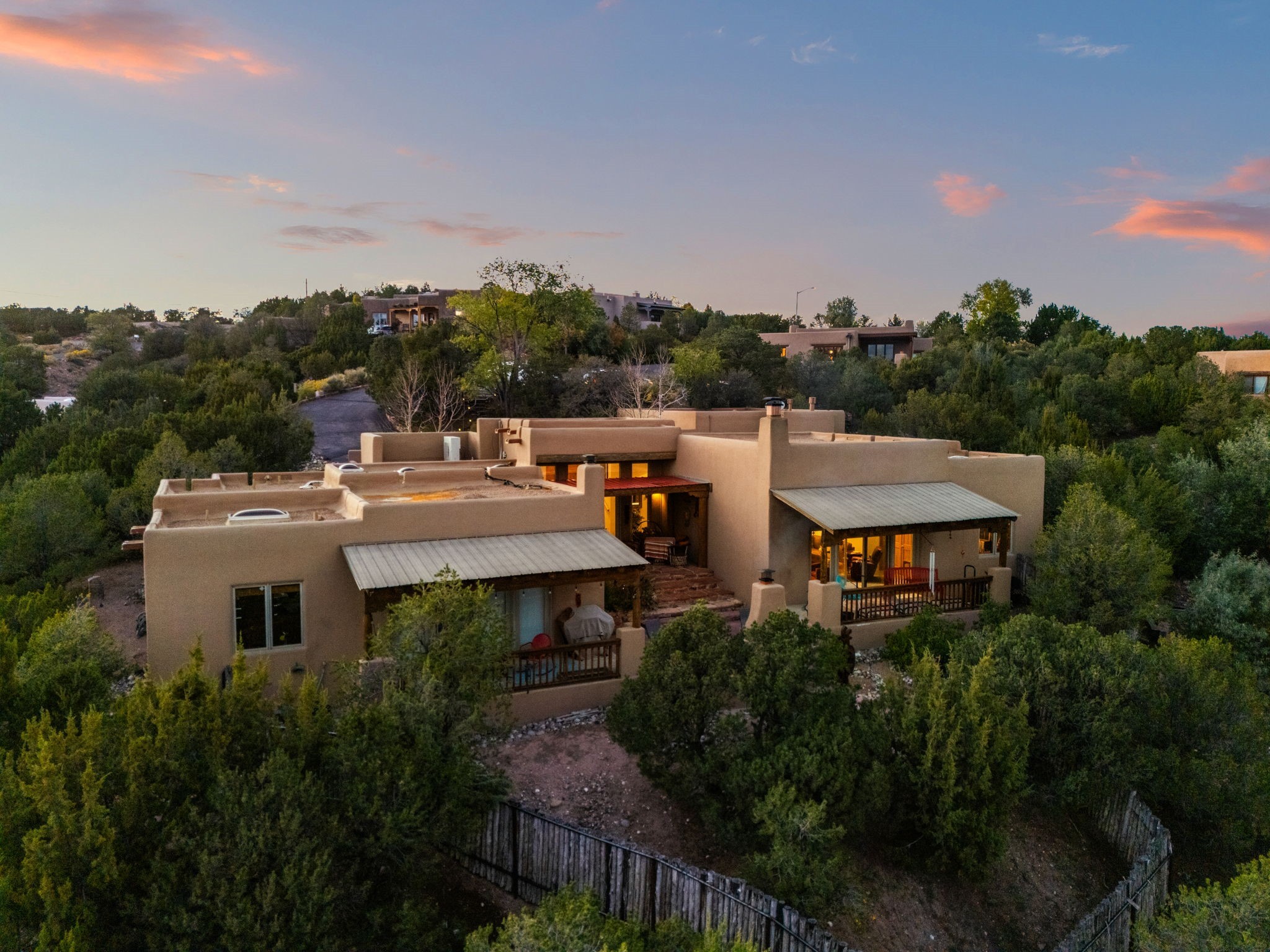 Very rarely, there is a property that combines incredible views from almost every room, ultimate Santa Fe style, modern amenities and an unbeatable location! 5 minutes from downtown, this 3 bed 3 bath custom build is the complete package!Enter the hand carved front doors and be greeted by dramatic views straight away. From here, step into the grand salon with soaring ceilings, a kiva fireplace and stately hand-troweled plaster. The dining room features a drop ceiling and recessed lighting for the most intimate ambience. You'll be serving your happy guests in style from the updated chef's kitchen -featuring Silestone quartz countertops, stainless appliances, a playful handpainted tile backsplash, and a sleek modern design. Almost every room in the home has house outdoor access for that seamless indoor-outdoor living. The views from the portal will be sure to impress: city lights at night and Sangre De Cristo-facing sunsets for that gorgeous Santa Fe color palette. The generous primary suite has its own kiva fireplace, outdoor portal, and a sumptuous bath - with oversized pebble shower, dedicated water closet, deep-soaking tub and dual sinks. The two guest rooms share a large full bath. Recent upgrades (2022) include a new foam and gravel roof with a 10-year warranty, plaster walls in the main living areas, latilla ceilings and 40 new recessed lights in dining and guest rooms, a new alarm system, and an outdoor kiva fireplace flanked by bancos. The oversized 2-car garage has direct entry into the kitchen and dedicated laundry area for easy access. With plenty of storage, this home is perfect for a primary residence, or make it your Santa Fe getaway! Don't miss this opportunity to own all the best Santa Fe has to offer! Schedule a showing today!