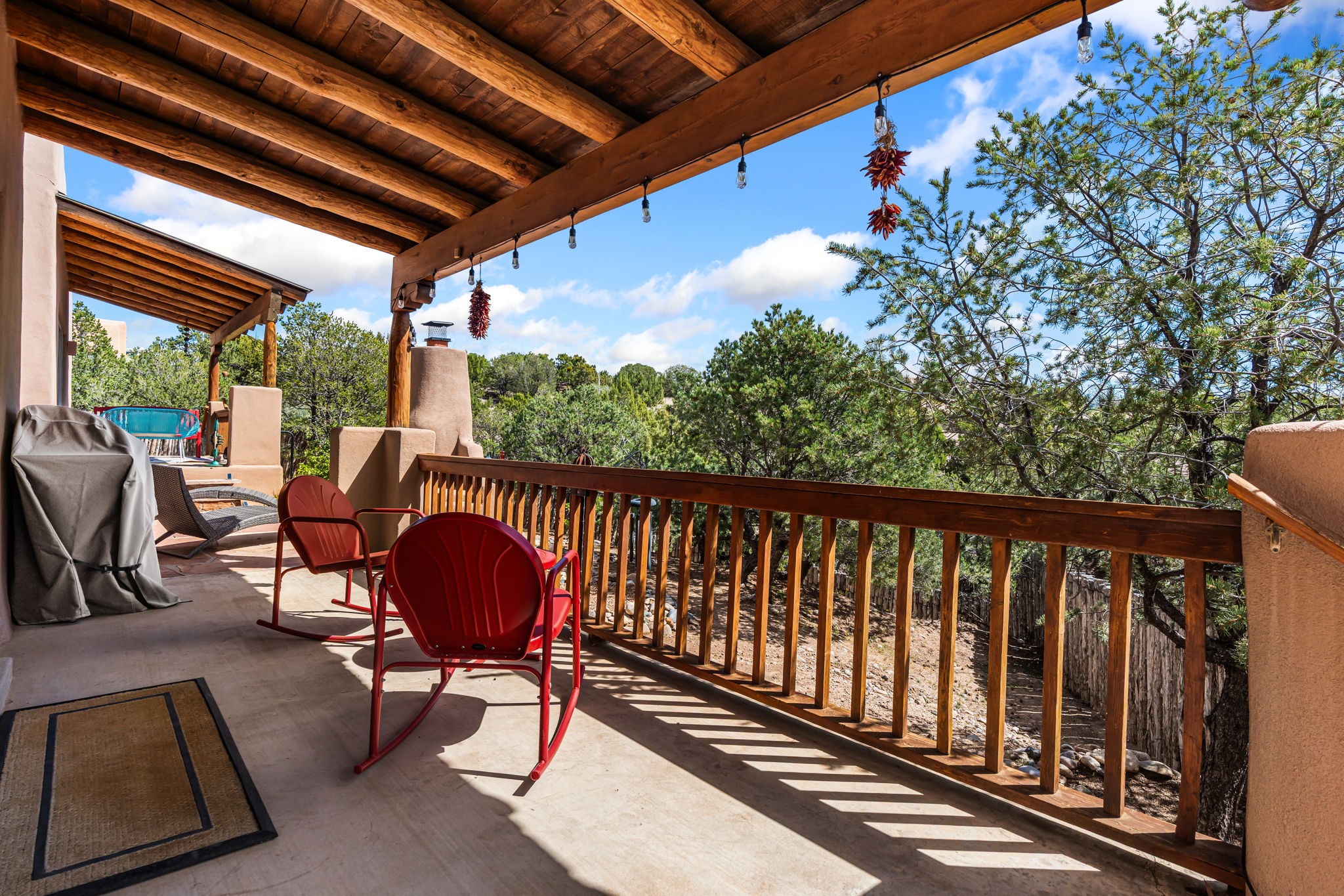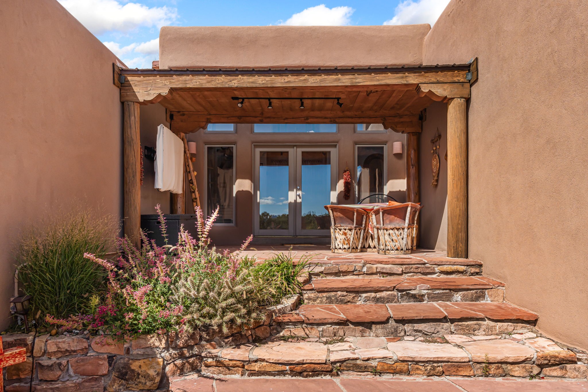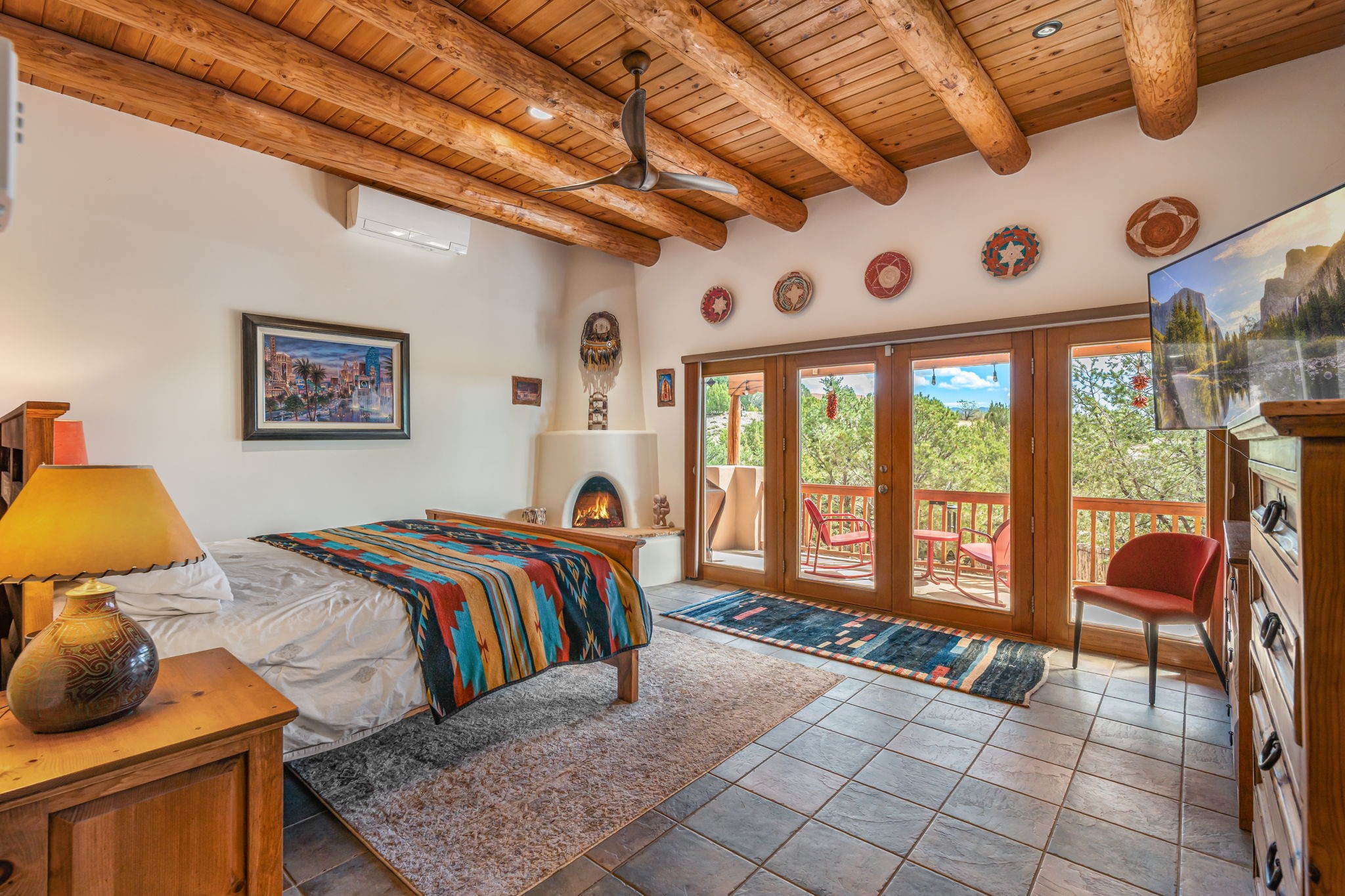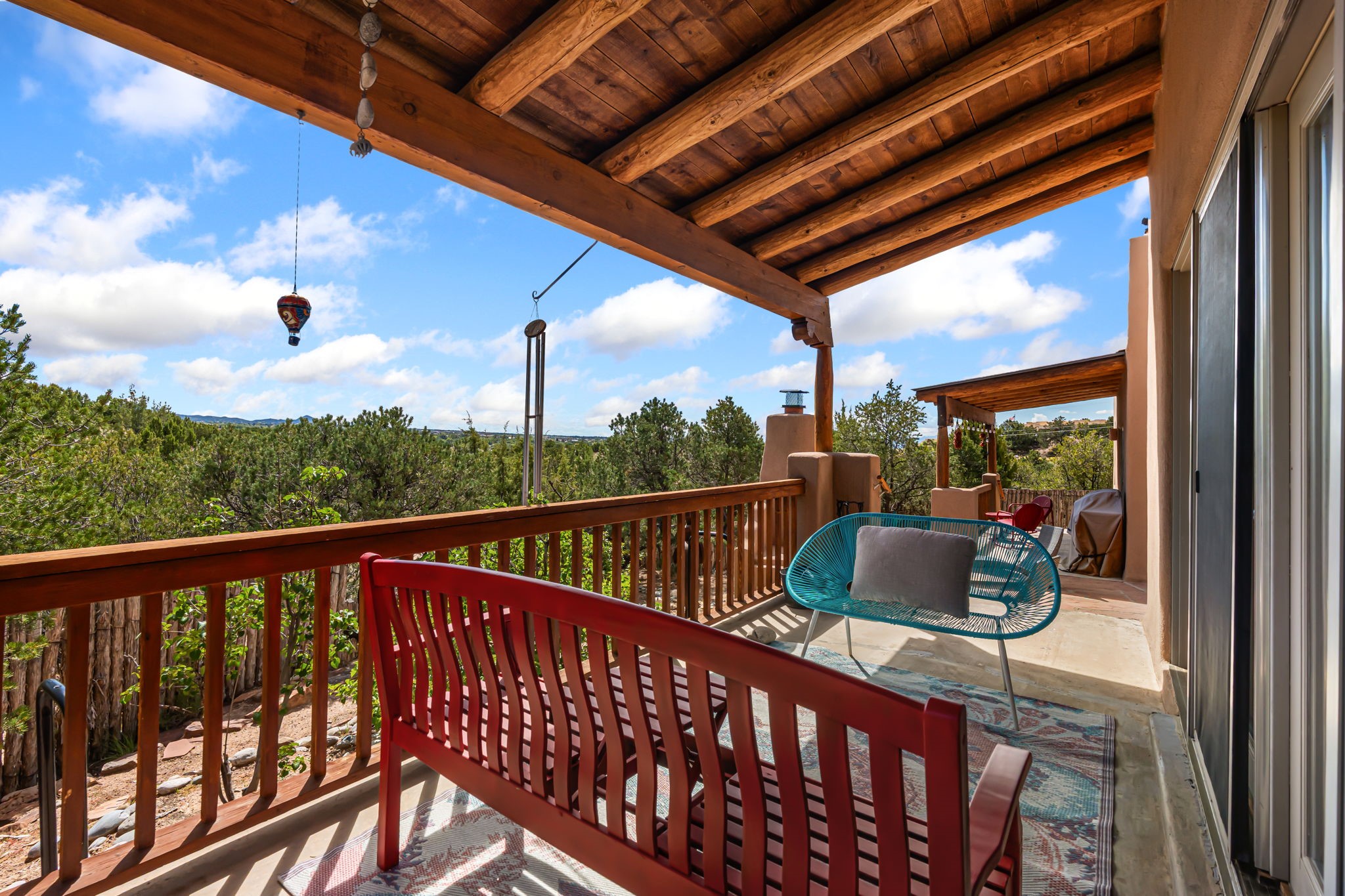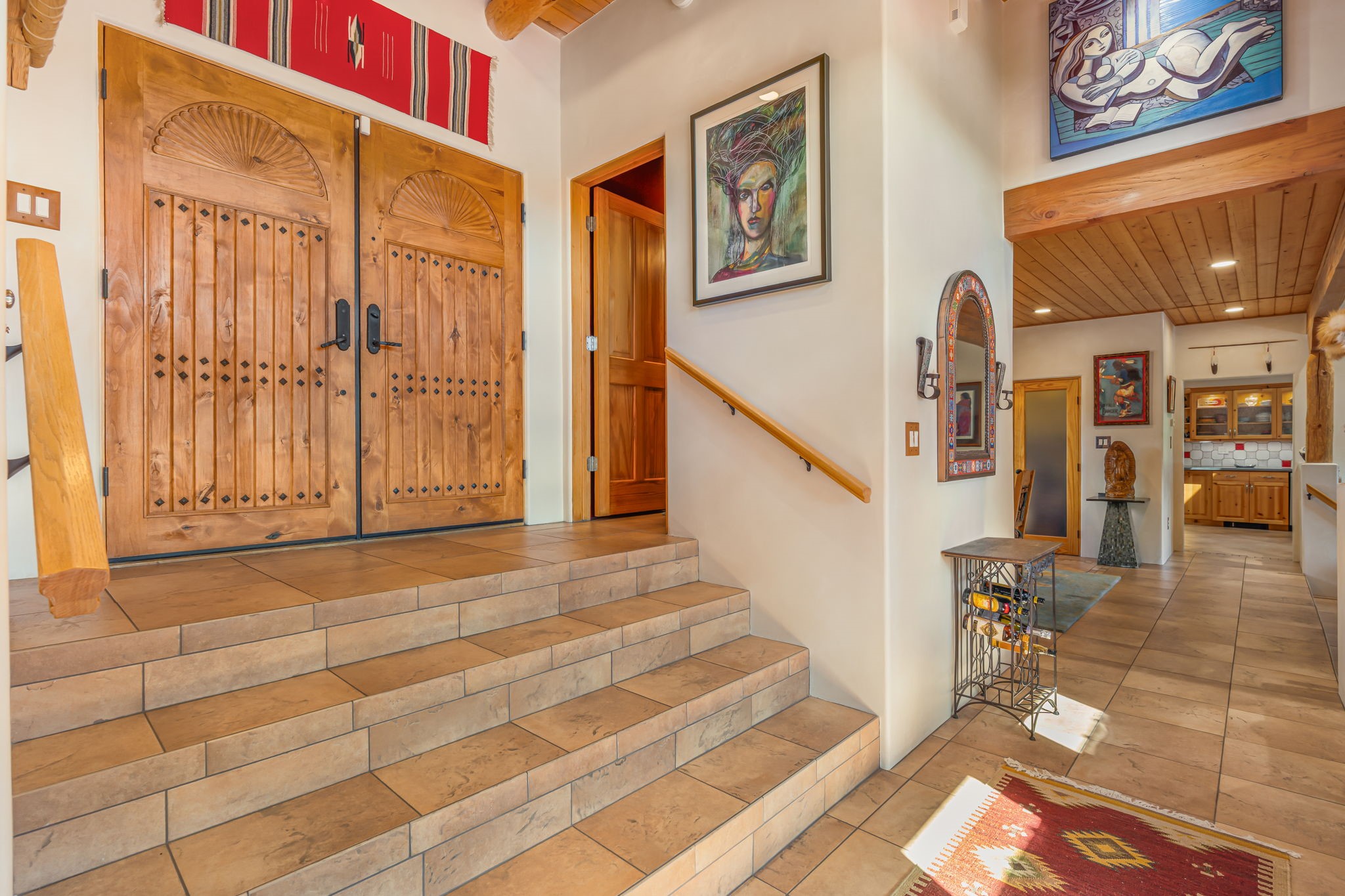 Very rarely, there is a property that combines incredible views from almost every room, ultimate Santa Fe style, modern amenities and an unbeatable location! 5 minutes from downtown, this 3 bed 3 bath custom build is the complete package!Enter the hand carved front doors and be greeted by dramatic views straight away. From here, step into the grand salon with soaring ceilings, a kiva fireplace and stately hand-troweled plaster. The dining room features a drop ceiling and recessed lighting for the most intimate ambience. You'll be serving your happy guests in style from the updated chef's kitchen -featuring Silestone quartz countertops, stainless appliances, a playful handpainted tile backsplash, and a sleek modern design. Almost every room in the home has house outdoor access for that seamless indoor-outdoor living. The views from the portal will be sure to impress: city lights at night and Sangre De Cristo-facing sunsets for that gorgeous Santa Fe color palette. The generous primary suite has its own kiva fireplace, outdoor portal, and a sumptuous bath - with oversized pebble shower, dedicated water closet, deep-soaking tub and dual sinks. The two guest rooms share a large full bath. Recent upgrades (2022) include a new foam and gravel roof with a 10-year warranty, plaster walls in the main living areas, latilla ceilings and 40 new recessed lights in dining and guest rooms, a new alarm system, and an outdoor kiva fireplace flanked by bancos. The oversized 2-car garage has direct entry into the kitchen and dedicated laundry area for easy access. With plenty of storage, this home is perfect for a primary residence, or make it your Santa Fe getaway! Don't miss this opportunity to own all the best Santa Fe has to offer! Schedule a showing today!