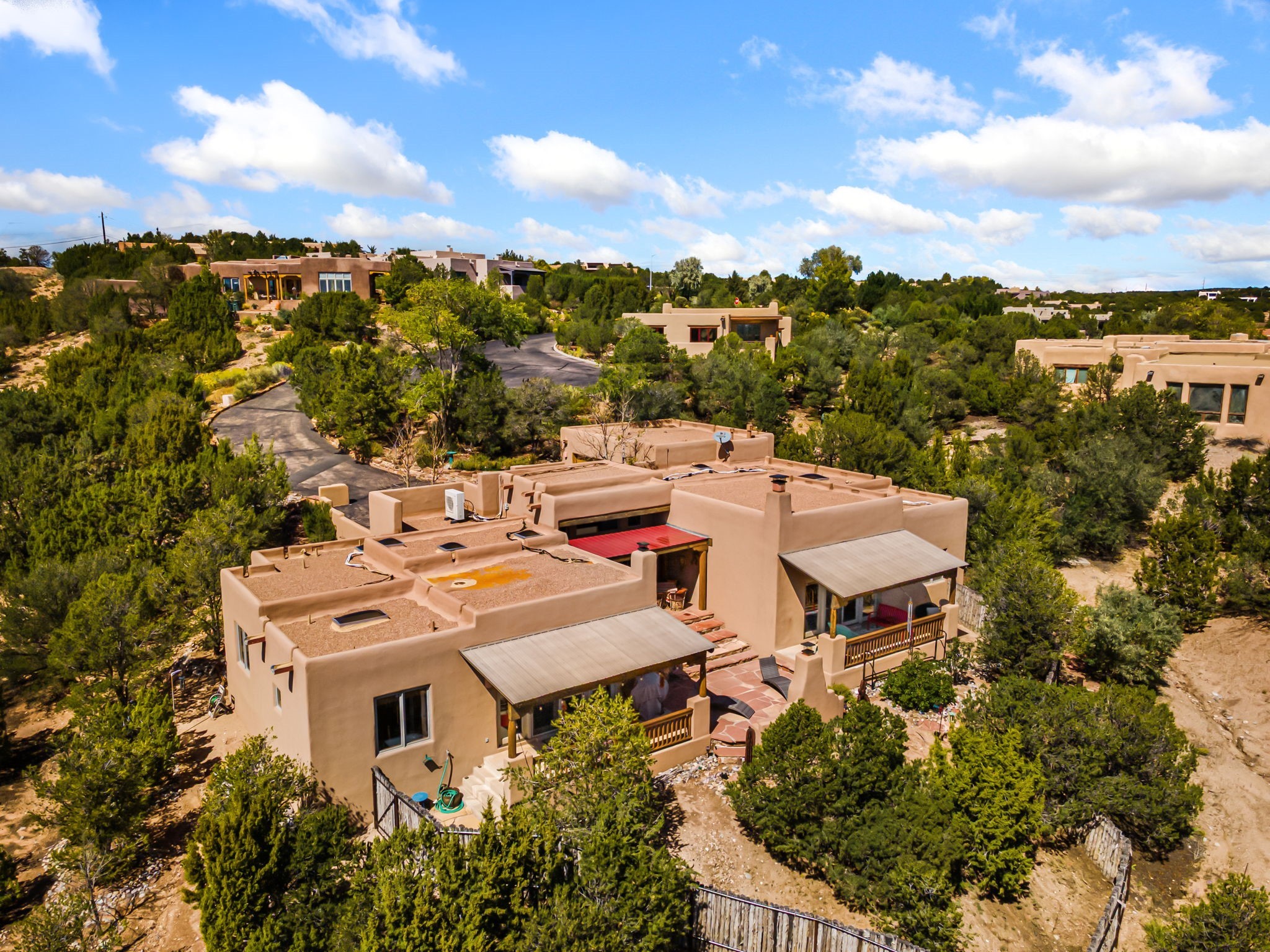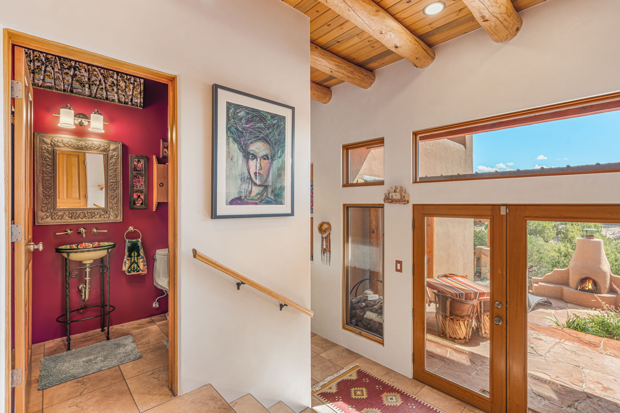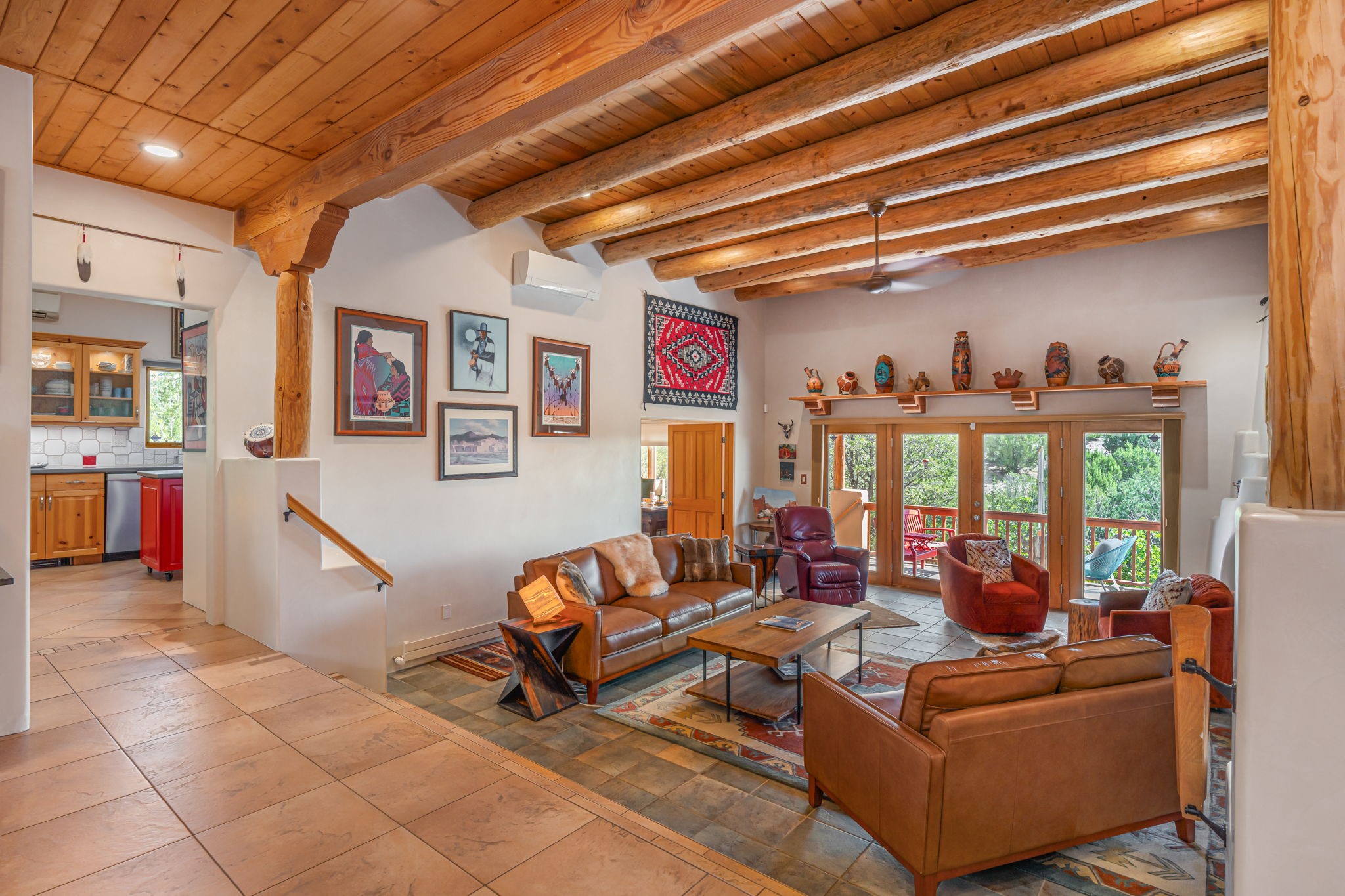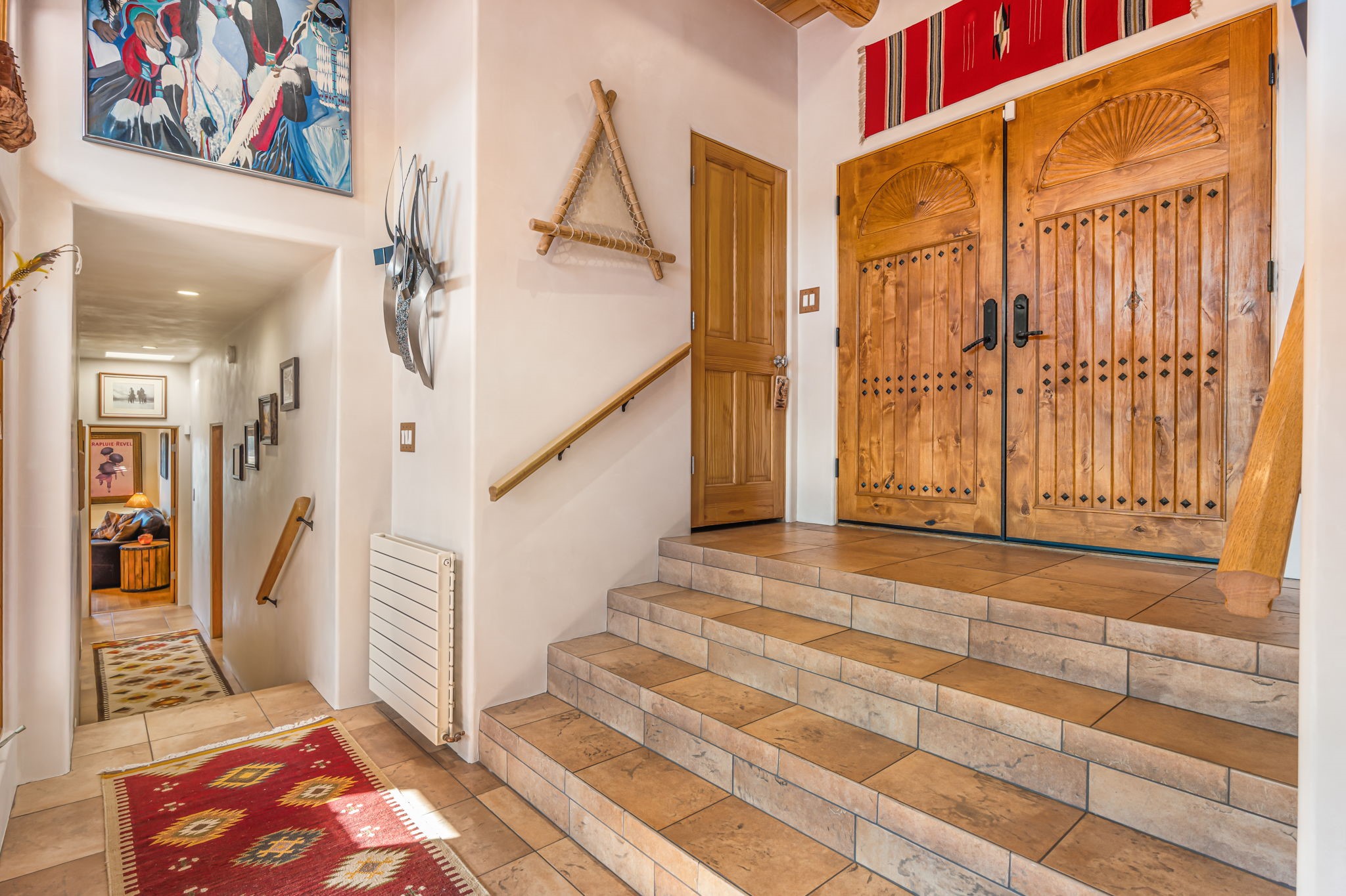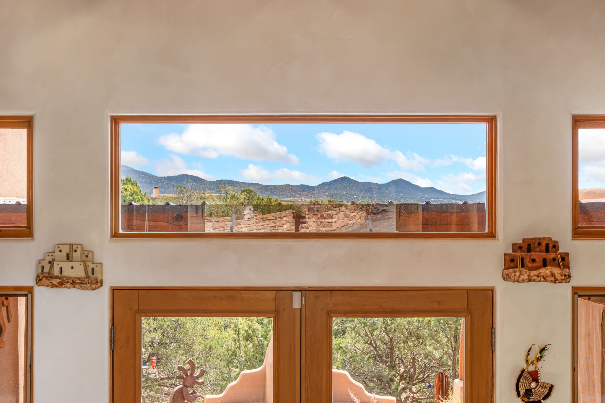 Very rarely, there is a property that combines incredible views from almost every room, ultimate Santa Fe style, modern amenities and an unbeatable location! 5 minutes from downtown, this 3 bed 3 bath custom build is the complete package!Enter the hand carved front doors and be greeted by dramatic views straight away. From here, step into the grand salon with soaring ceilings, a kiva fireplace and stately hand-troweled plaster. The dining room features a drop ceiling and recessed lighting for the most intimate ambience. You'll be serving your happy guests in style from the updated chef's kitchen -featuring Silestone quartz countertops, stainless appliances, a playful handpainted tile backsplash, and a sleek modern design. Almost every room in the home has house outdoor access for that seamless indoor-outdoor living. The views from the portal will be sure to impress: city lights at night and Sangre De Cristo-facing sunsets for that gorgeous Santa Fe color palette. The generous primary suite has its own kiva fireplace, outdoor portal, and a sumptuous bath - with oversized pebble shower, dedicated water closet, deep-soaking tub and dual sinks. The two guest rooms share a large full bath. Recent upgrades (2022) include a new foam and gravel roof with a 10-year warranty, plaster walls in the main living areas, latilla ceilings and 40 new recessed lights in dining and guest rooms, a new alarm system, and an outdoor kiva fireplace flanked by bancos. The oversized 2-car garage has direct entry into the kitchen and dedicated laundry area for easy access. With plenty of storage, this home is perfect for a primary residence, or make it your Santa Fe getaway! Don't miss this opportunity to own all the best Santa Fe has to offer! Schedule a showing today!