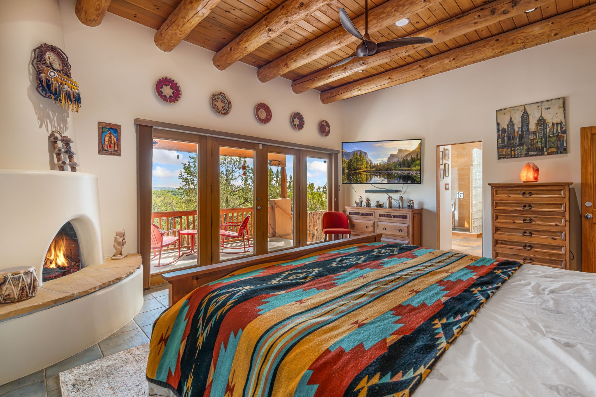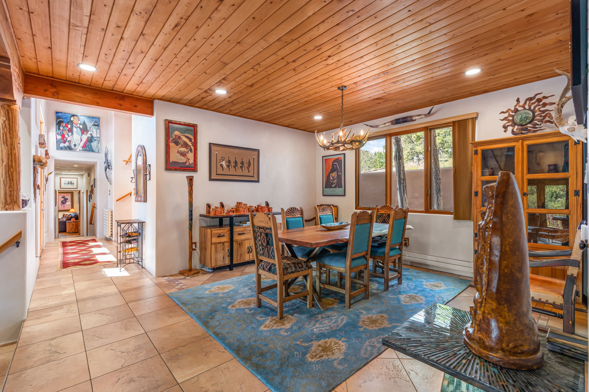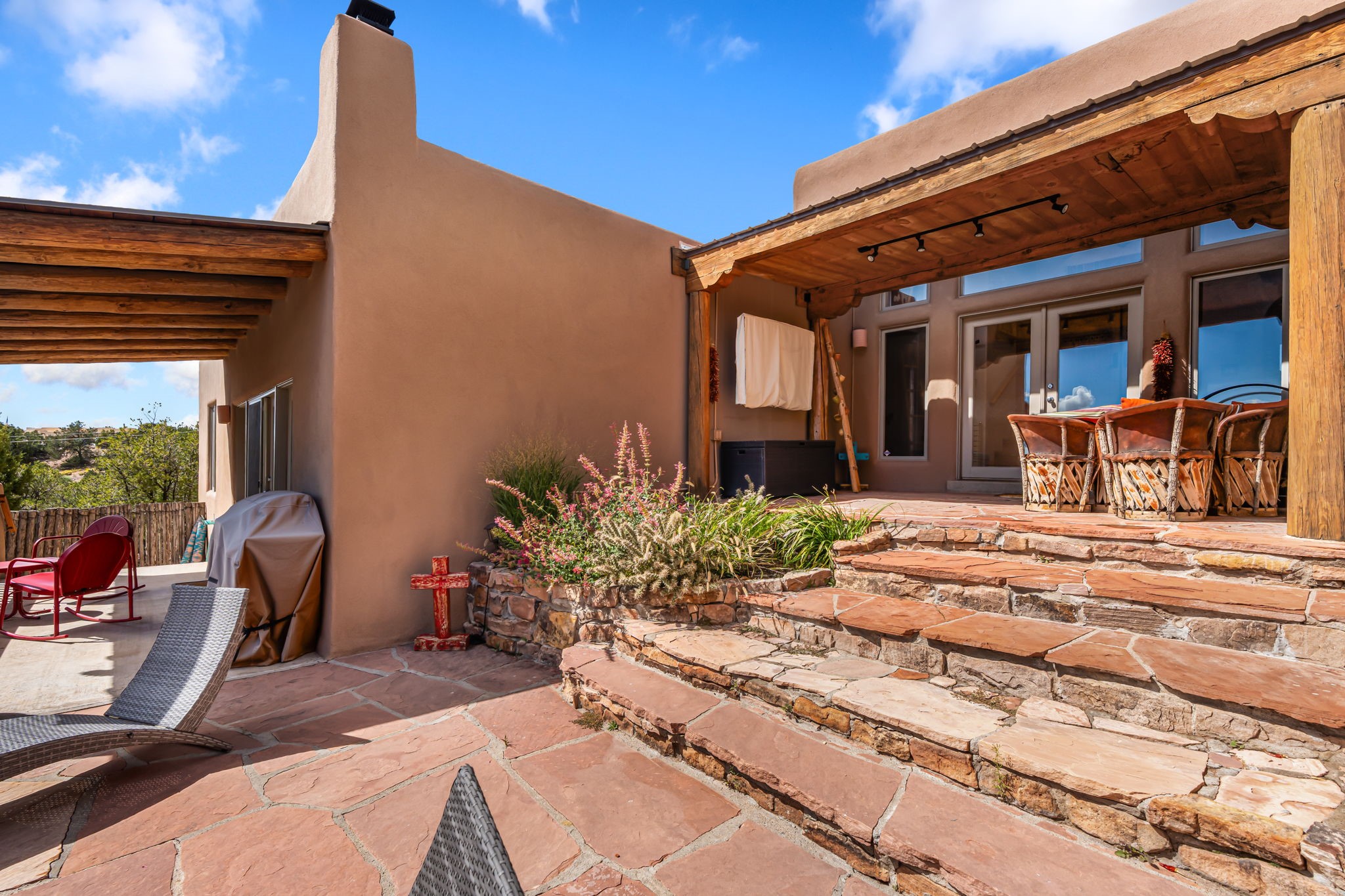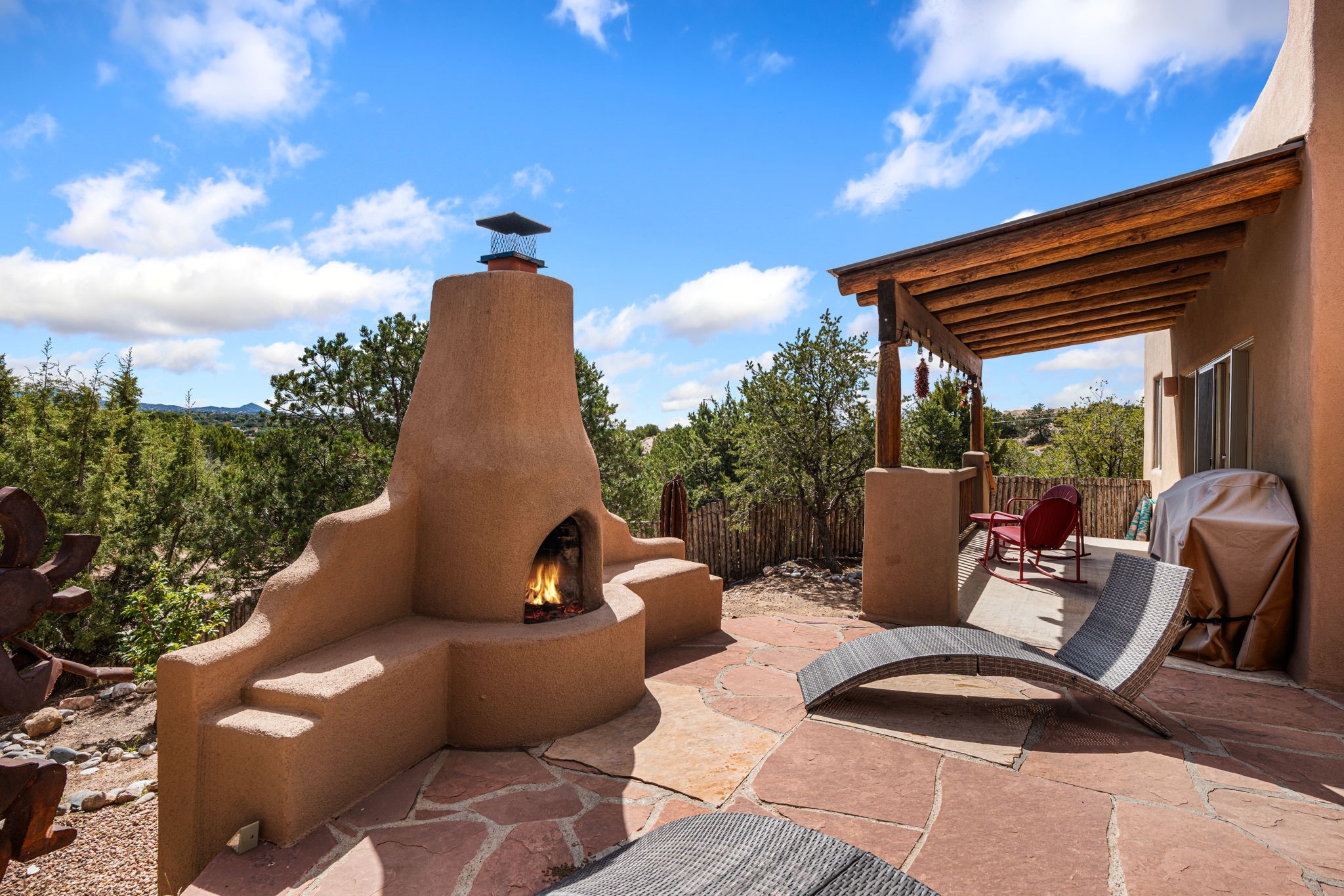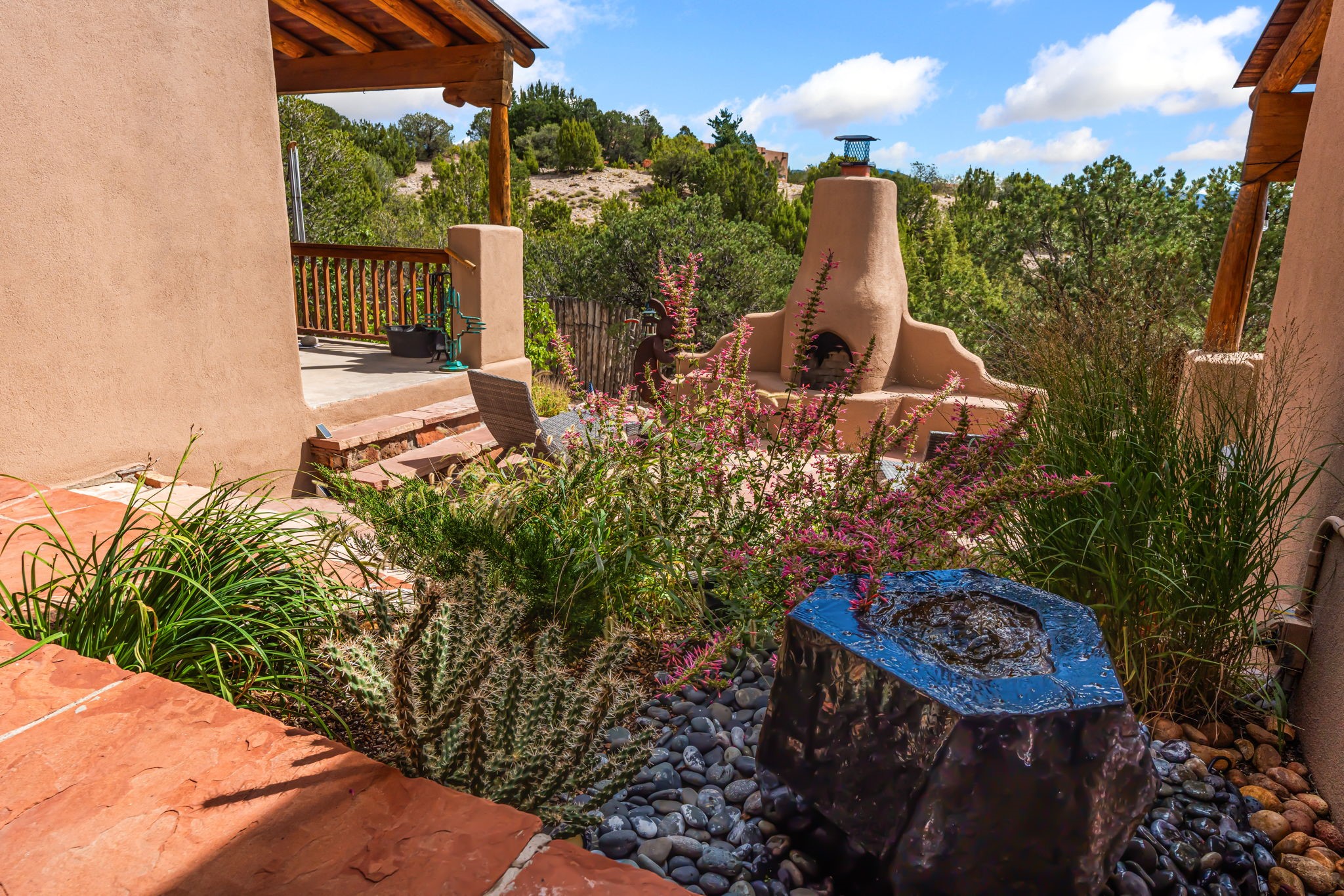 Very rarely, there is a property that combines incredible views from almost every room, ultimate Santa Fe style, modern amenities and an unbeatable location! 5 minutes from downtown, this 3 bed 3 bath custom build is the complete package!Enter the hand carved front doors and be greeted by dramatic views straight away. From here, step into the grand salon with soaring ceilings, a kiva fireplace and stately hand-troweled plaster. The dining room features a drop ceiling and recessed lighting for the most intimate ambience. You'll be serving your happy guests in style from the updated chef's kitchen -featuring Silestone quartz countertops, stainless appliances, a playful handpainted tile backsplash, and a sleek modern design. Almost every room in the home has house outdoor access for that seamless indoor-outdoor living. The views from the portal will be sure to impress: city lights at night and Sangre De Cristo-facing sunsets for that gorgeous Santa Fe color palette. The generous primary suite has its own kiva fireplace, outdoor portal, and a sumptuous bath - with oversized pebble shower, dedicated water closet, deep-soaking tub and dual sinks. The two guest rooms share a large full bath. Recent upgrades (2022) include a new foam and gravel roof with a 10-year warranty, plaster walls in the main living areas, latilla ceilings and 40 new recessed lights in dining and guest rooms, a new alarm system, and an outdoor kiva fireplace flanked by bancos. The oversized 2-car garage has direct entry into the kitchen and dedicated laundry area for easy access. With plenty of storage, this home is perfect for a primary residence, or make it your Santa Fe getaway! Don't miss this opportunity to own all the best Santa Fe has to offer! Schedule a showing today!