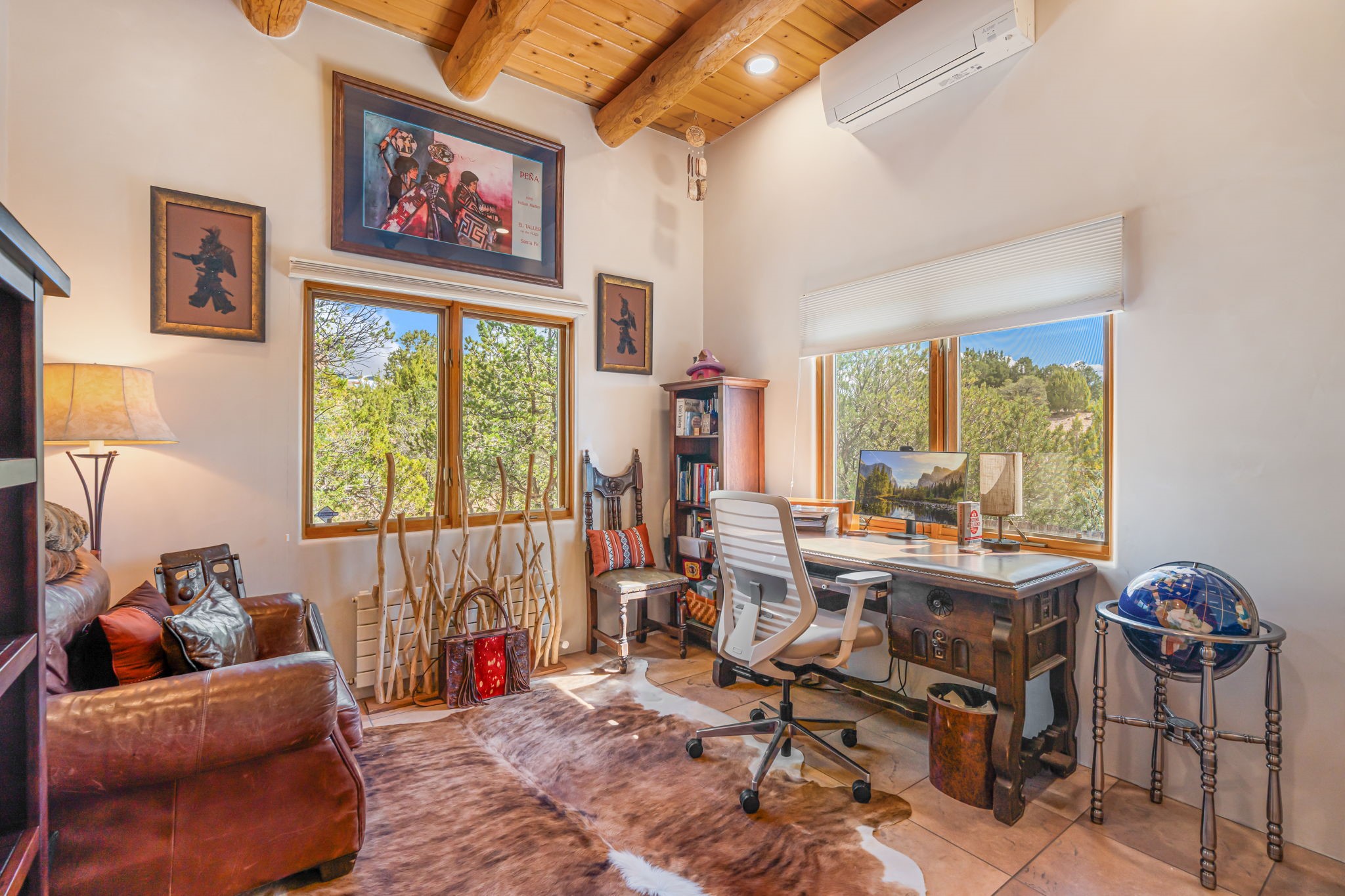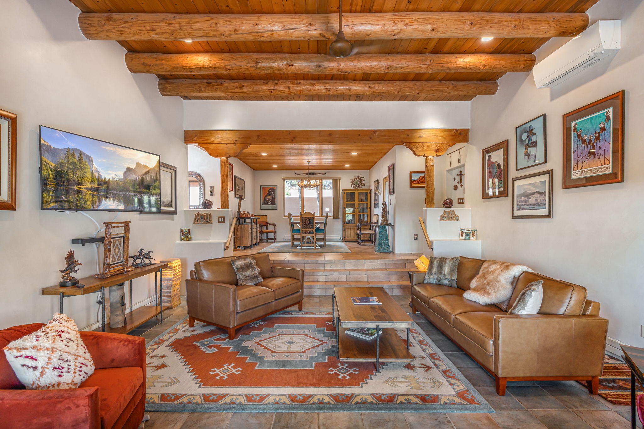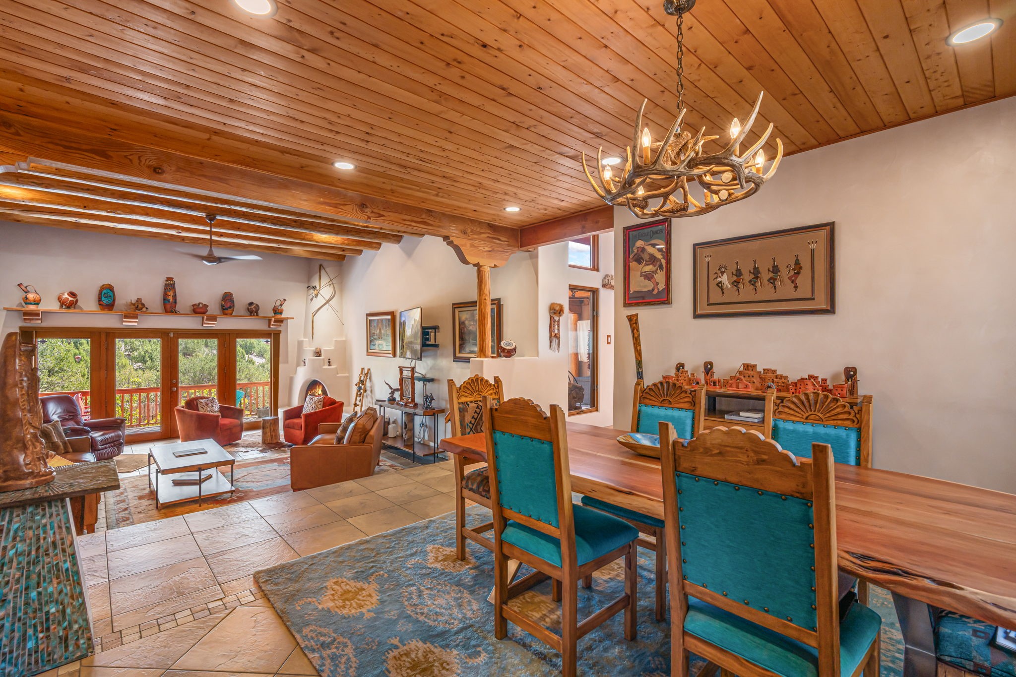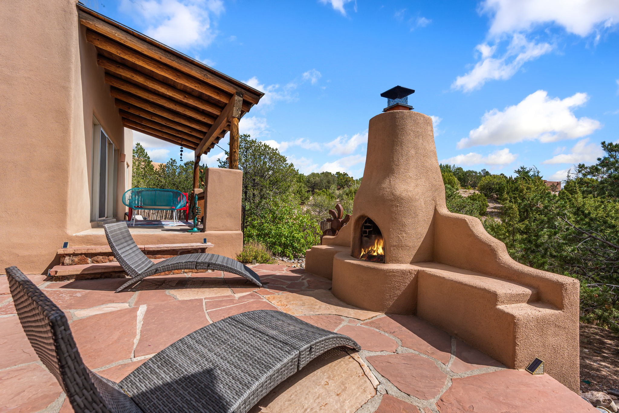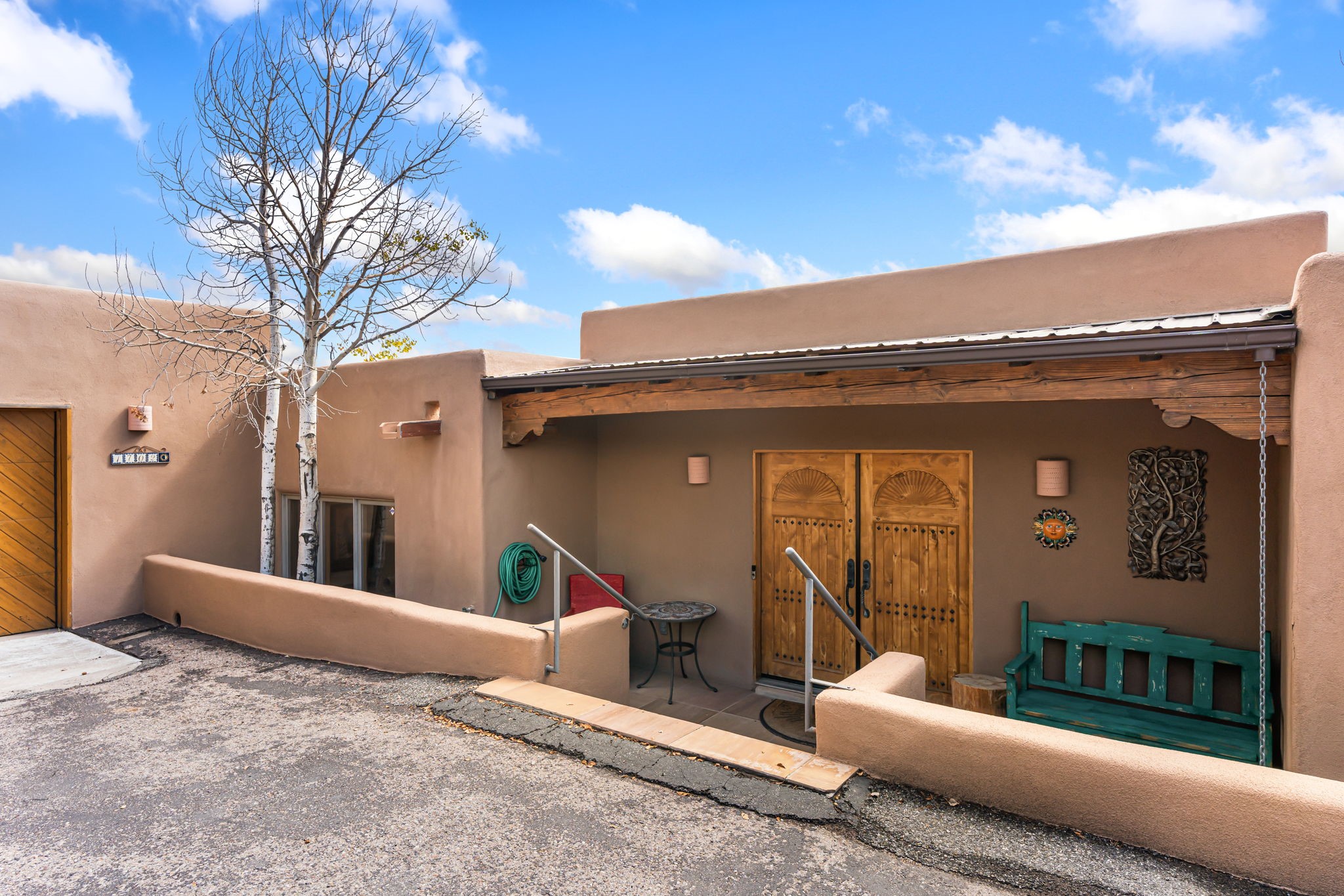 Very rarely, there is a property that combines incredible views from almost every room, ultimate Santa Fe style, modern amenities and an unbeatable location! 5 minutes from downtown, this 3 bed 3 bath custom build is the complete package!Enter the hand carved front doors and be greeted by dramatic views straight away. From here, step into the grand salon with soaring ceilings, a kiva fireplace and stately hand-troweled plaster. The dining room features a drop ceiling and recessed lighting for the most intimate ambience. You'll be serving your happy guests in style from the updated chef's kitchen -featuring Silestone quartz countertops, stainless appliances, a playful handpainted tile backsplash, and a sleek modern design. Almost every room in the home has house outdoor access for that seamless indoor-outdoor living. The views from the portal will be sure to impress: city lights at night and Sangre De Cristo-facing sunsets for that gorgeous Santa Fe color palette. The generous primary suite has its own kiva fireplace, outdoor portal, and a sumptuous bath - with oversized pebble shower, dedicated water closet, deep-soaking tub and dual sinks. The two guest rooms share a large full bath. Recent upgrades (2022) include a new foam and gravel roof with a 10-year warranty, plaster walls in the main living areas, latilla ceilings and 40 new recessed lights in dining and guest rooms, a new alarm system, and an outdoor kiva fireplace flanked by bancos. The oversized 2-car garage has direct entry into the kitchen and dedicated laundry area for easy access. With plenty of storage, this home is perfect for a primary residence, or make it your Santa Fe getaway! Don't miss this opportunity to own all the best Santa Fe has to offer! Schedule a showing today!